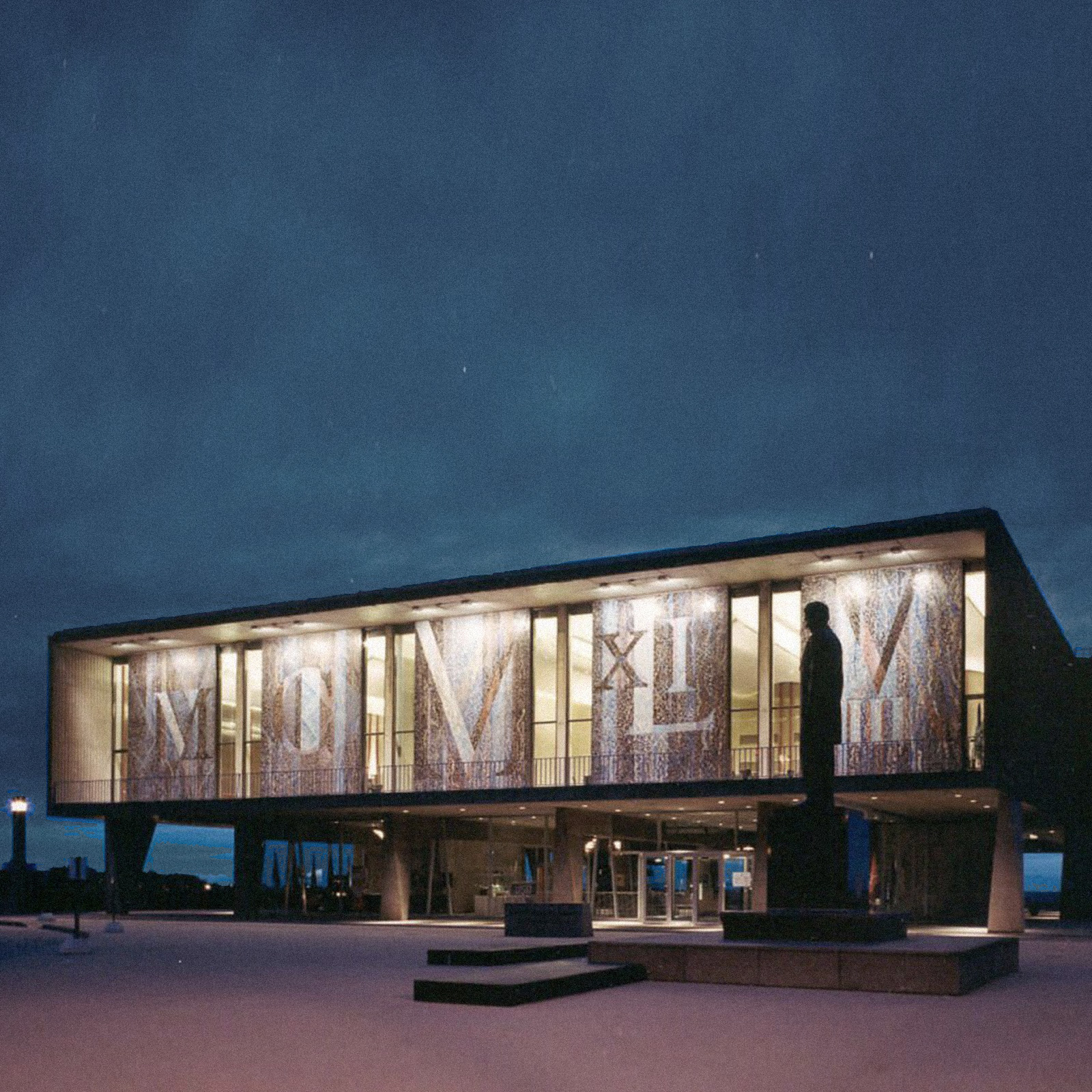 In 1957, the War Memorial Center was dedicated “To Honor the Dead by Serving the Living.” The western face of the building features a memorial mural by Wisconsin artist Edmund Lewandowski, a mosaic of 1.4 million pieces of marble and glass. The original Museum had a dramatic entryway from the central courtyard, with stairs down to three large exhibition galleries. A 1975 addition designed by David Kahler greatly expanded the Museum’s gallery space.