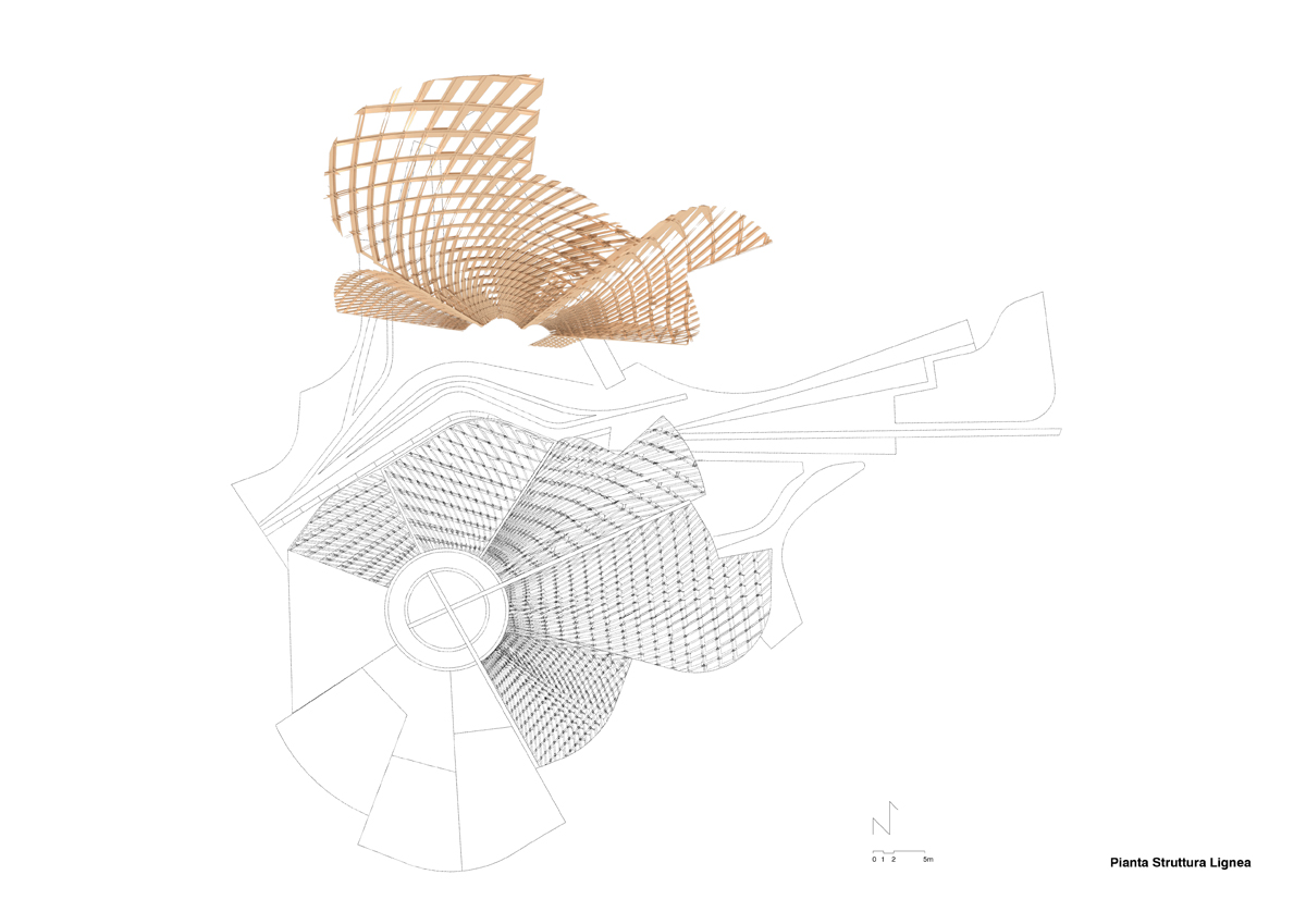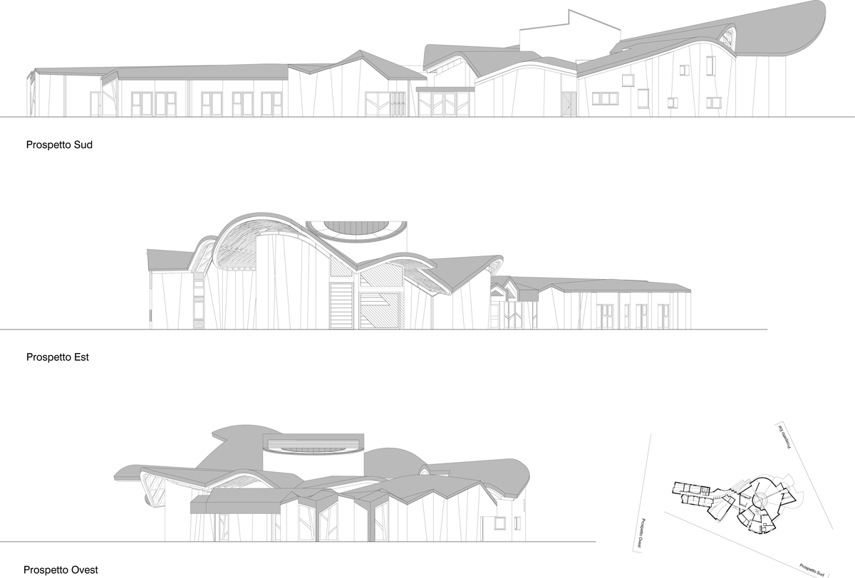 Rodeado por una hilera de altos álamos que crean un espacio acogedor y de reunión para los habitantes, el edificio está cubierto por un techo suspendido y ligero, que sugiere una tensión ascendente, sin olvidar su vínculo con la naturaleza formalizado en geometrías orgánicas.
