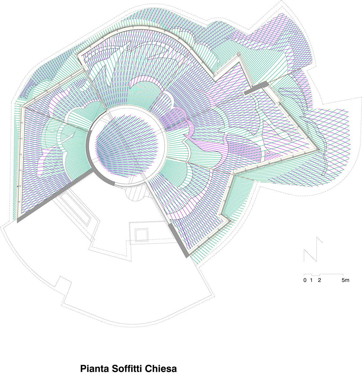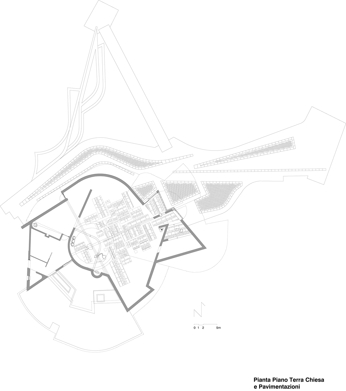 Como un sólido giratorio de sección cambiante, la iglesia se desarrolla radialmente en torno a un punto central ocupado por el altar, verdadero fulcro formal y espiritual del edificio, y el gran lucernario. Situado en un presbiterio circular, el altar es también el punto central de la iglesia, en torno al cual se organizan la sala, la capilla lateral, así como el baptisterio y todos los espacios anexos.