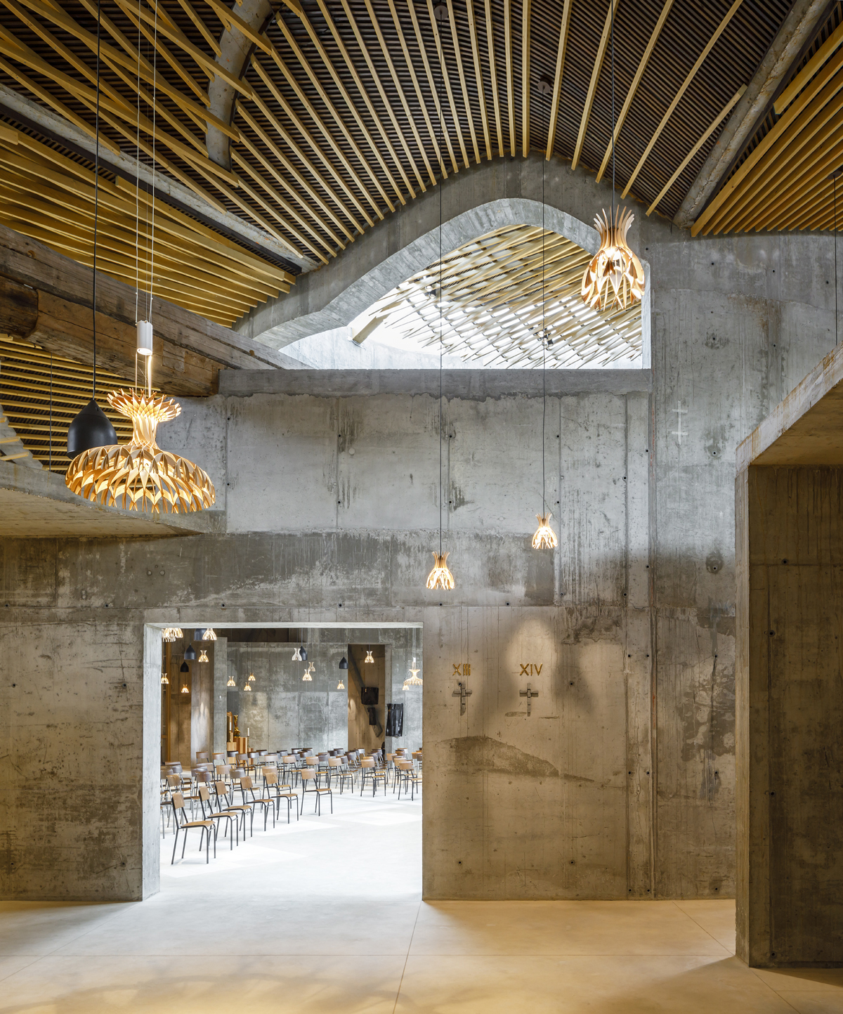 Las grandes cruces de piedra gris parecen emerger de los muros de hormigón desnudo, transformando el hormigón rugoso en piedra noble.