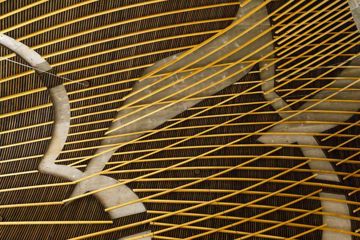 Las lámparas de madera suspendidas llenan el espacio de luz suave, provocando sombras que pueden recordar la presencia de los ángeles. El techo acústico está cubierto por un casetón de madera de geometría curvilínea.
