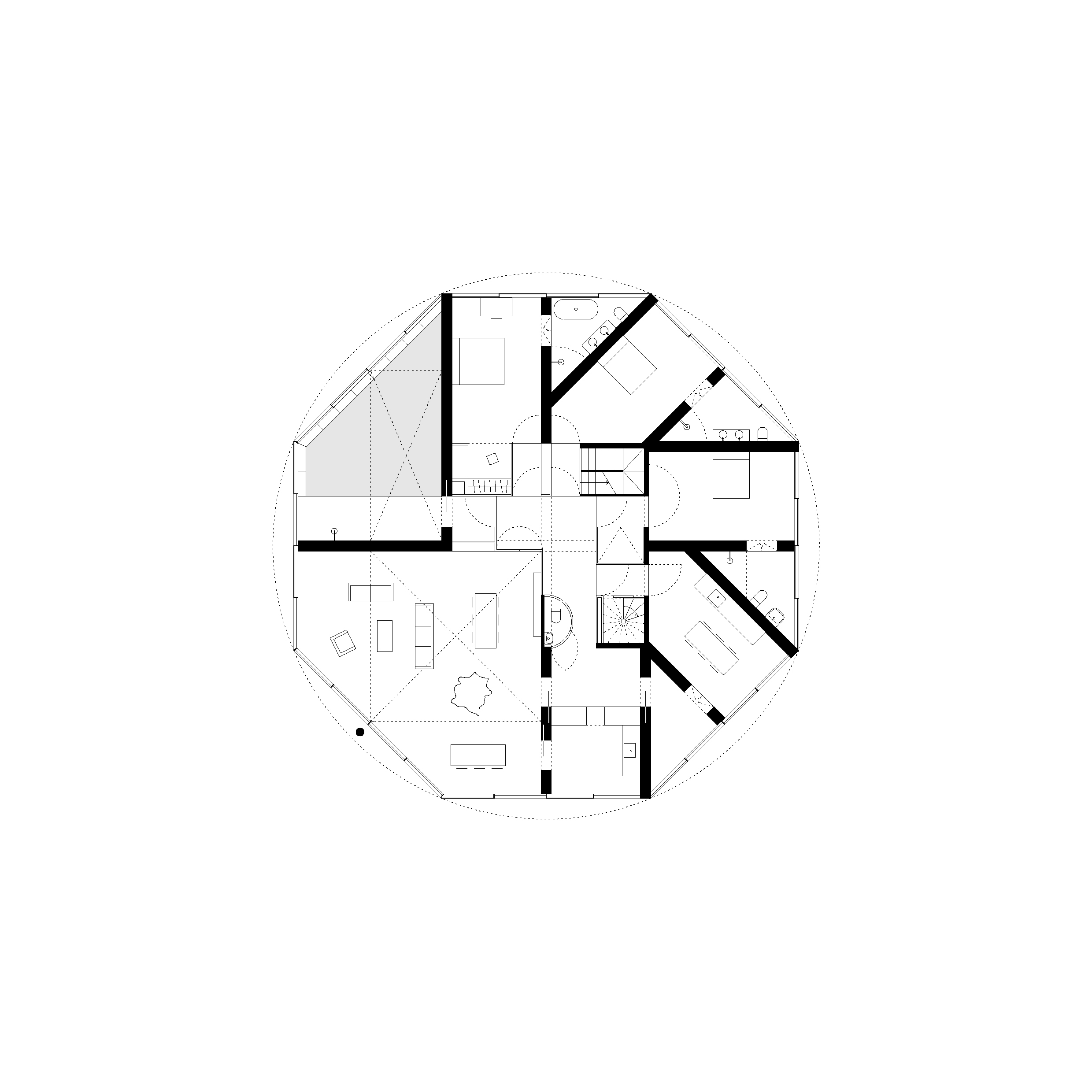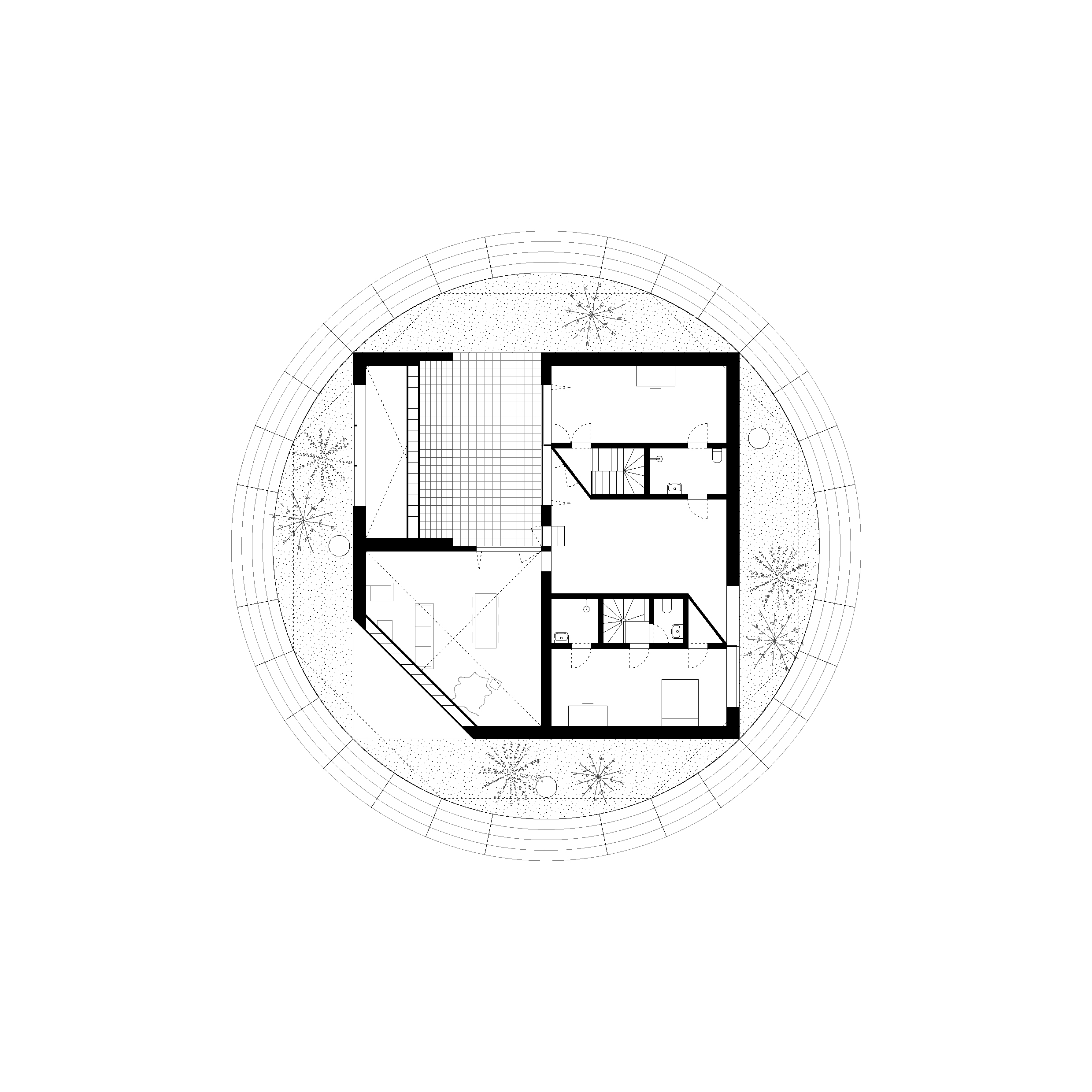 This is a house for a family with two young children, one of whom uses a wheelchair. For that child, the house functions as a world in itself, easily accessible, complex yet smooth – a continuous panorama. The round floorplan tries to emphasise this relationship between house and garden, between intimate and extrovert spaces. Its centripetal form collects a set of particular rooms that are easily accessible through the central space, which functions as storage.