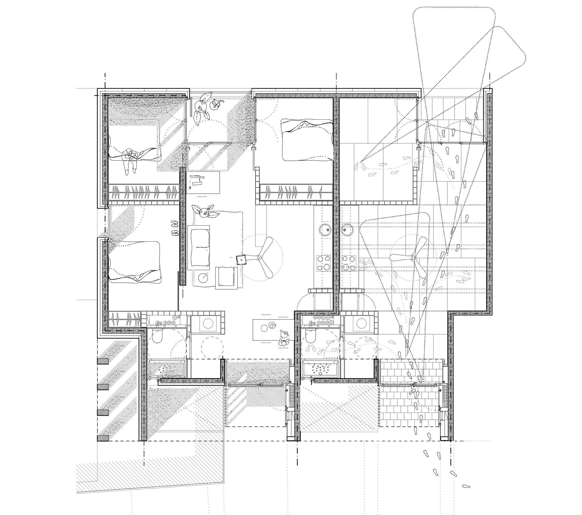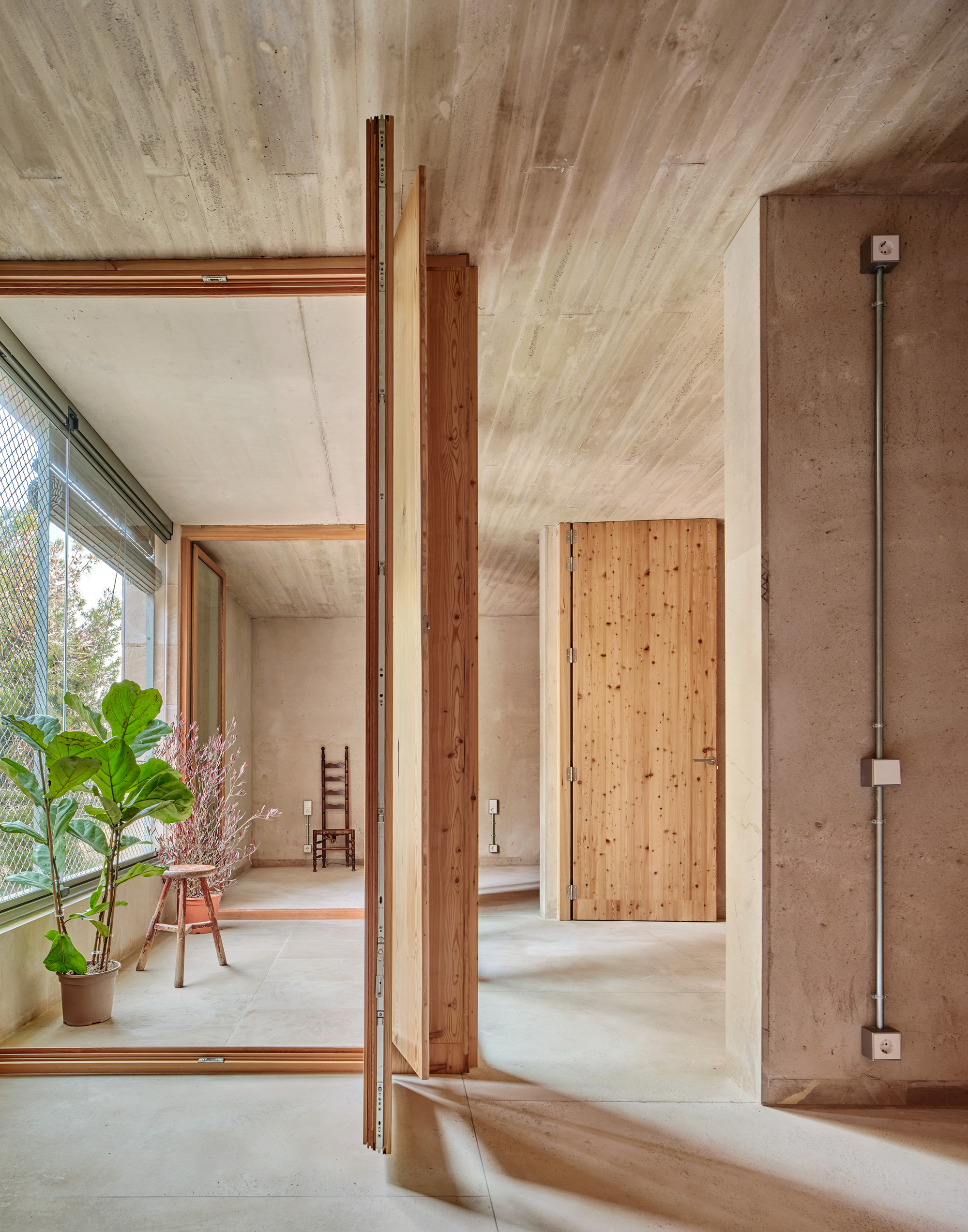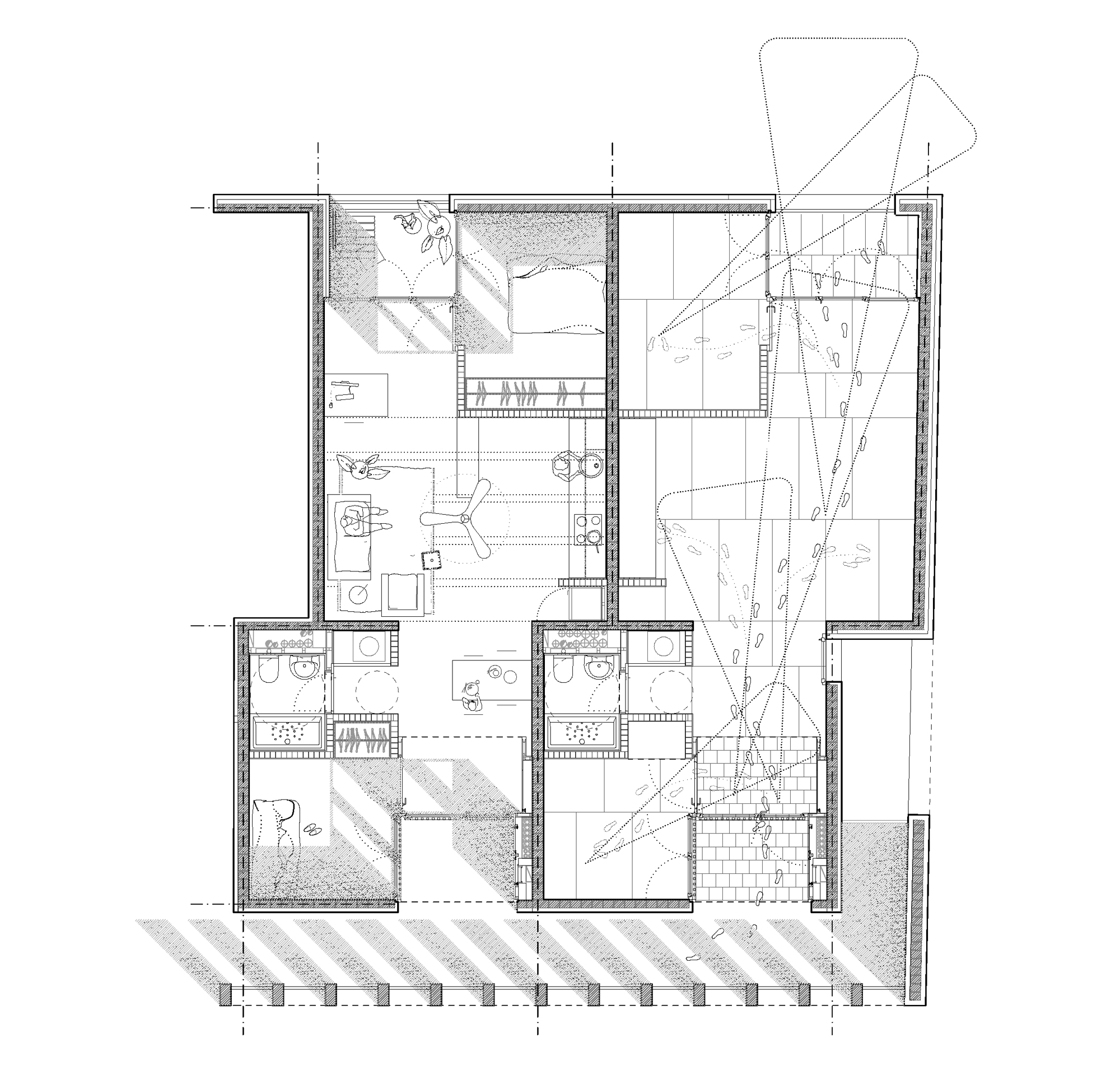 The typology of the through-house seeks the maximum distance between rooms to achieve a greater degree of privacy and unites them through an articulated space that configures differentiated areas without losing visual unity through long diagonals. The dining and study areas constitute spaces that, due to their proximity to the bedrooms, can be incorporated into them through large sliding doors. The living room and kitchen expand the center of gravity of the floor, looking outwards through two terraces. The diagonal arrangement of both recalls, on a different scale, the same mechanism that organized the patios of the plot.