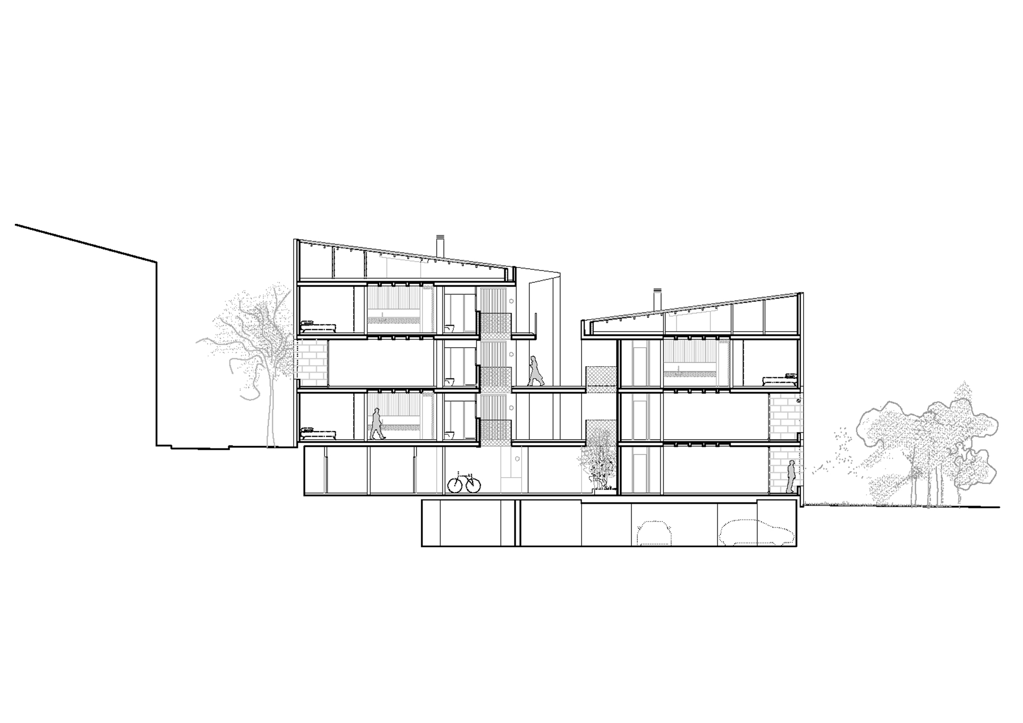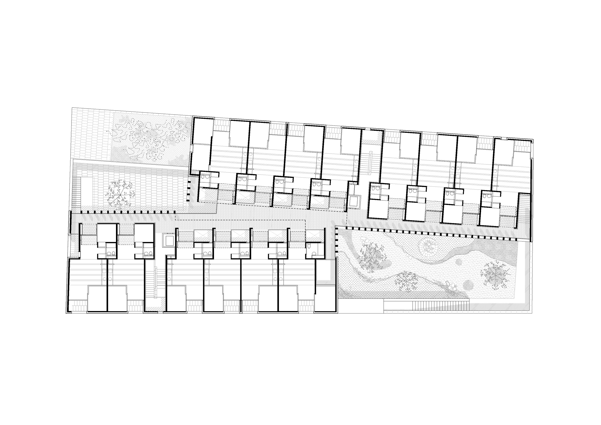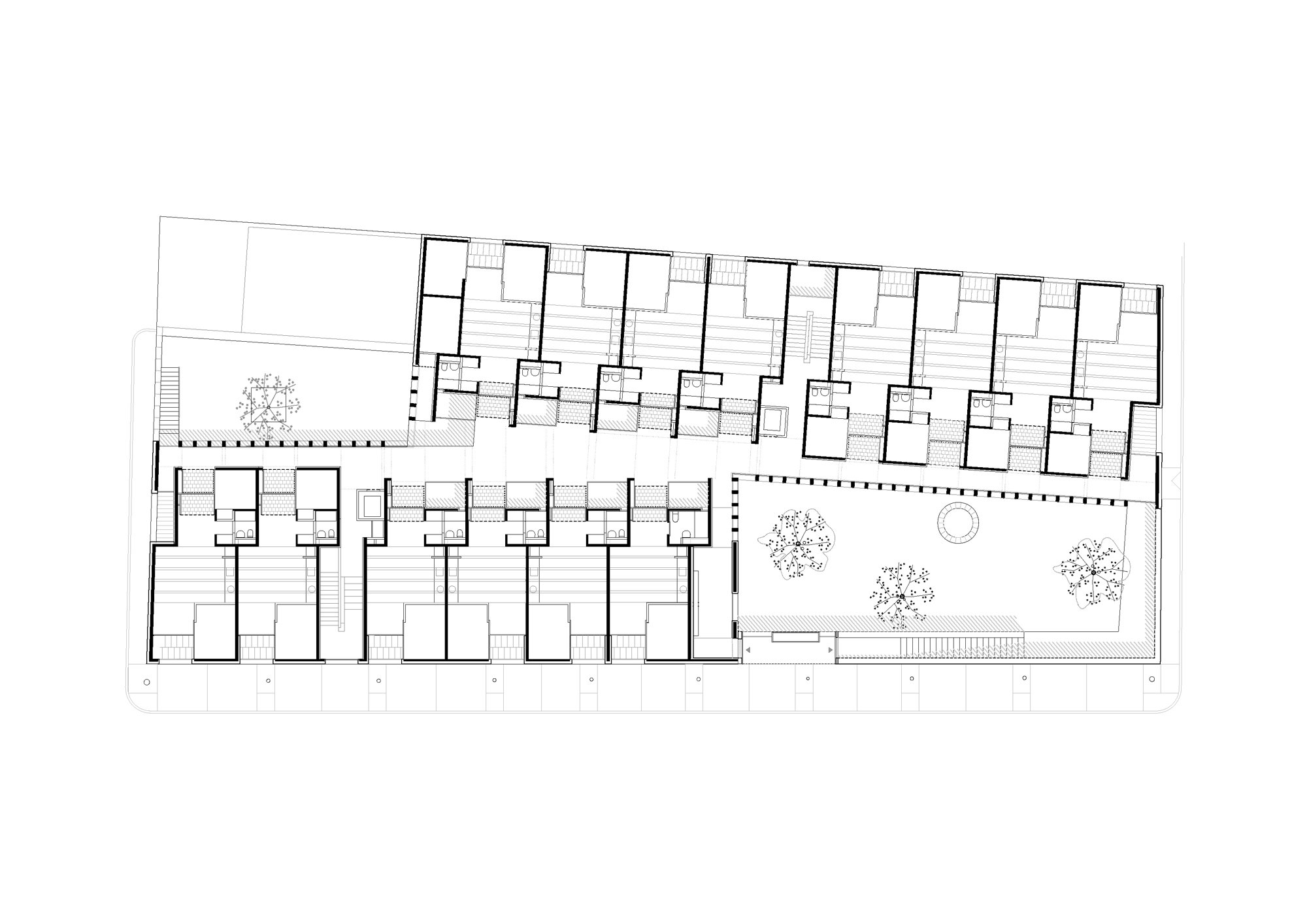 The building is developed along a walkway, incorporating light wells in the central area. A white concrete slat enclosure filters the air, light and the view towards the courtyards of the plot and allows cross ventilation of the homes. The aggregation system locks the dividing walls seeking the diagonal on the floor plan.