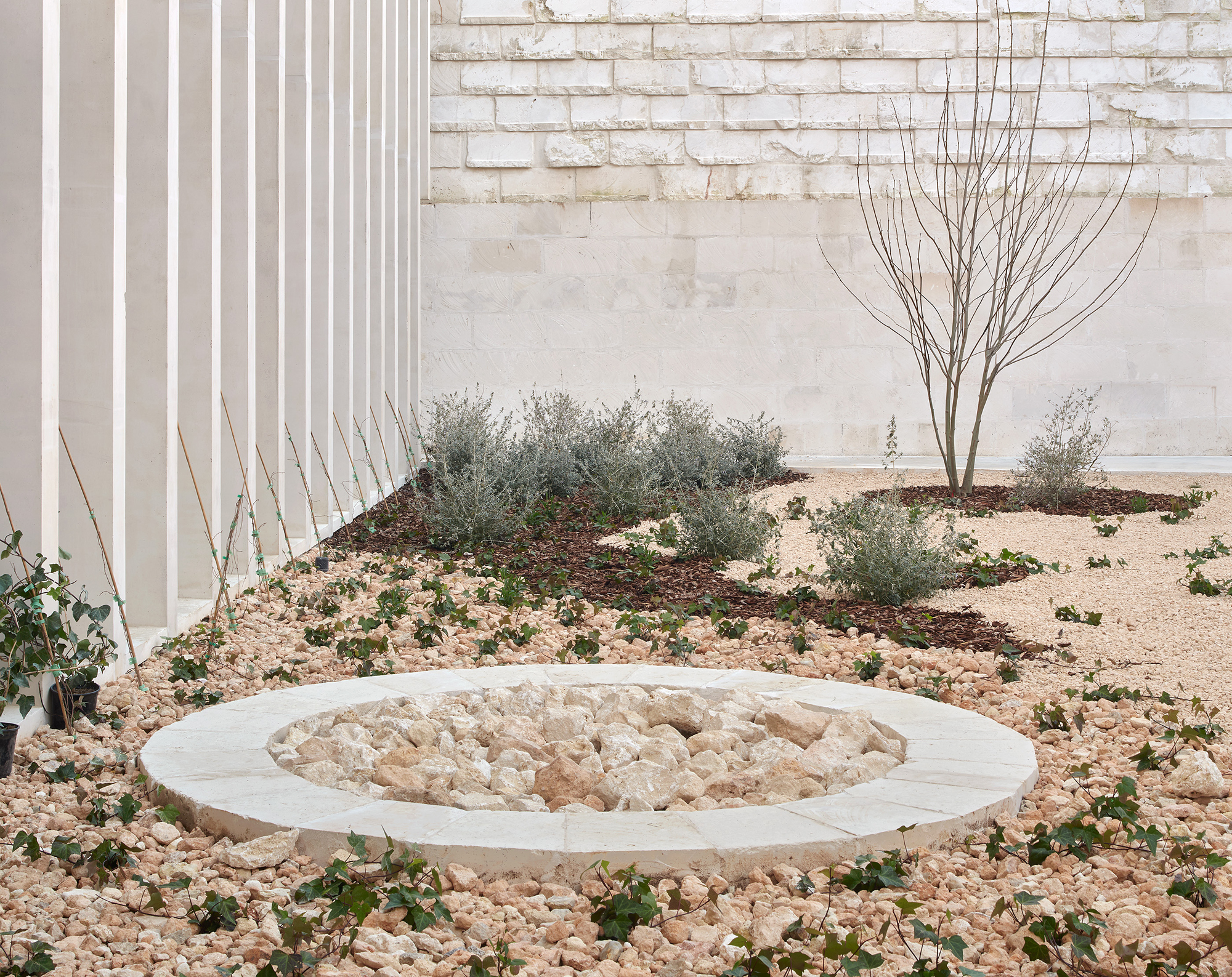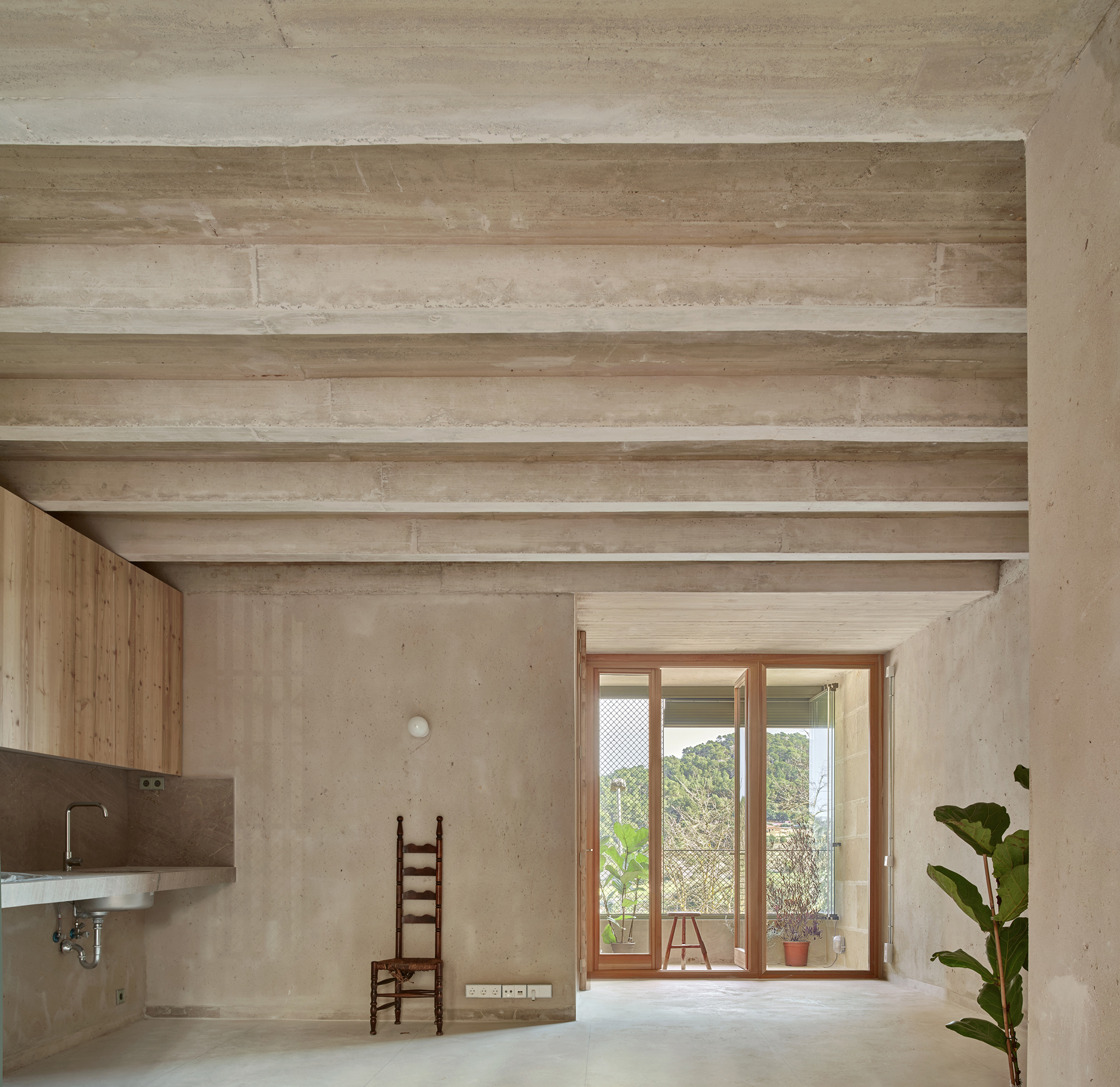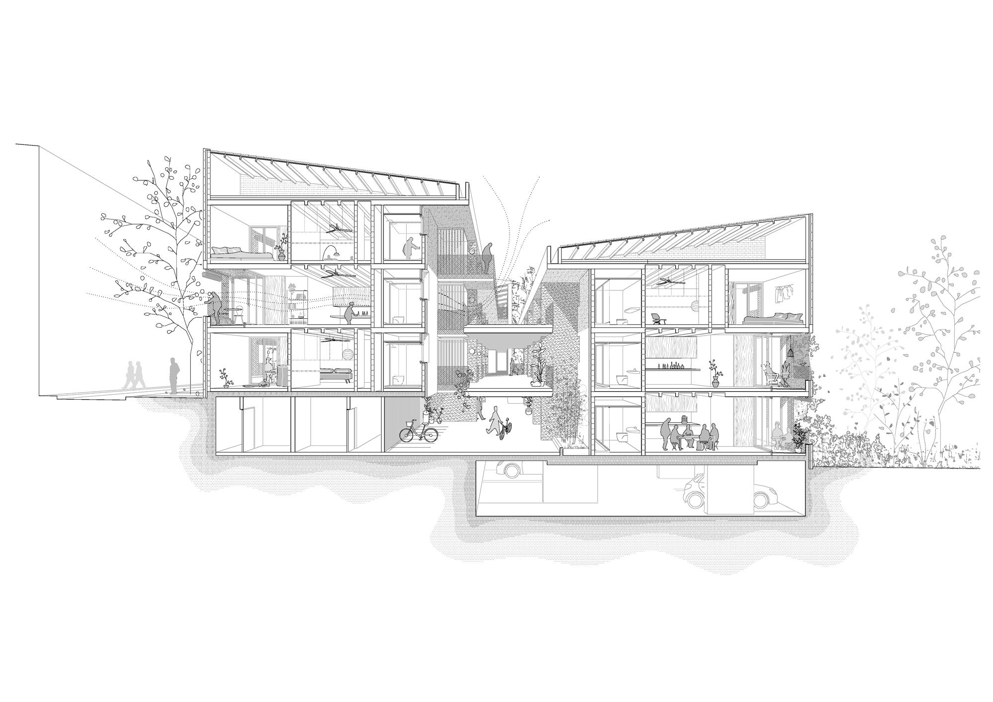 The building is developed along a walkway, incorporating light wells in the central area. A white concrete slat enclosure filters the air, light and the view towards the courtyards of the plot and allows cross ventilation of the homes. The aggregation system locks the dividing walls seeking the diagonal on the floor plan.