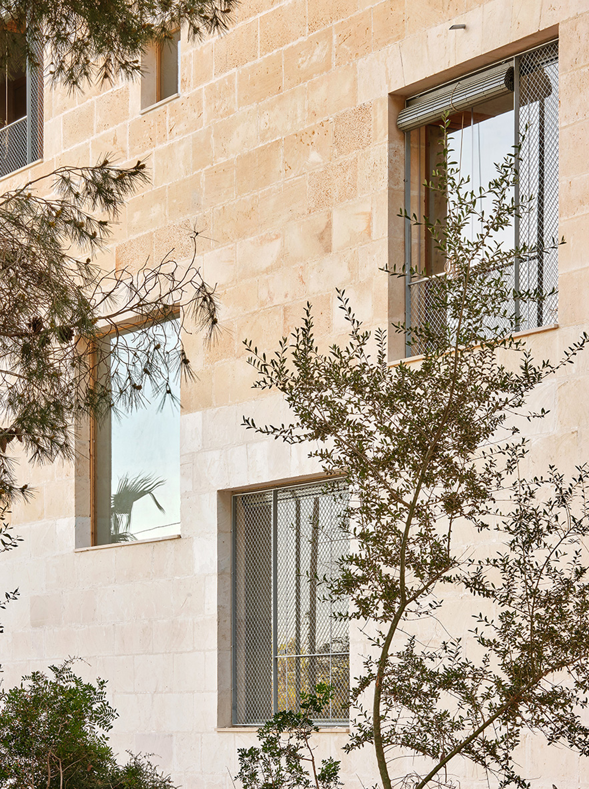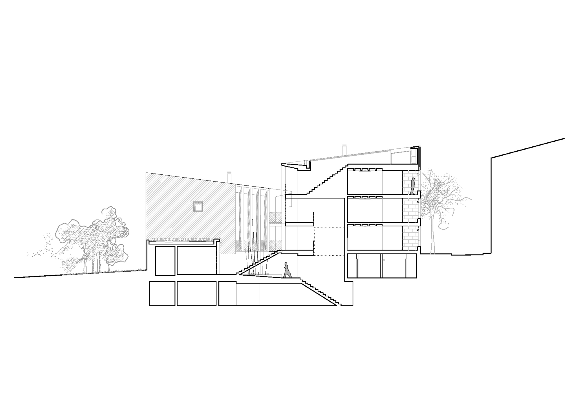 The building is staggered on the site according to its slope. The sloping roofs of Arabic tiles, the facades of stuccoed openings and the sandstone walls that extend the base of the building, give it a character capable of integrating and dialoguing with the place without resorting to mimetic mechanisms.