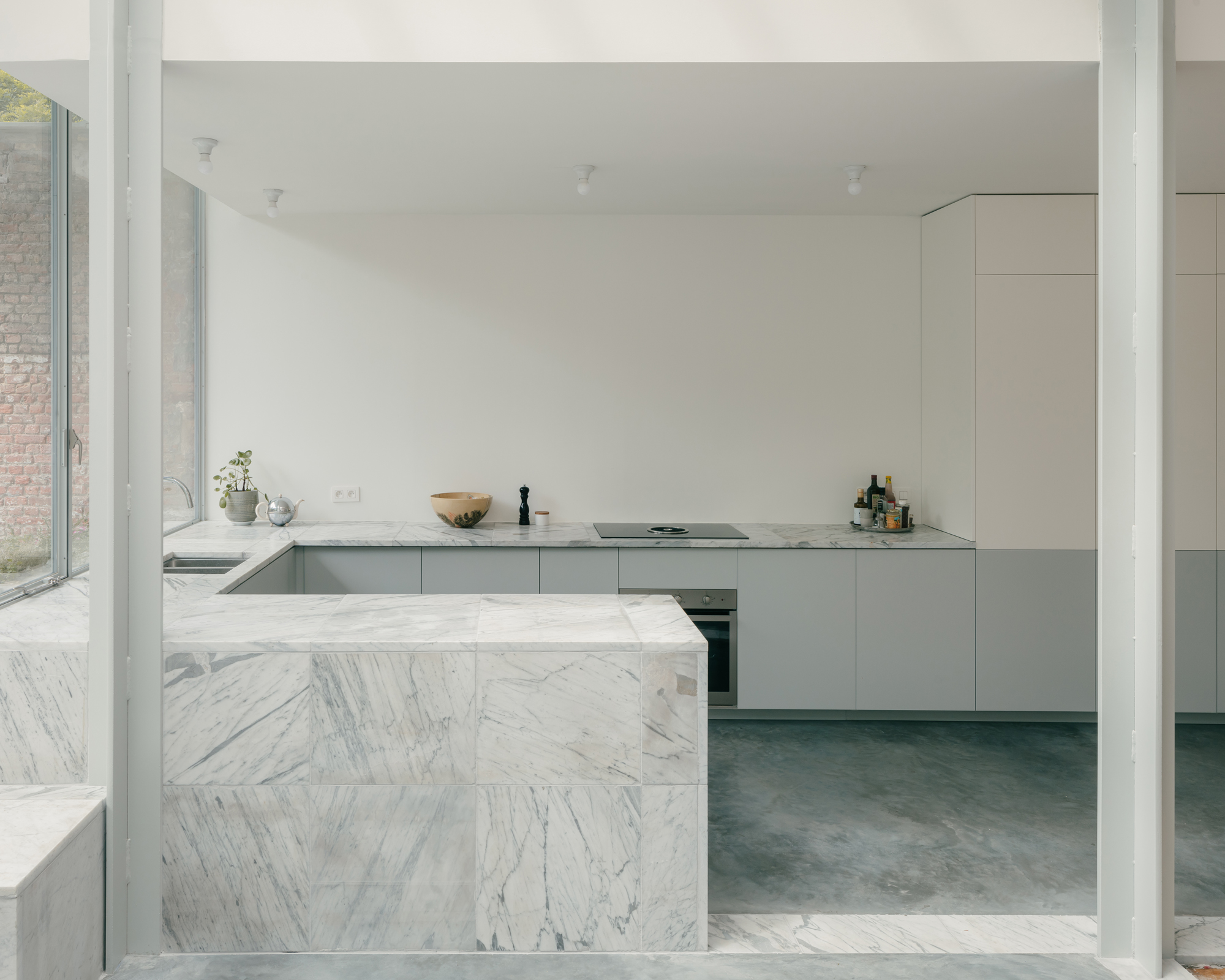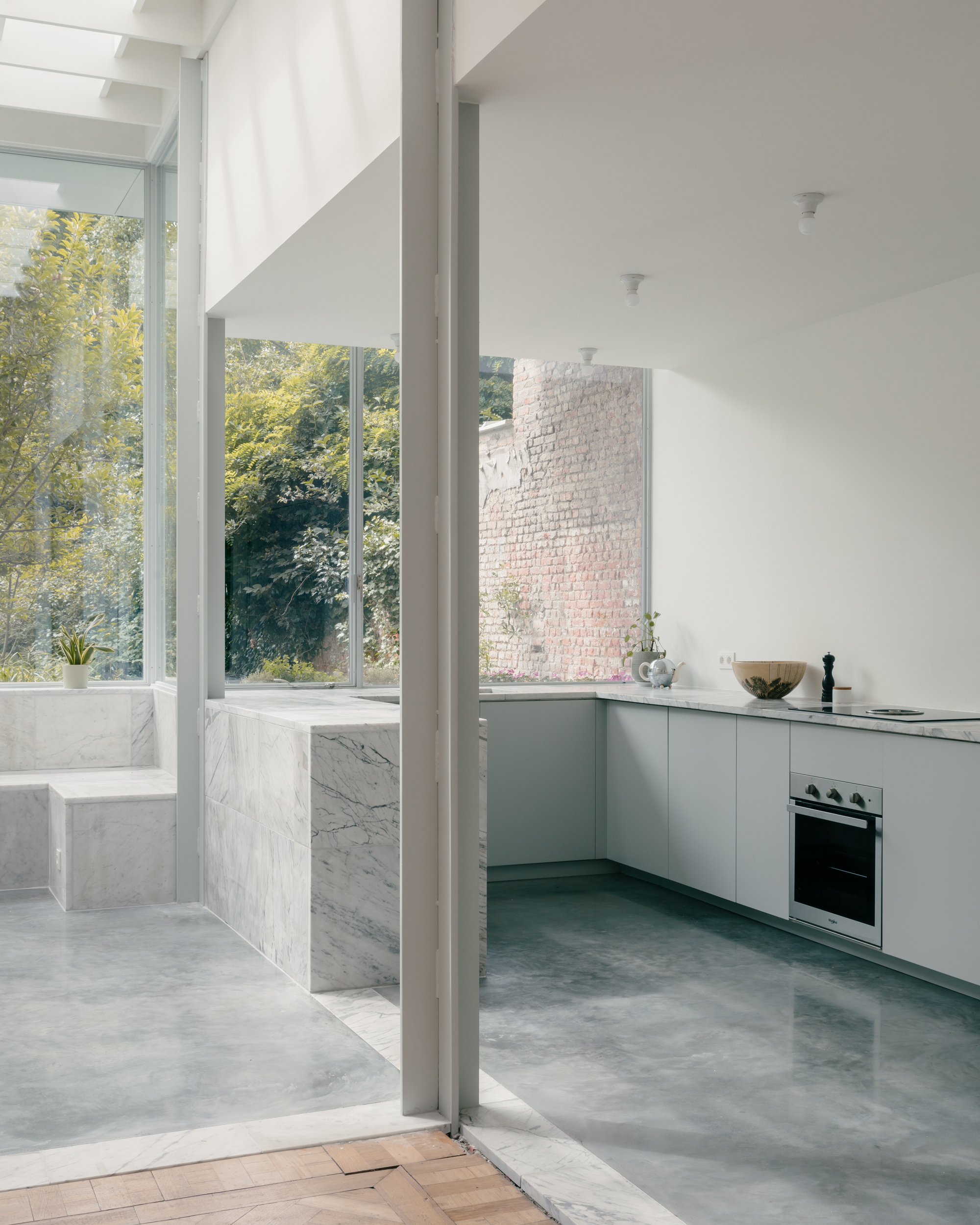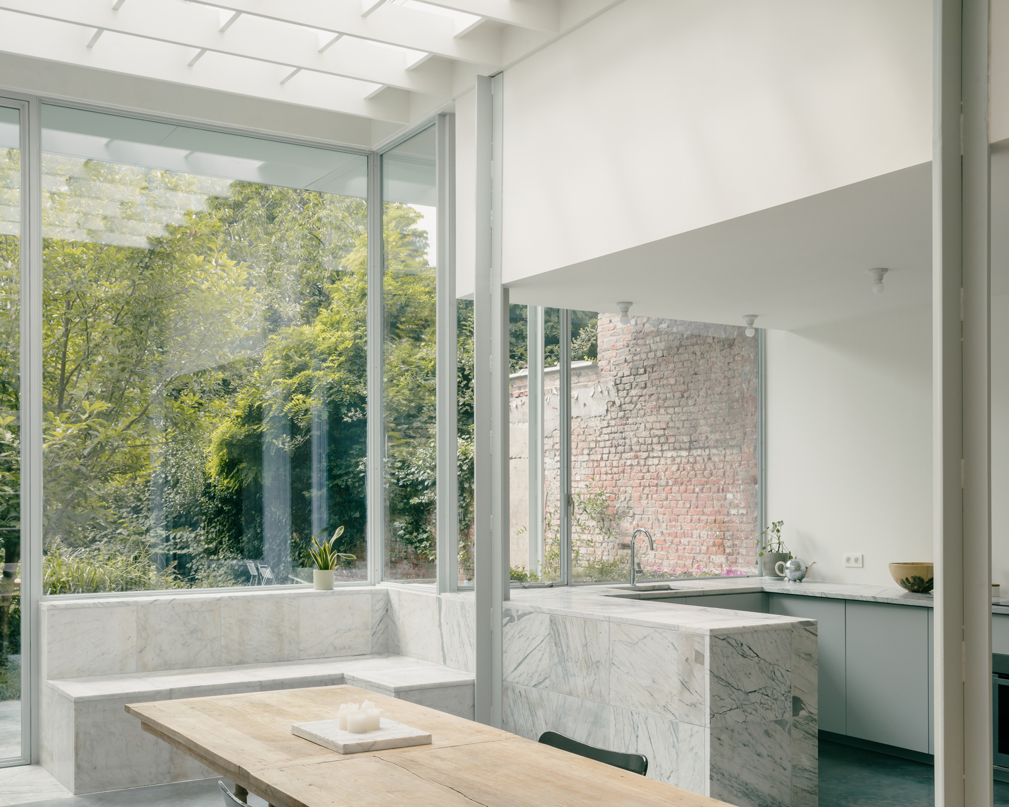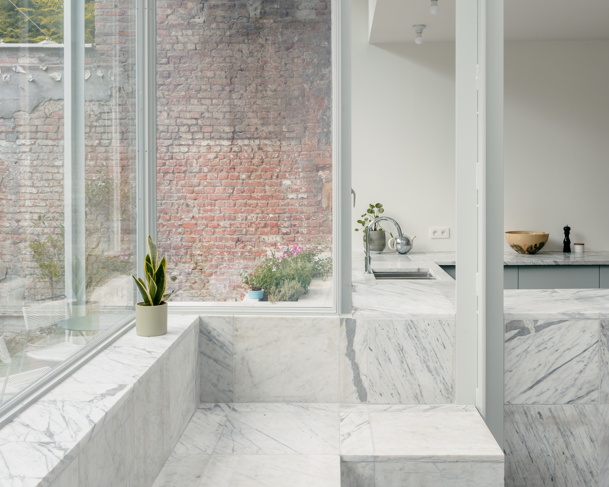 On the ground floor, the well-known Flemish rear extension was replaced by a sober, elegant variant using recycled marble from the former Brussels North Station creating a monolithic sculpture in which benches, countertops and kitchen furniture come together.