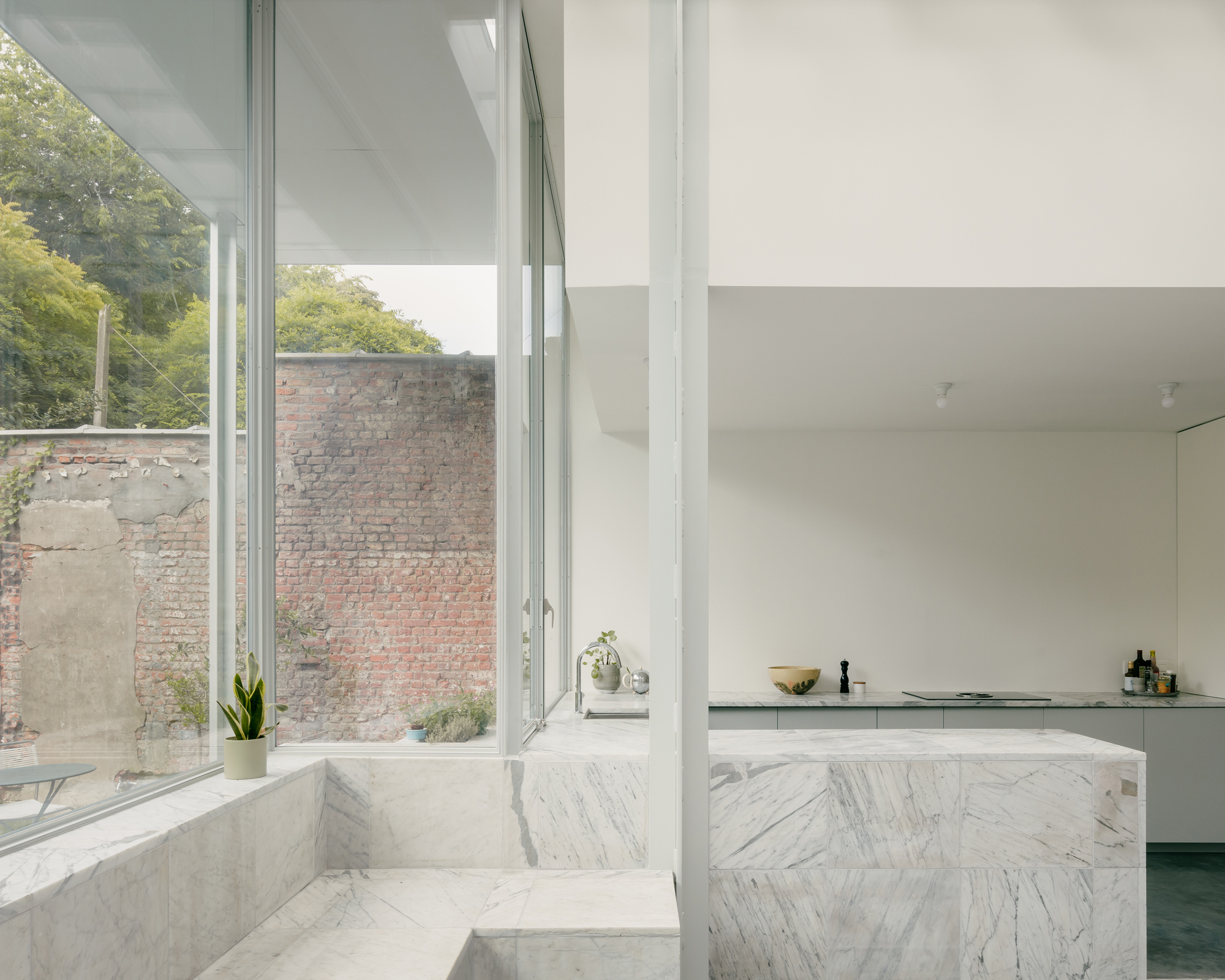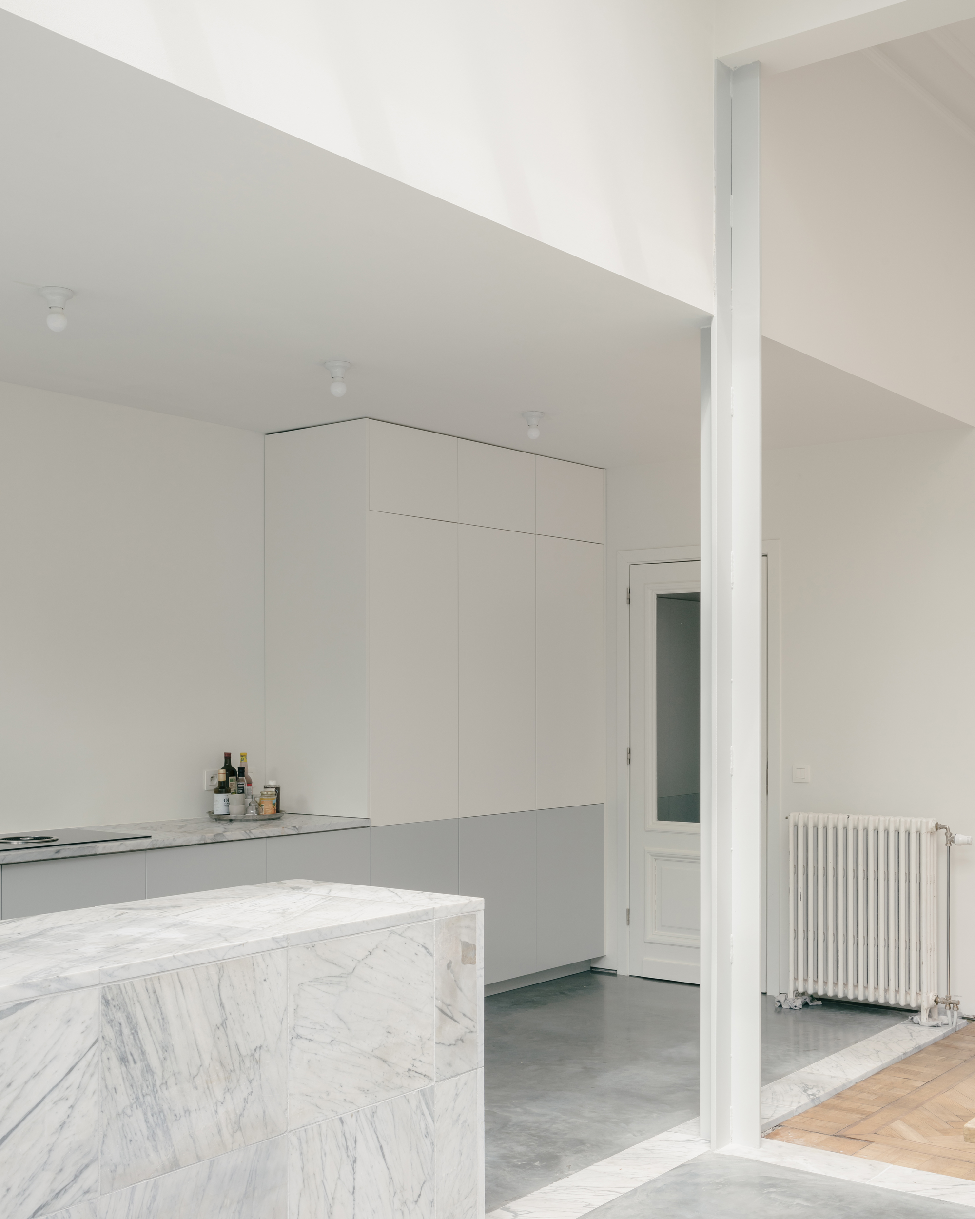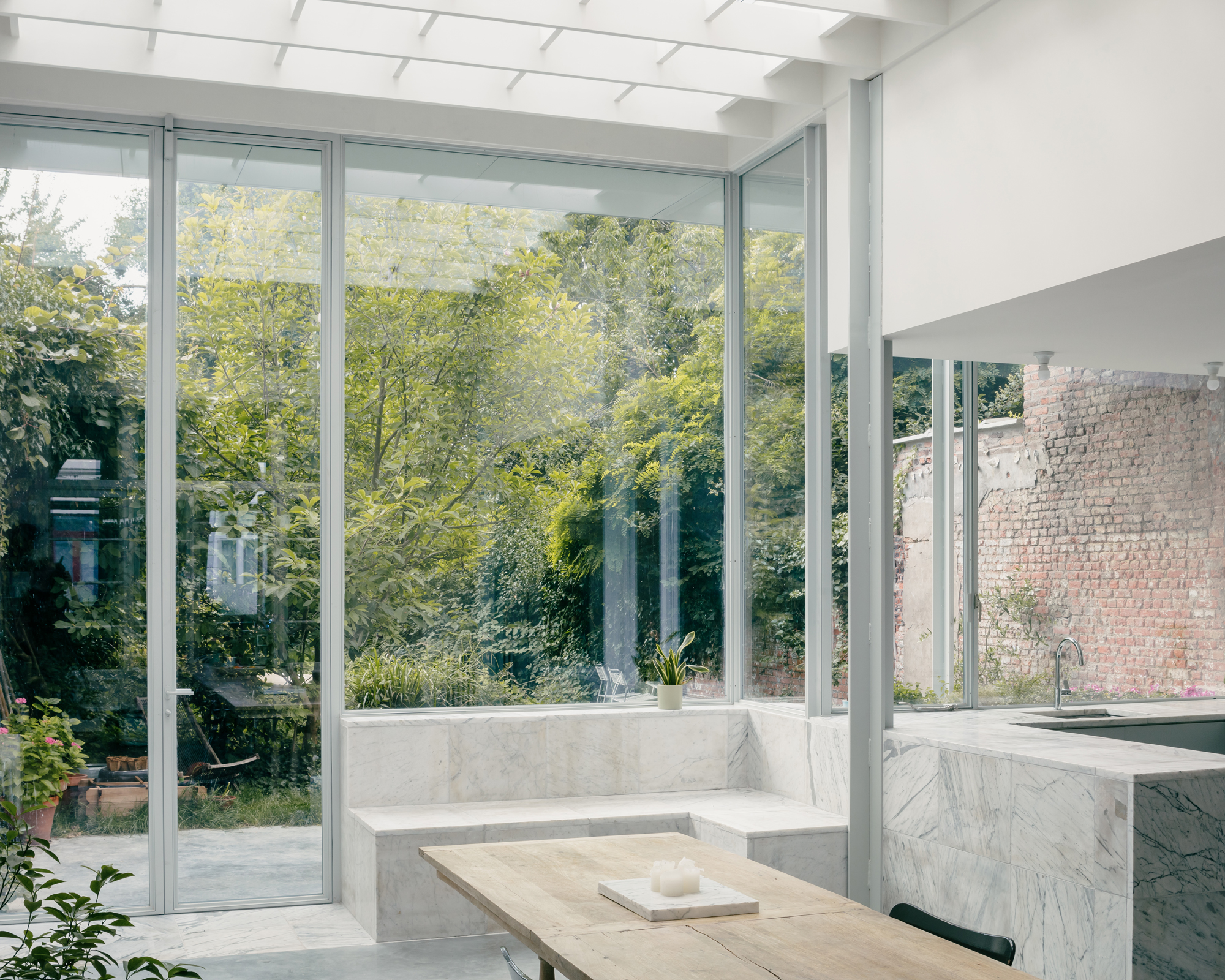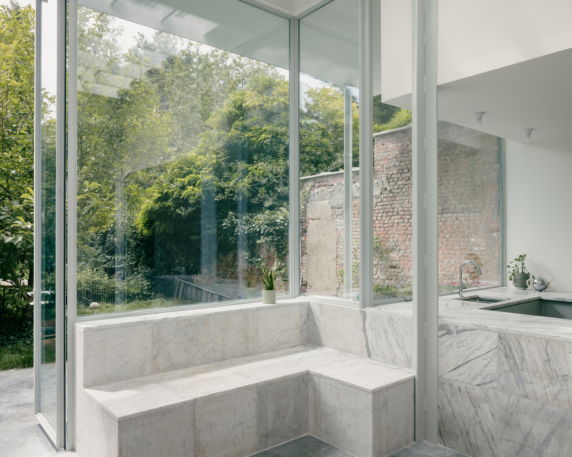 On the ground floor, the well-known Flemish rear extension was replaced by a sober, elegant variant using recycled marble from the former Brussels North Station creating a monolithic sculpture in which benches, countertops and kitchen furniture come together.