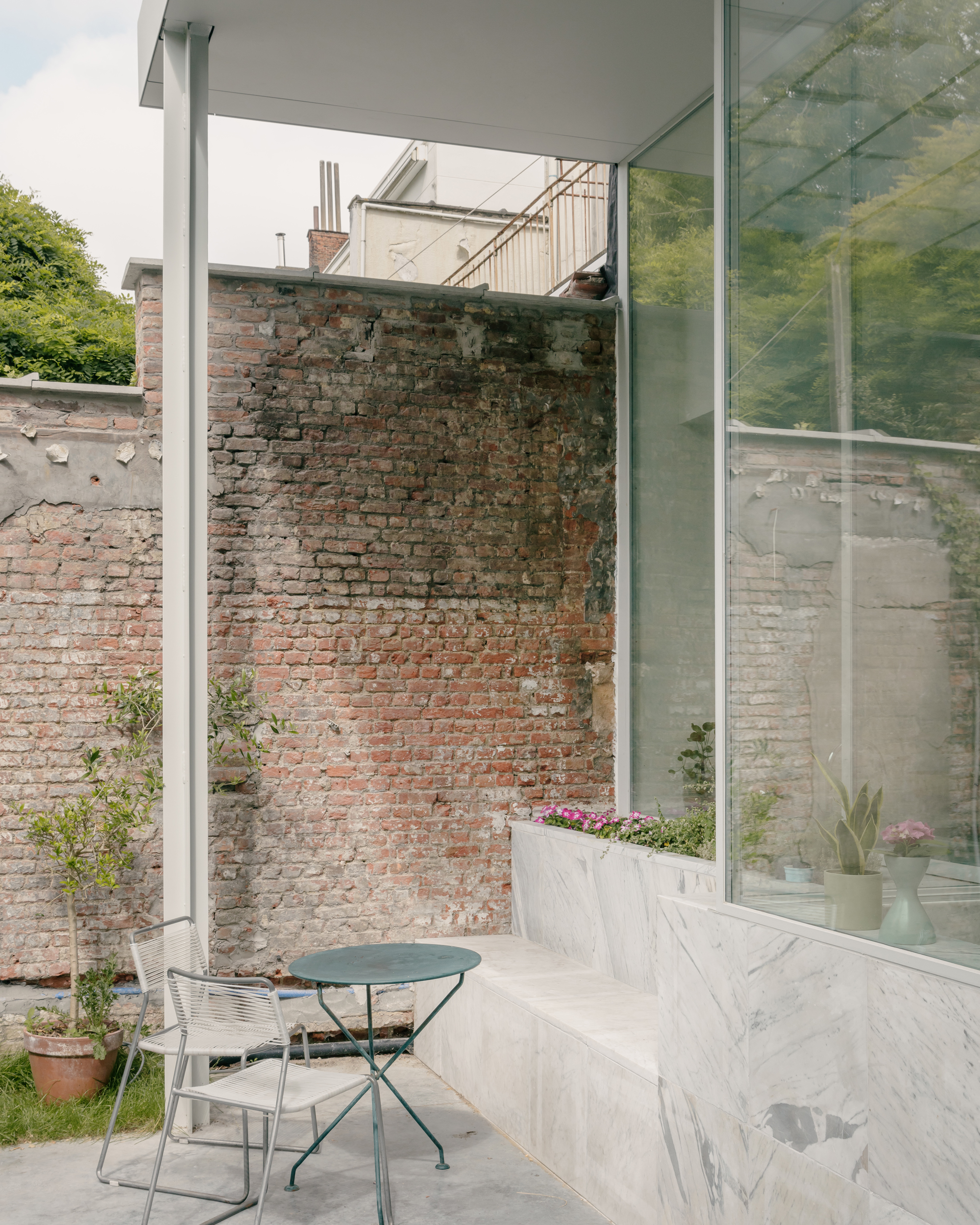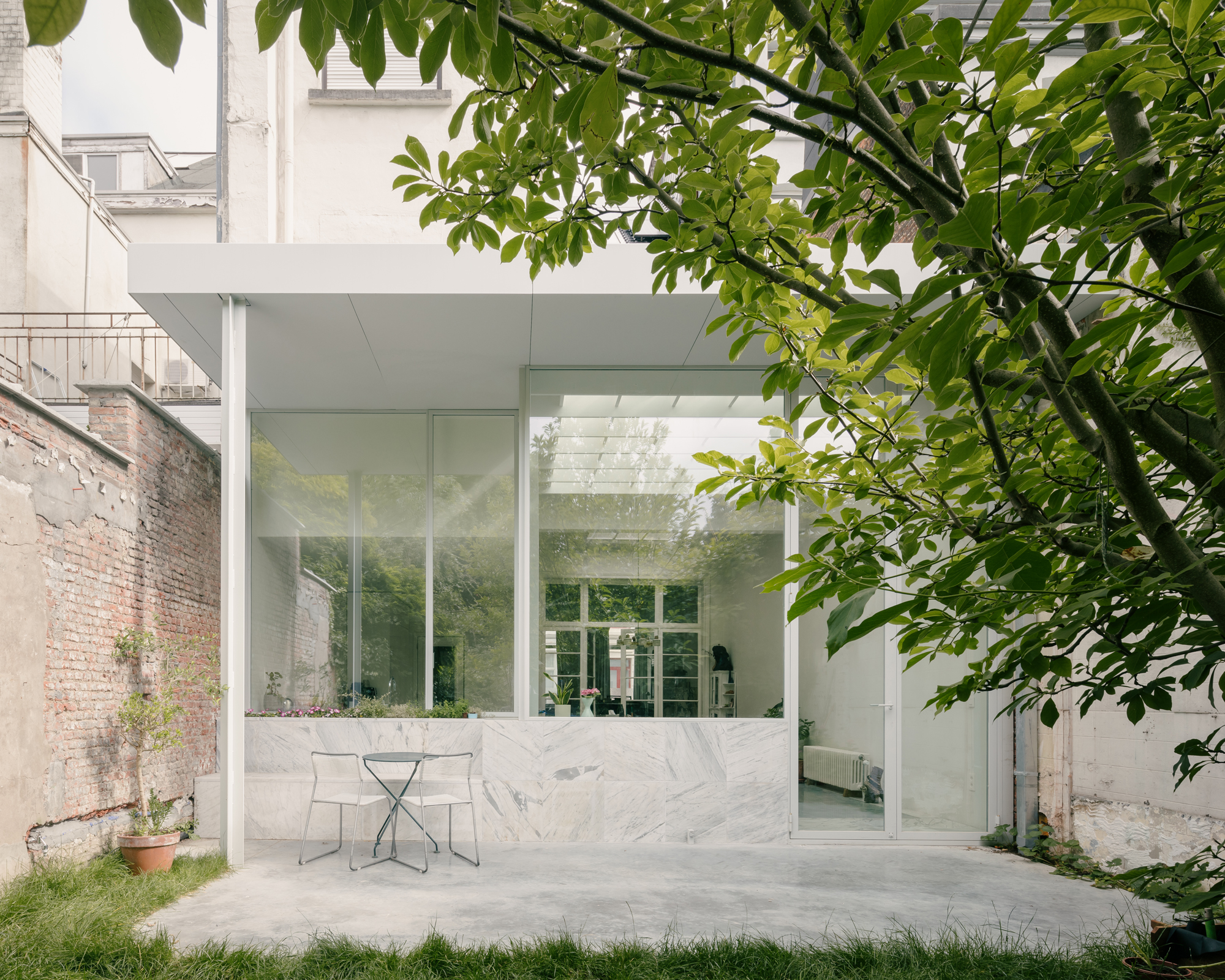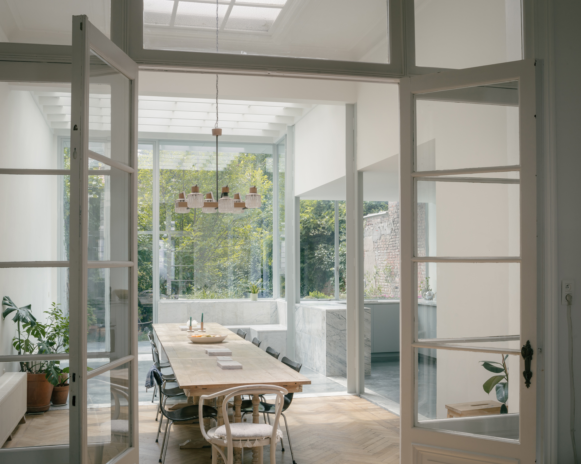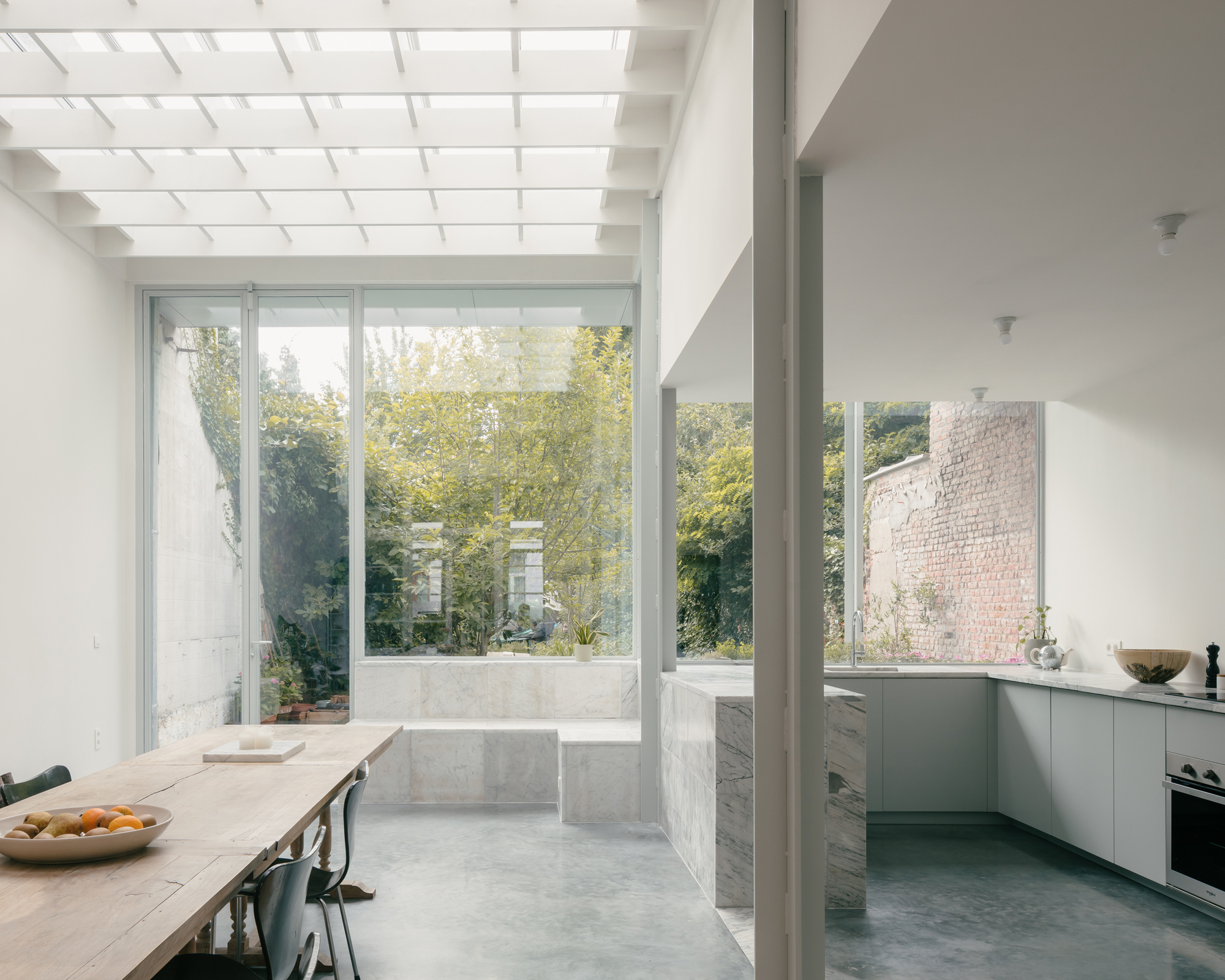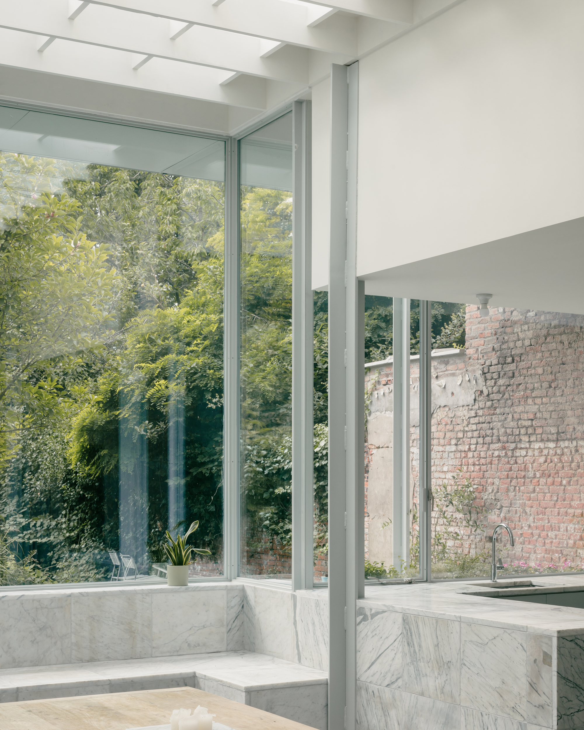 On the ground floor, the well-known Flemish rear extension was replaced by a sober, elegant variant using recycled marble from the former Brussels North Station creating a monolithic sculpture in which benches, countertops and kitchen furniture come together.