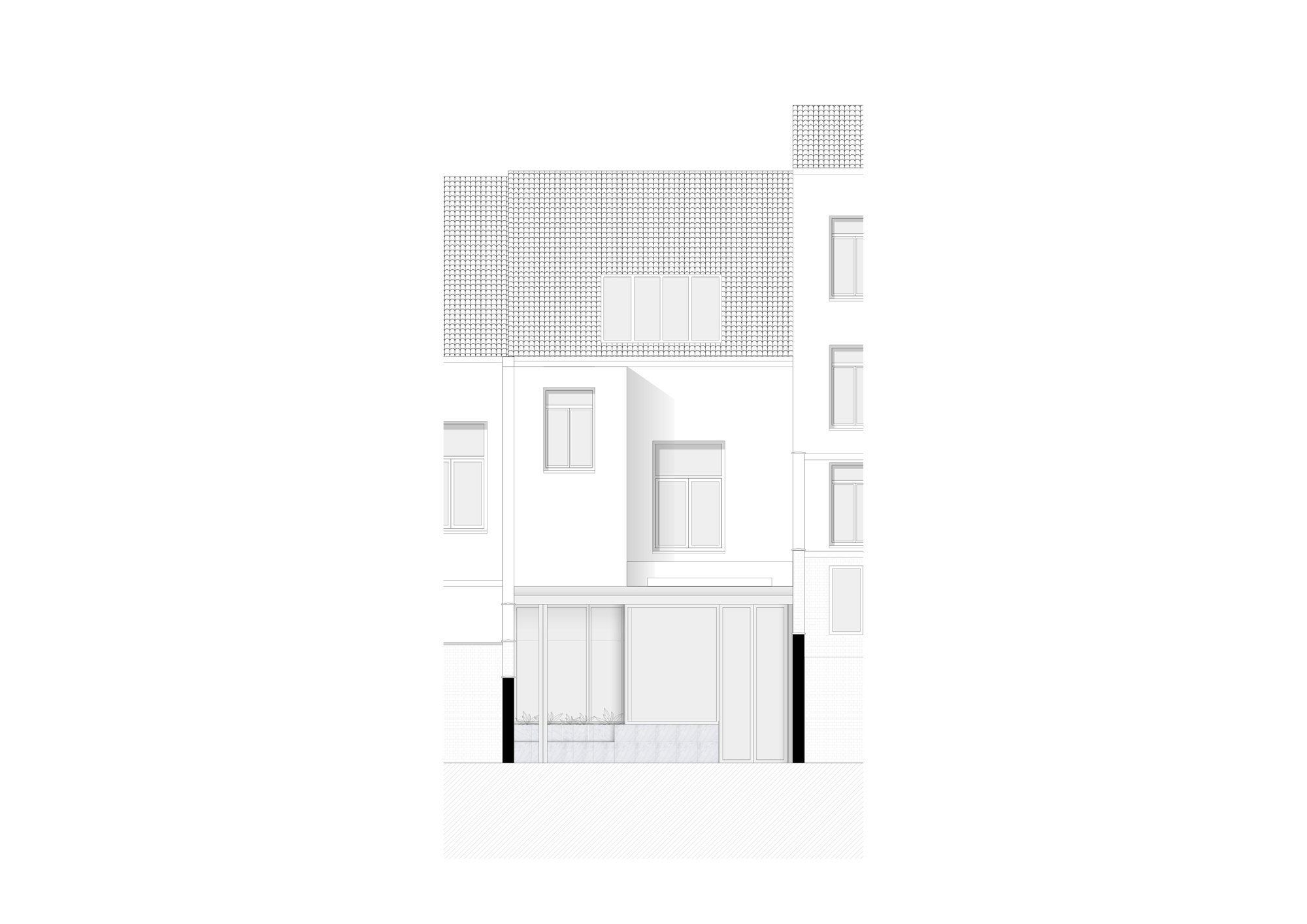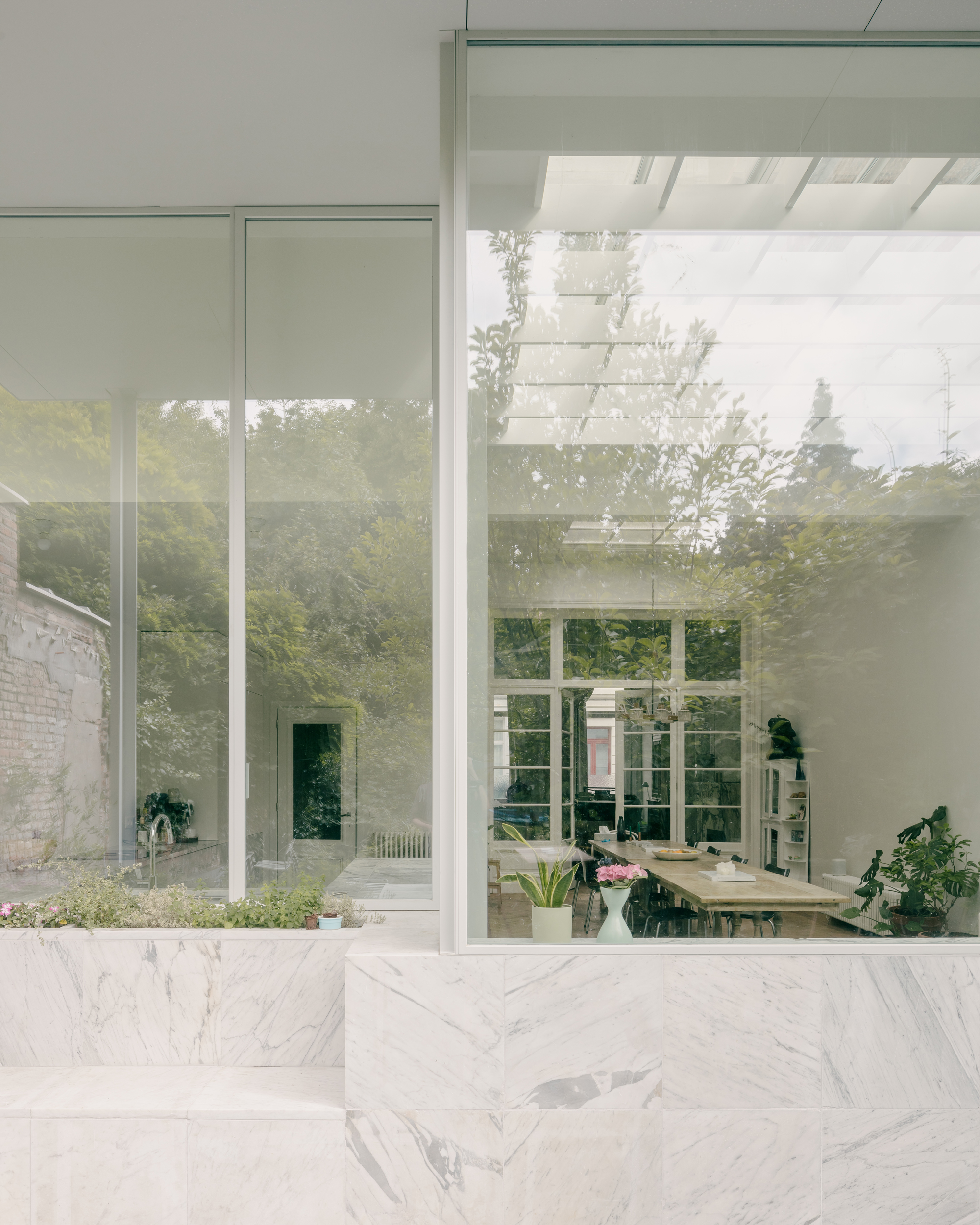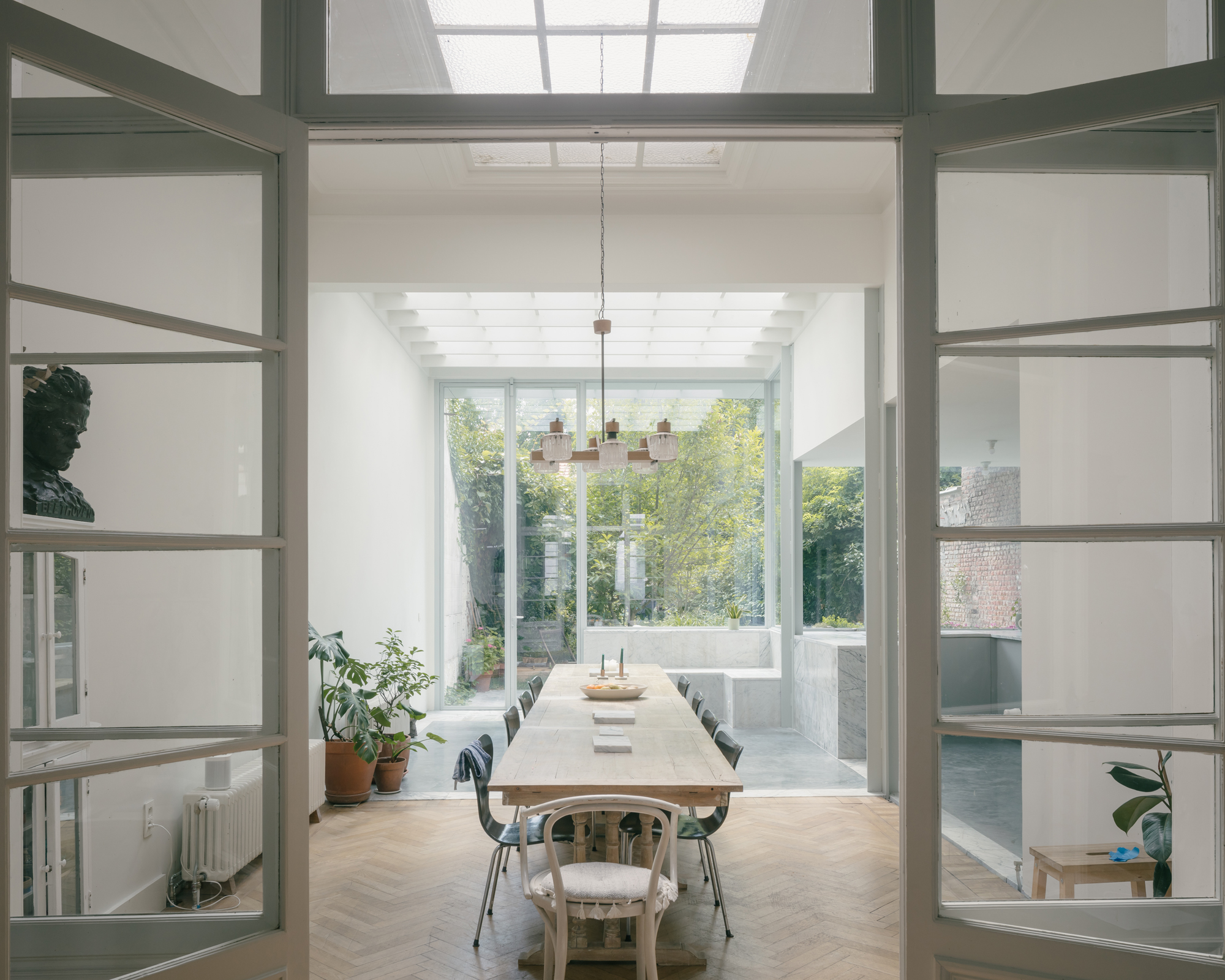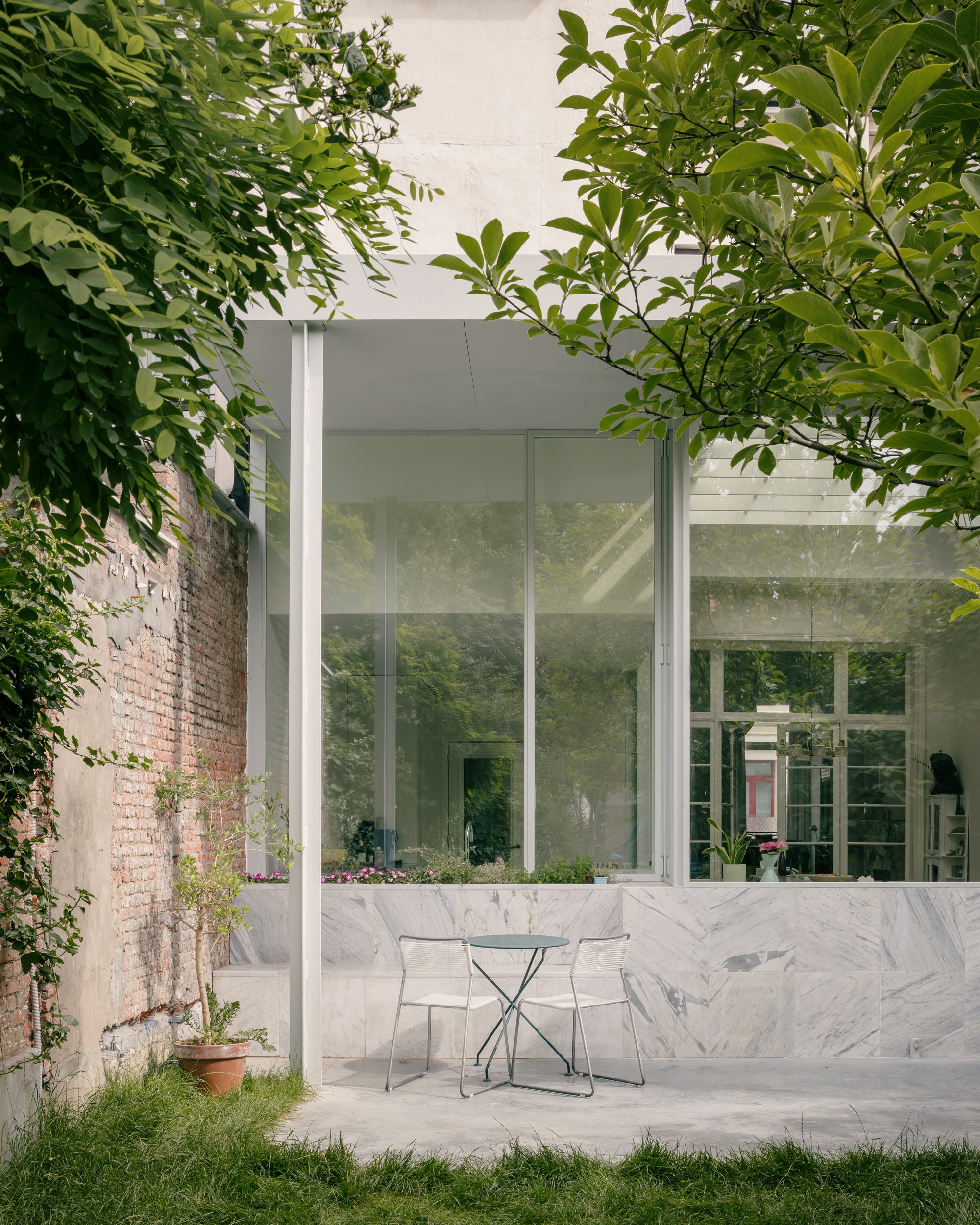 On the ground floor, the well-known Flemish rear extension was replaced by a sober, elegant variant using recycled marble from the former Brussels North Station creating a monolithic sculpture in which benches, countertops and kitchen furniture come together.