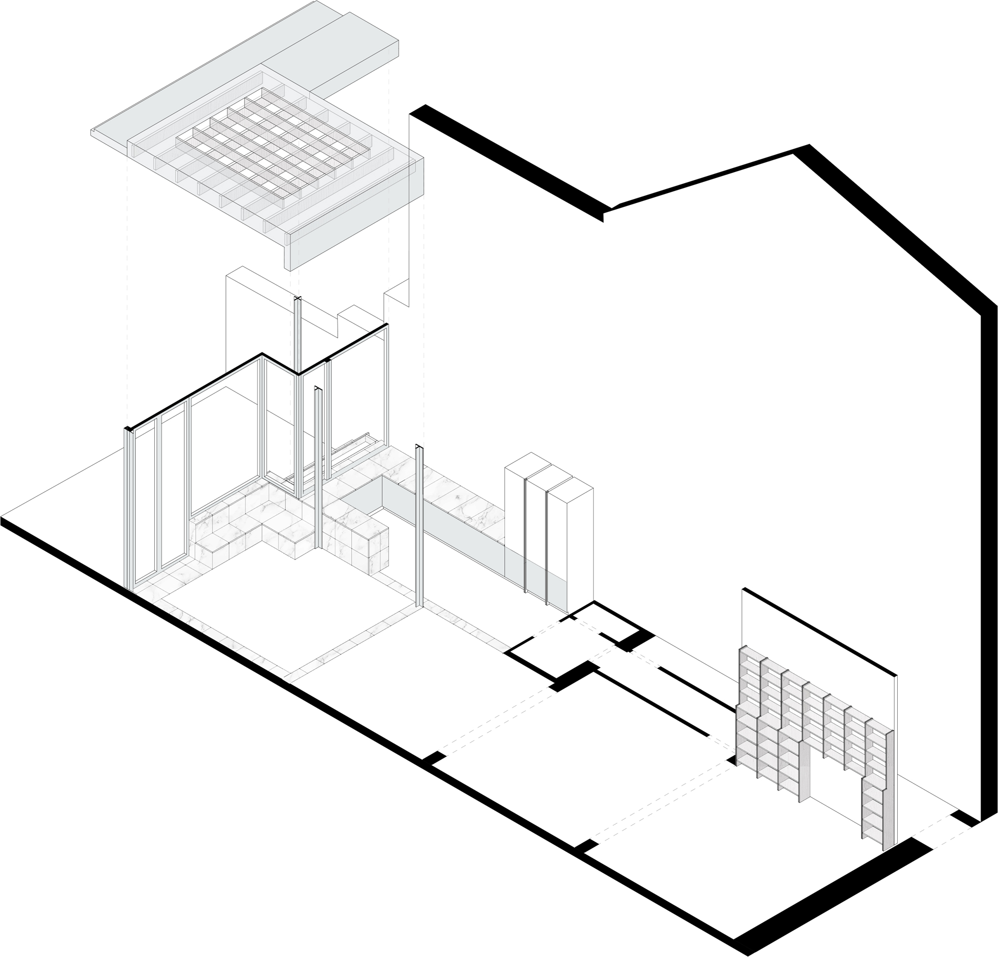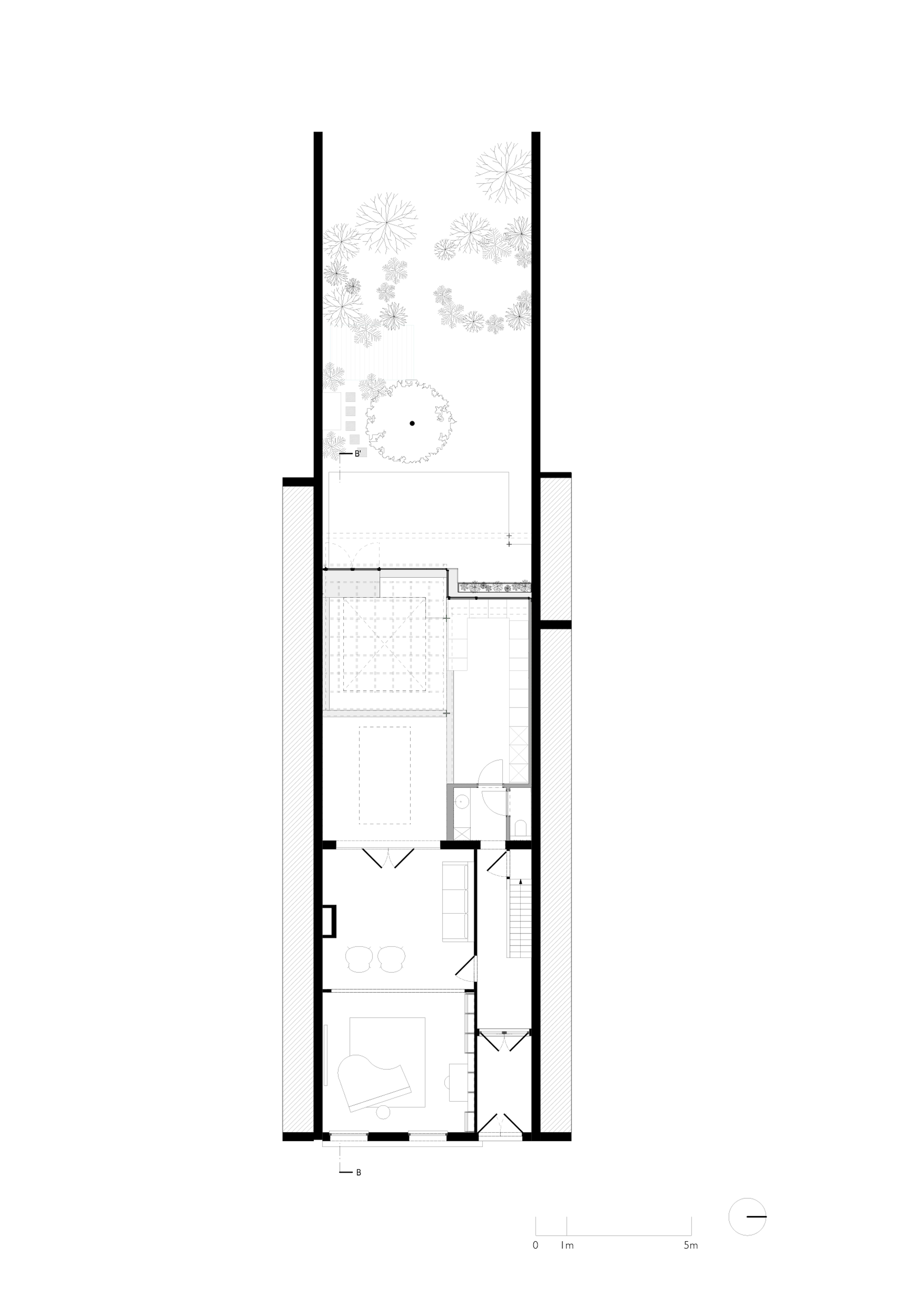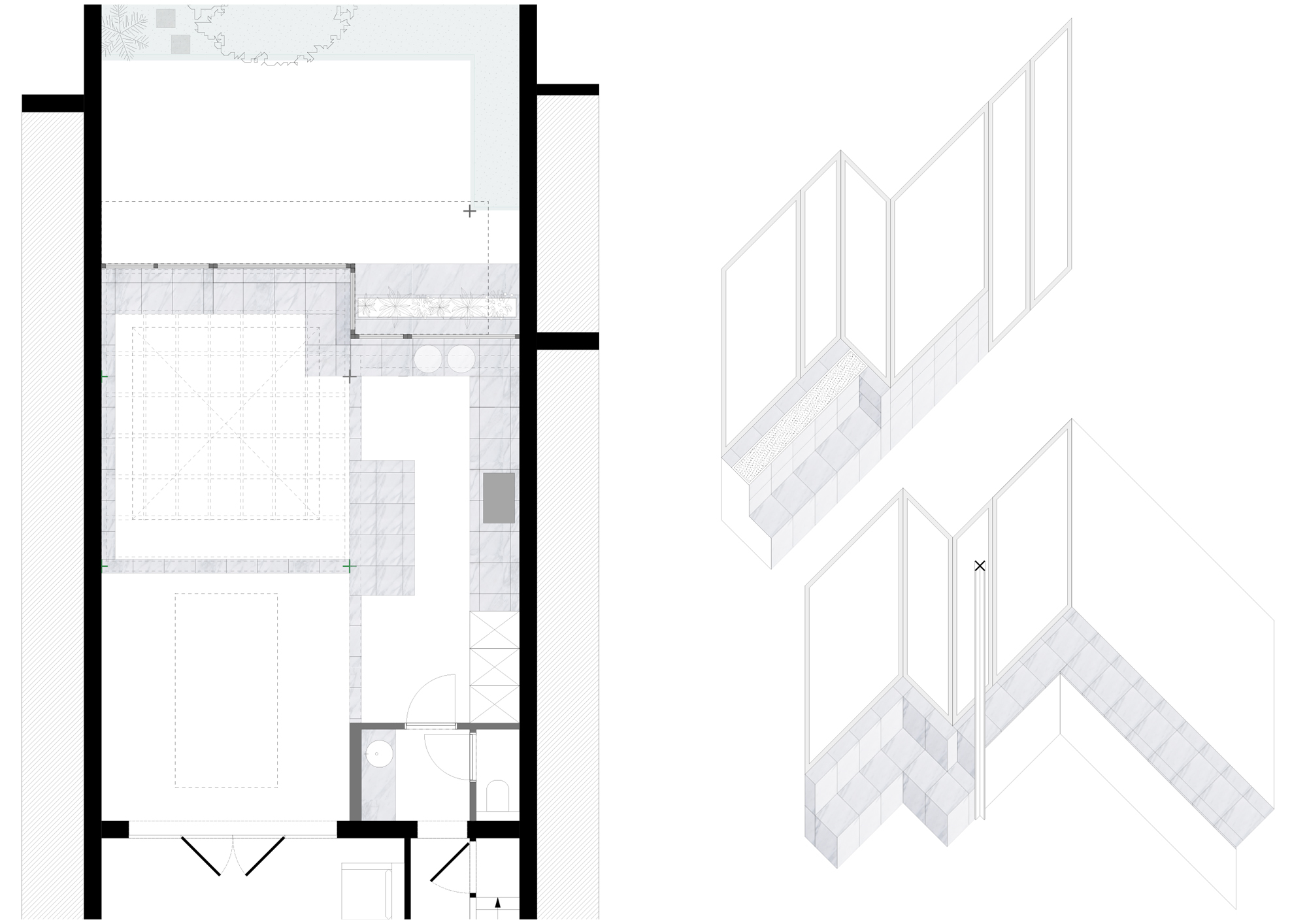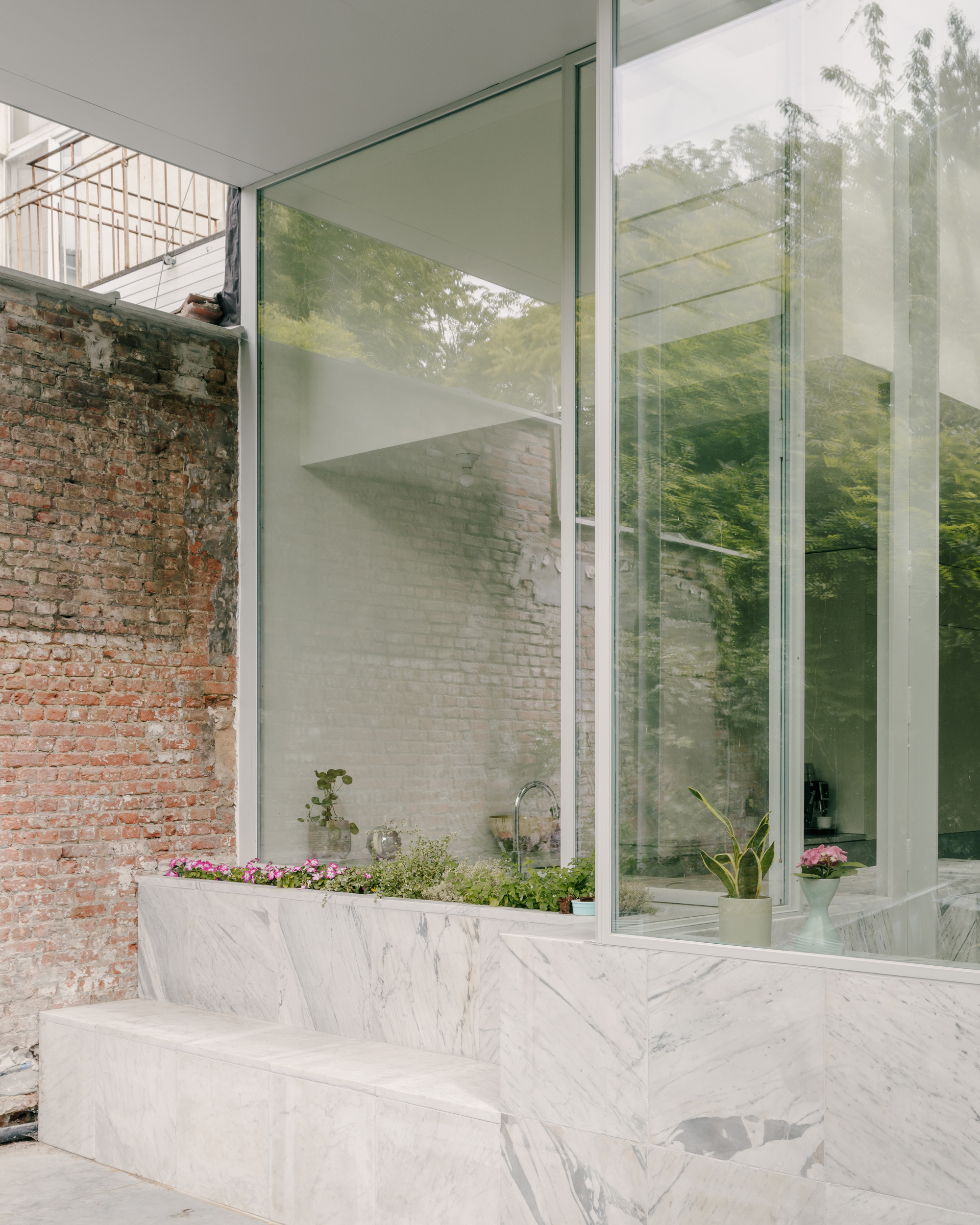 On the ground floor, the well-known Flemish rear extension was replaced by a sober, elegant variant using recycled marble from the former Brussels North Station creating a monolithic sculpture in which benches, countertops and kitchen furniture come together.