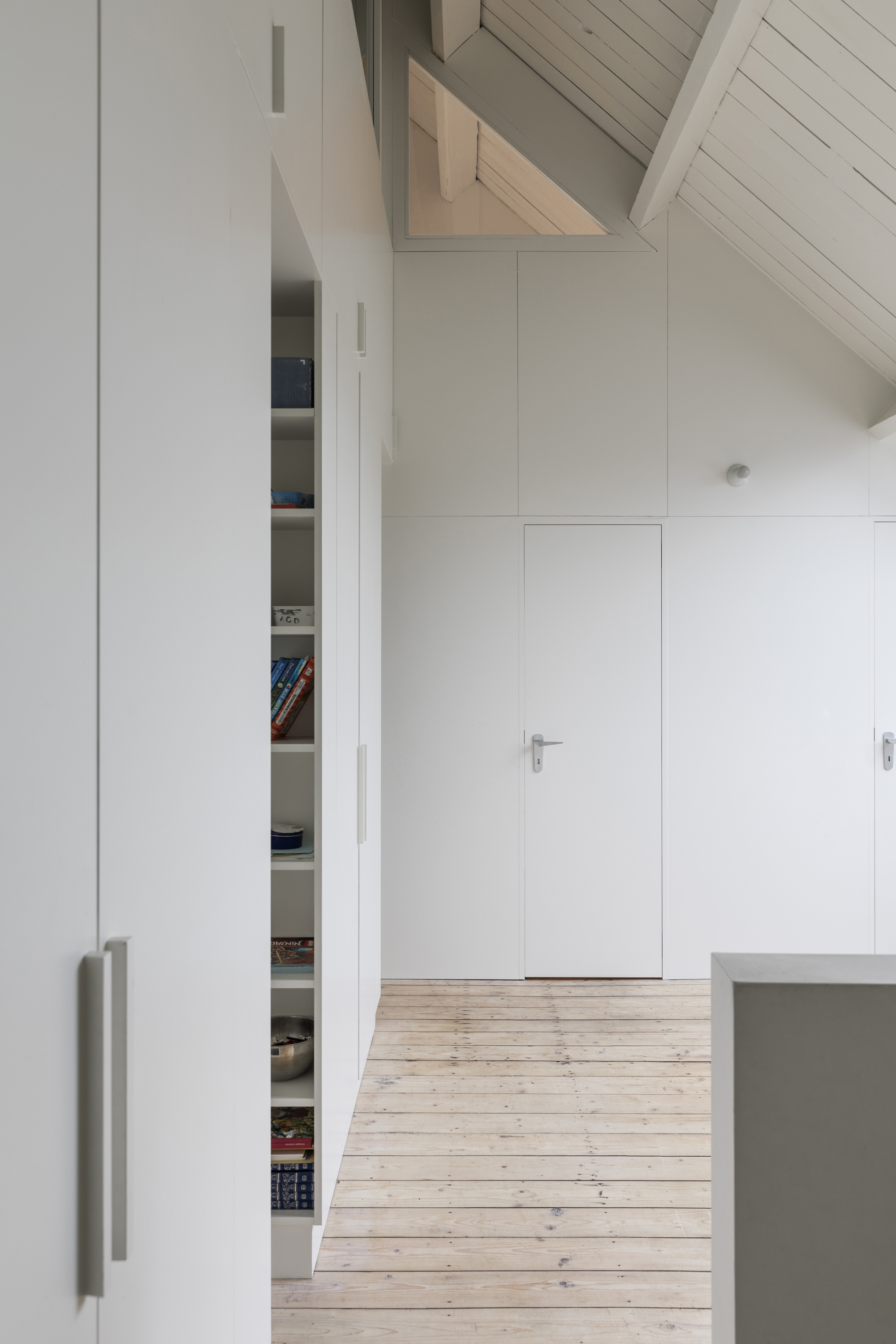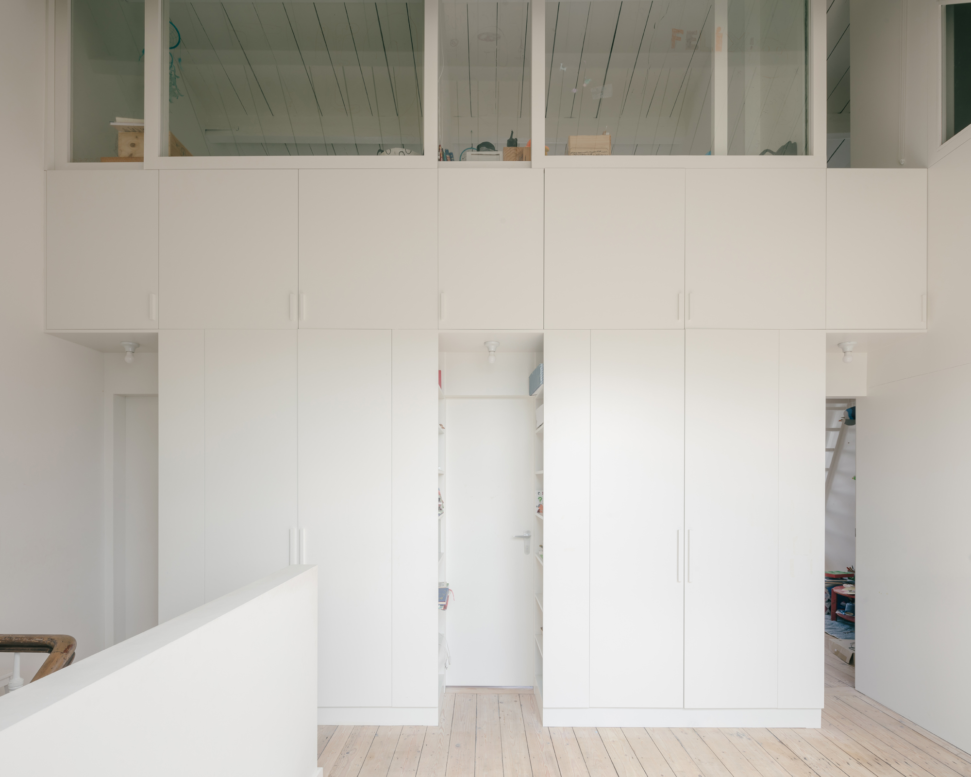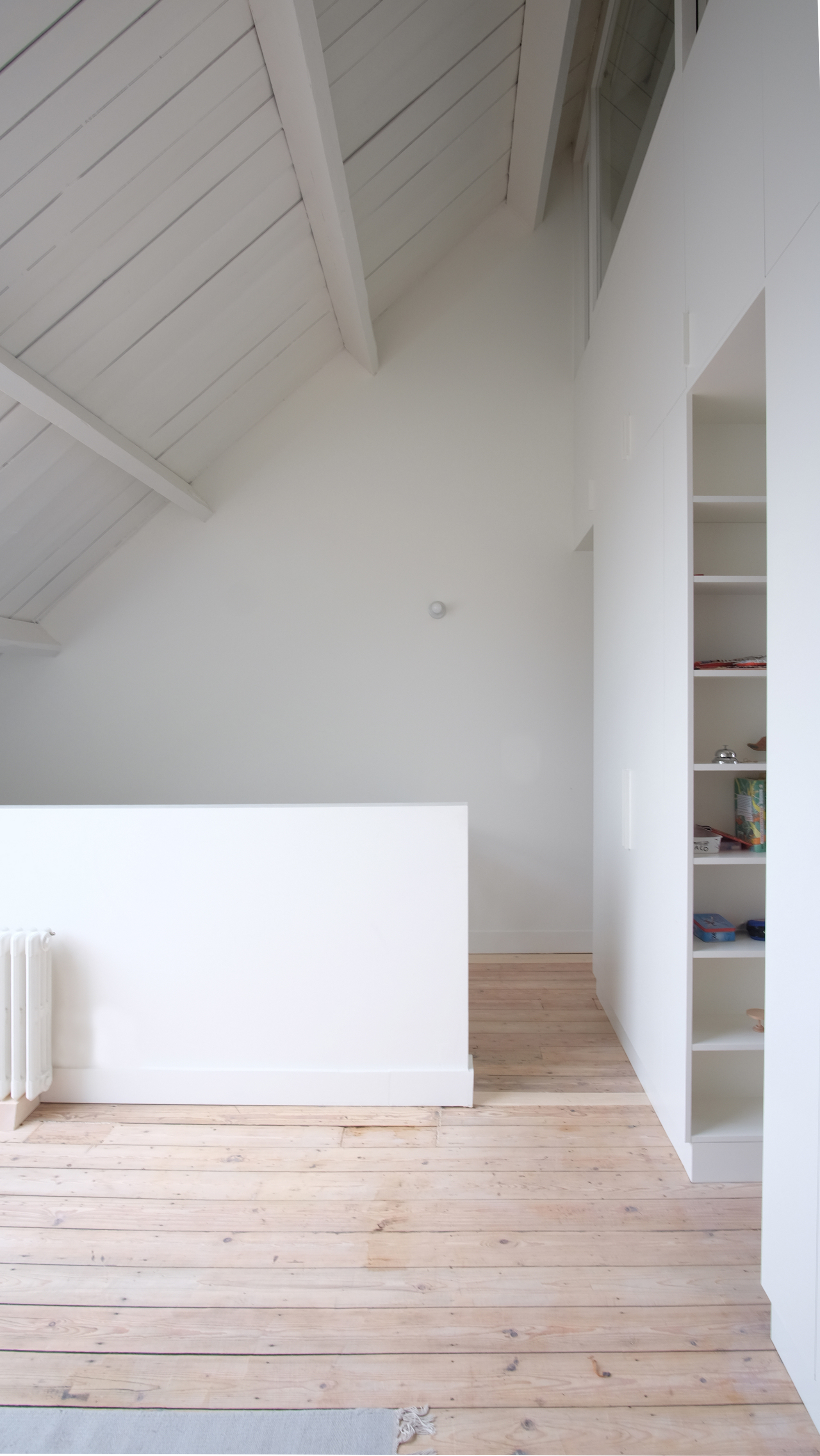 Everything in this house is grand. In the children’s attic, 3 bedrooms with mezzanine were organised behind a house-wide cupboard wall. What remains is a children’s lounge that is connected to the sleeping mezzanines via a large window on the cupboard.