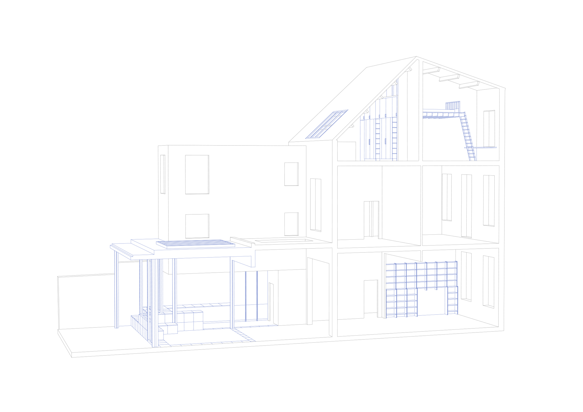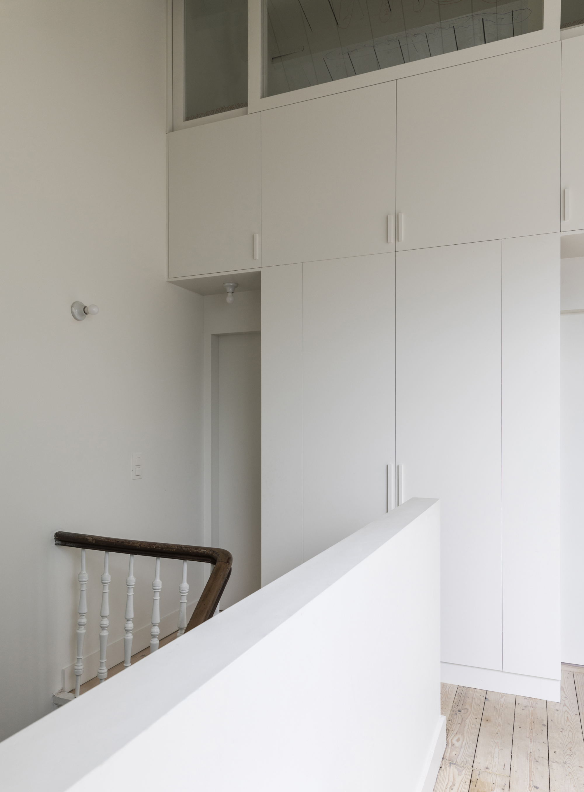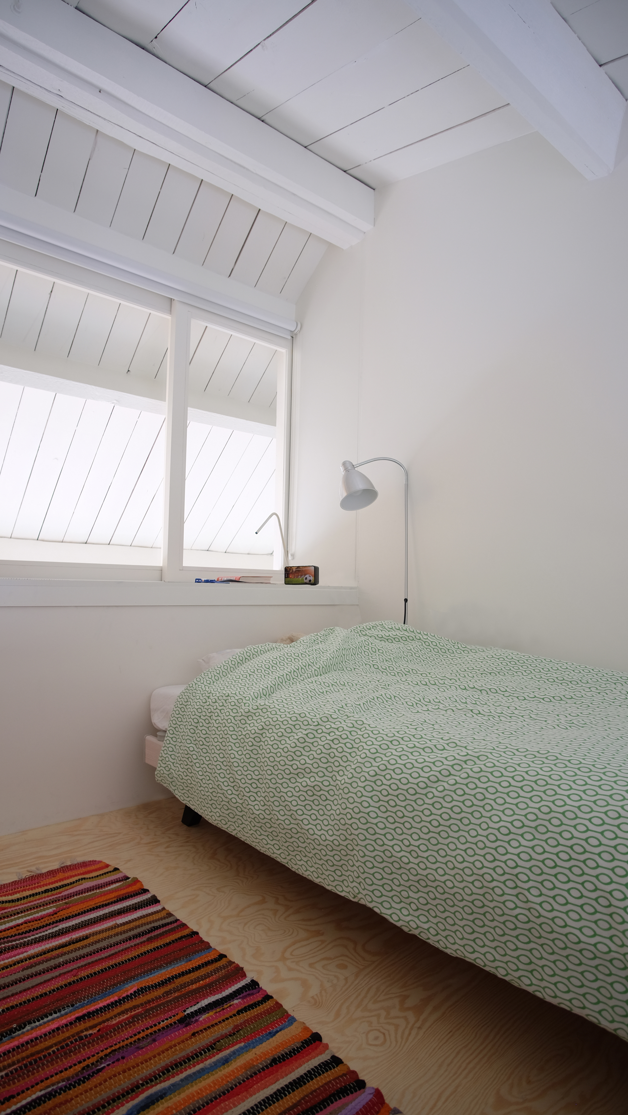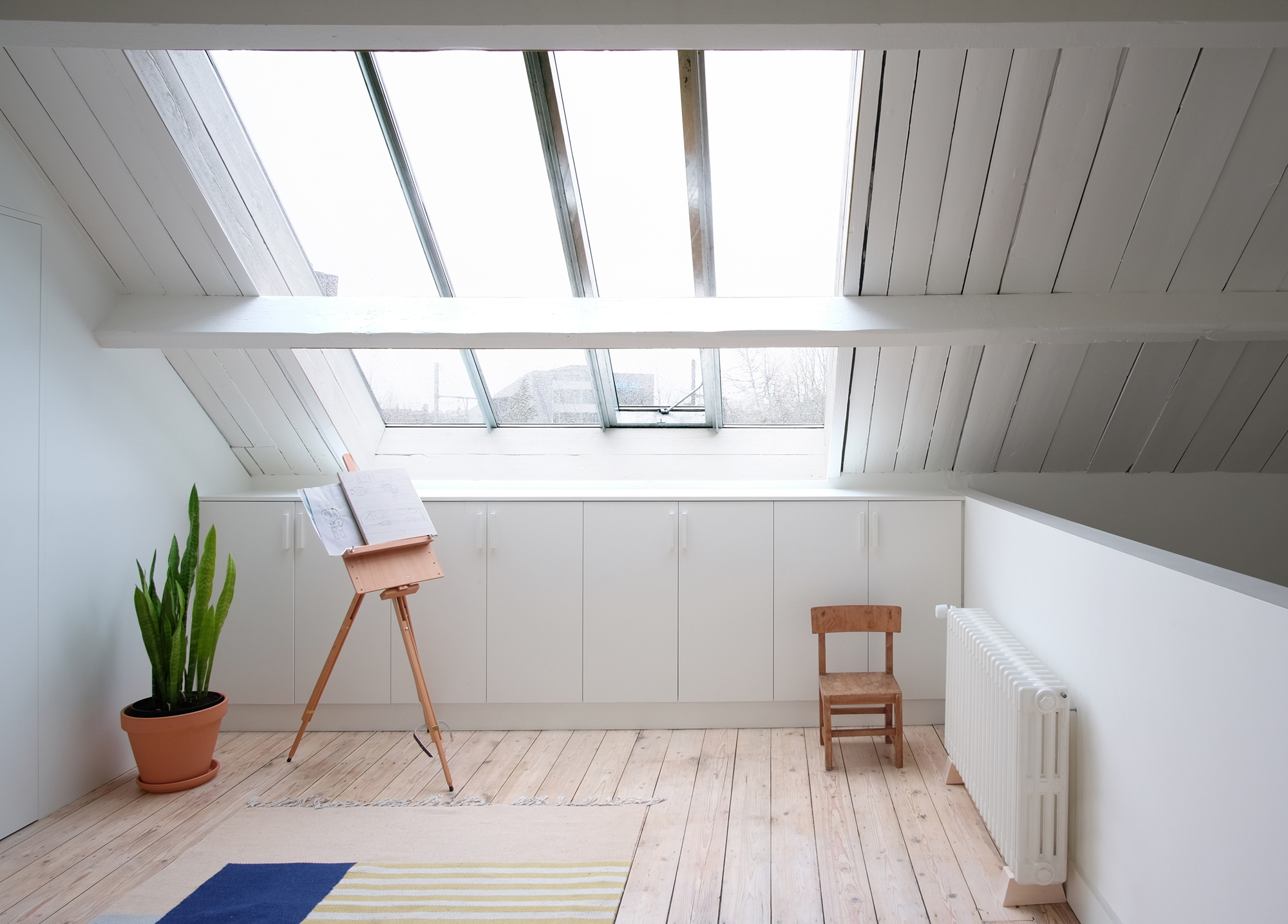 Everything in this house is grand. In the children’s attic, 3 bedrooms with mezzanine were organised behind a house-wide cupboard wall. What remains is a children’s lounge that is connected to the sleeping mezzanines via a large window on the cupboard.