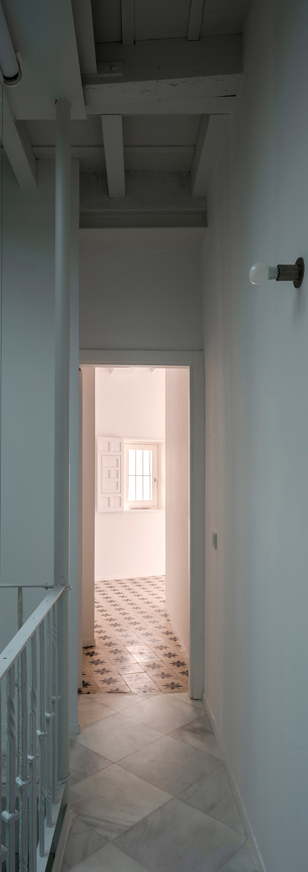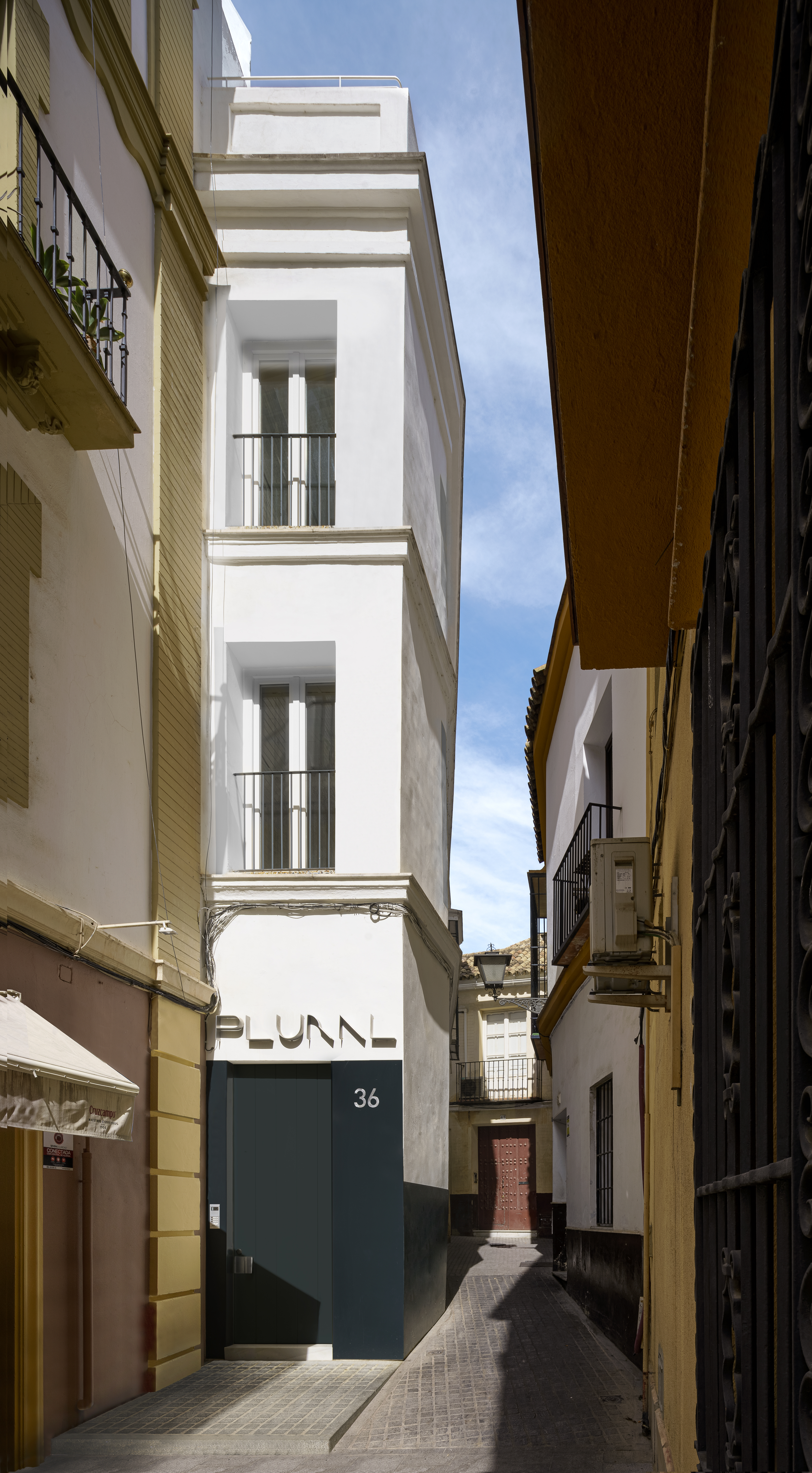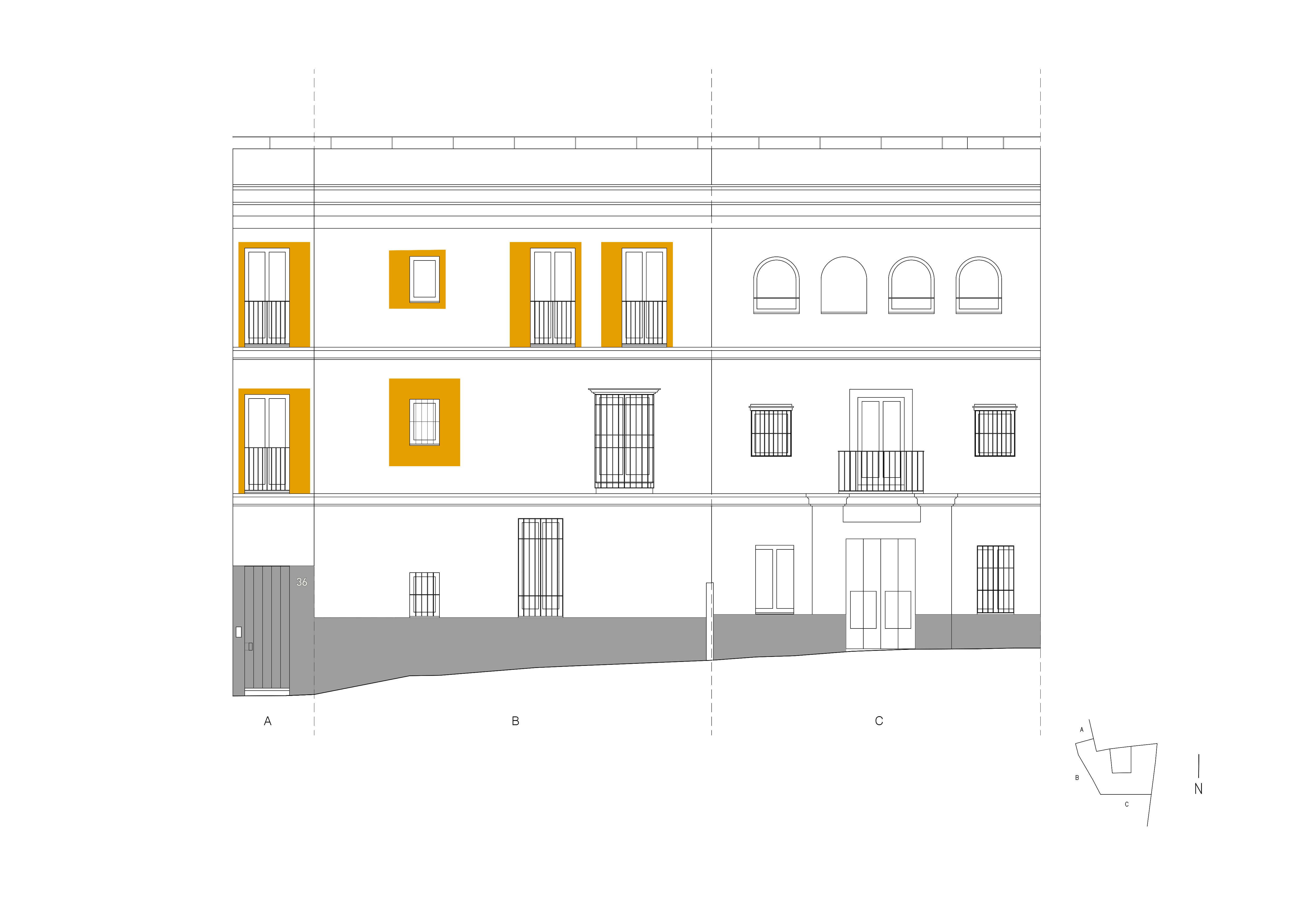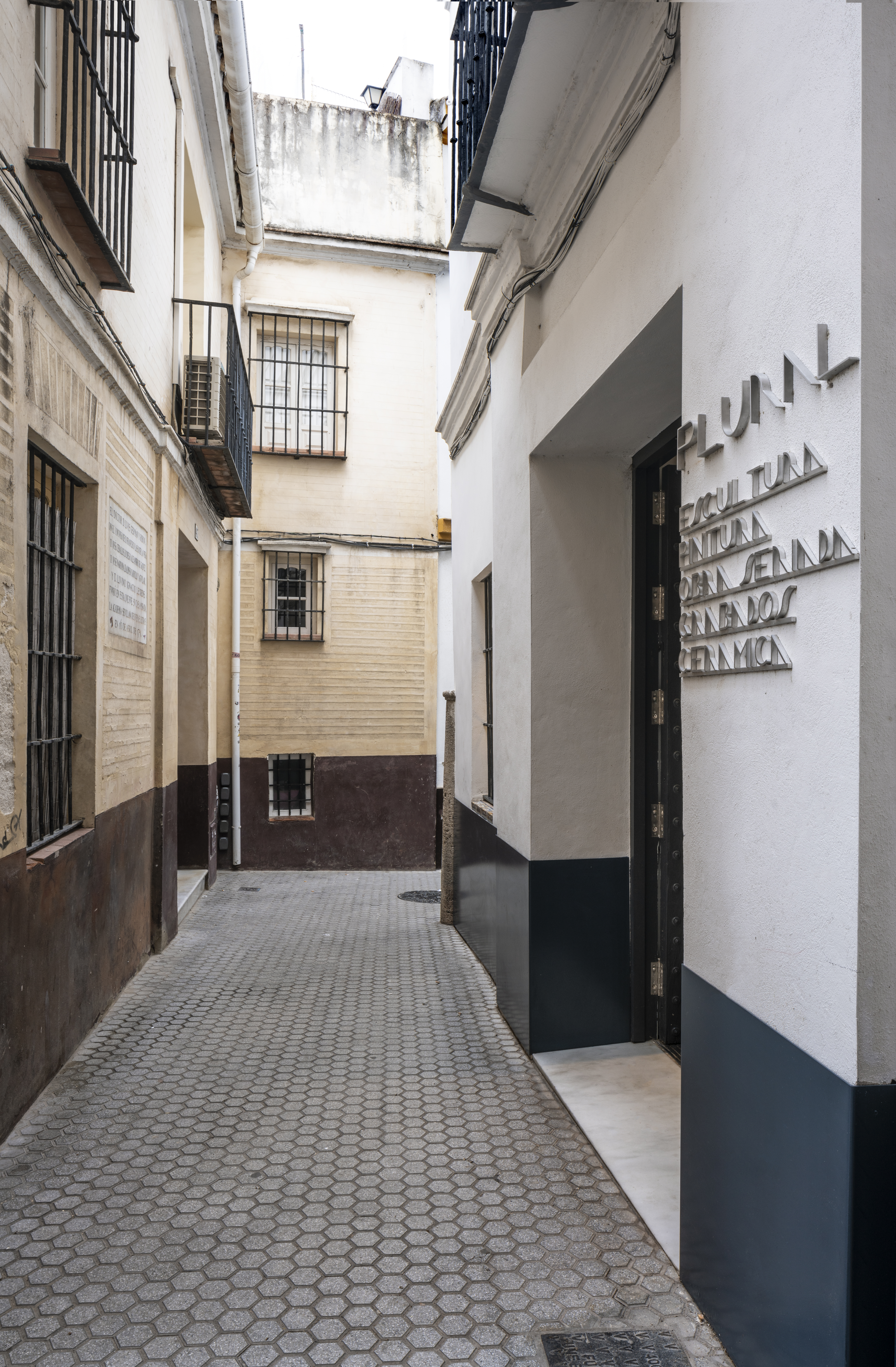 The house is located right on the corner of Abades Street in the Santa Cruz district, the former Jewish quarter of Seville. It is an 18th century house with two floors, to which a second floor was added in the first half of the last century. Its unique location on the street allows it to have two large façades (North and East) and a third (South) smaller one, to which the house will open for the first time. The proposal seeks to transform this single-family house, organized around a tiny central courtyard, into two apartments and the Plural art gallery. The project should integrate these uses, achieving total independence in the operation of both. The art gallery should be developed on the largest possible extension of the ground floor and the apartments should have independent access.