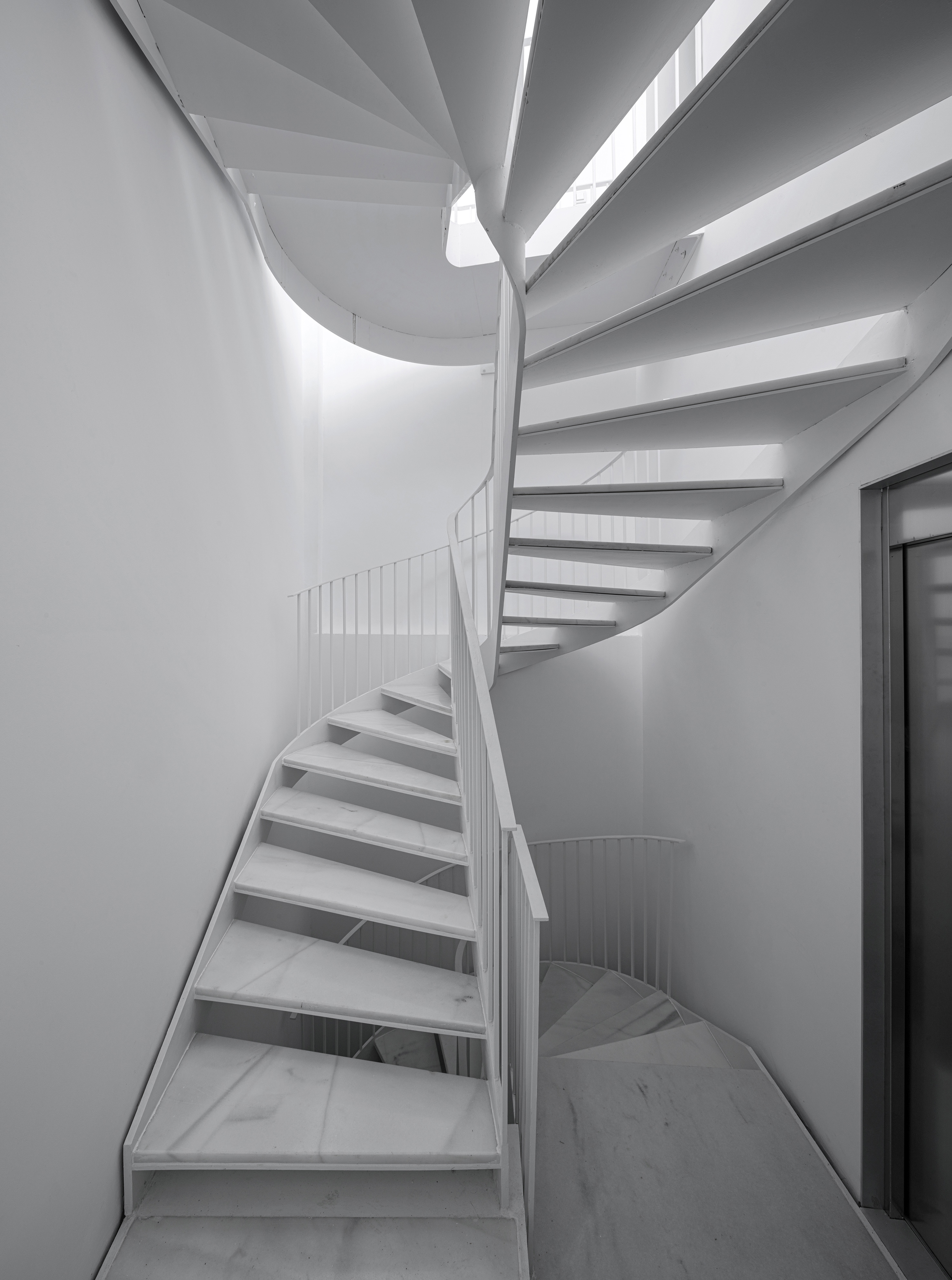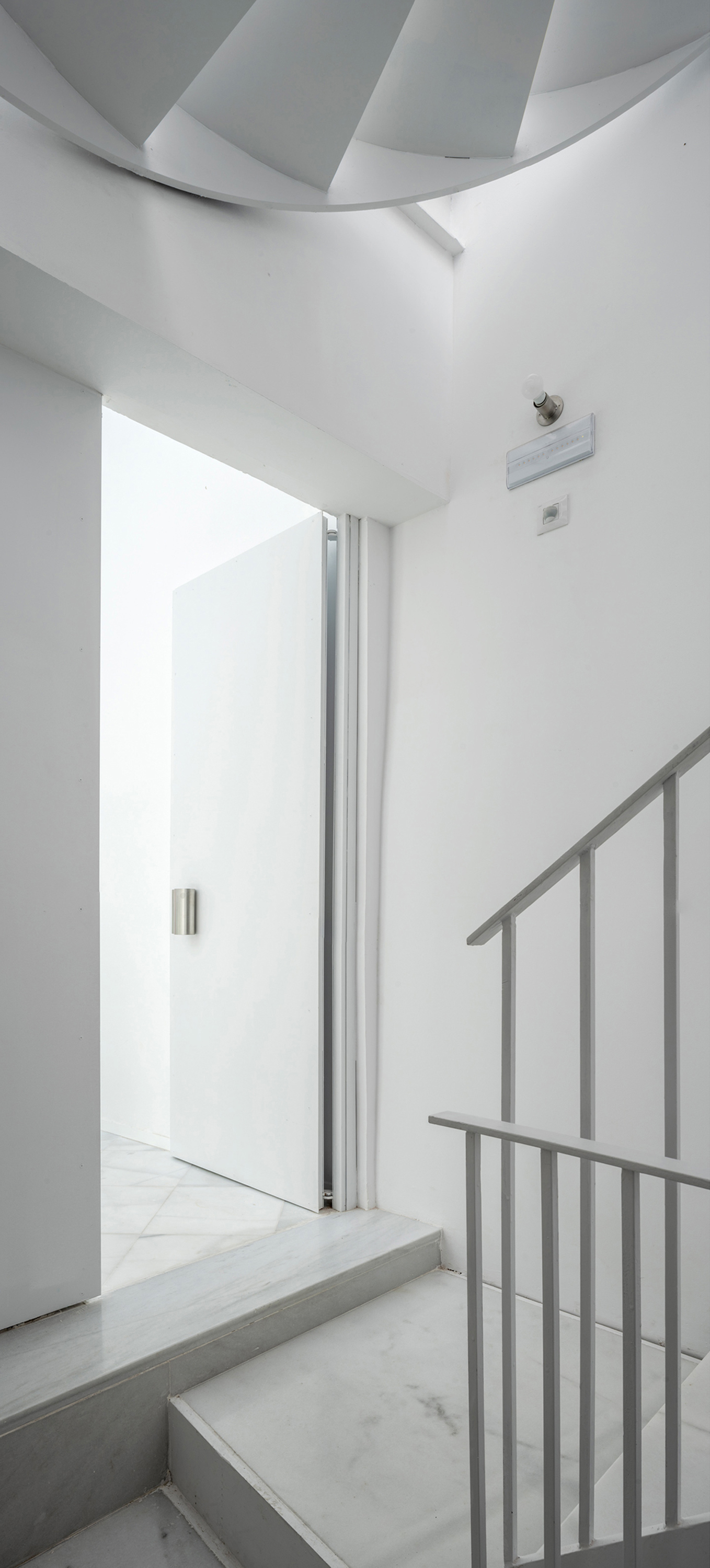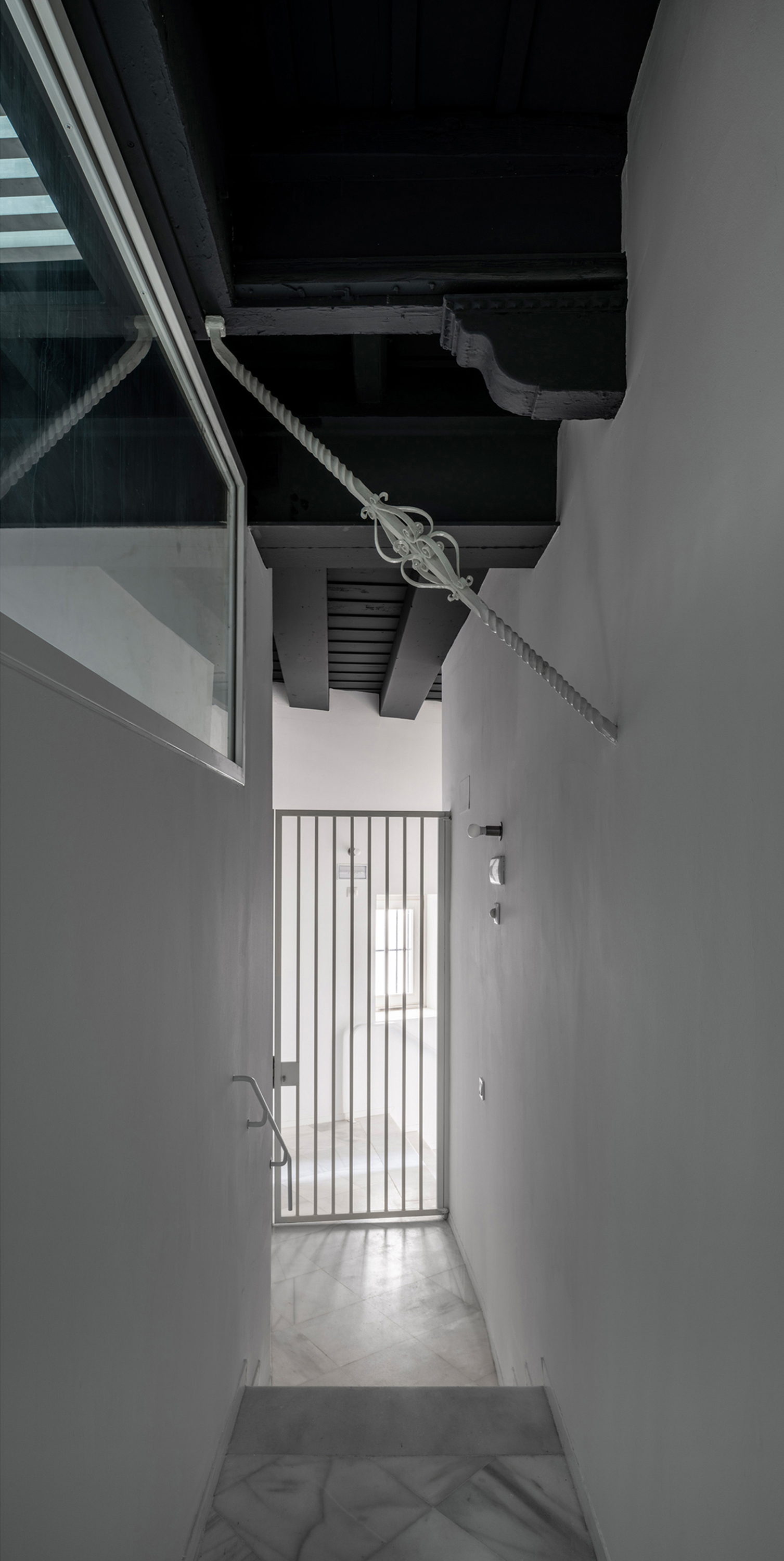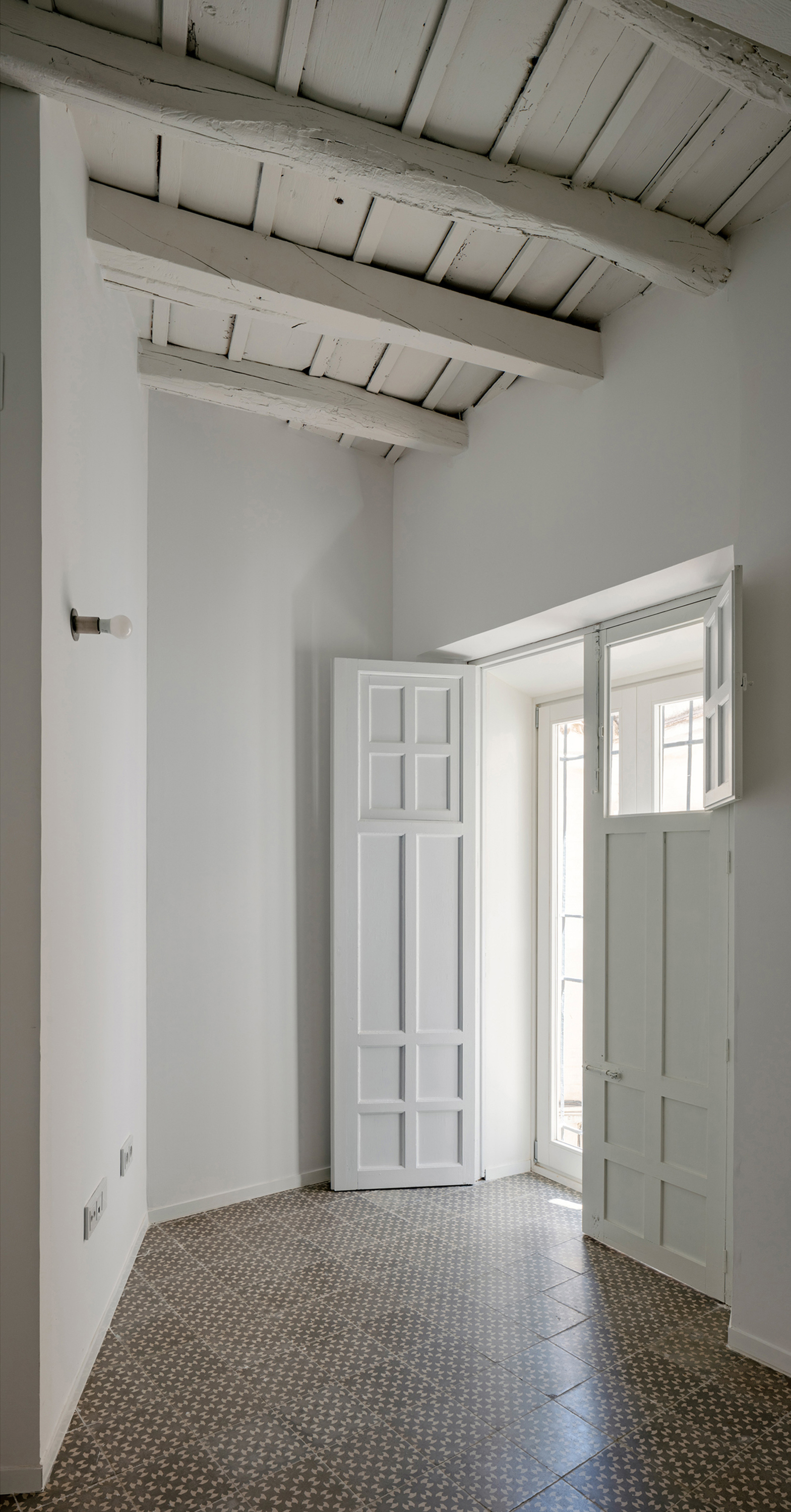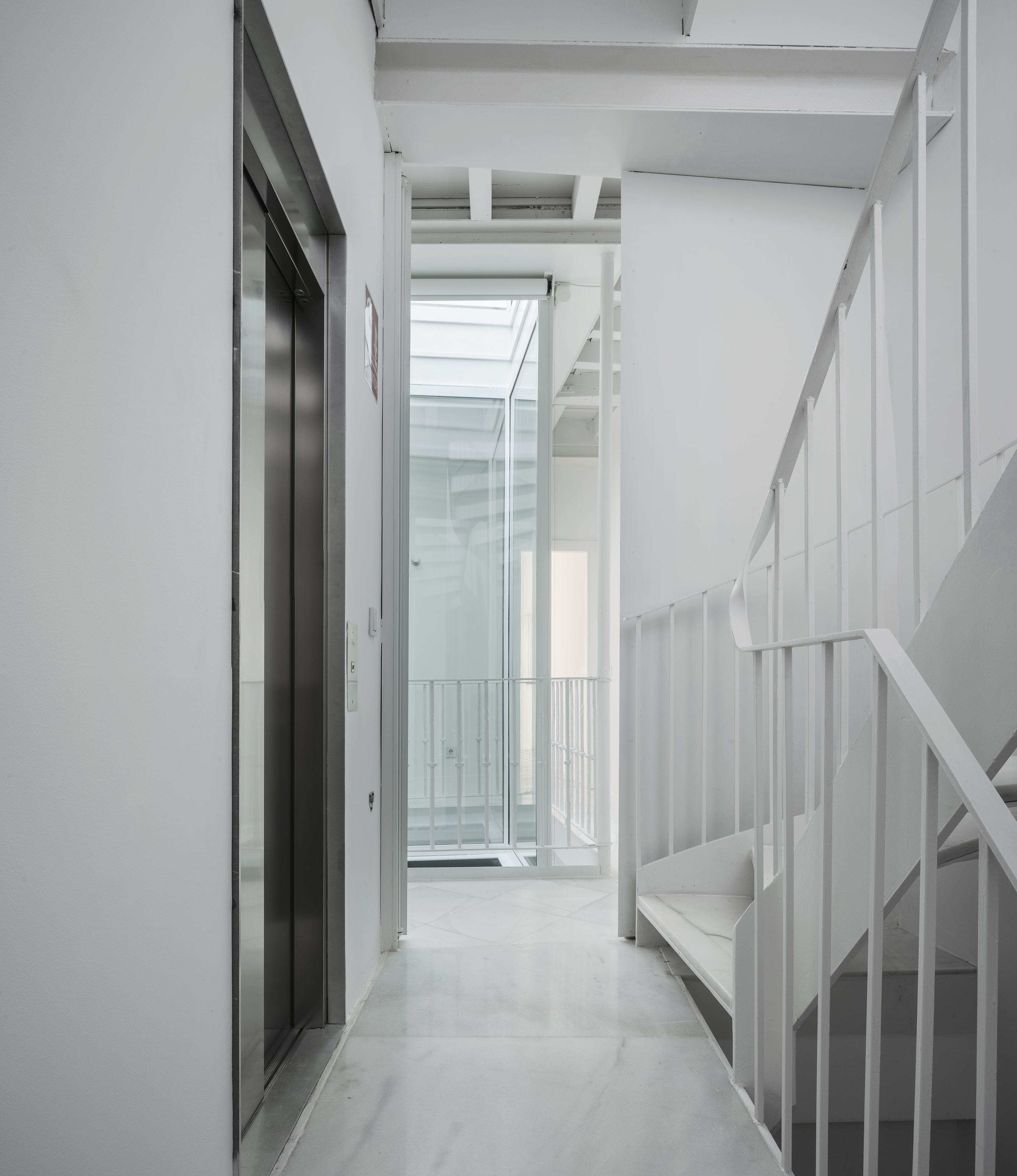 To this end, the project maintains the organization of the openings on the main façade unchanged, modifying dimensions and opening new ones on the East and South façades, providing the latter with a new access to the building: the access to the apartments and a second entrance to the art gallery. The new interior organization responds to the location of the small interior patio and the layout, orientation and character of the three façades. The main one, open to the long perspective of Abades Street; the East façade, which corresponds to the narrowing of the street, as a consequence of its double bend; and the South façade, previously very closed, which now opens to the main axis of the neighborhood.