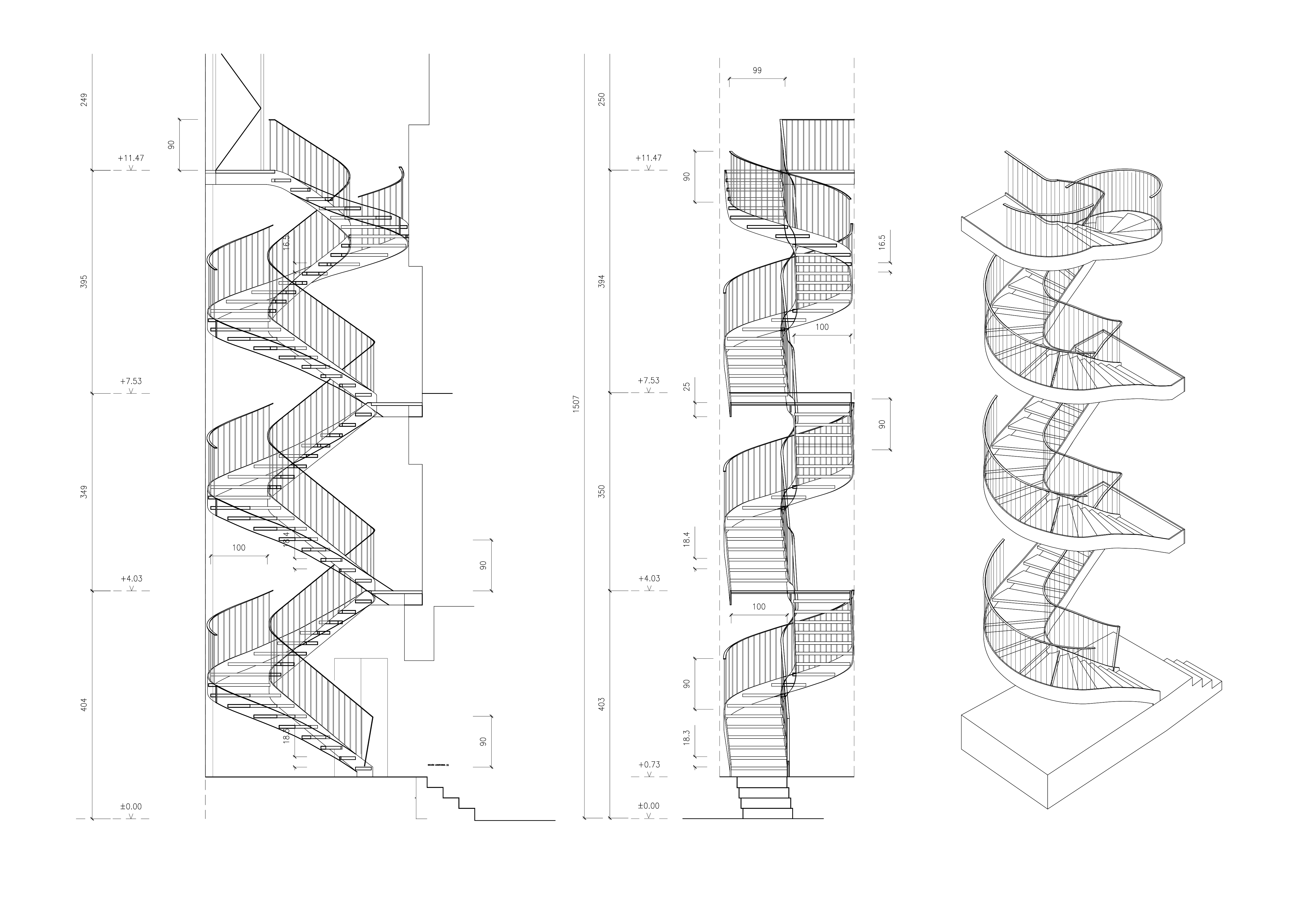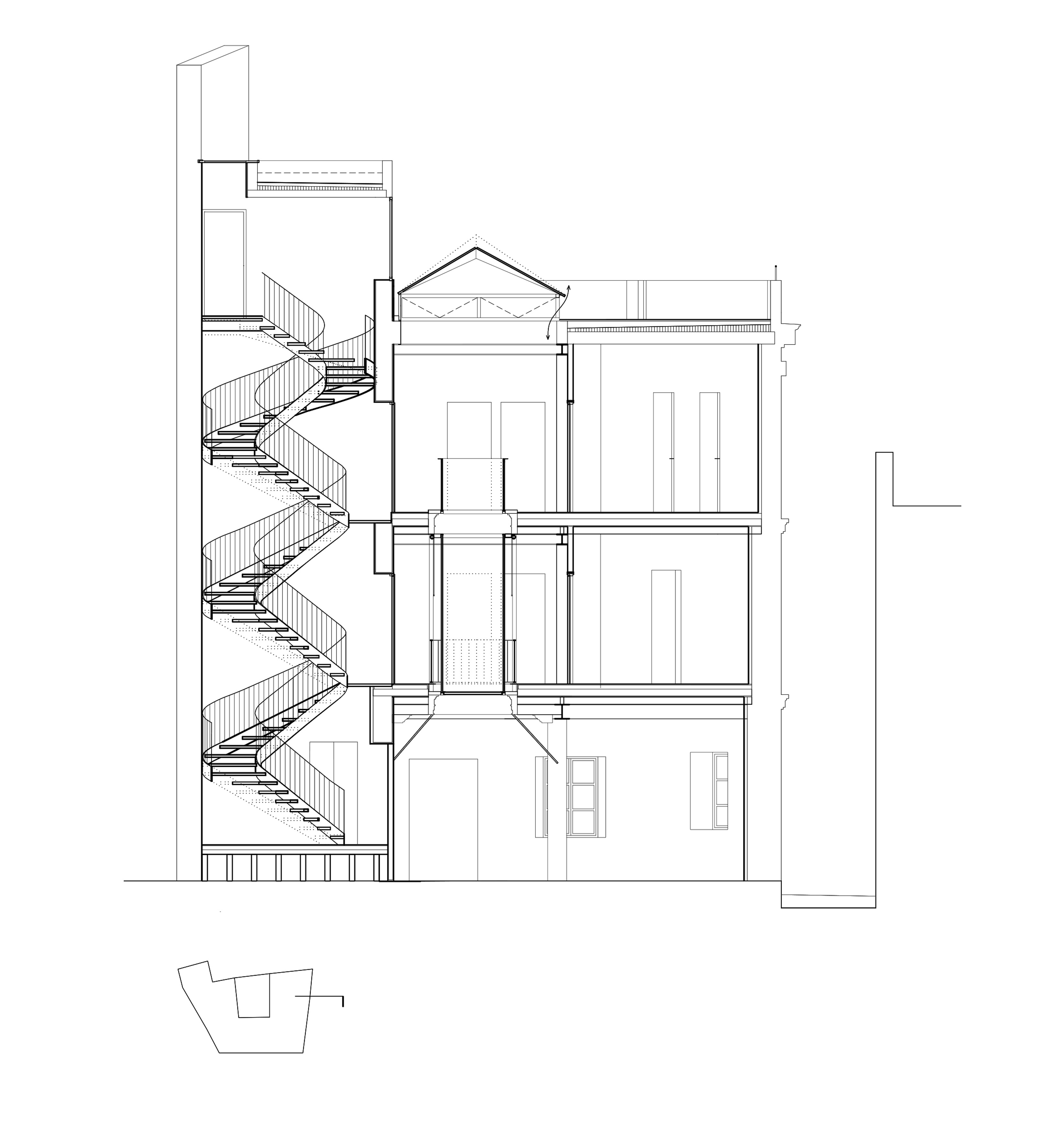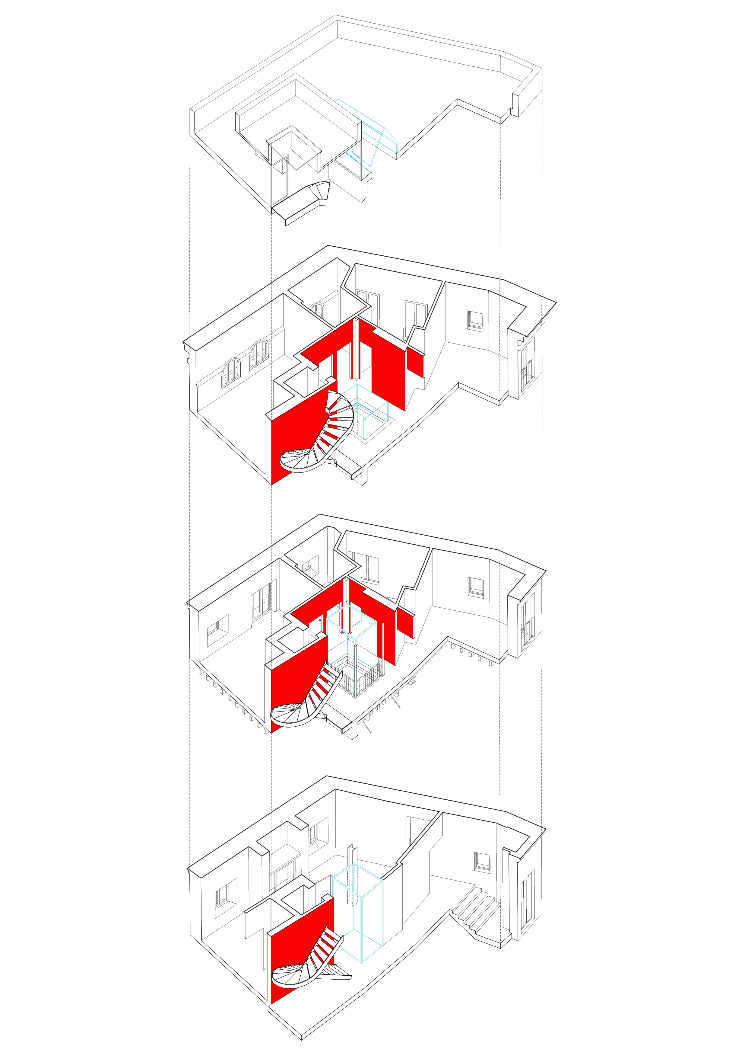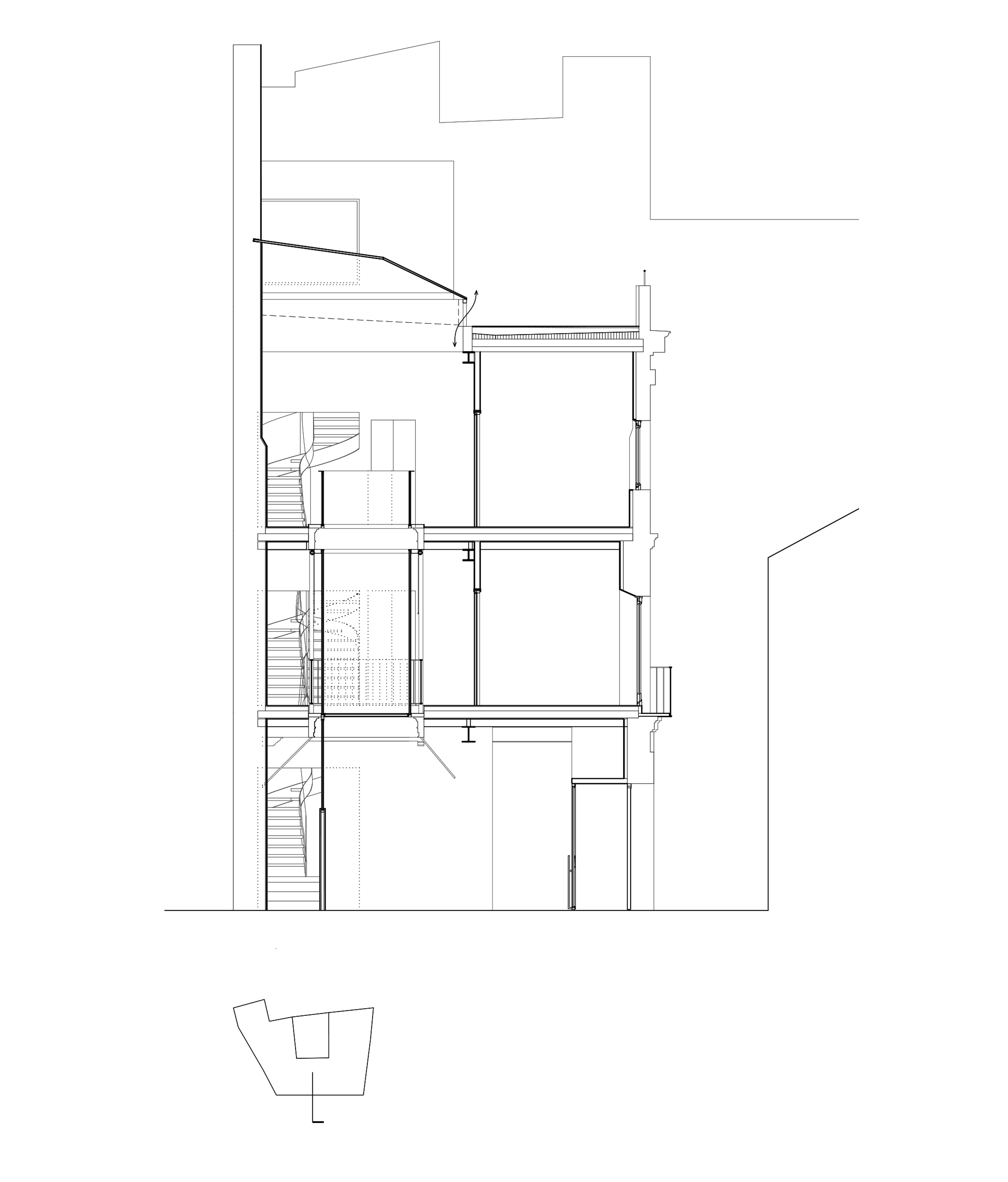 The vertical communication system—new staircase and elevator—is now located in the dark corner of the plot, between the dividing walls and the patio, so that the latter, now covered, becomes the vestibule space for the apartments. All the rooms will open directly onto the façades. The ground and first floors were built with a structure of wooden beams and joists, which have been maintained, supported by load-bearing walls, partially replaced on the ground floor by a slender metal structure in order to provide greater spaciousness to the art gallery. The second floor is built with a metal structure and the patio is covered with a glass roof, equipped with an opening device that guarantees the thermal regulation of the construction.