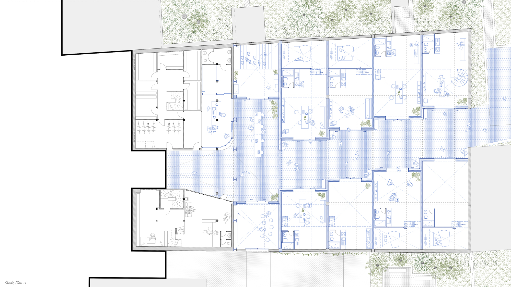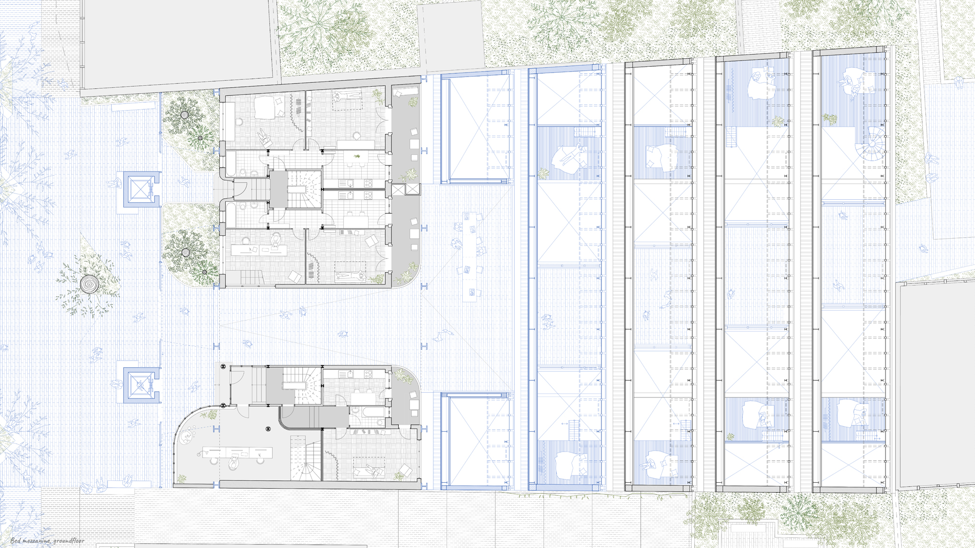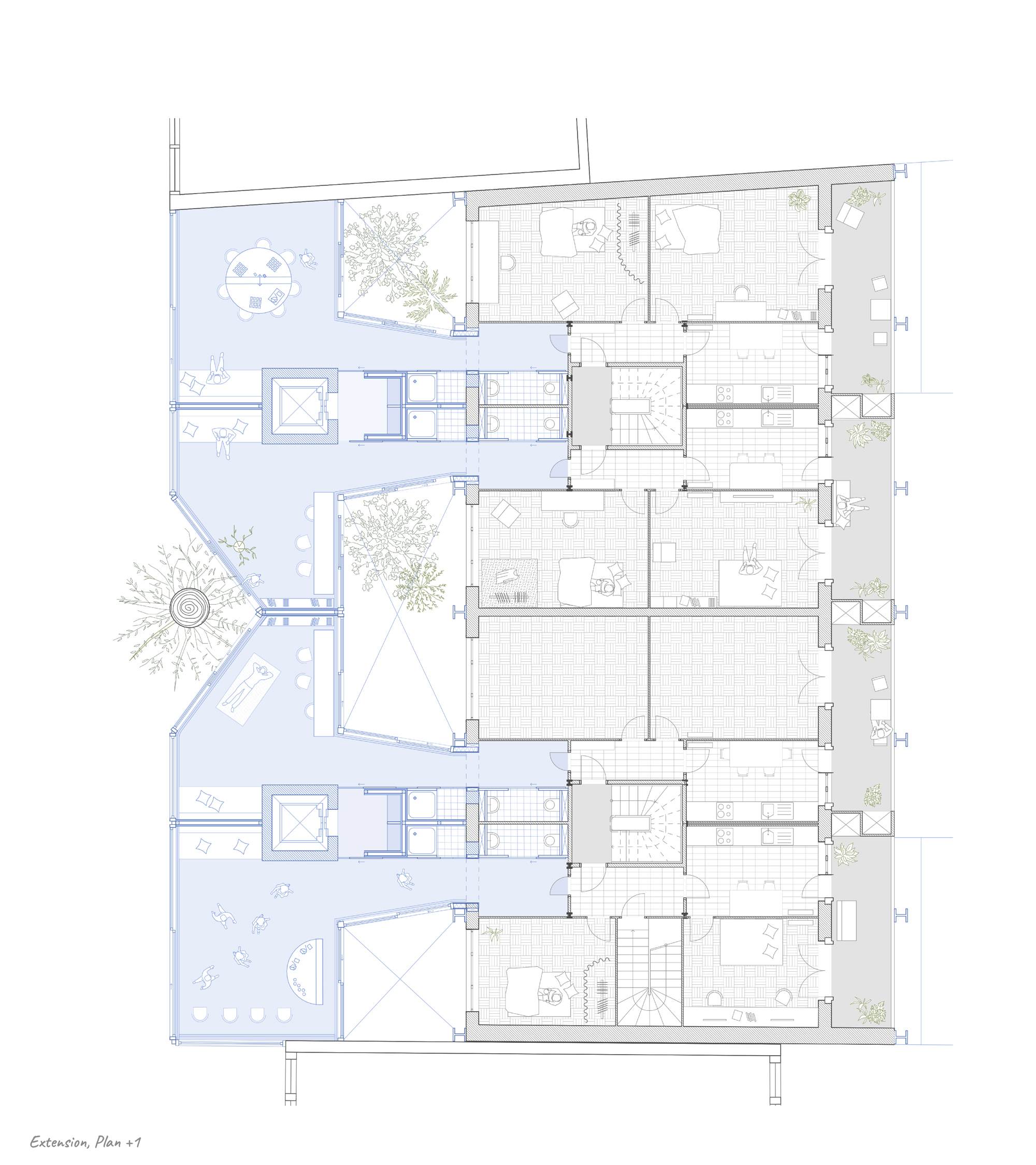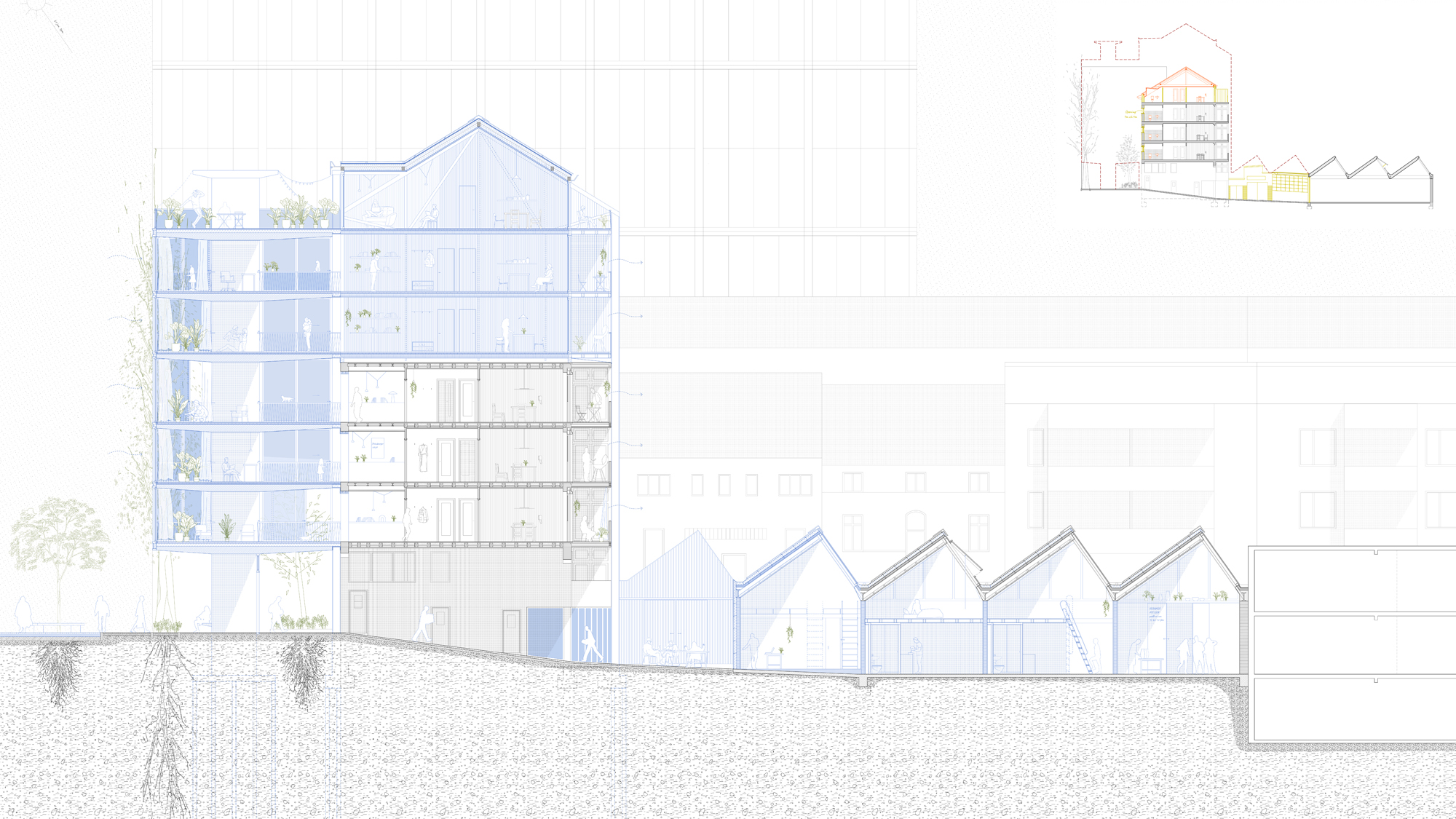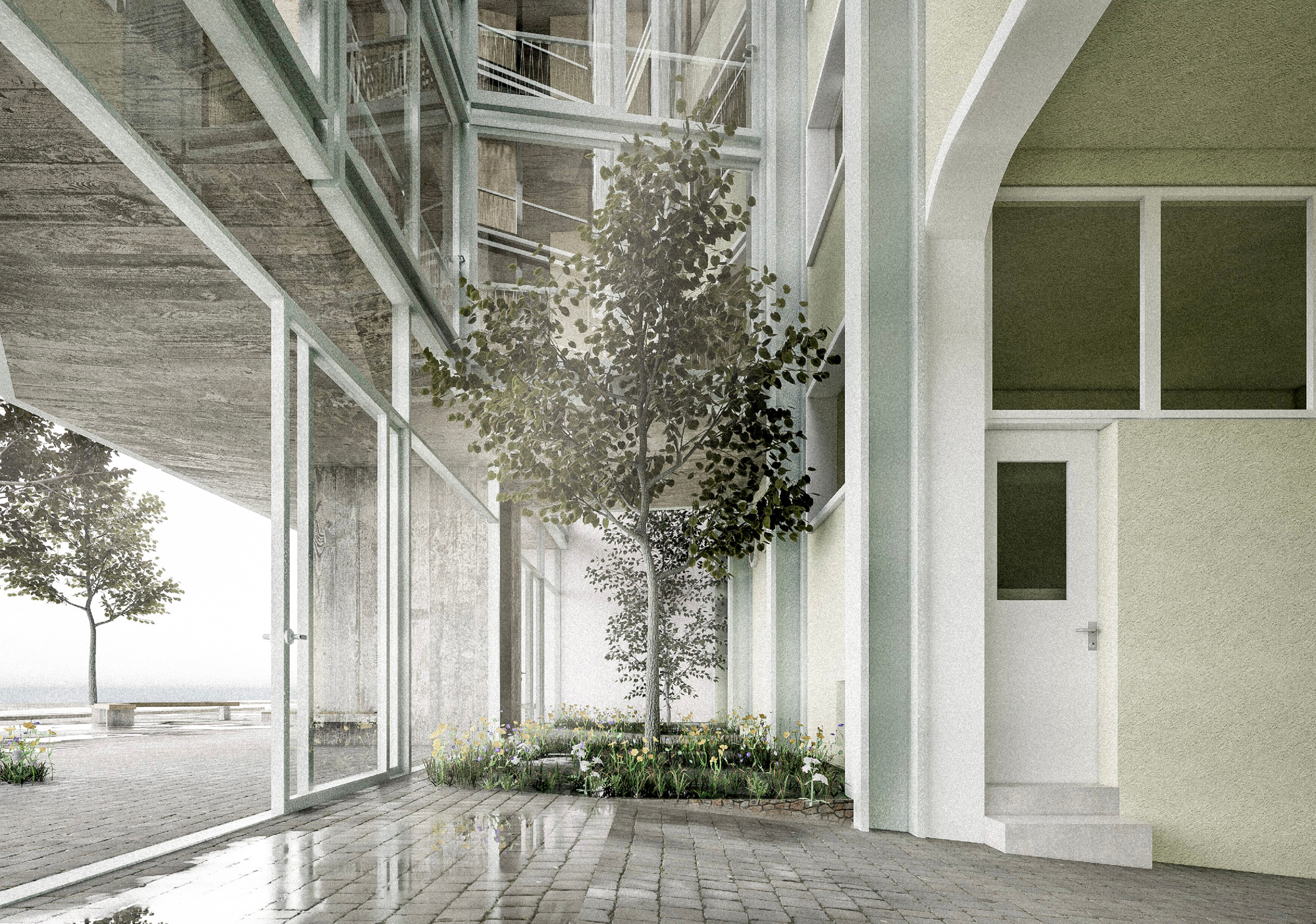 This heritage, the effective use of materials and the fluid combination of living and working are used as a starting point to develop an extension – a valid alternative to the already planned destruction and replacement of this ensemble with two new buildings. The project shows that more and better can be achieved by preserving the existing – a new typology of sharing and cross-fertilization between living and working – and between old and new.