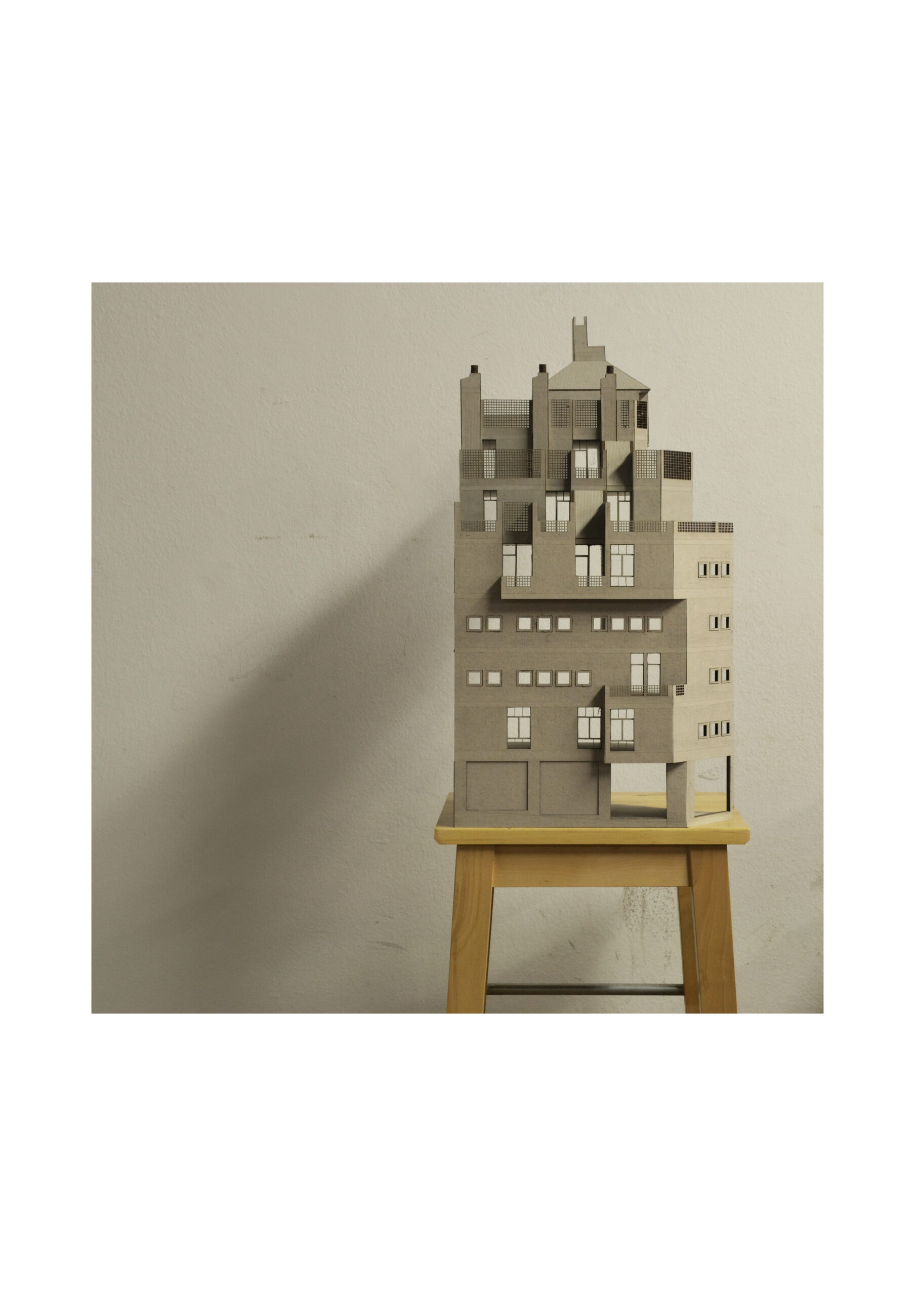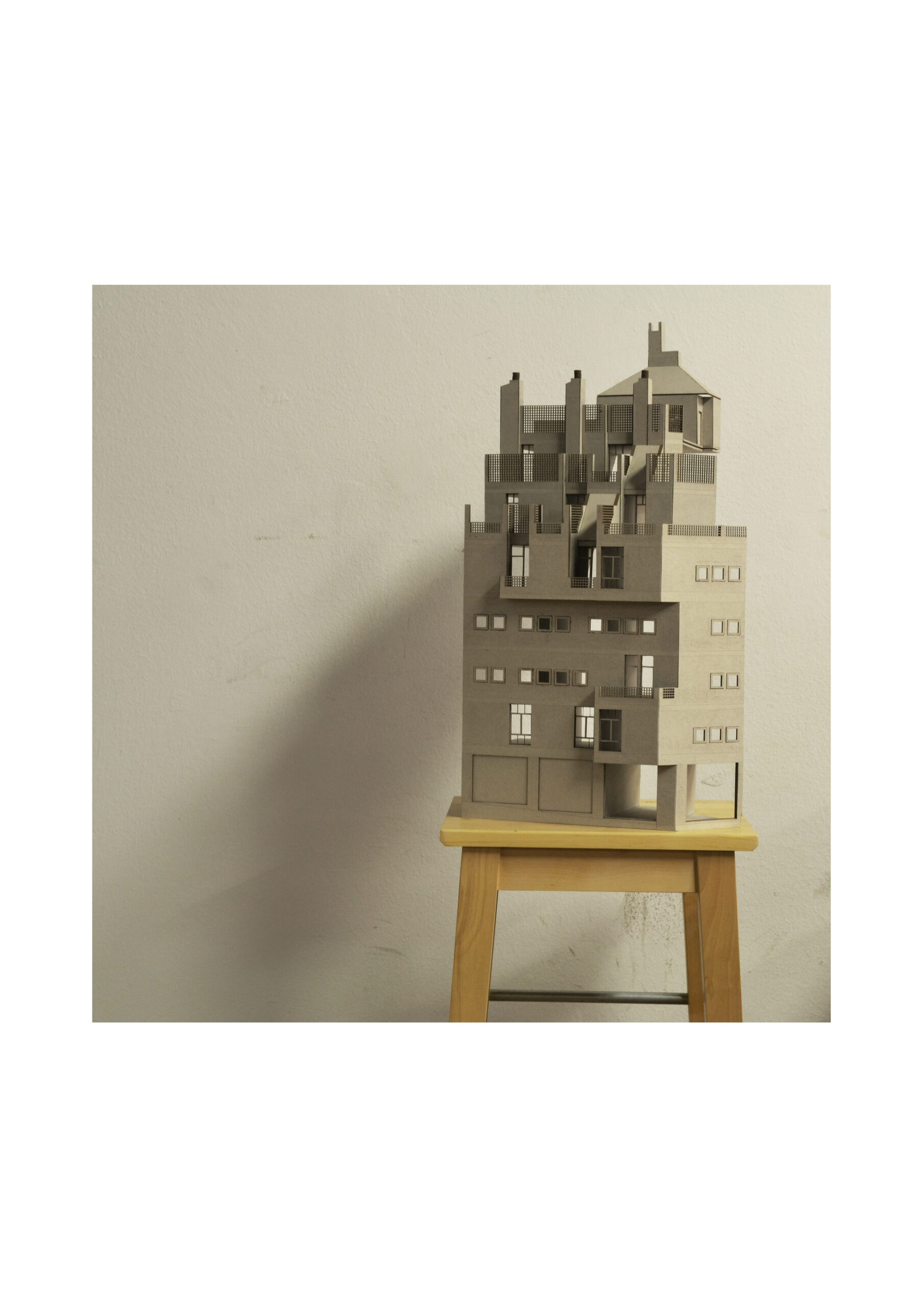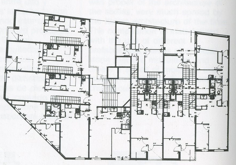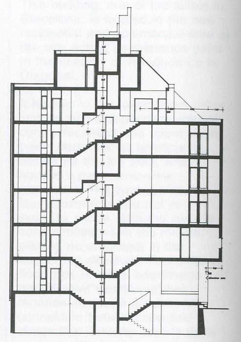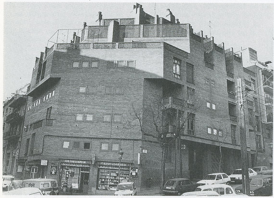 La variedad de tipos de viviendas, la irregularidad del solar en chaflán, la altura de los edificios vecinos, el deseo de aprovechar al máximo la edificabilidad permitida y, sobre todo, la voluntad de ruptura, determinaron una solución -tanto en el aspecto funcional como en lo referente a la fachada- fuera de lo común.