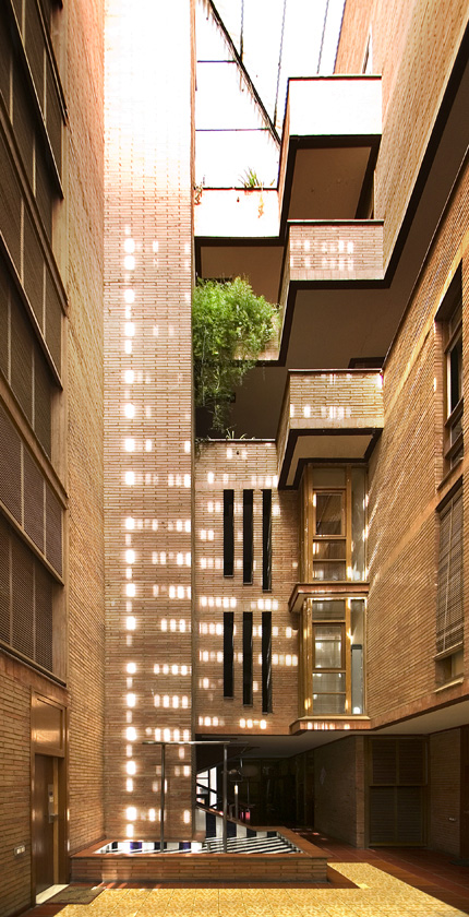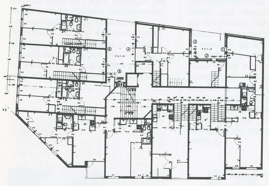 Las viviendas se organizan en uno, dos y tres niveles con la consiguiente riqueza espacial. Ésta, sin duda, debía compensar en los usuarios (posiblemente, no menos fuera de lo común que el propio edificio), las inevitables incomodidades. Esa complejidad interior no se manifiesta en la fachada, cuya volumetría y elementos constructivos (ventanas; barandillas, etc.) se plantean en voluntaria contradicción con las puestas habituales.