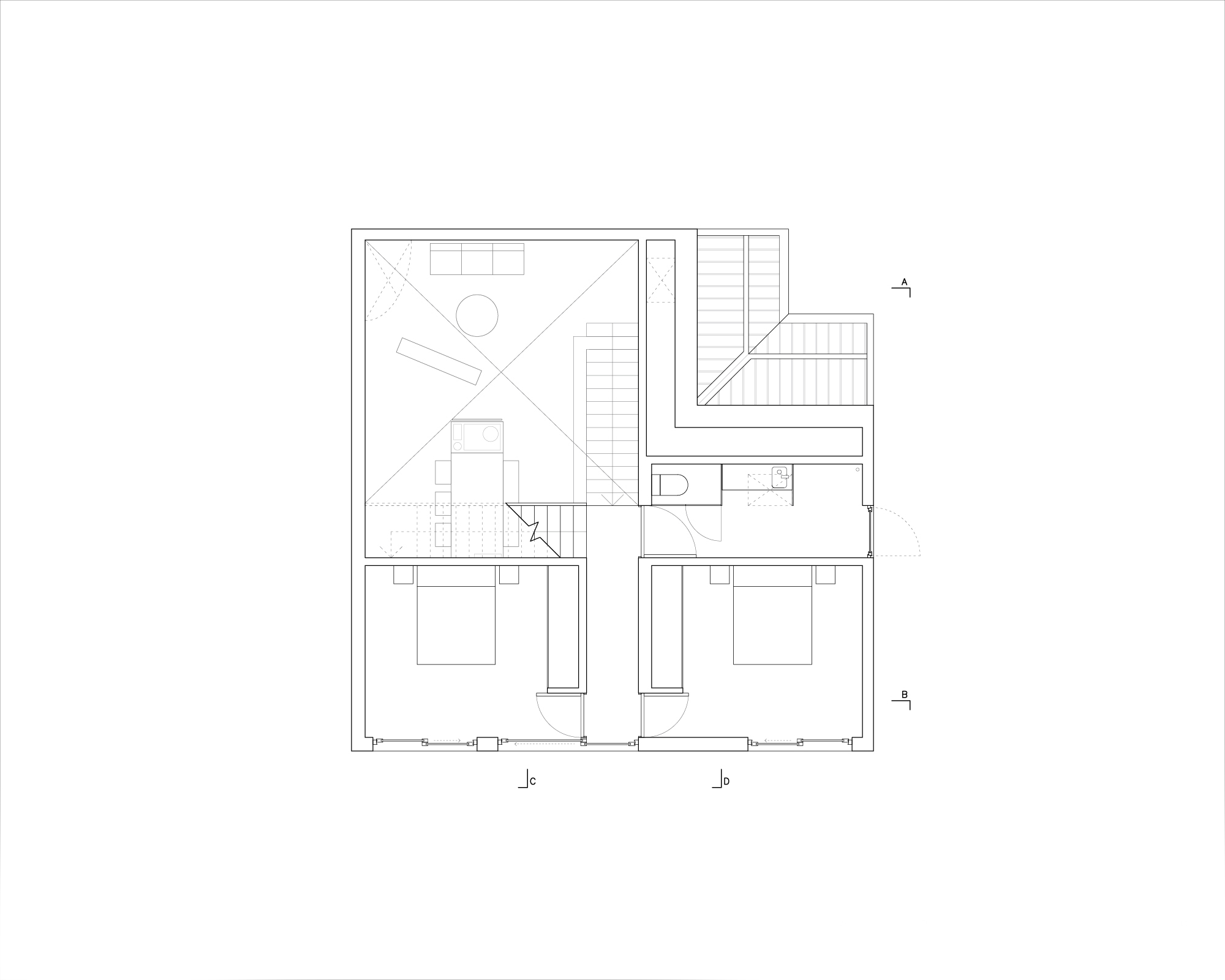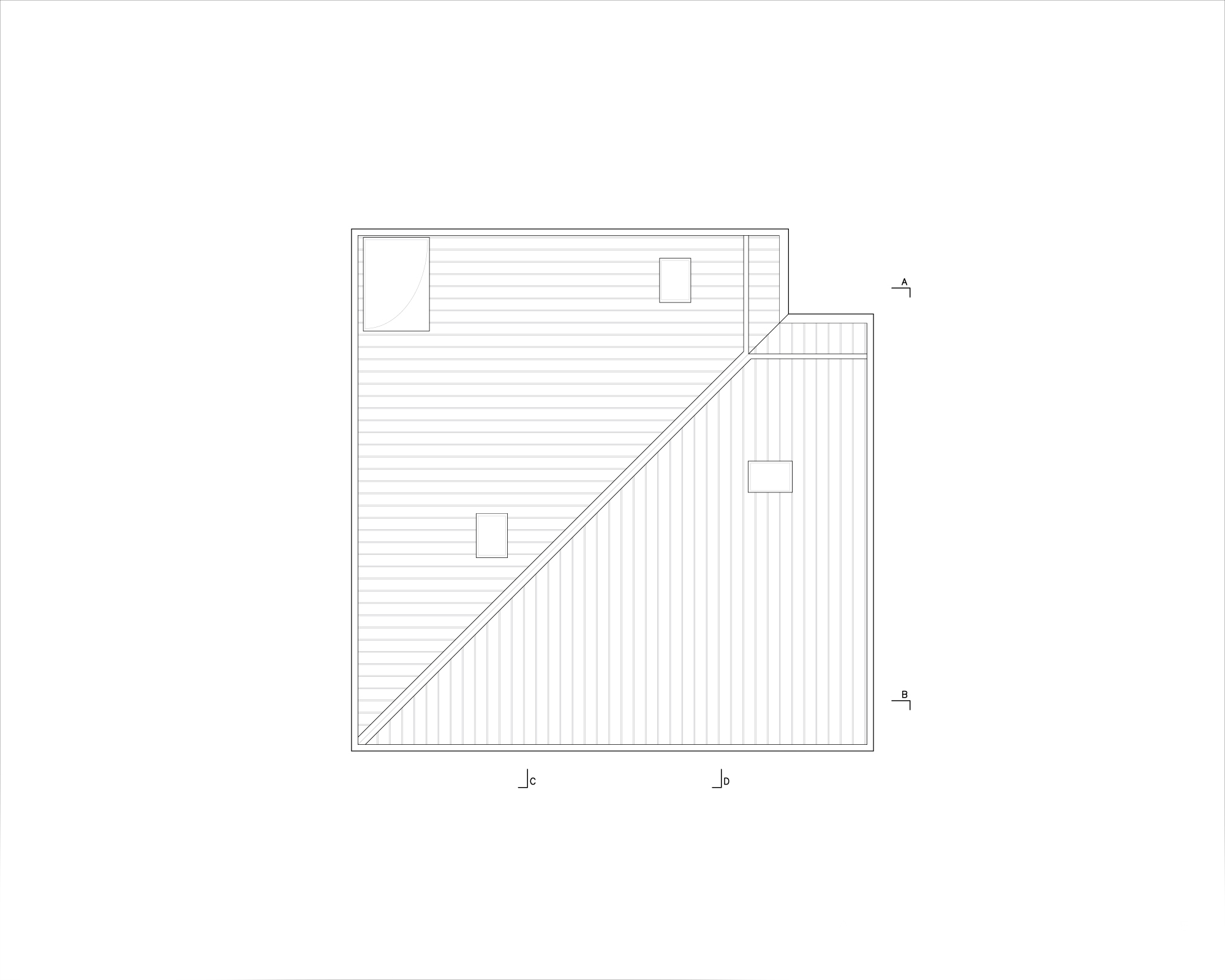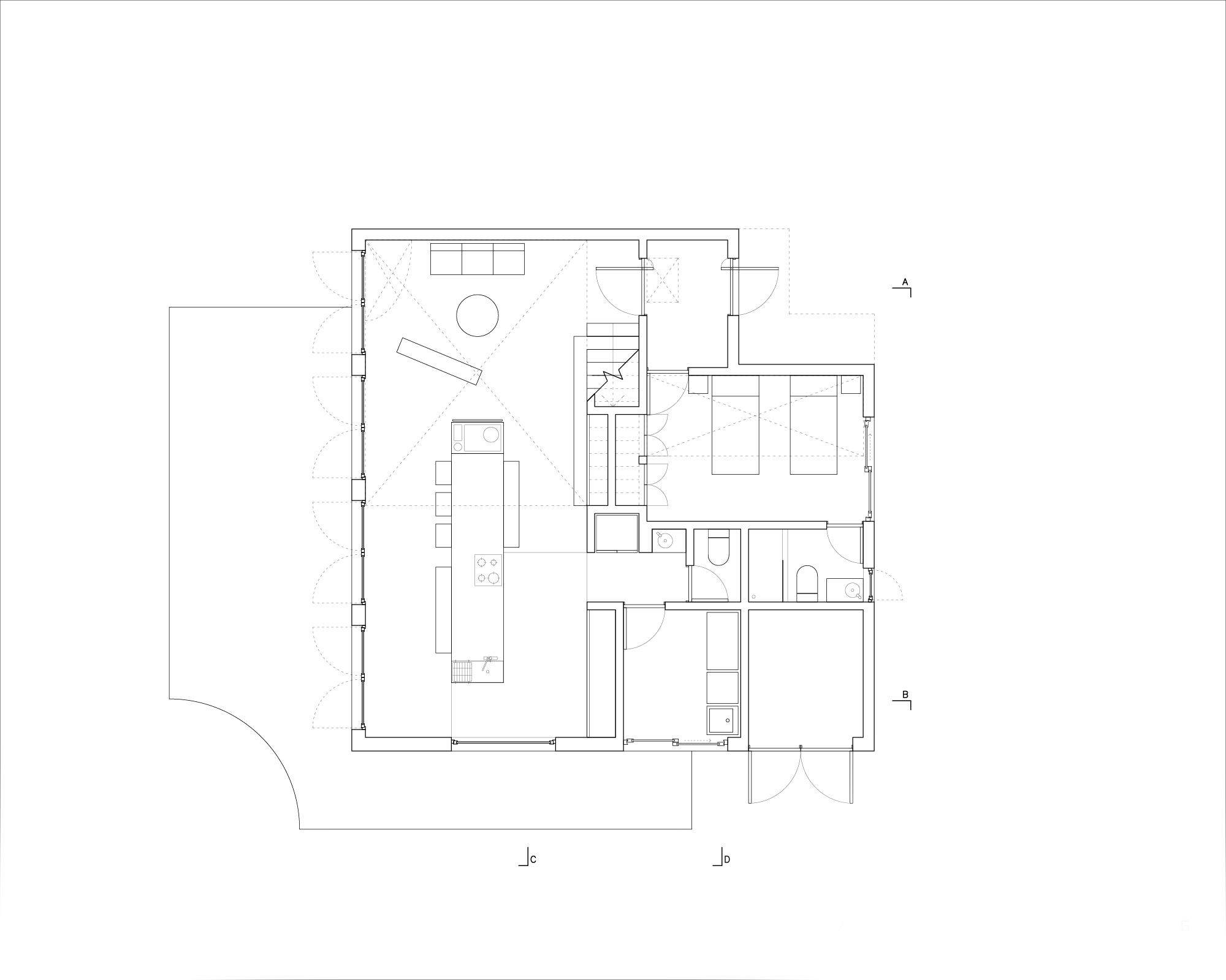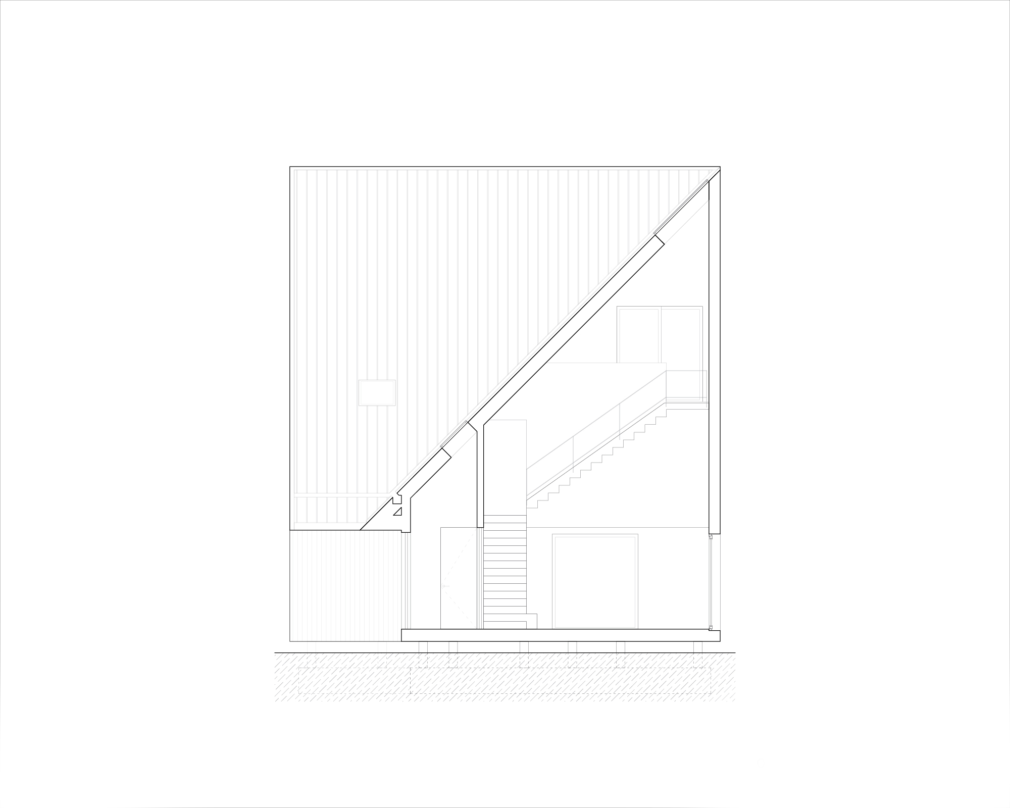 Humo house is an exercise on domestic dichotomies. Starting from a cube of 11m side with two of its faces split in half, the whole project revolves around the articulation of opposing pairs. The two larger facades open to distant views of the lake and to the site on ground floor; the two smaller ones are almost entirely blind, sheltering the entrance on the lower corner.