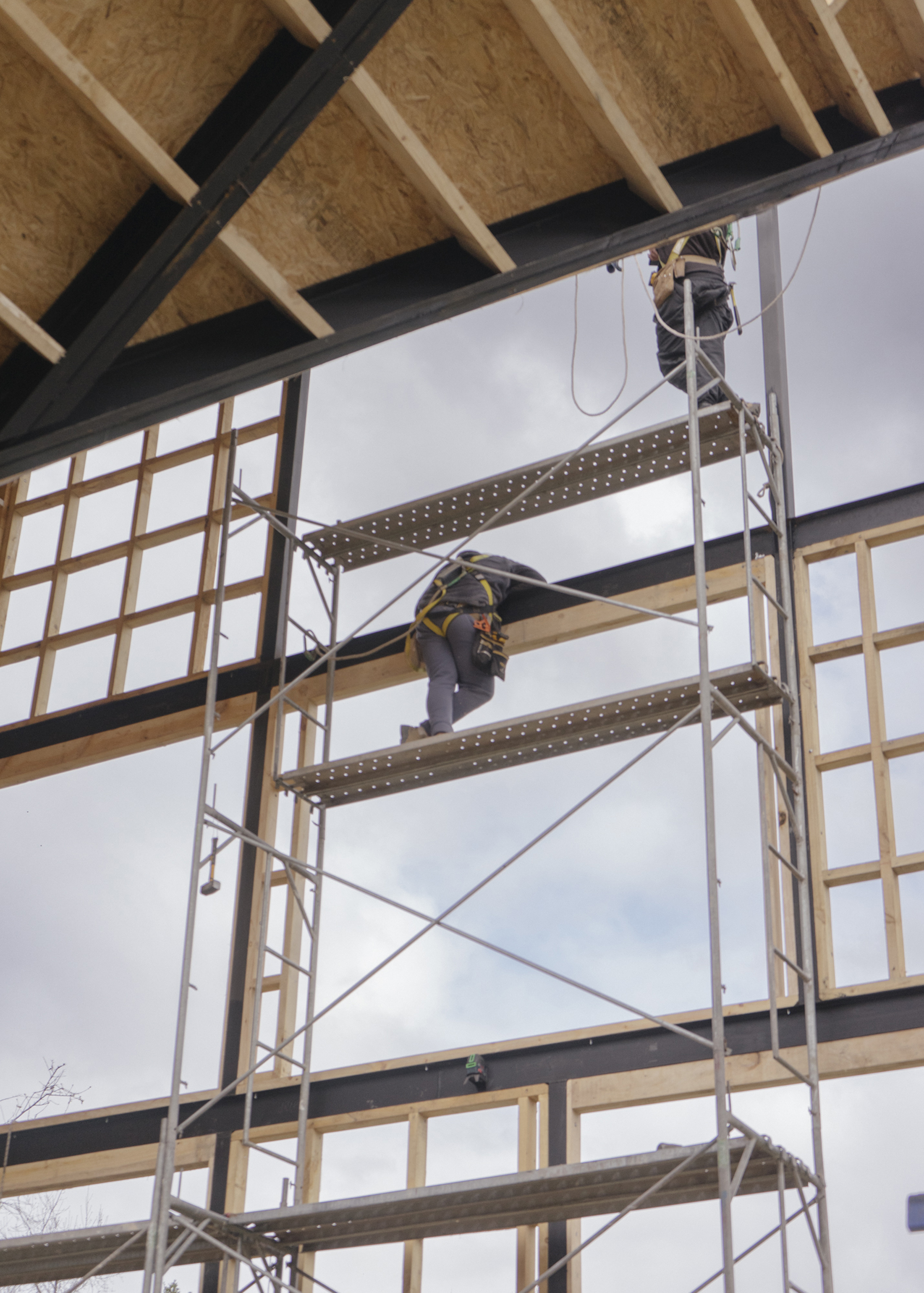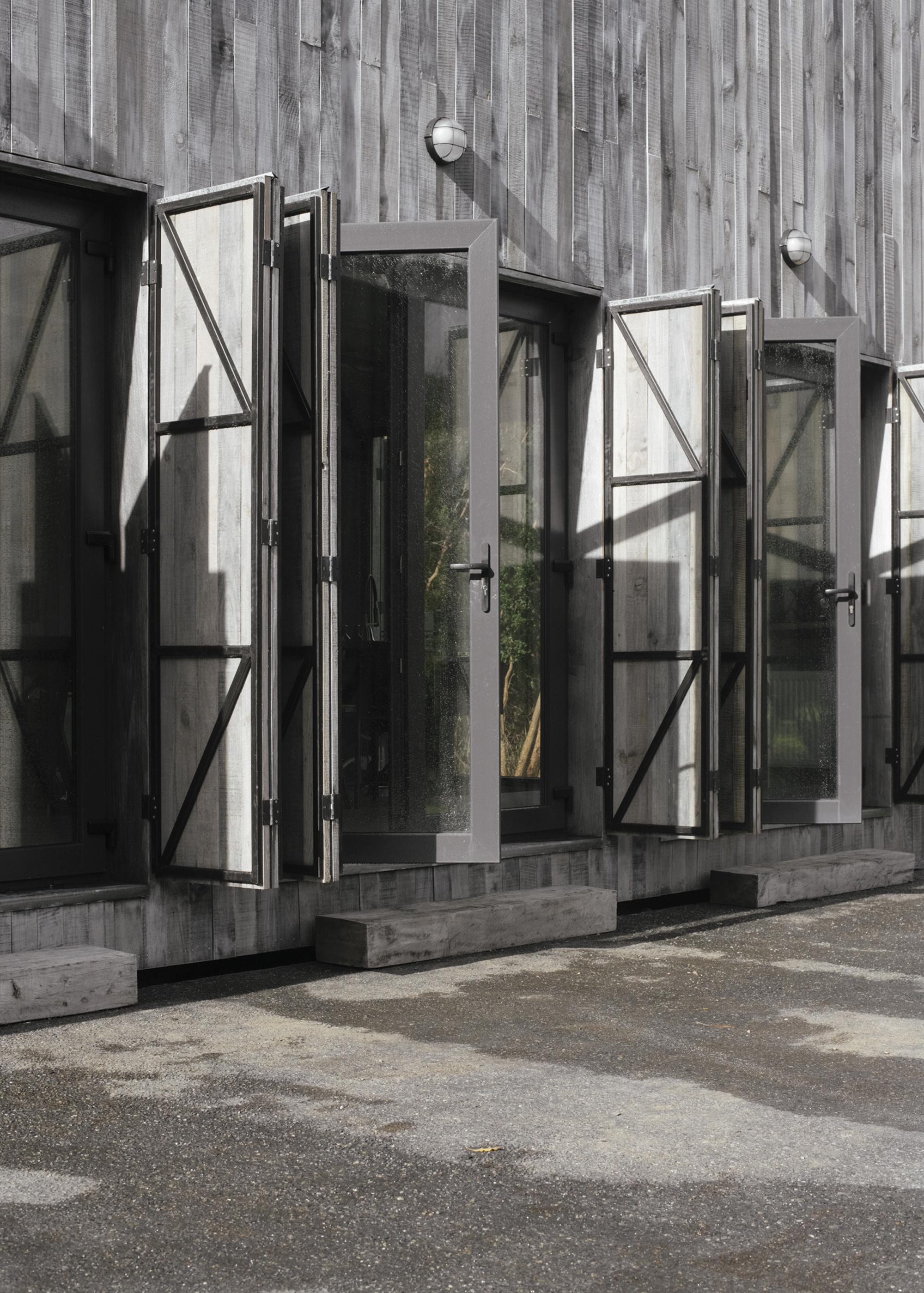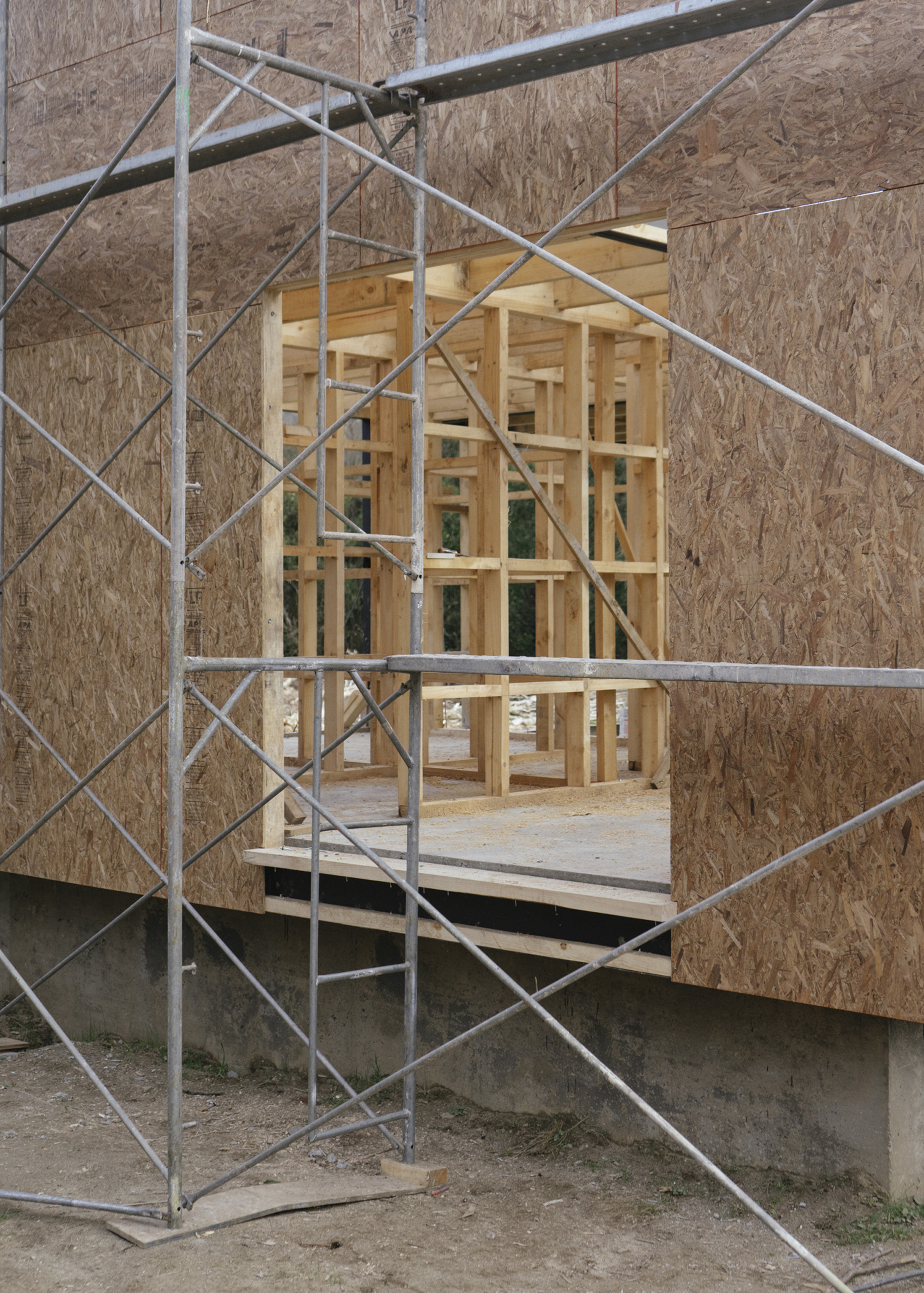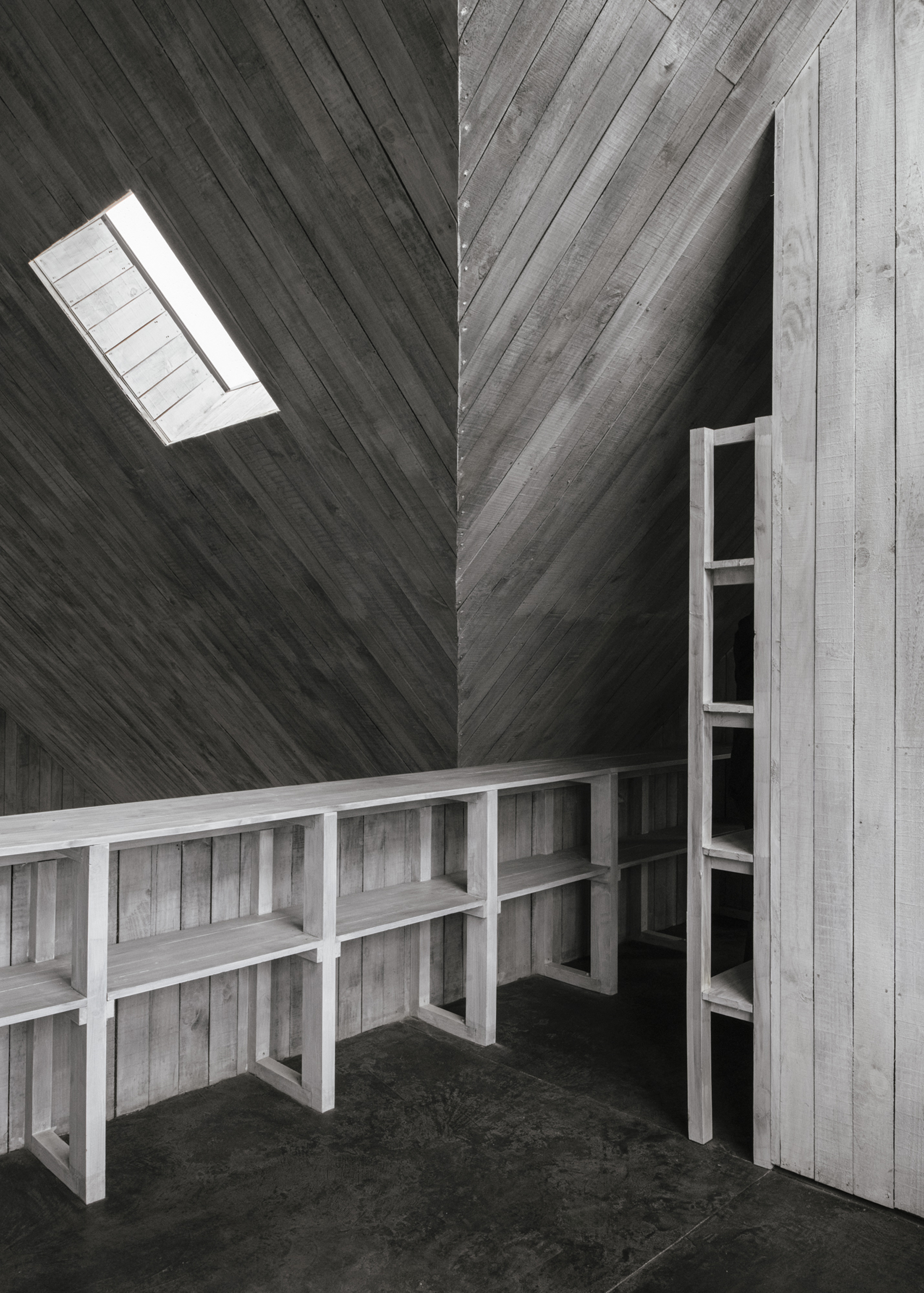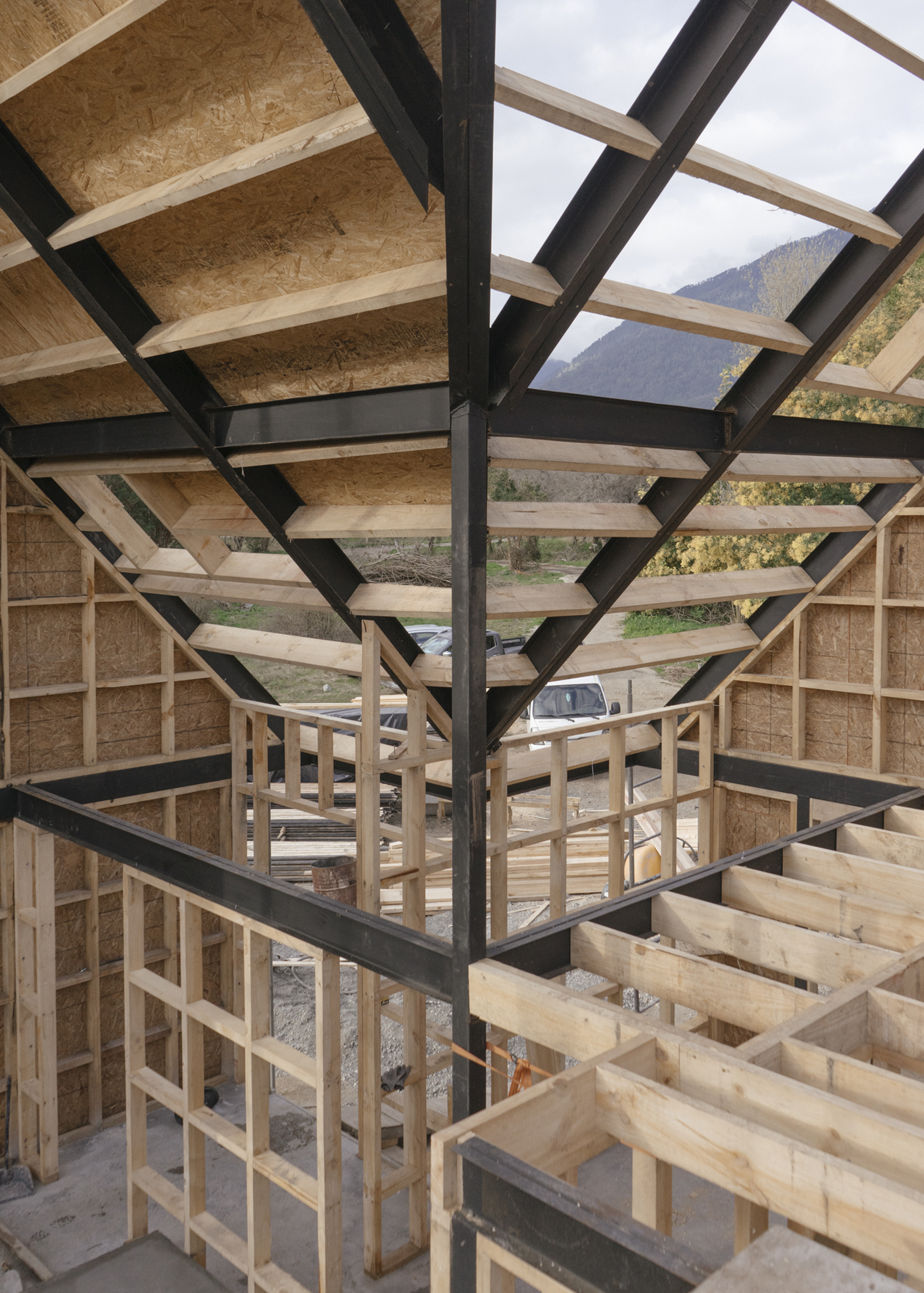 All the public areas share one half of the house on an open space of the full height; while intimates ones are distributed on three levels of the other half, just large enough to accommodate the owners and their friends visiting. Because the project celebrates the instance of sharing in the common areas, a long table made from a fallen larch trunk uses almost all the ground floor space, serving as dining table and kitchen unit. On one side of it the floor is lowered one step to give the necessary height for comfortable cooking while sharing the same surface of diners.