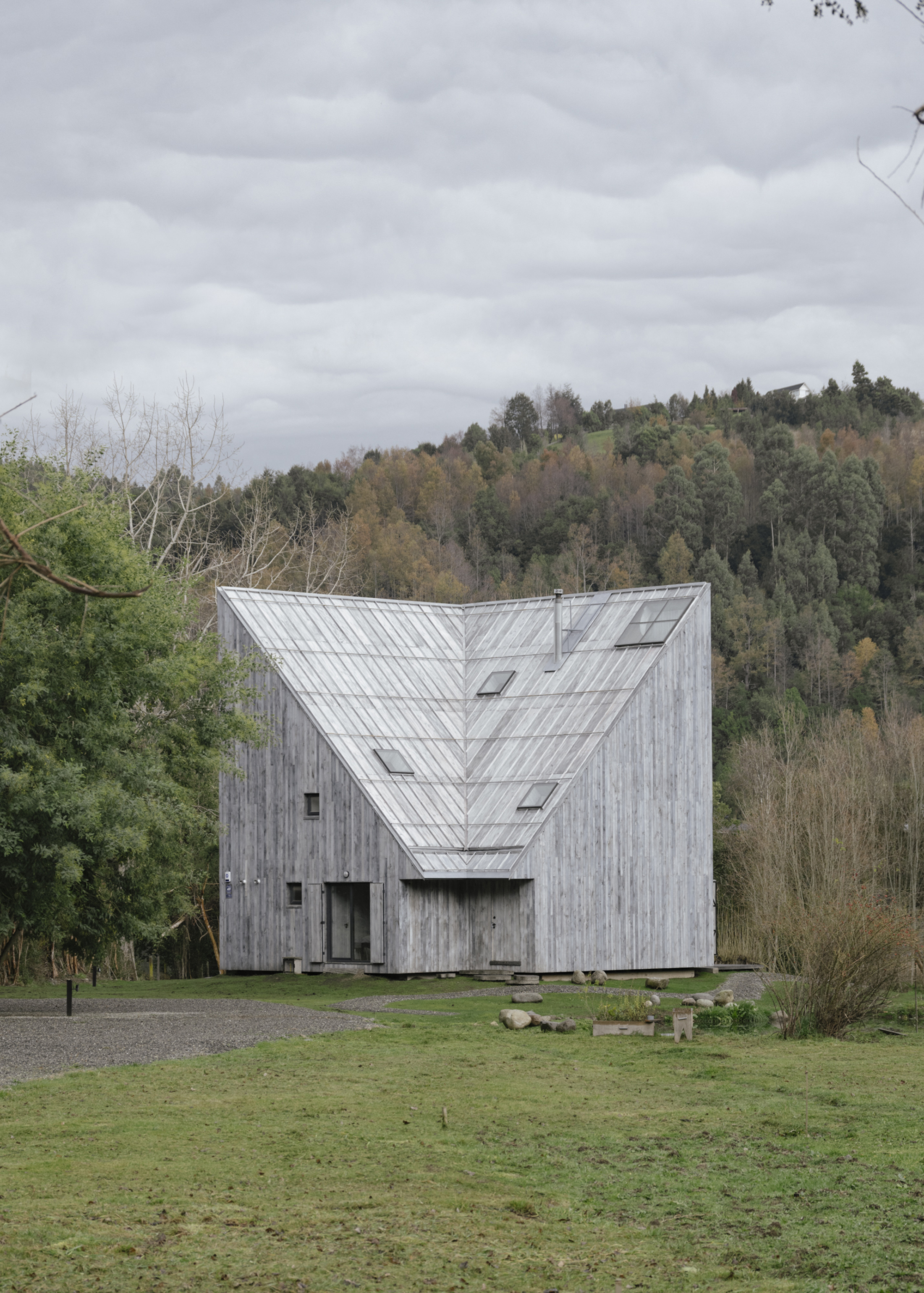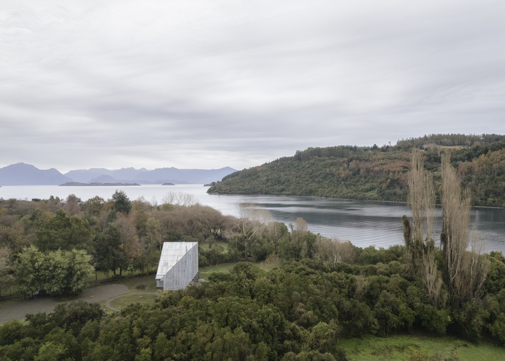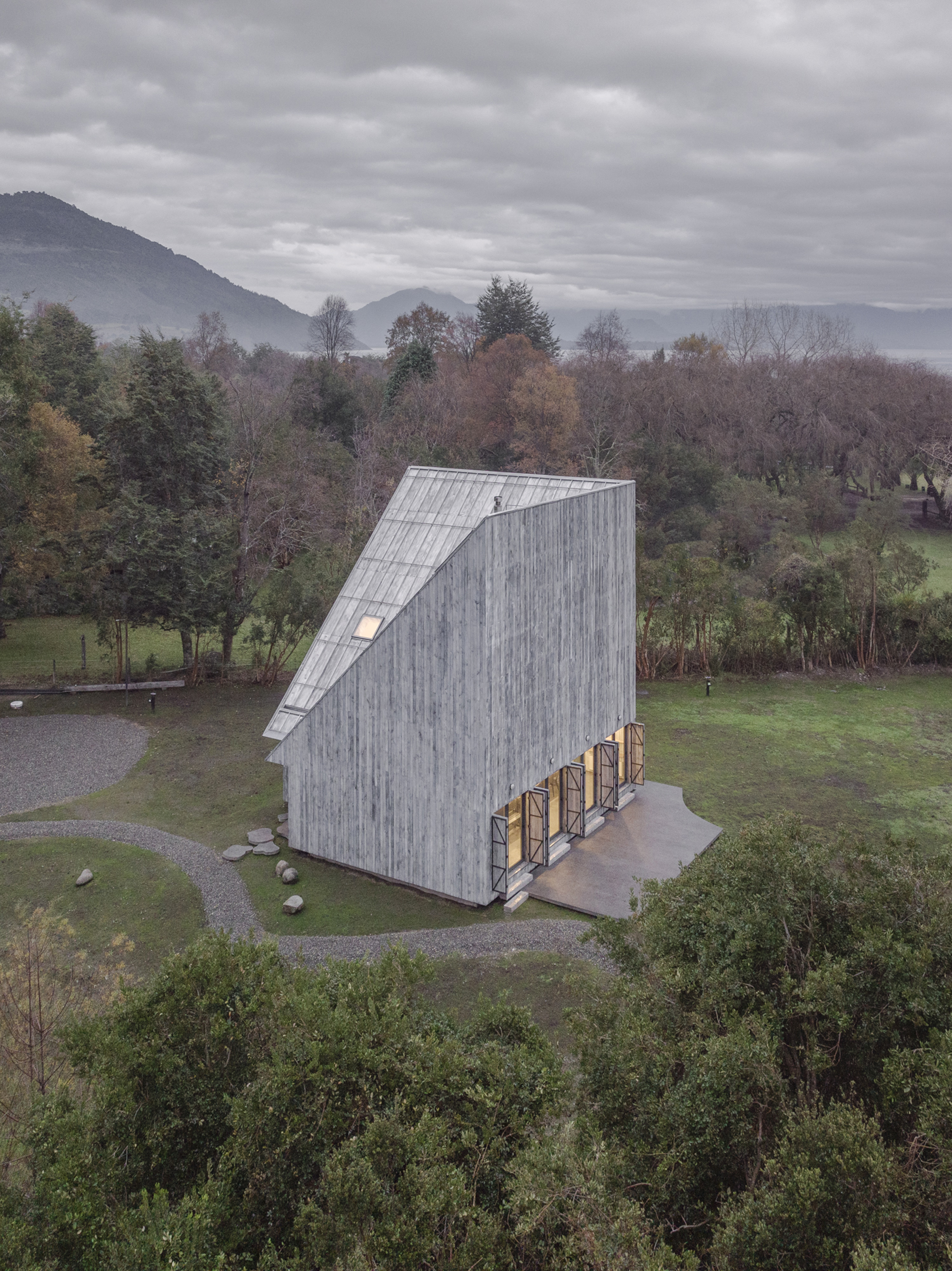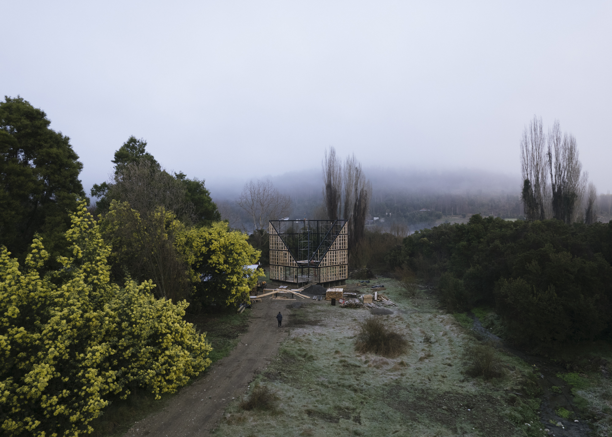Located in the south of Chile, in a natural clearing on a long piece of land that ends in a lake. It is flanked by a row of trees on one side and a small stream on the other. The height of the trees and the dense low bushes disorientates anyone trying to look for any element of the distant context. Only the direction in which the river flows make it possible to locate the lake, behind a dense layer of vegetation.