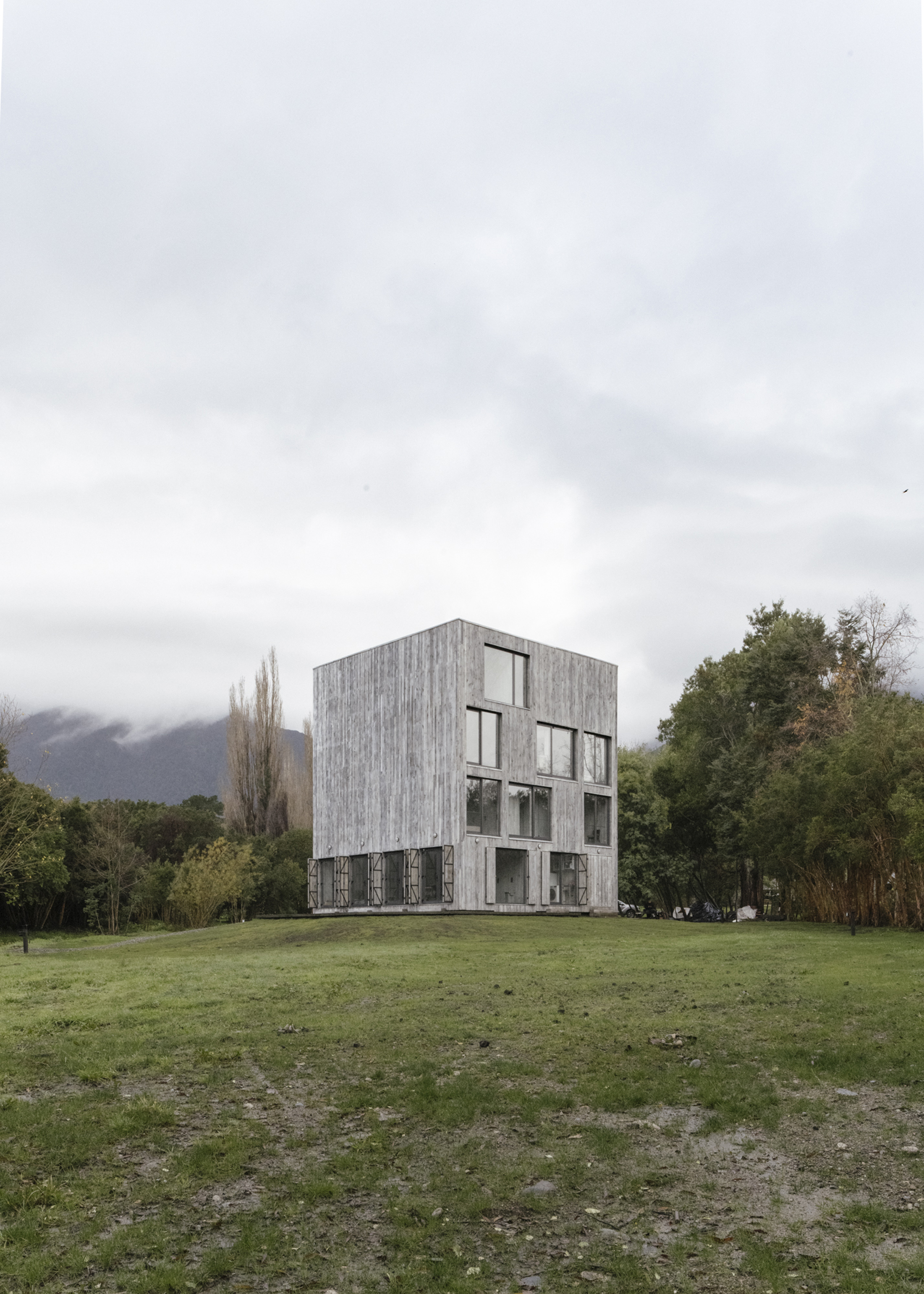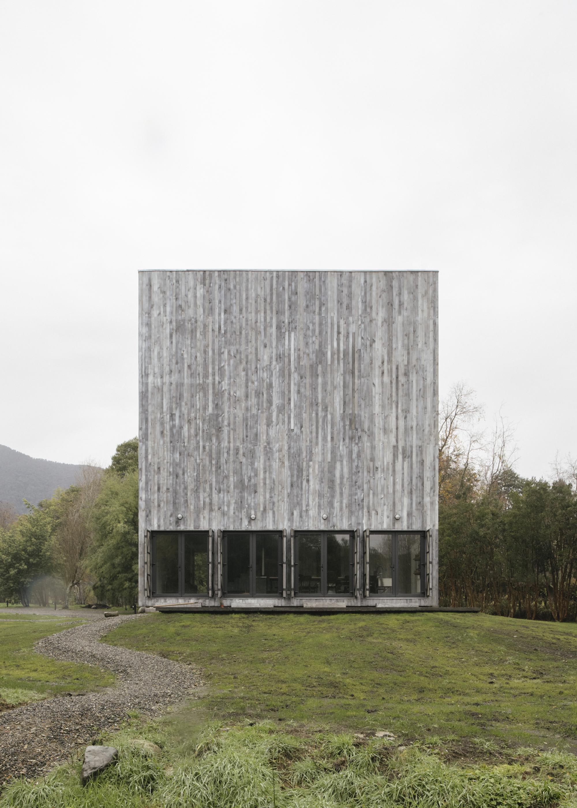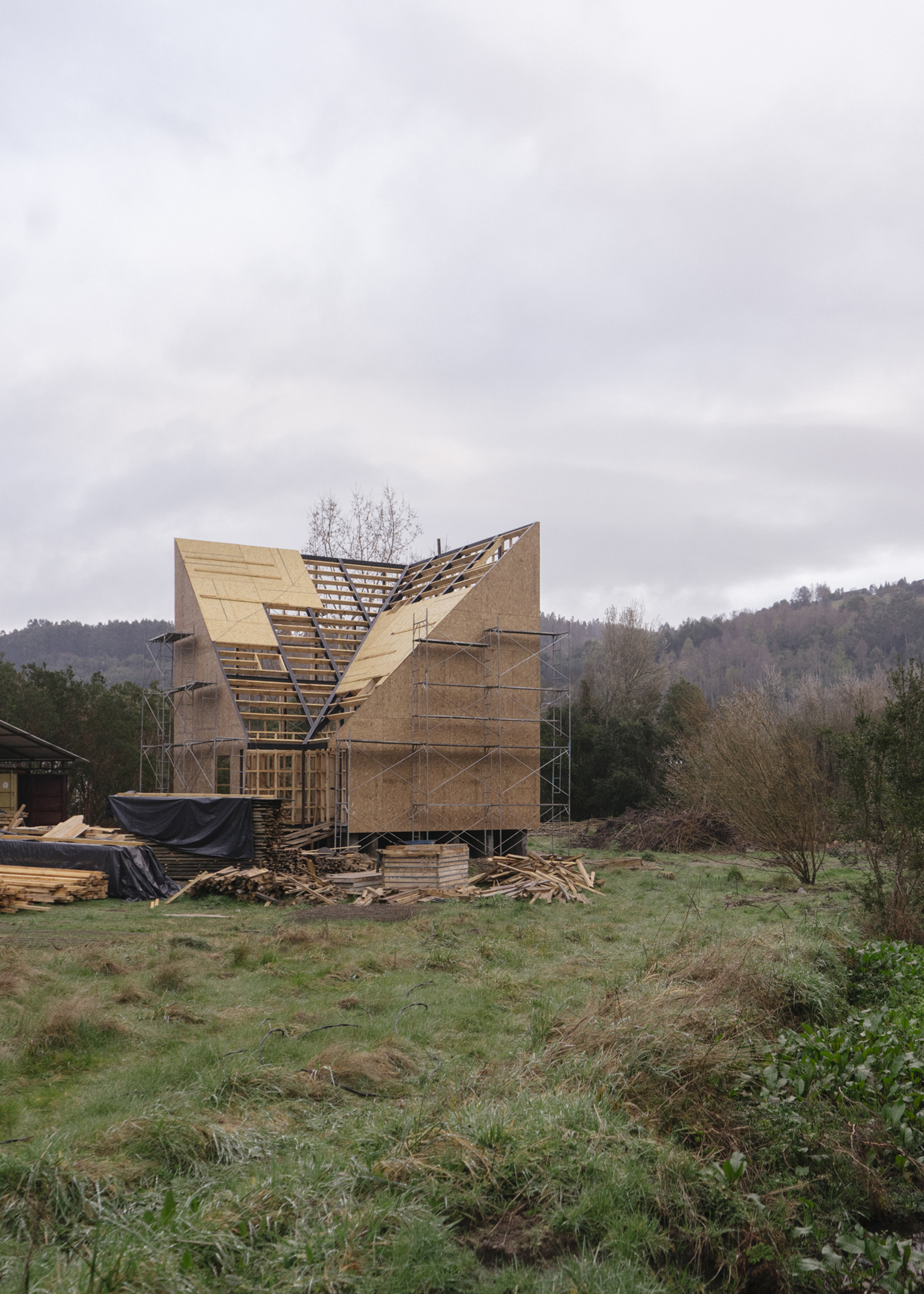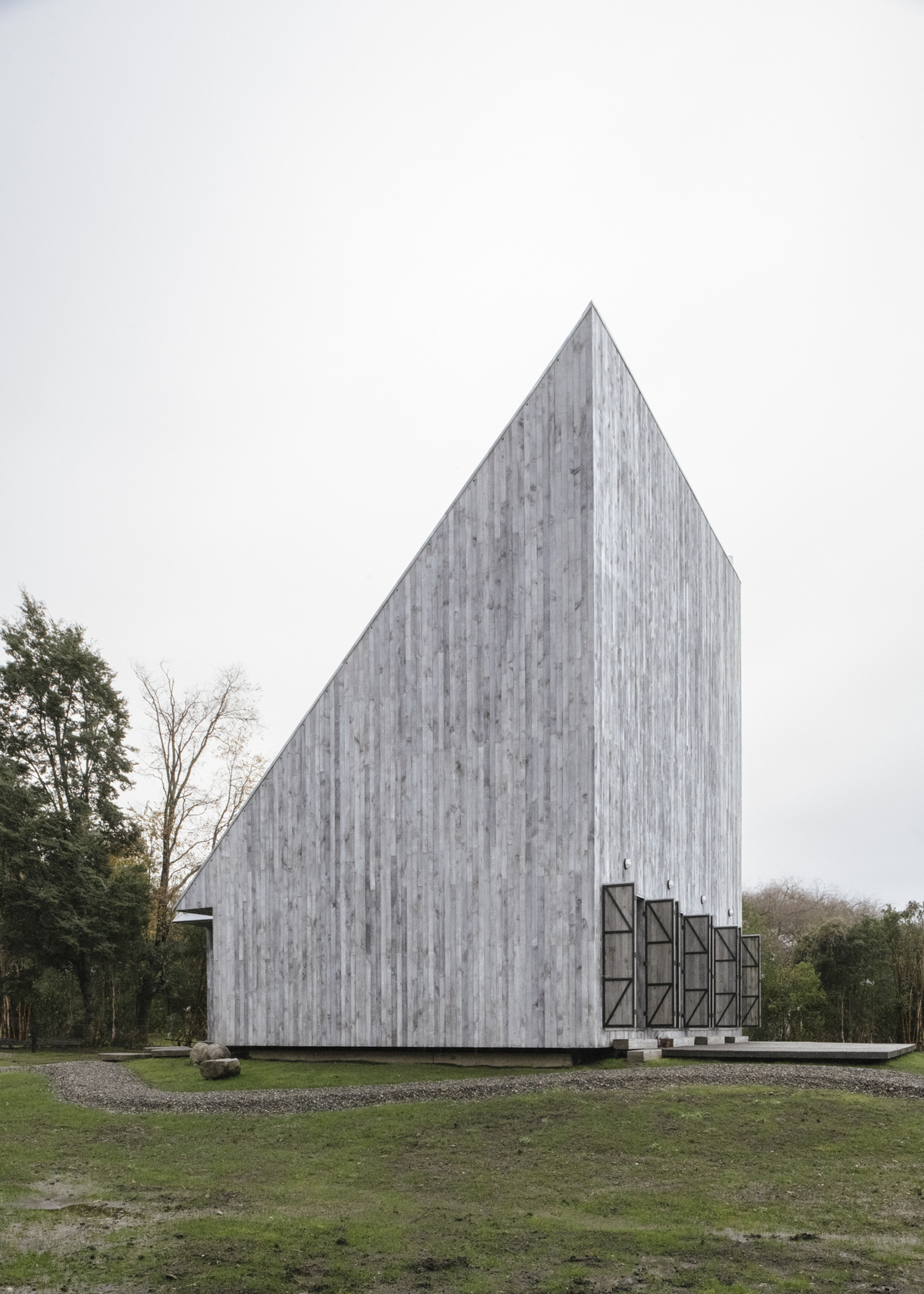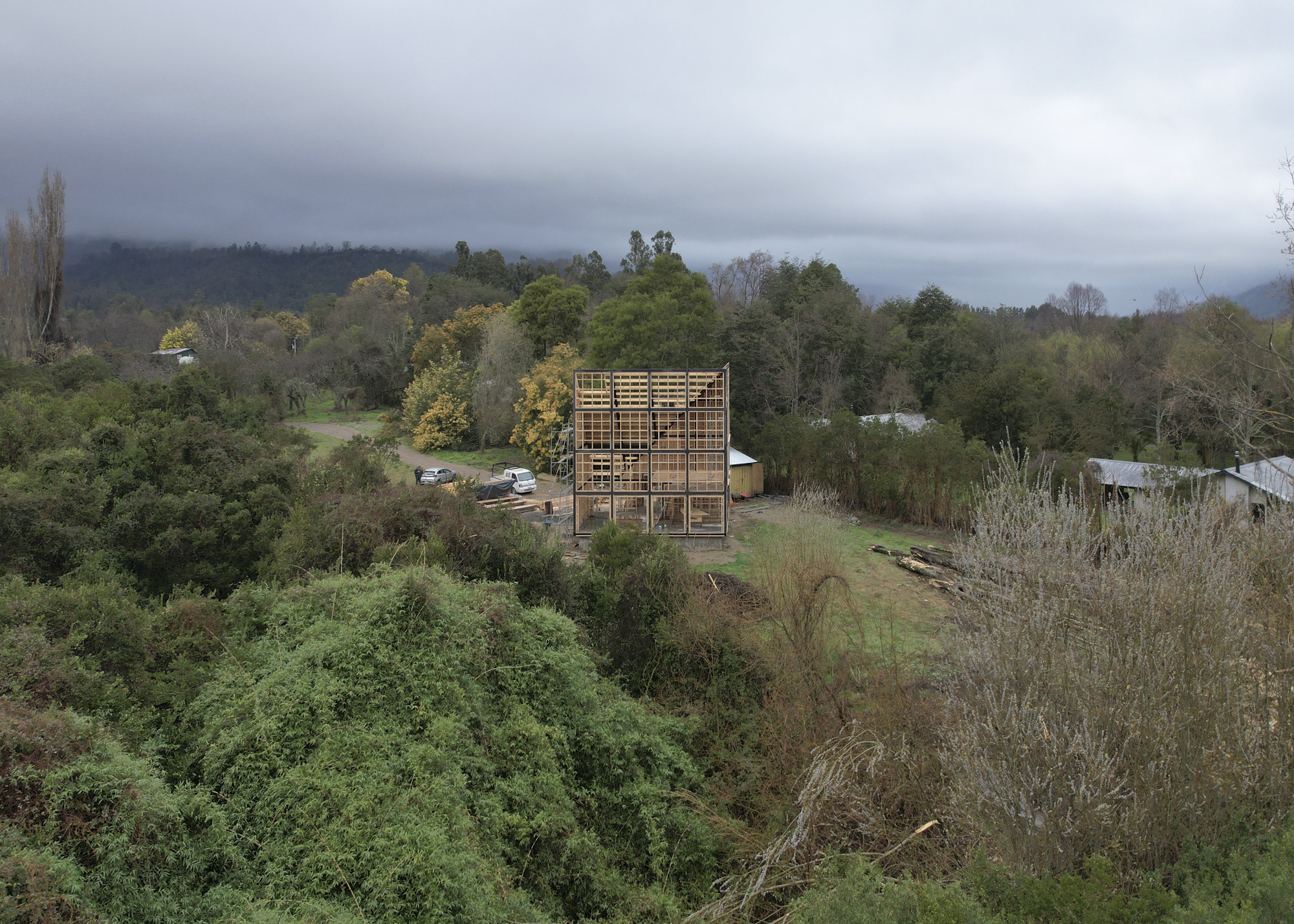 Located in the south of Chile, in a natural clearing on a long piece of land that ends in a lake. It is flanked by a row of trees on one side and a small stream on the other. The height of the trees and the dense low bushes disorientates anyone trying to look for any element of the distant context. Only the direction in which the river flows make it possible to locate the lake, behind a dense layer of vegetation.