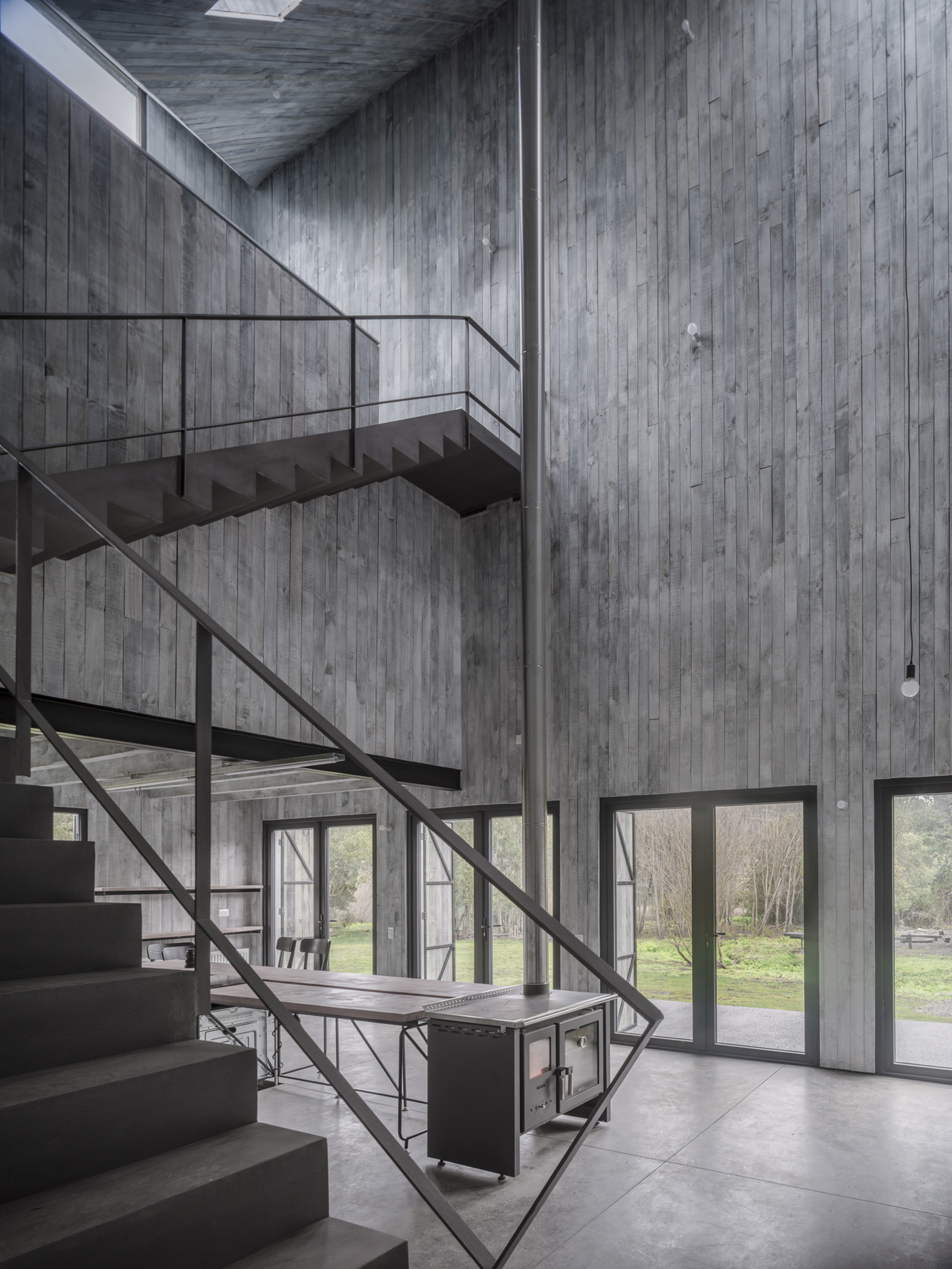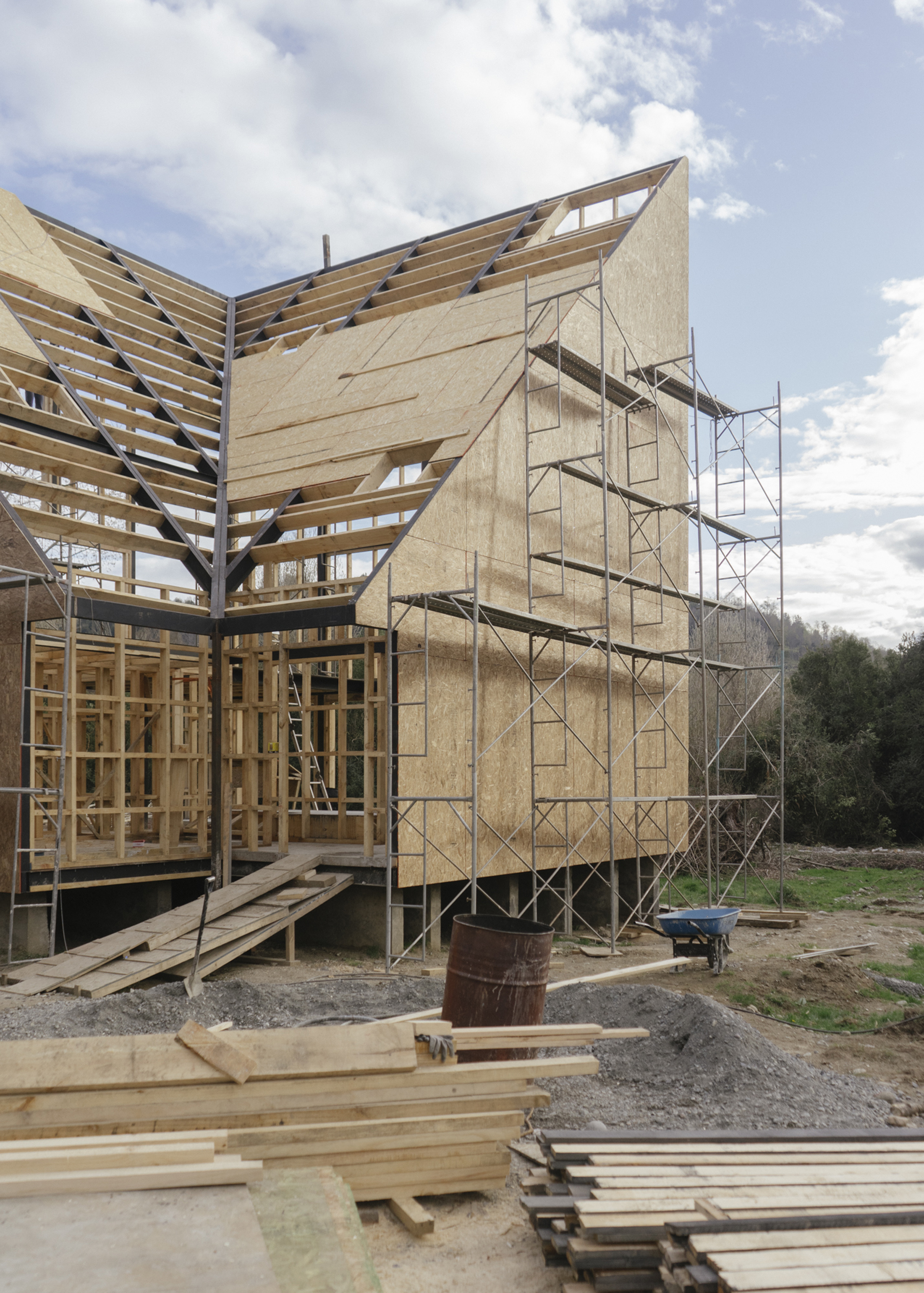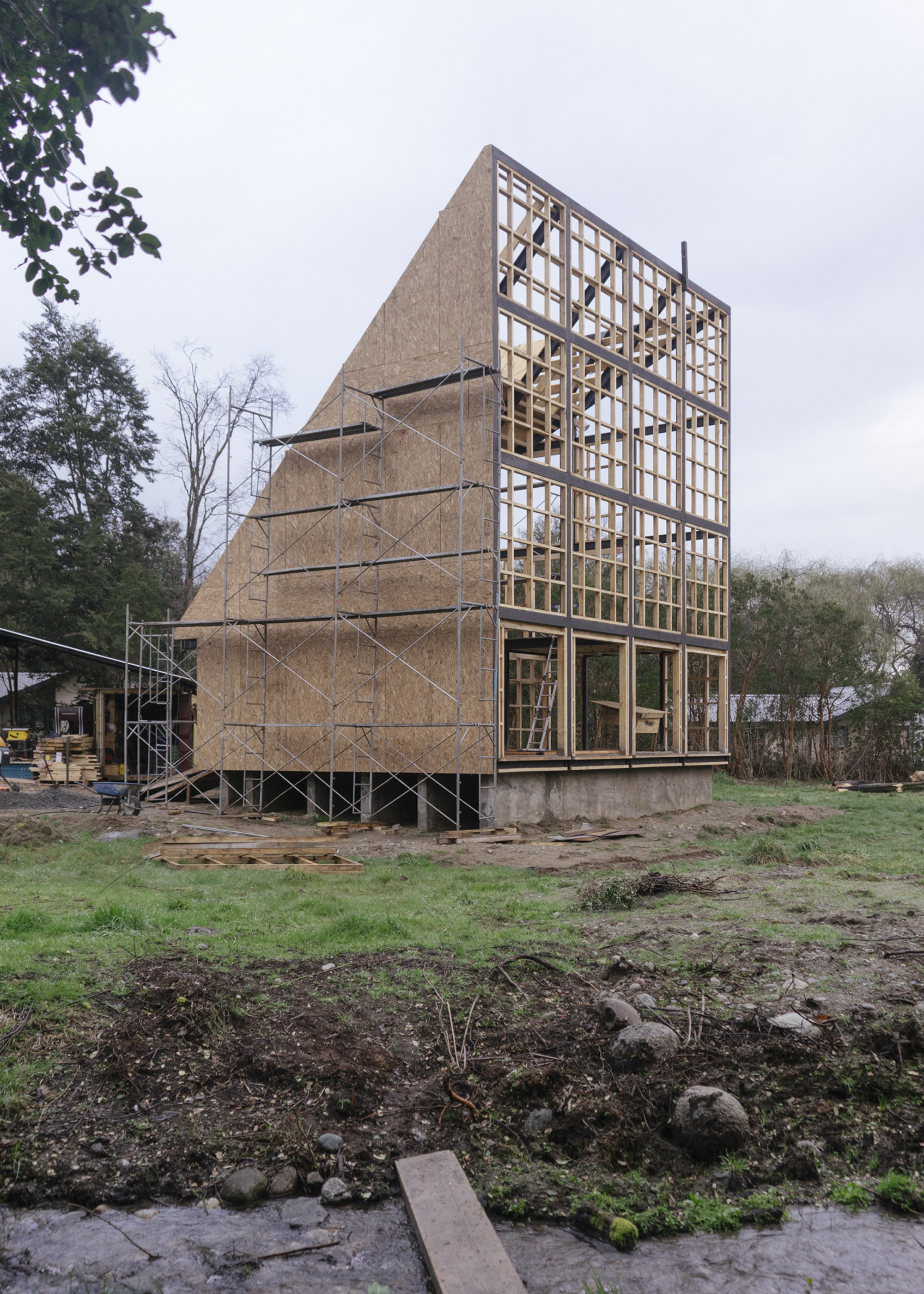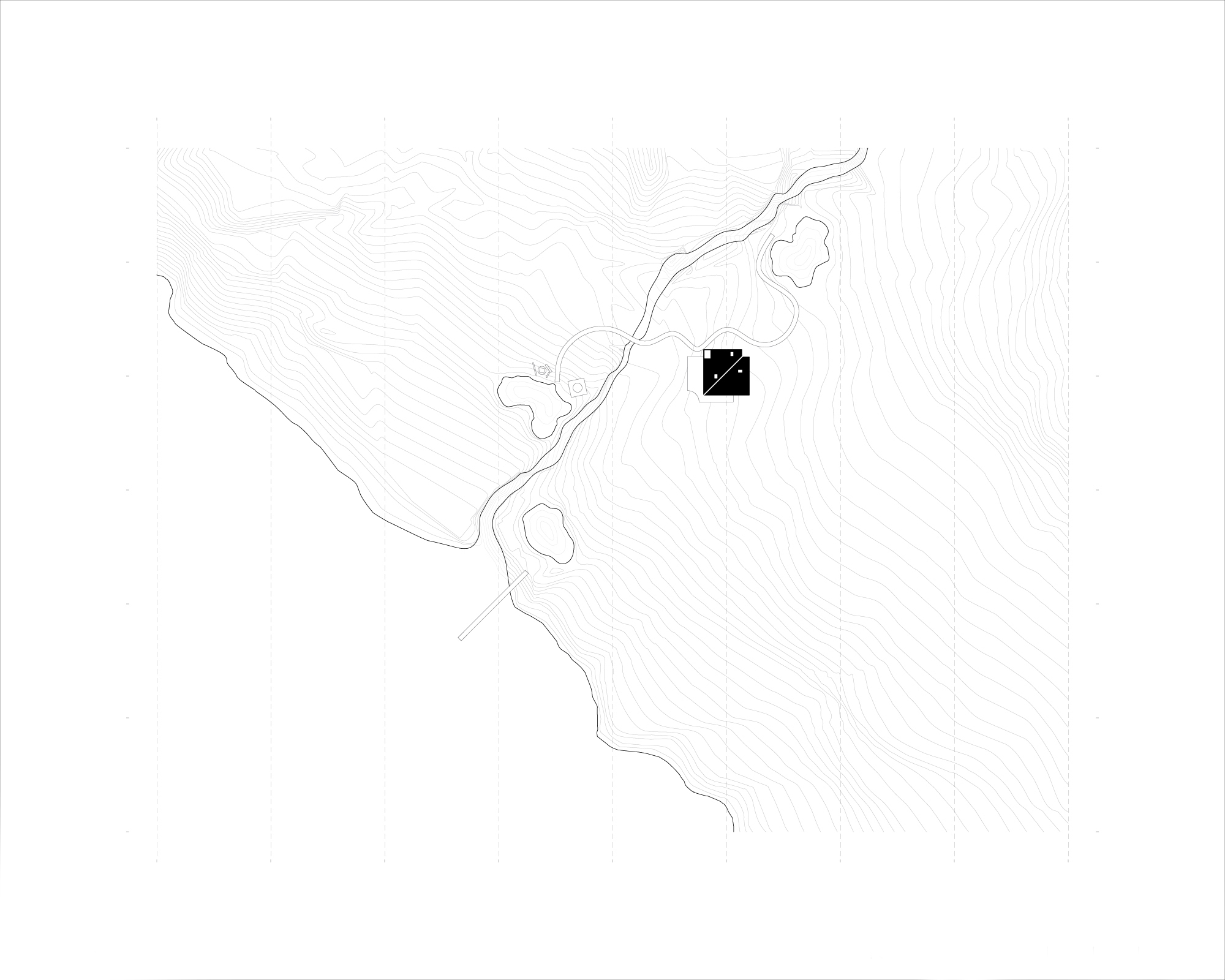 Located in the south of Chile, in a natural clearing on a long piece of land that ends in a lake. It is flanked by a row of trees on one side and a small stream on the other. The height of the trees and the dense low bushes disorientates anyone trying to look for any element of the distant context. Only the direction in which the river flows make it possible to locate the lake, behind a dense layer of vegetation.