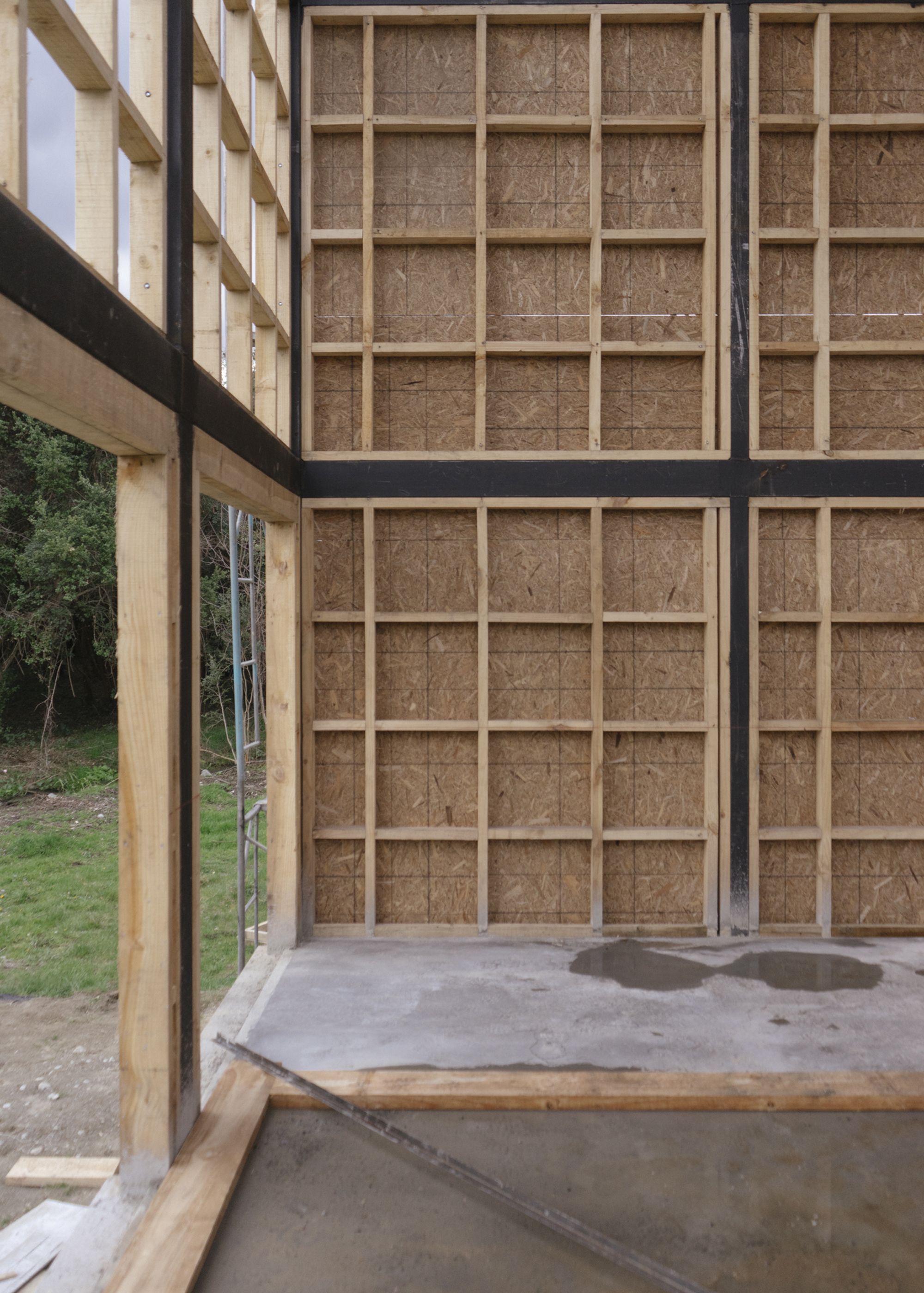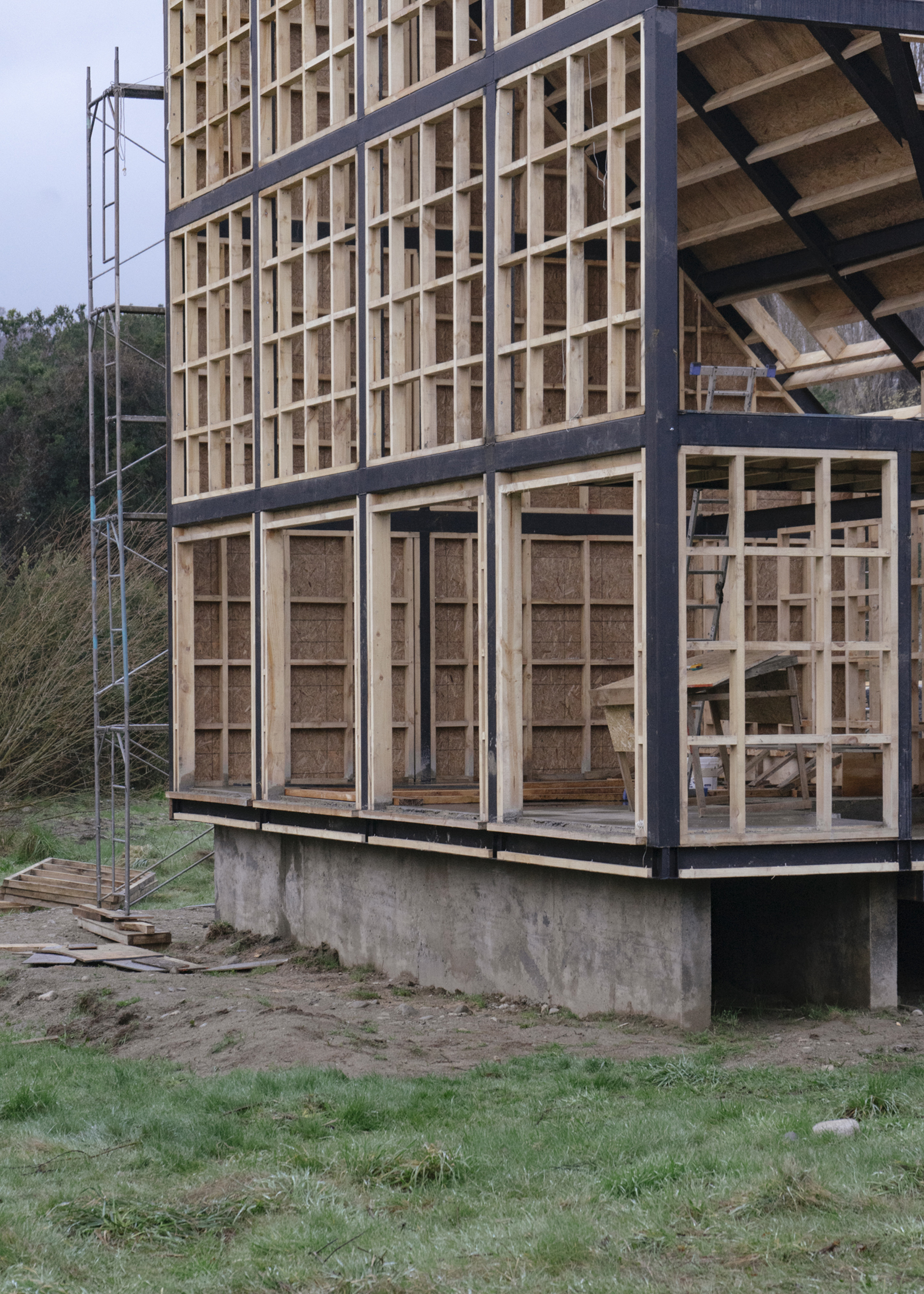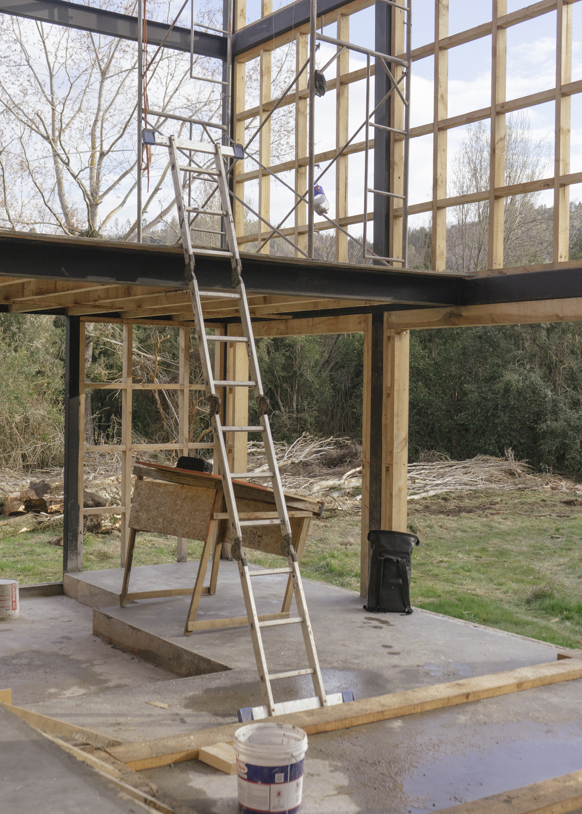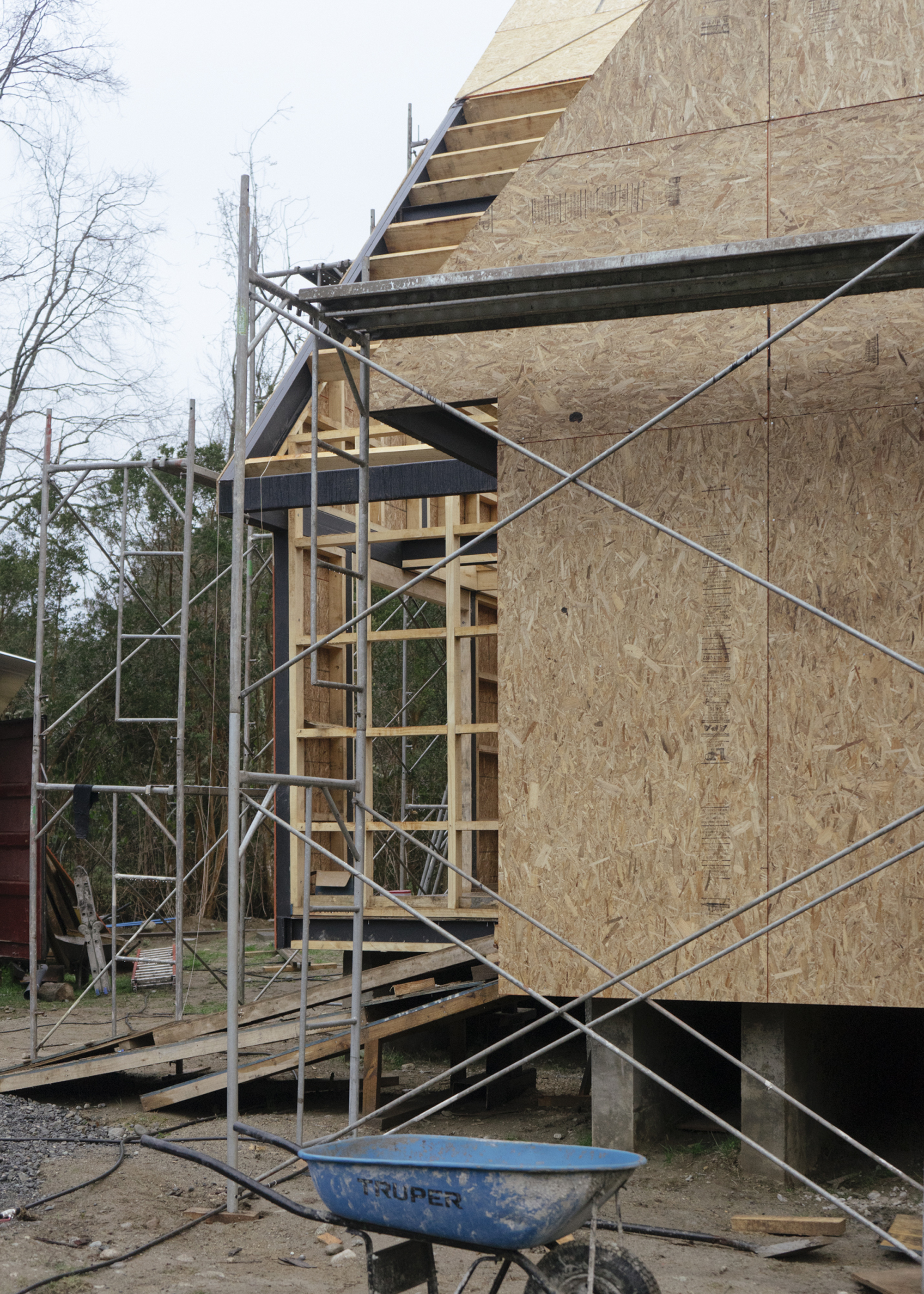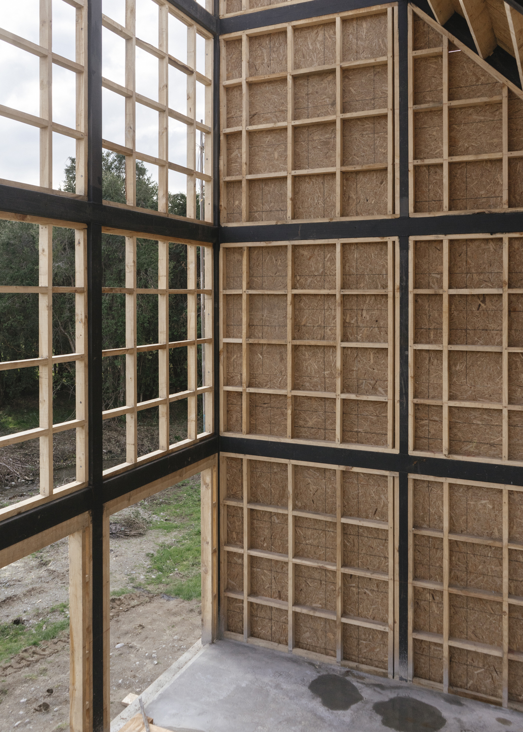 Located in the south of Chile, in a natural clearing on a long piece of land that ends in a lake. It is flanked by a row of trees on one side and a small stream on the other. The height of the trees and the dense low bushes disorientates anyone trying to look for any element of the distant context. Only the direction in which the river flows make it possible to locate the lake, behind a dense layer of vegetation.