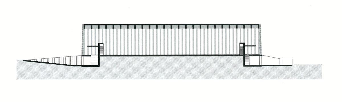 La struttura non direzionata è quindi concettualmente costituita da una “parete” portante di 70 cm di spessore e da una piastra precompressa di chiusura alta 140 cm. La proporzione planimetrica (1:1,8) permette di conservare l’effetto di portata bidirezionale proprio di una piastra e la luce di m 56,07×31,21 su 8 metri di altezza è stata così realizzata senza ricorrere ad una struttura a telai. I vuoti di 70 cm lungo tutto il perimetro della costruzione rappresentano i “risparmi” del muro.