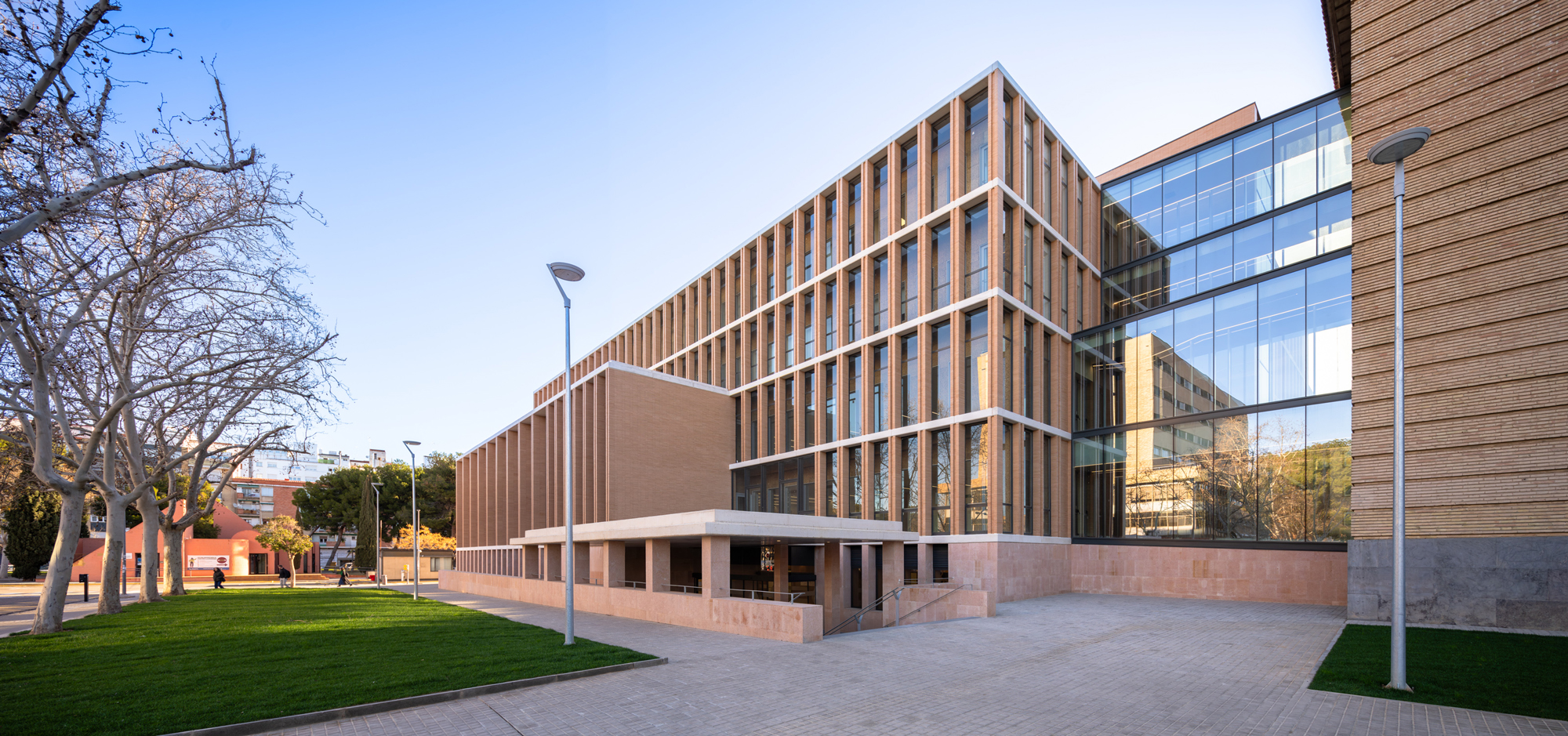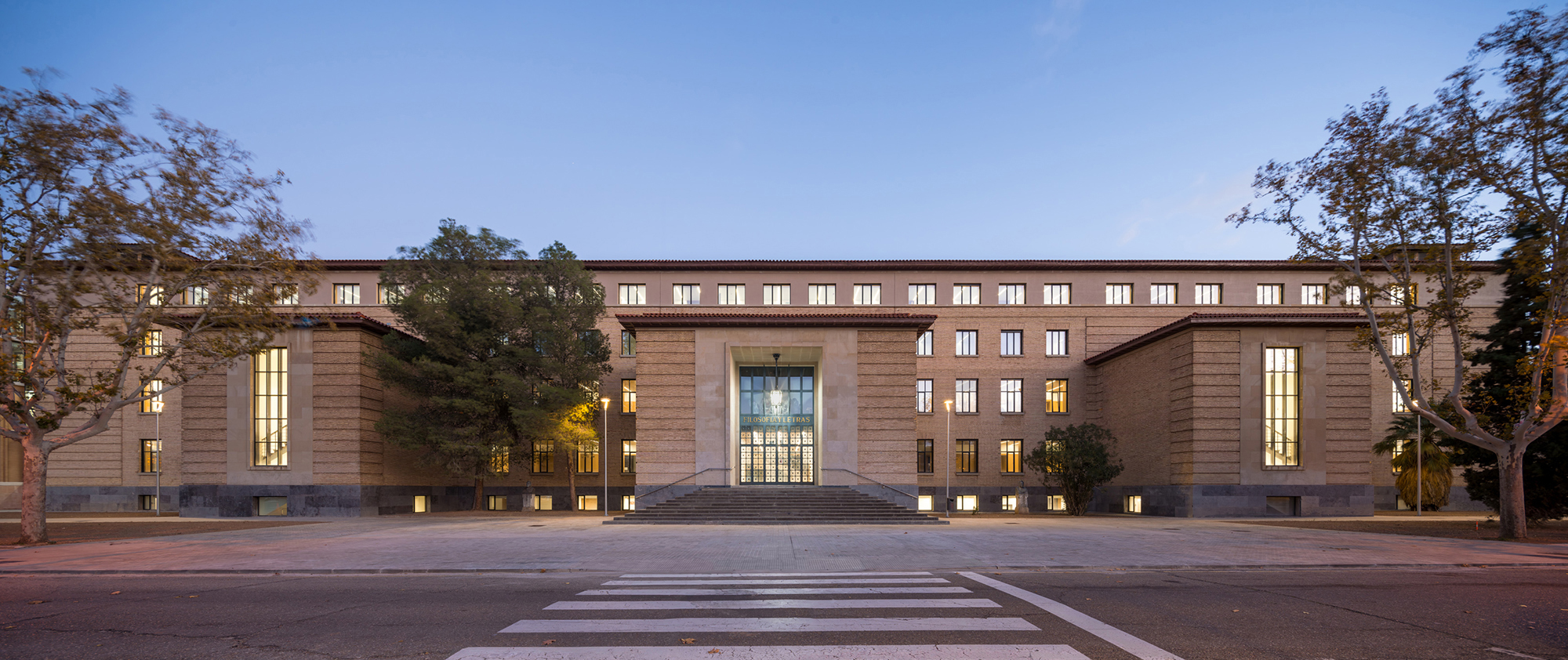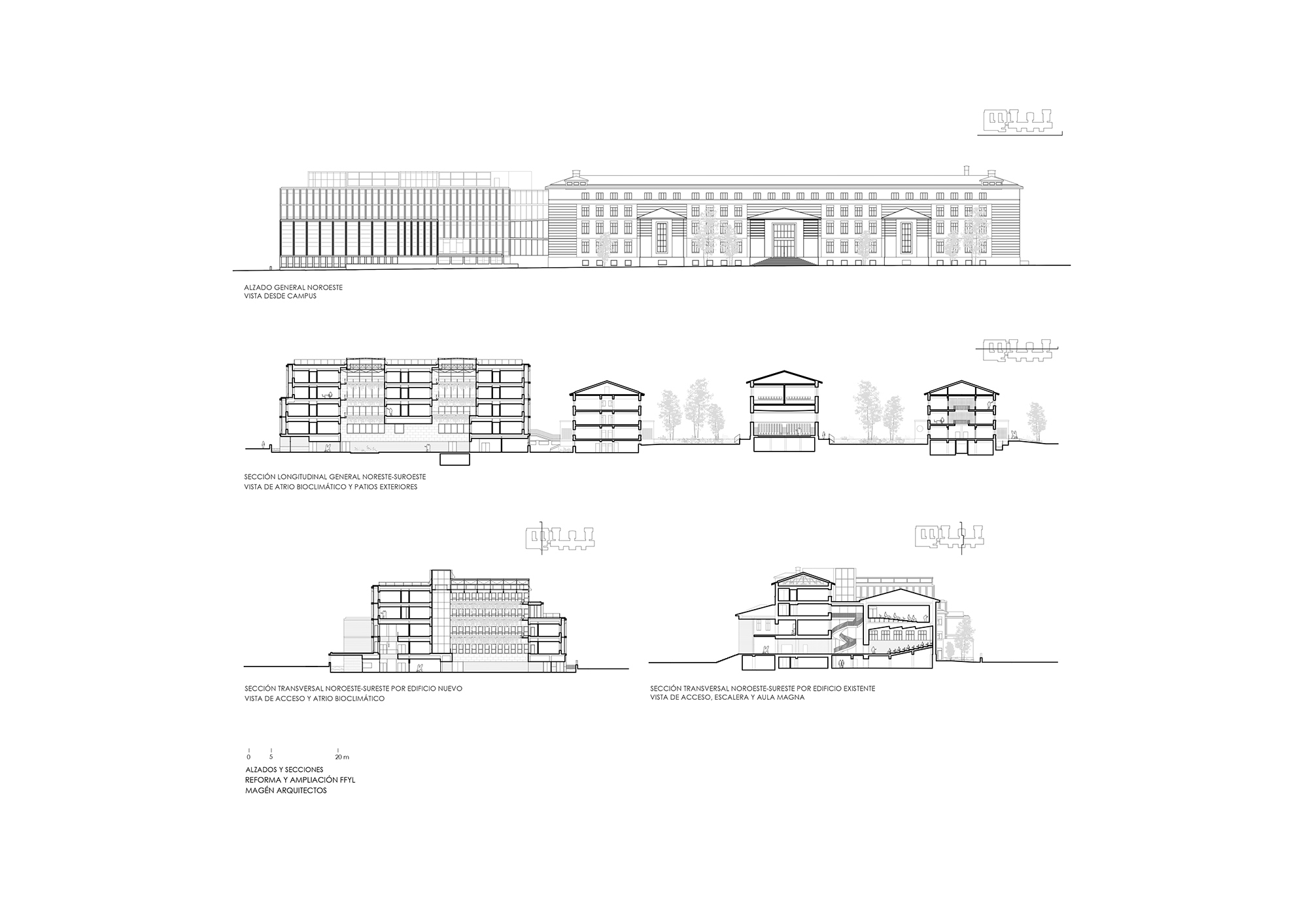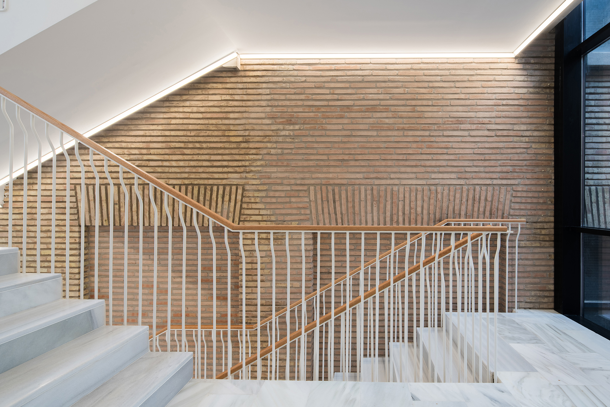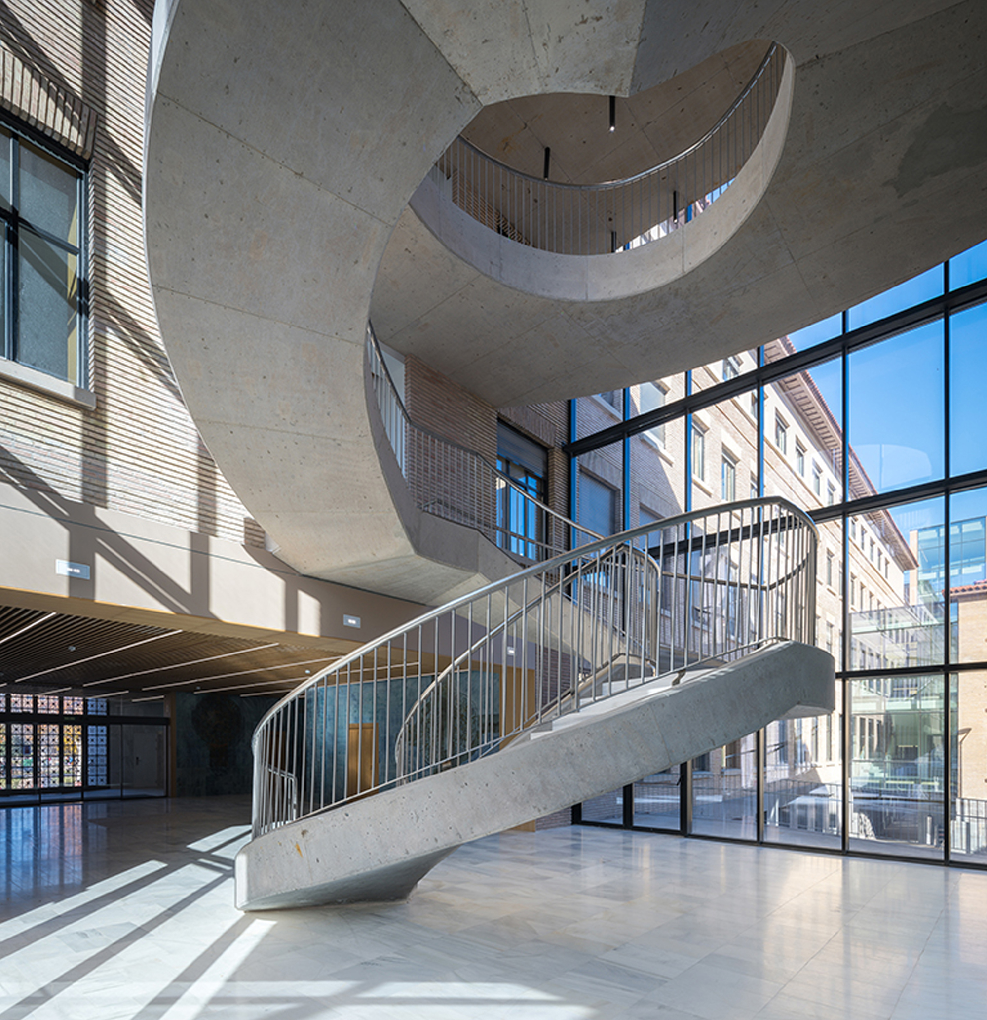 The principal objective was two-fold: the continuity of the old building, and maximum energy efficiency in pursuit of near-zero consumption. In the existing construction, the project highlighted the heritage elements, improved energy efficiency, and activated exterior courtyards. Modifications that had been made inside were eliminated in order to bring back the original floor-plan schemes, reinforce the structure and foundation, improve the properties of the cladding, restore the facades, and complete the redistribution of levels. In addition, procedures were carried out here and there to improve functionality, interconnection, and accessibility of the different parts. The most important operation was in the main foyer. The demolition of an interior piece attached to the Main Lecture Hall created a triple-height void, in which a new spiral sculpture was installed. This made it possible to open up the foyer towards the two rear courtyards. The long corridor got back its original section. A built-in continuous bench along the corridor provides settings for socializing between classes.