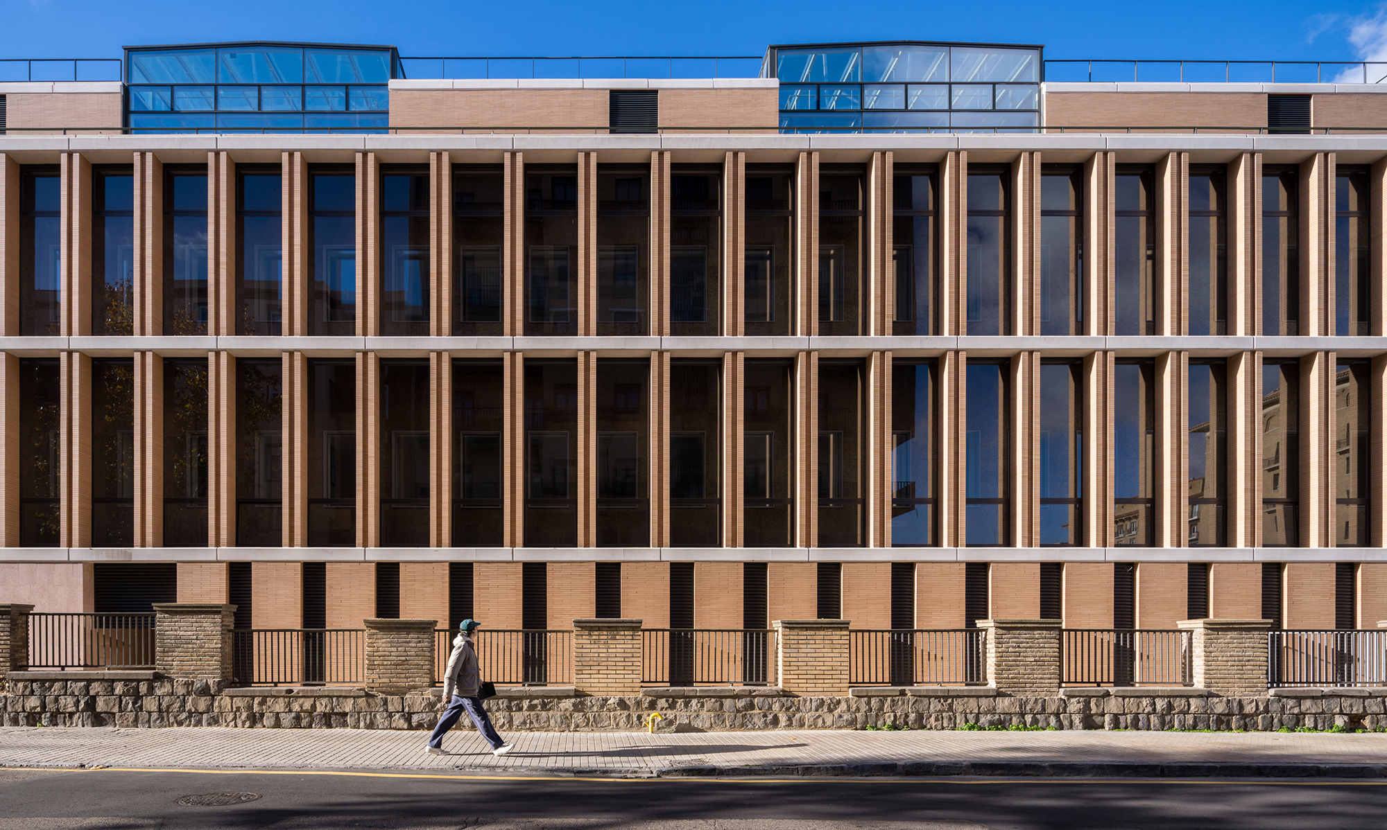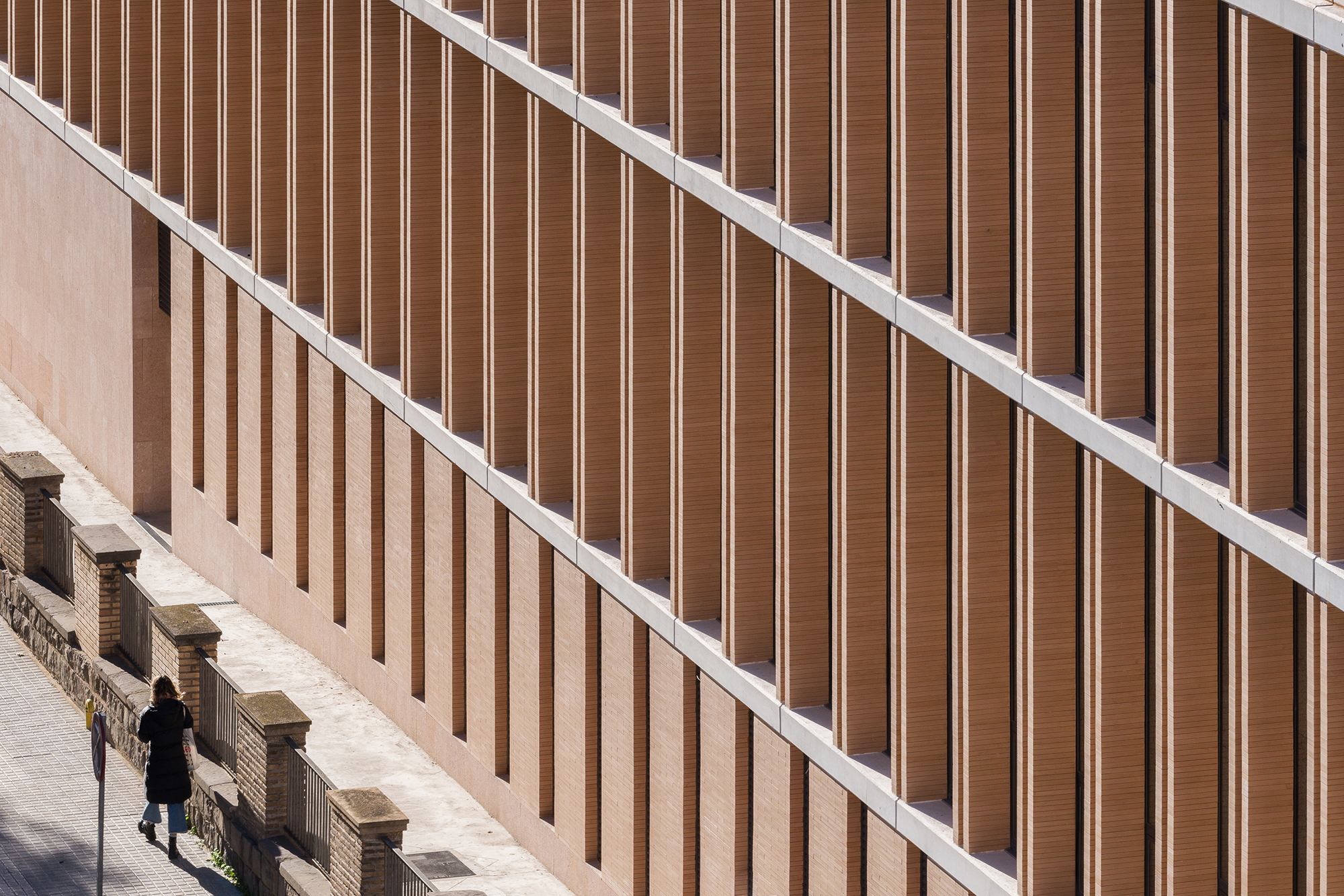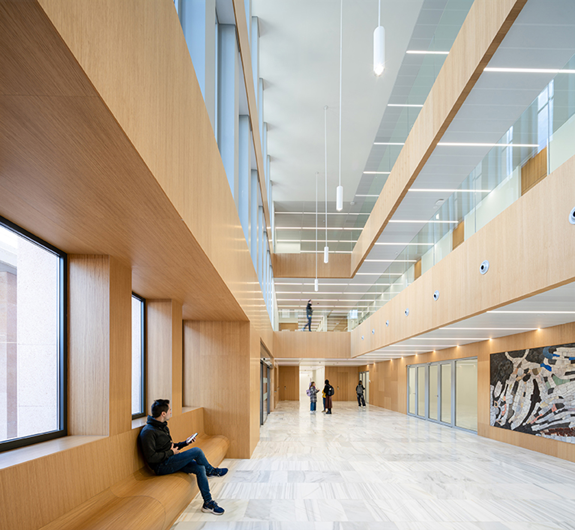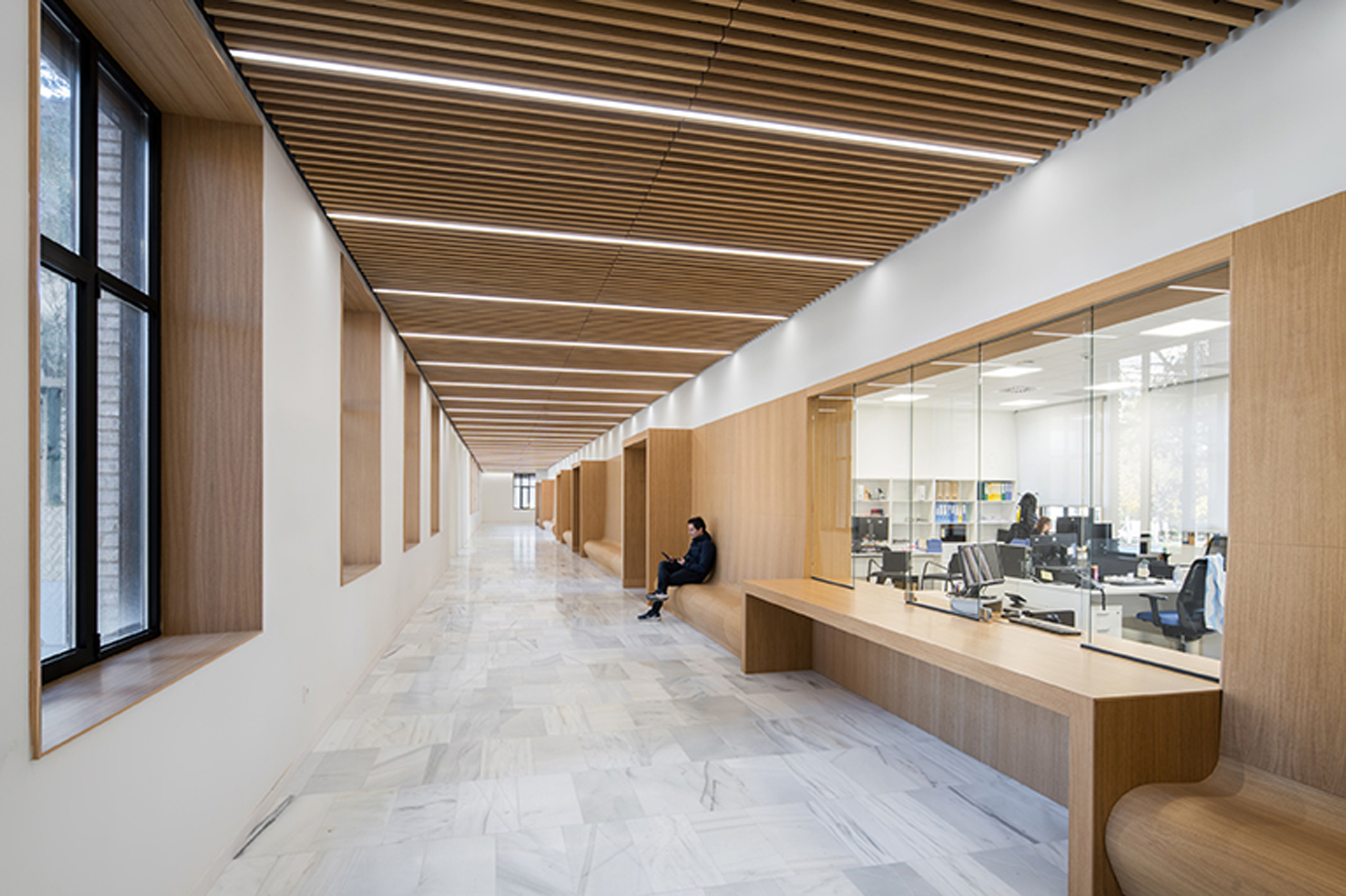 The principal objective was two-fold: the continuity of the old building, and maximum energy efficiency in pursuit of near-zero consumption. In the existing construction, the project highlighted the heritage elements, improved energy efficiency, and activated exterior courtyards. Modifications that had been made inside were eliminated in order to bring back the original floor-plan schemes, reinforce the structure and foundation, improve the properties of the cladding, restore the facades, and complete the redistribution of levels. In addition, procedures were carried out here and there to improve functionality, interconnection, and accessibility of the different parts. The most important operation was in the main foyer. The demolition of an interior piece attached to the Main Lecture Hall created a triple-height void, in which a new spiral sculpture was installed. This made it possible to open up the foyer towards the two rear courtyards. The long corridor got back its original section. A built-in continuous bench along the corridor provides settings for socializing between classes.