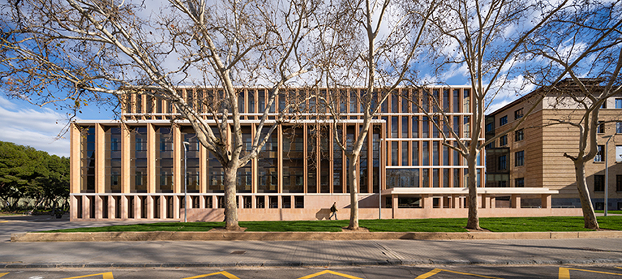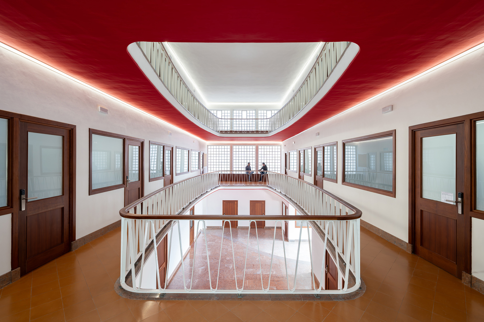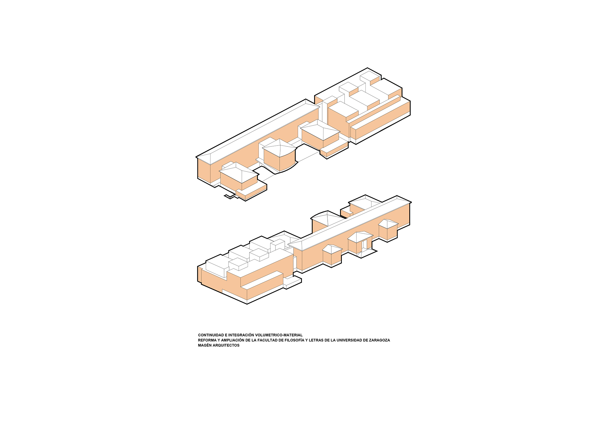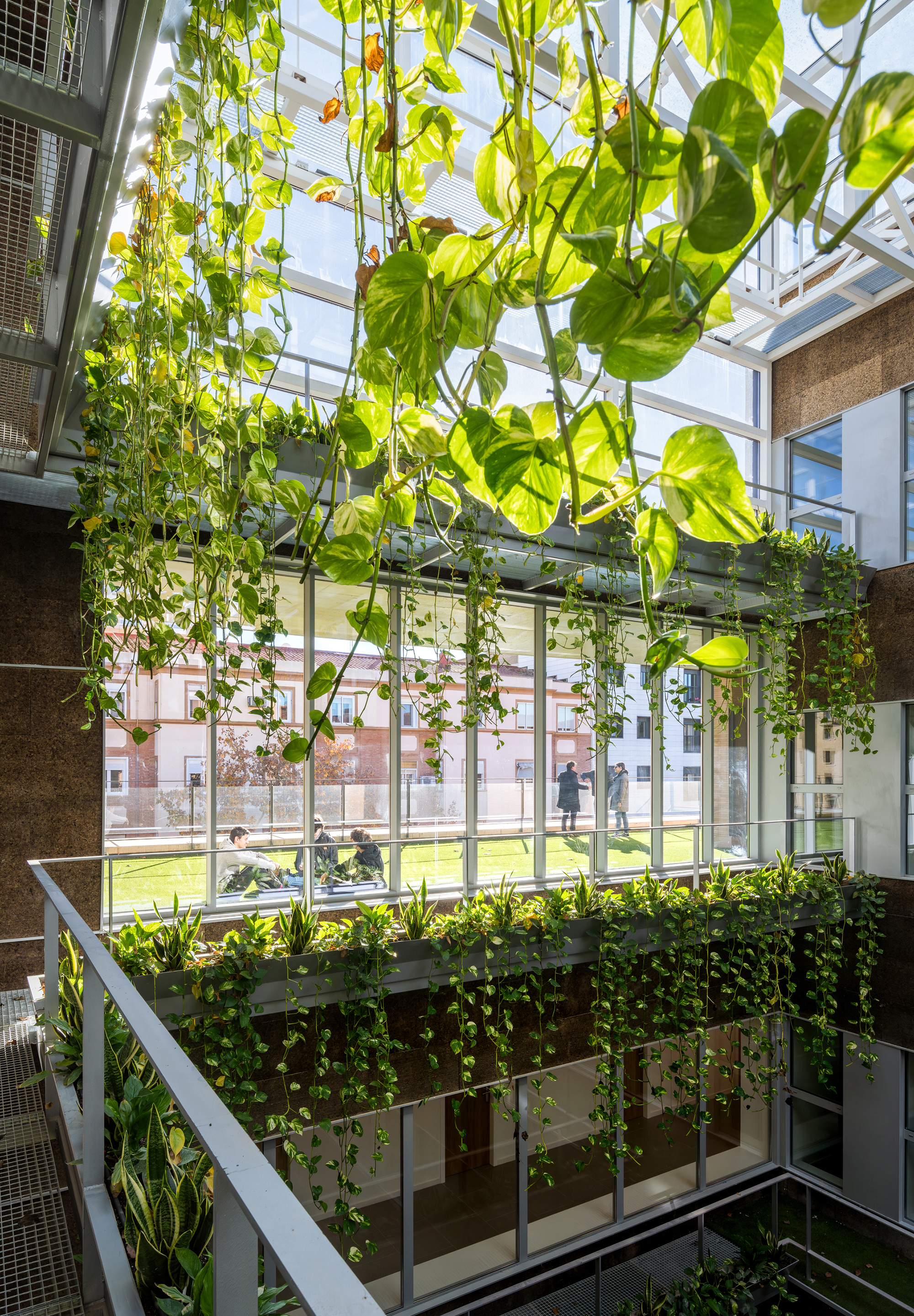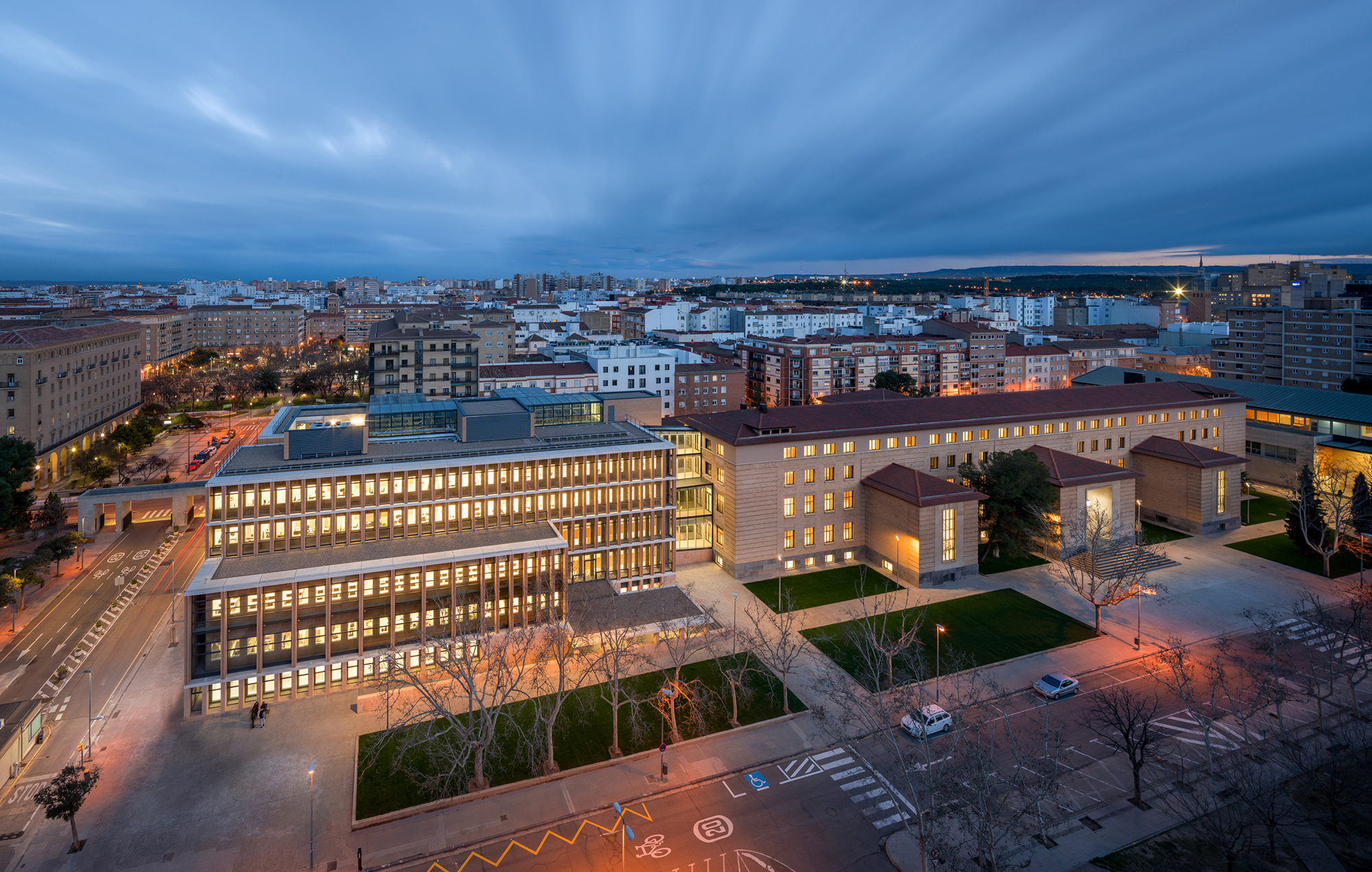 The principal objective was two-fold: the continuity of the old building, and maximum energy efficiency in pursuit of near-zero consumption. In the existing construction, the project highlighted the heritage elements, improved energy efficiency, and activated exterior courtyards. Modifications that had been made inside were eliminated in order to bring back the original floor-plan schemes, reinforce the structure and foundation, improve the properties of the cladding, restore the facades, and complete the redistribution of levels. In addition, procedures were carried out here and there to improve functionality, interconnection, and accessibility of the different parts. The most important operation was in the main foyer. The demolition of an interior piece attached to the Main Lecture Hall created a triple-height void, in which a new spiral sculpture was installed. This made it possible to open up the foyer towards the two rear courtyards. The long corridor got back its original section. A built-in continuous bench along the corridor provides settings for socializing between classes.