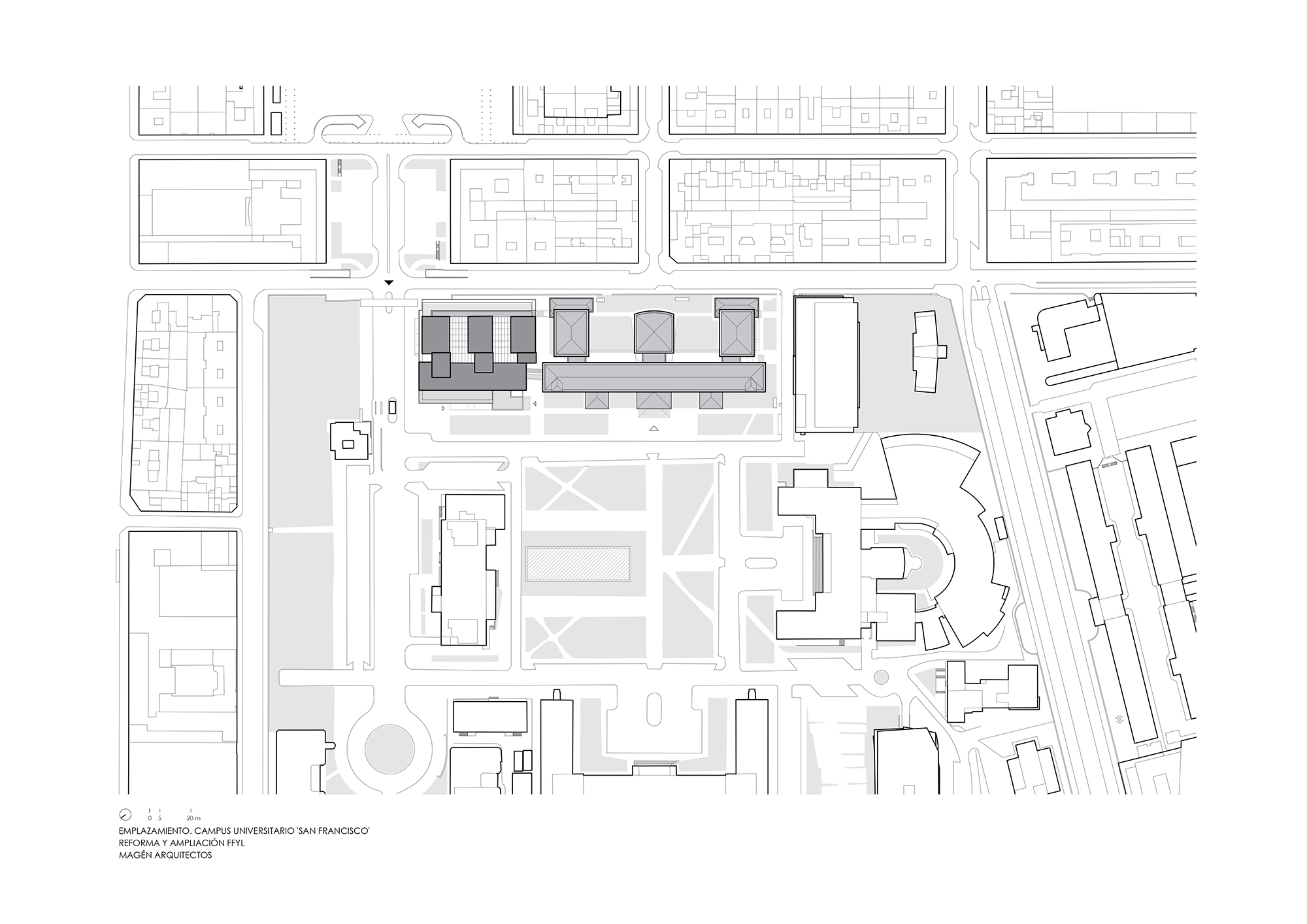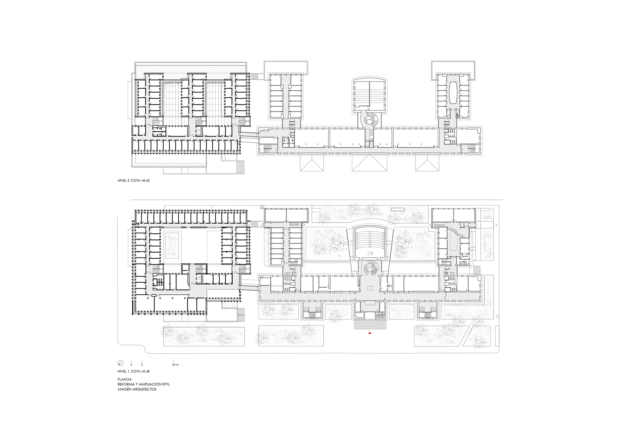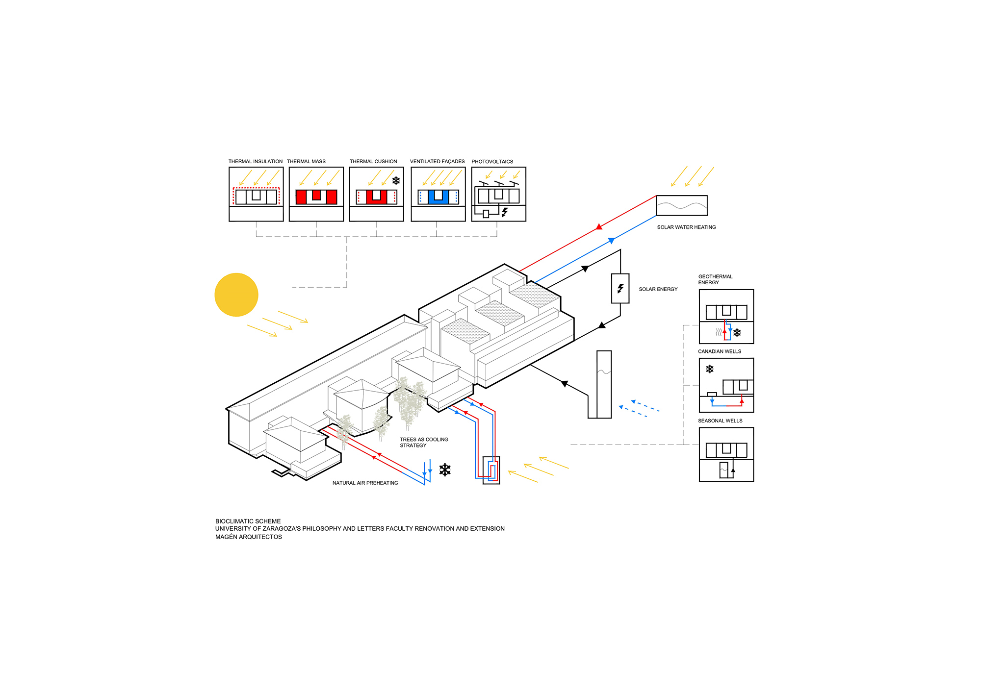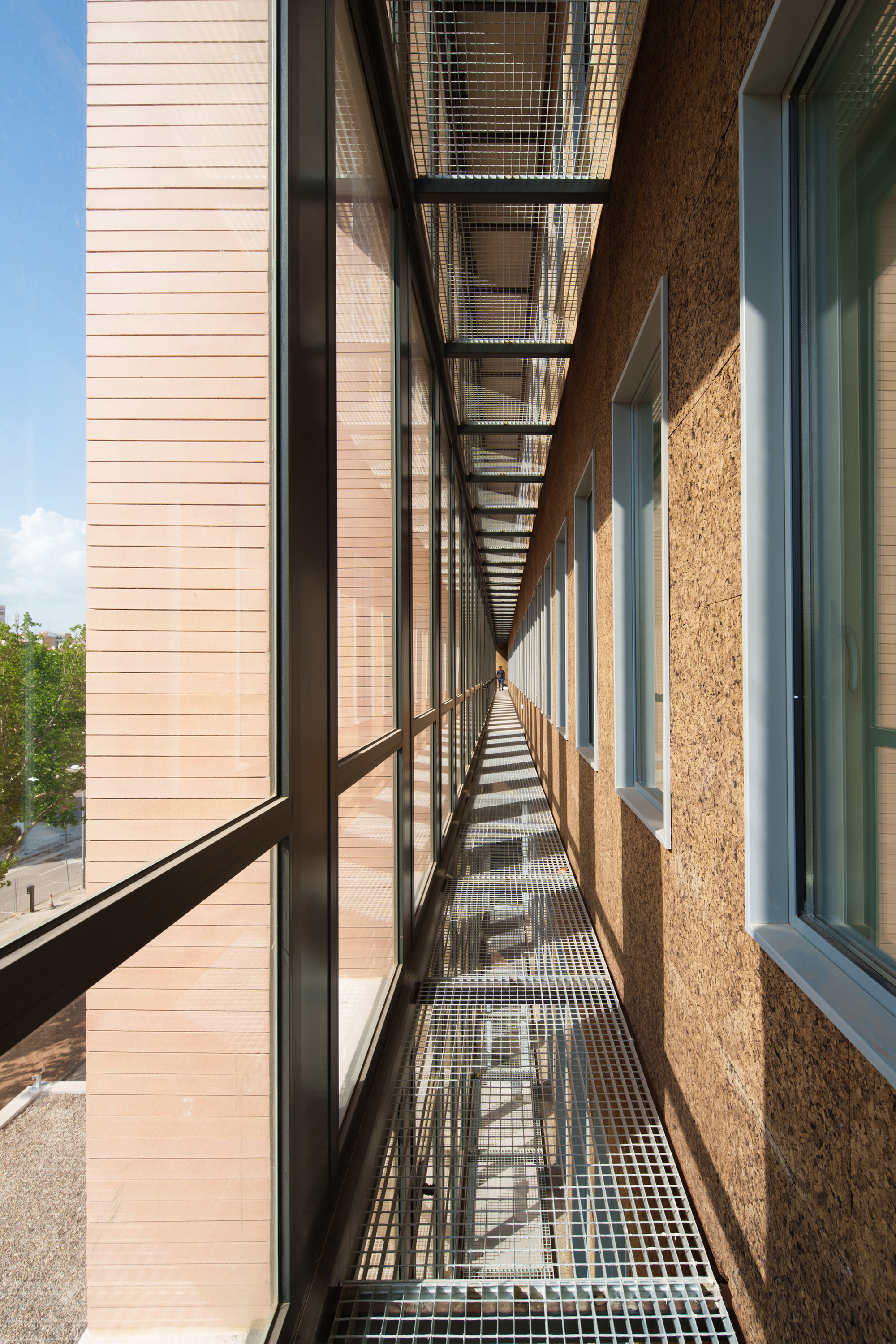 The principal objective was two-fold: the continuity of the old building, and maximum energy efficiency in pursuit of near-zero consumption. In the existing construction, the project highlighted the heritage elements, improved energy efficiency, and activated exterior courtyards. Modifications that had been made inside were eliminated in order to bring back the original floor-plan schemes, reinforce the structure and foundation, improve the properties of the cladding, restore the facades, and complete the redistribution of levels. In addition, procedures were carried out here and there to improve functionality, interconnection, and accessibility of the different parts. The most important operation was in the main foyer. The demolition of an interior piece attached to the Main Lecture Hall created a triple-height void, in which a new spiral sculpture was installed. This made it possible to open up the foyer towards the two rear courtyards. The long corridor got back its original section. A built-in continuous bench along the corridor provides settings for socializing between classes.