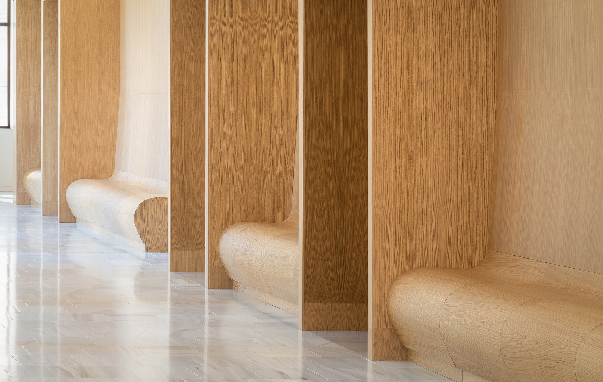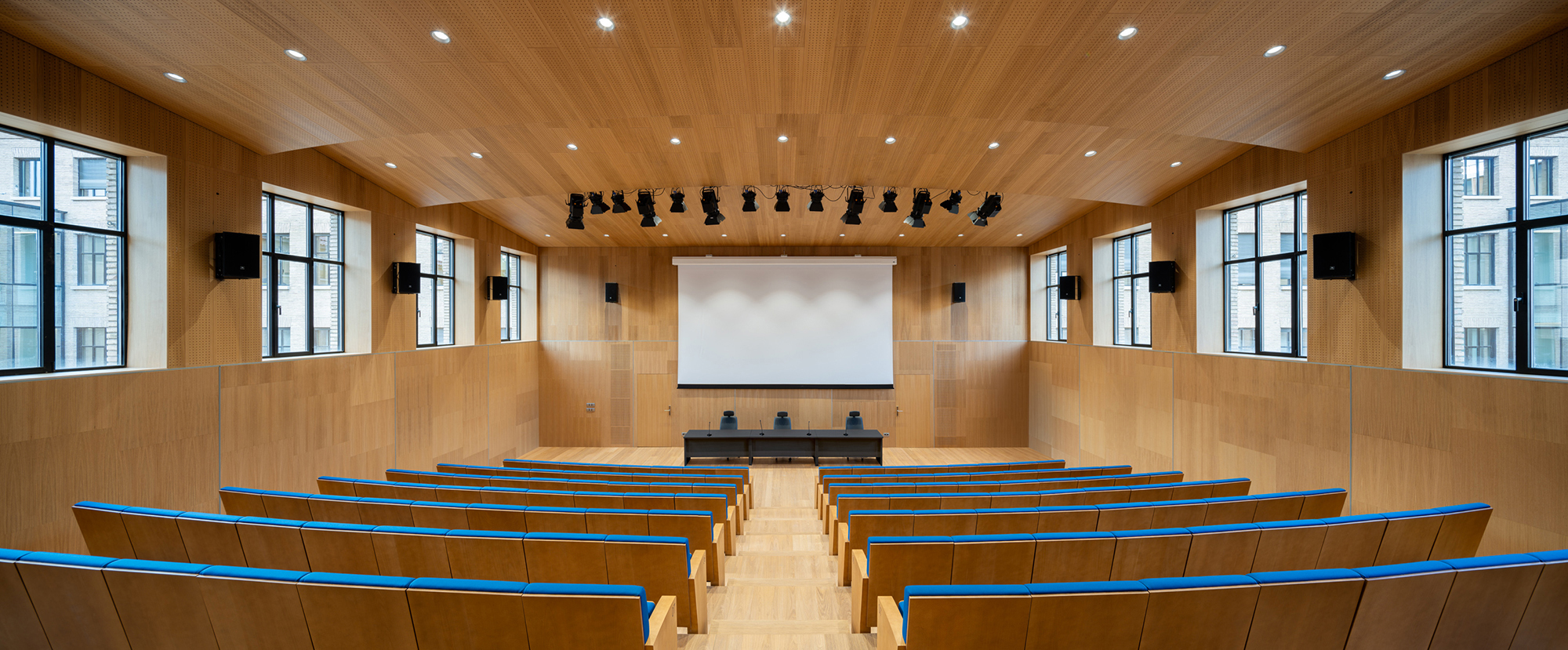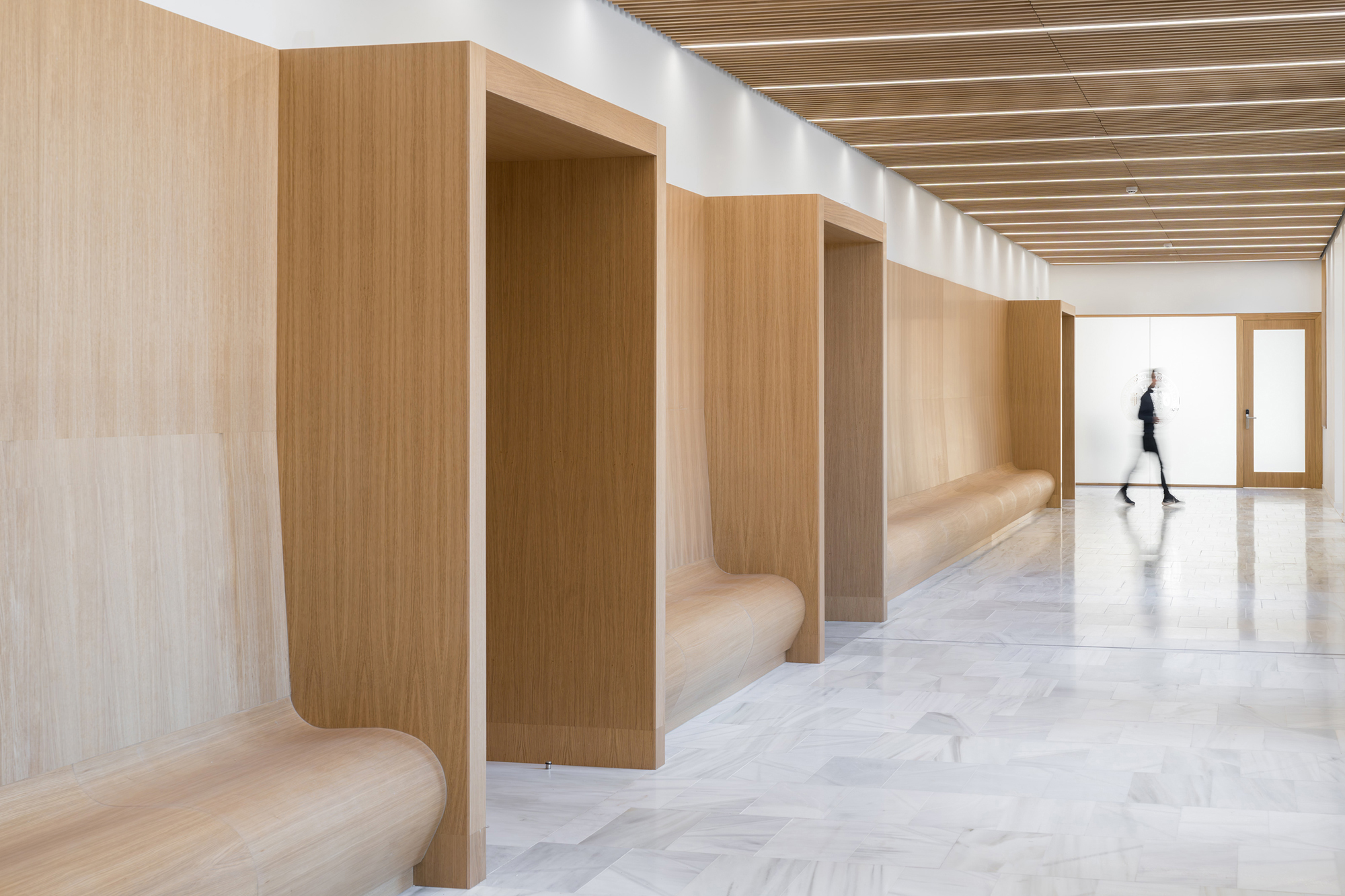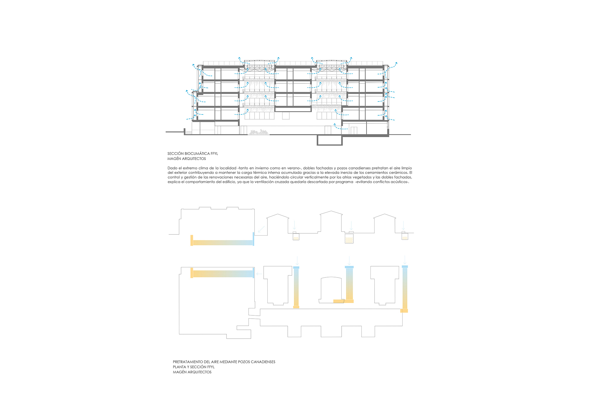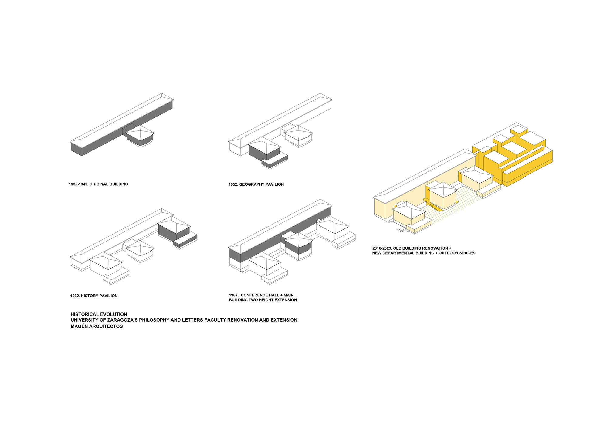 The principal objective was two-fold: the continuity of the old building, and maximum energy efficiency in pursuit of near-zero consumption. In the existing construction, the project highlighted the heritage elements, improved energy efficiency, and activated exterior courtyards. Modifications that had been made inside were eliminated in order to bring back the original floor-plan schemes, reinforce the structure and foundation, improve the properties of the cladding, restore the facades, and complete the redistribution of levels. In addition, procedures were carried out here and there to improve functionality, interconnection, and accessibility of the different parts. The most important operation was in the main foyer. The demolition of an interior piece attached to the Main Lecture Hall created a triple-height void, in which a new spiral sculpture was installed. This made it possible to open up the foyer towards the two rear courtyards. The long corridor got back its original section. A built-in continuous bench along the corridor provides settings for socializing between classes.