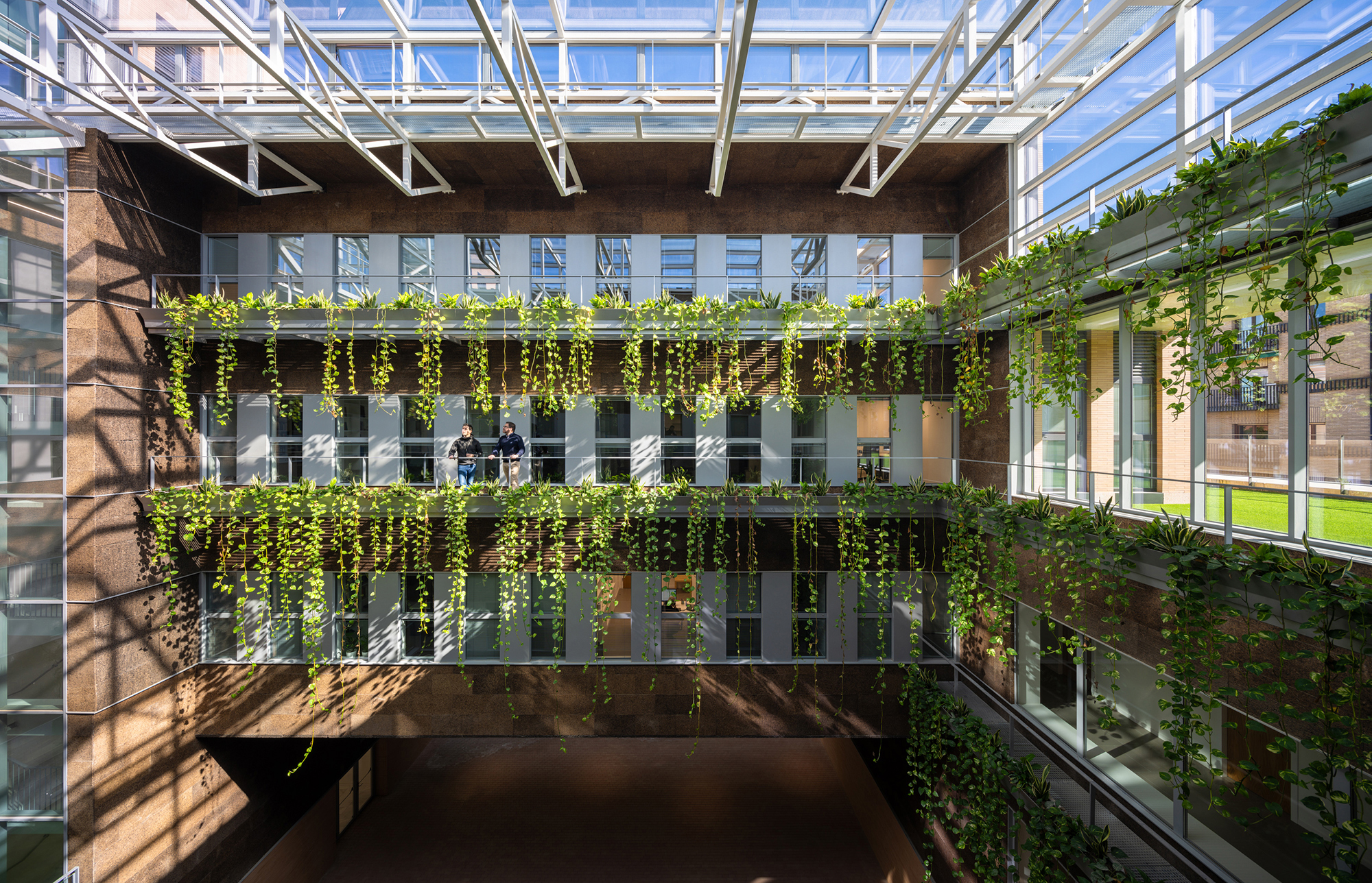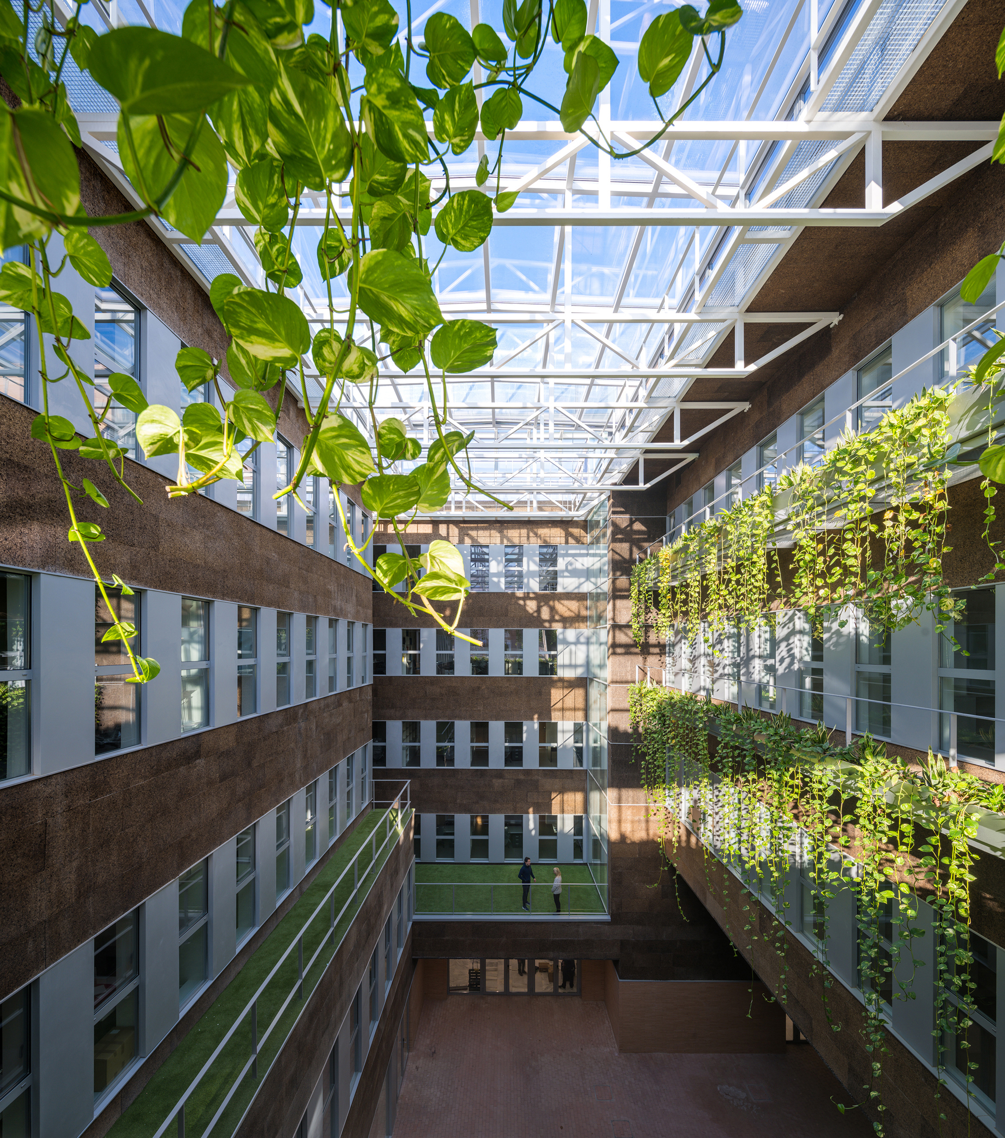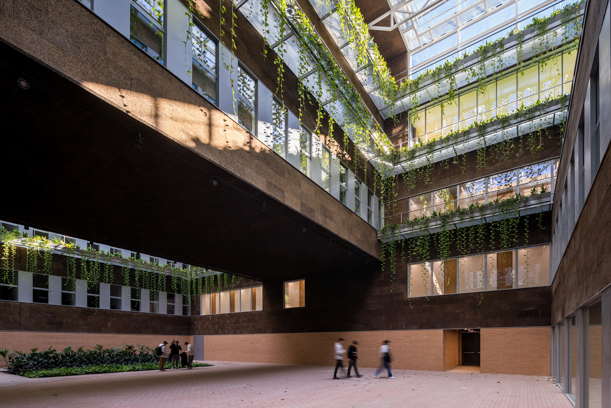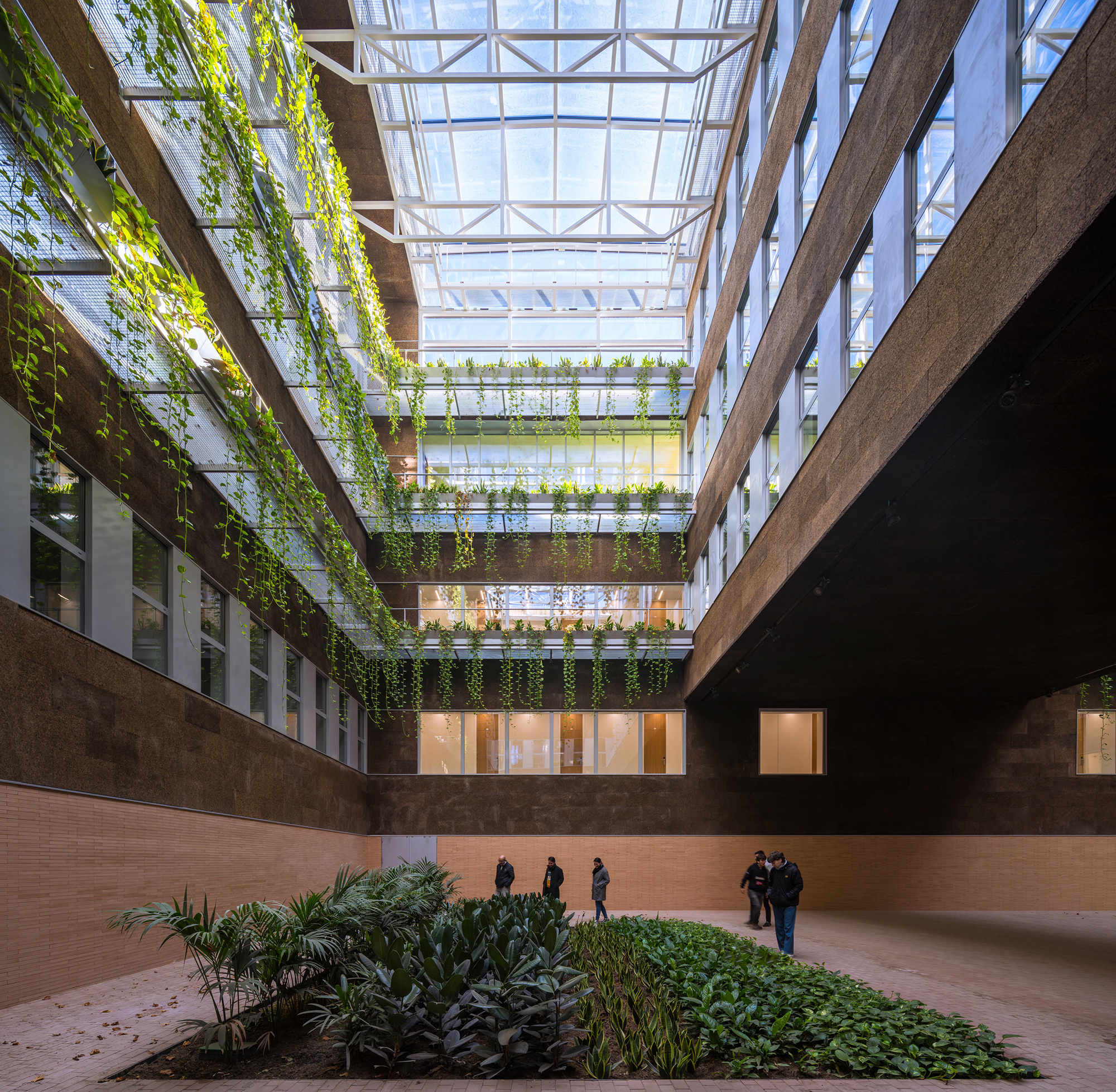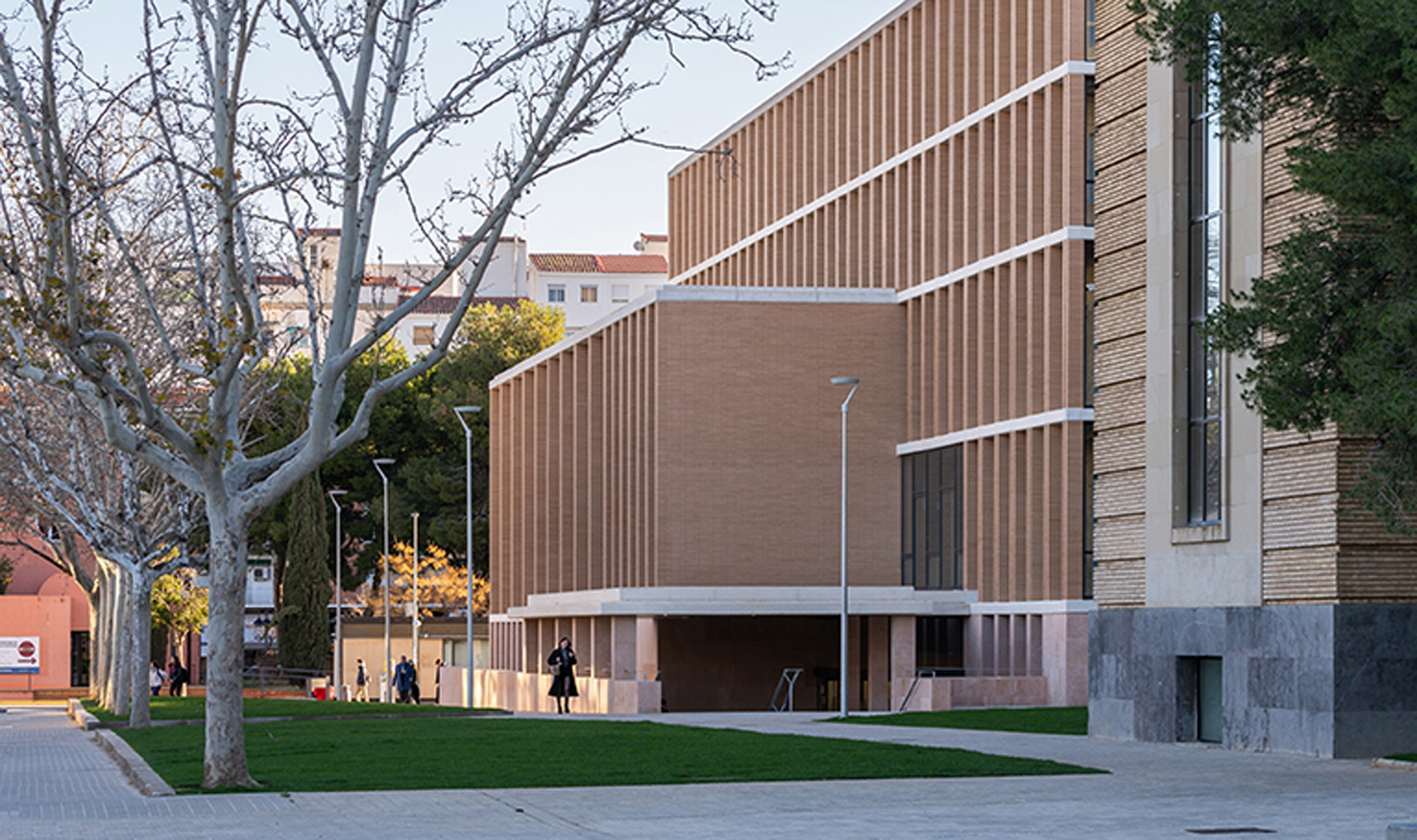 The new departmental annex prolonges the faculty northeastward, all the way to the portico that marks the main entrance into the campus. Its massing engages in dialogue with the heights around while maintaining continuity with the old building’s long figure. The streetward section gives rise to a terrace-lookout. The arrangement on plan, which varies from the ring shape of the lower levels to the comb organization of the upper ones, generates a covered plaza inside, pierced between skylights by the central body of offices. Light shining down from the glass roofs and plants hanging from the higher floors characterize this collective space. The facade is composed of a succession of brick pilasters between horizontal slabs of white concrete. The trabeated tectonics of the facades evokes the construction as a stacking of simple elements. The placing of the joineries behind the pilasters gives the facades the effect of thickness, depth, and shade. In the rooms, the walls are clad in cork panels, a visible thermal insulation.
