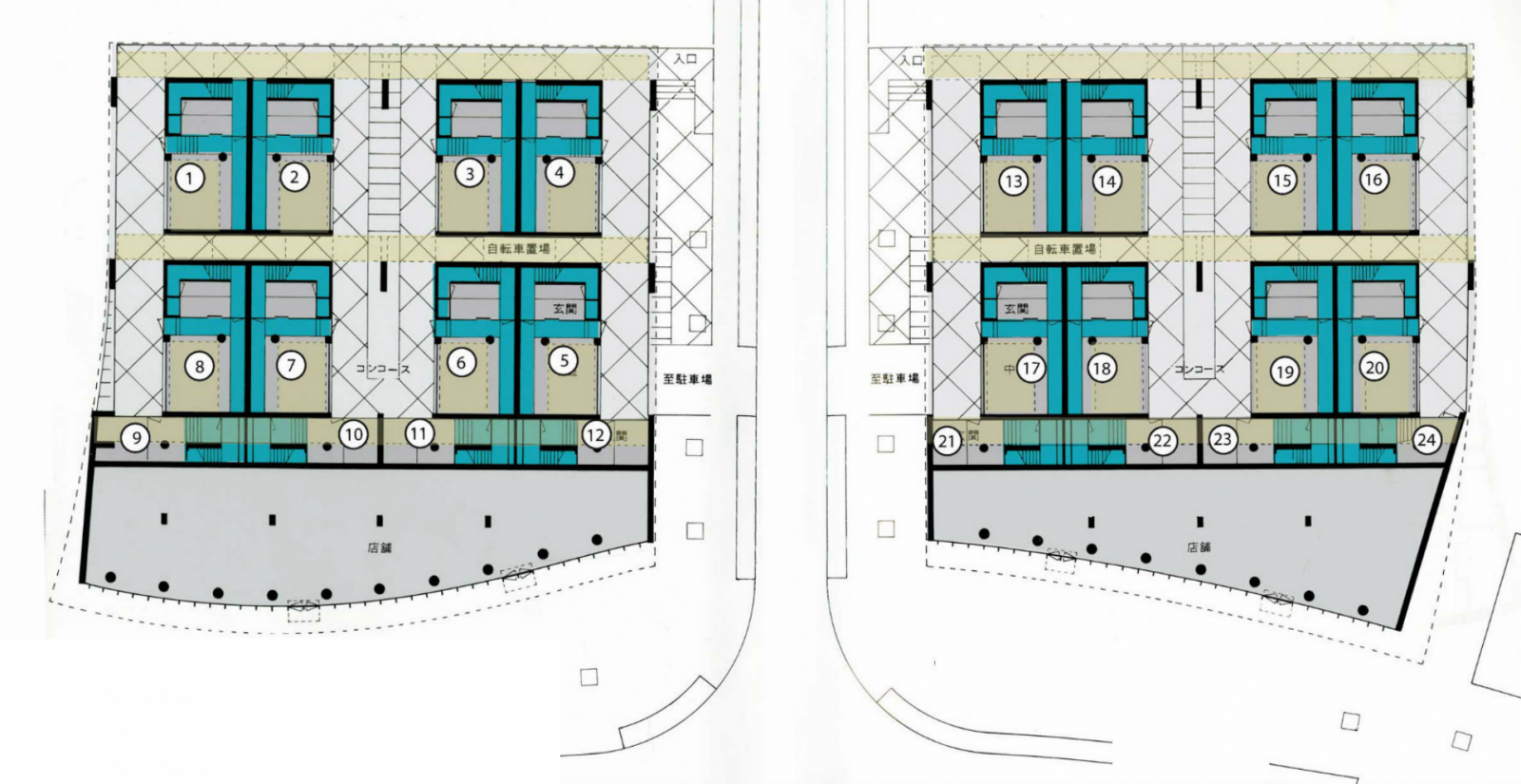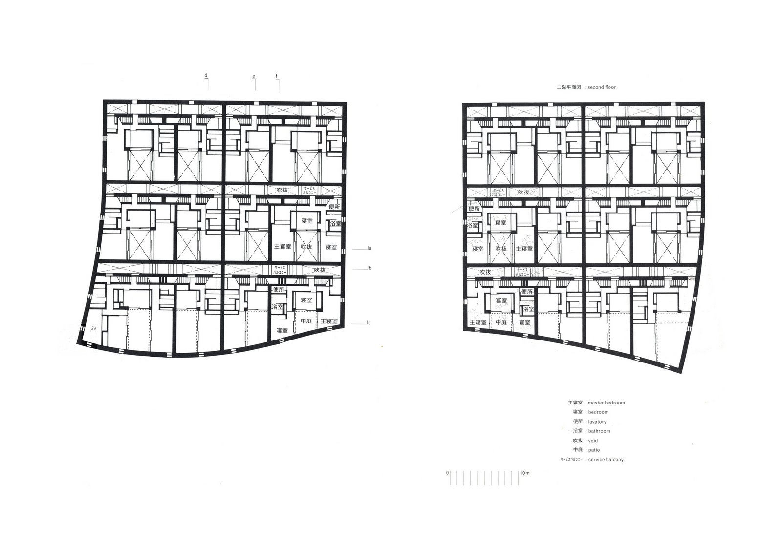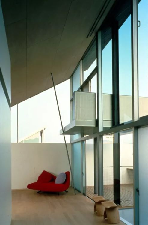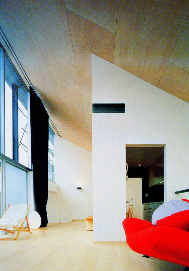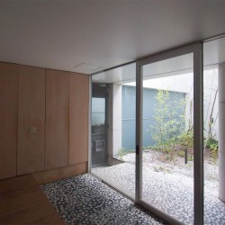 On the lower level a concourse leads to individual front doors; beyond each door lies a patio with white pebbles. A continuous staircase leads to individual rooms on the second floor and living quarters on the third – a suite of living, dining, open-air, and ‘Japanese’ rooms where screens and curtains generate different configurations.