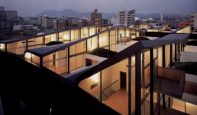 This project consists of 24 individual houses in the Kashi District of Fukuoka, each three stories high, packed together to form two blocks. Each house is penetrated by a private vertical courtyard that introduces light and space into the center.
