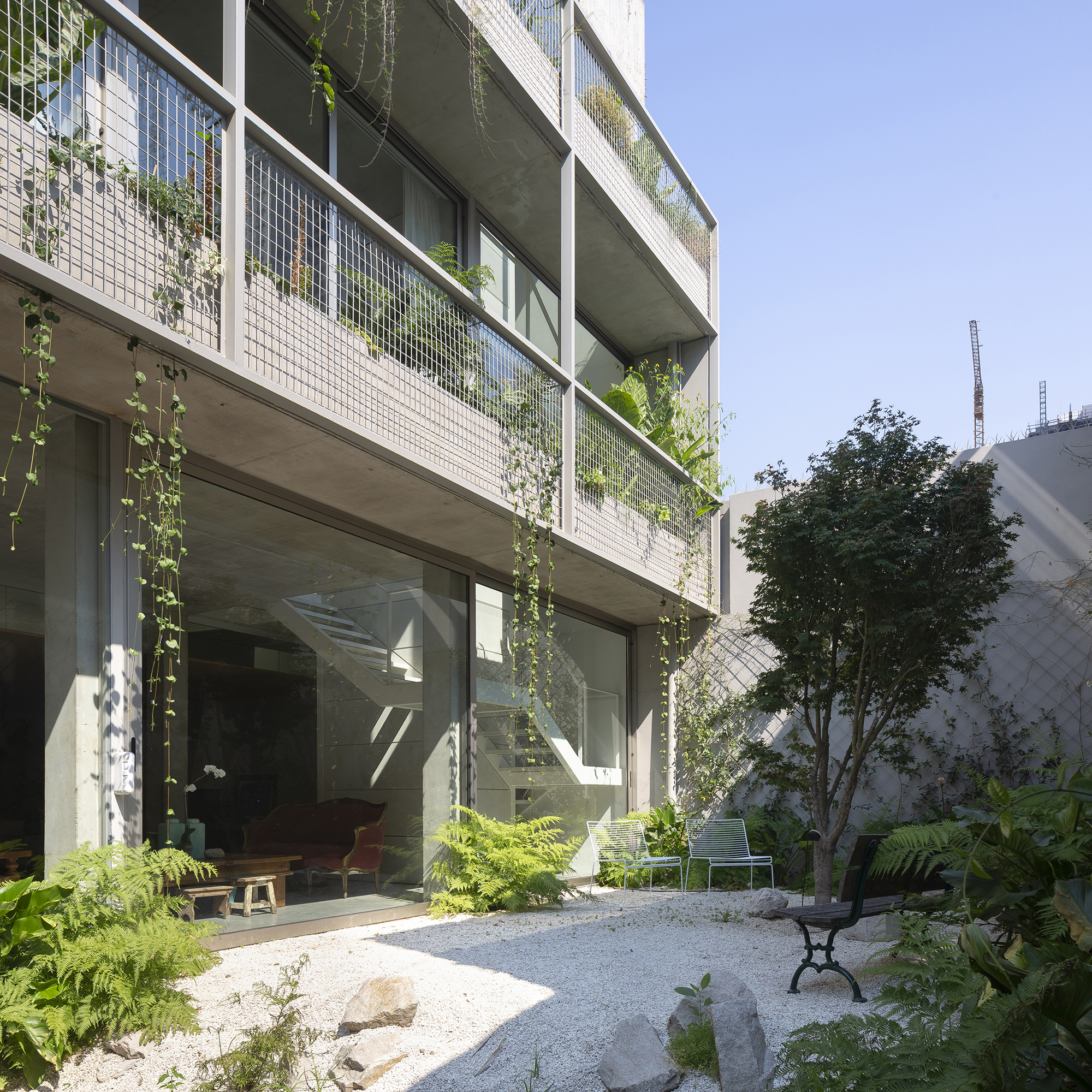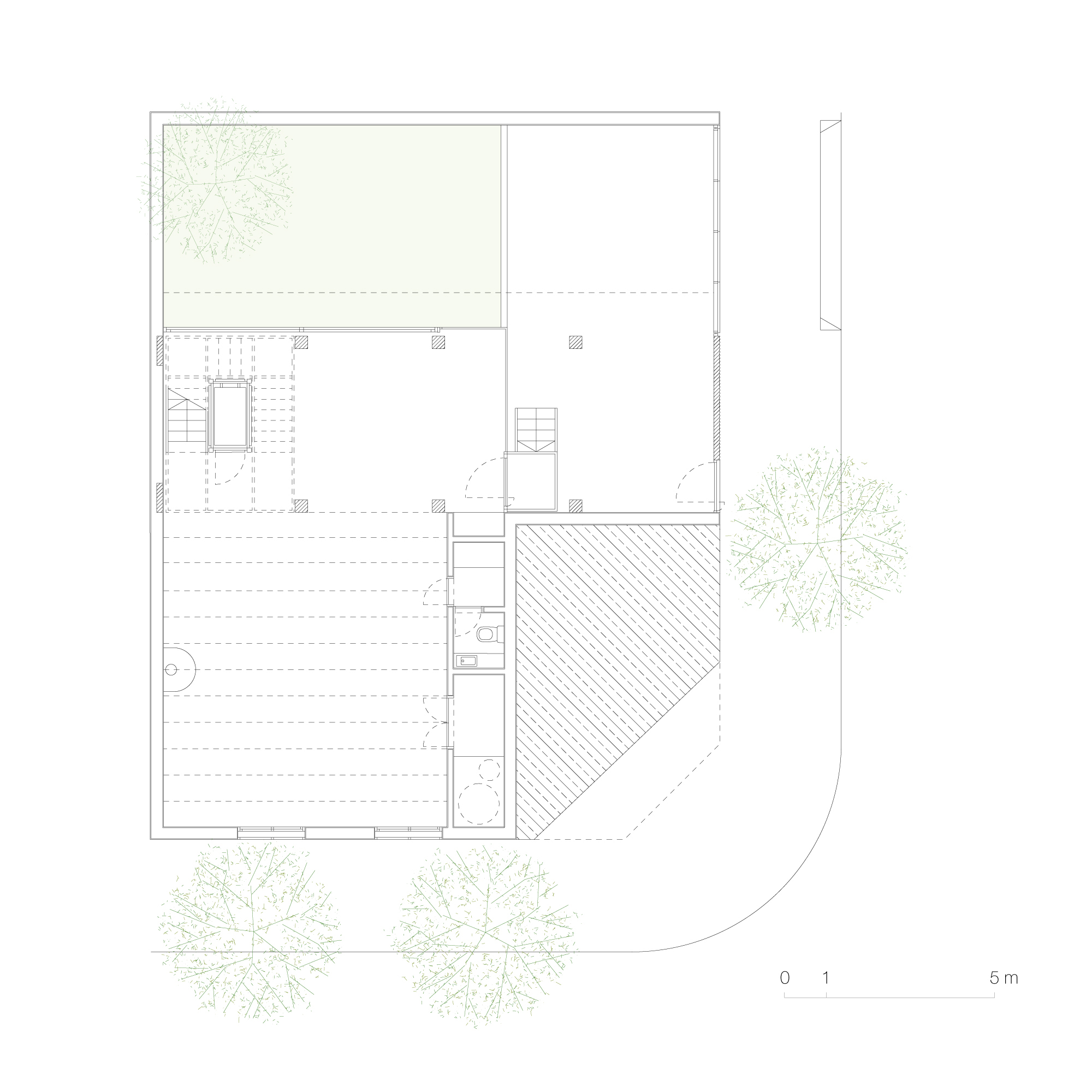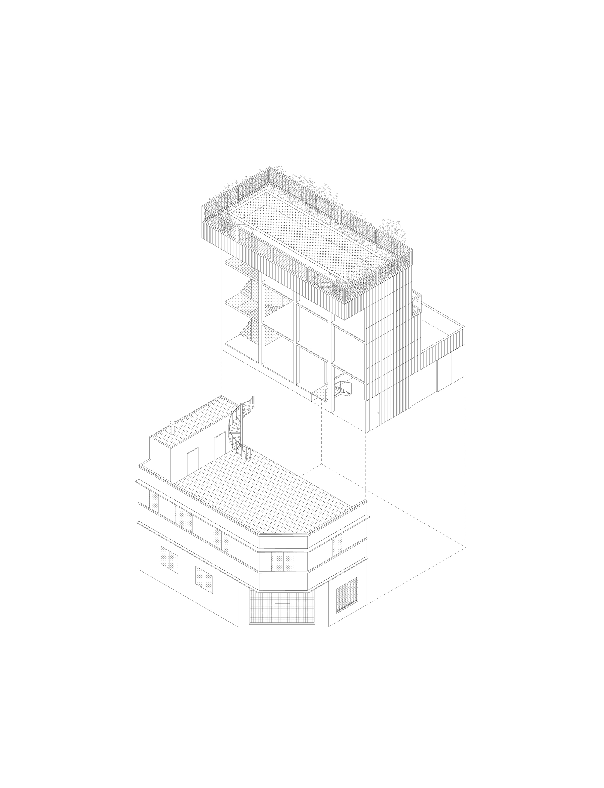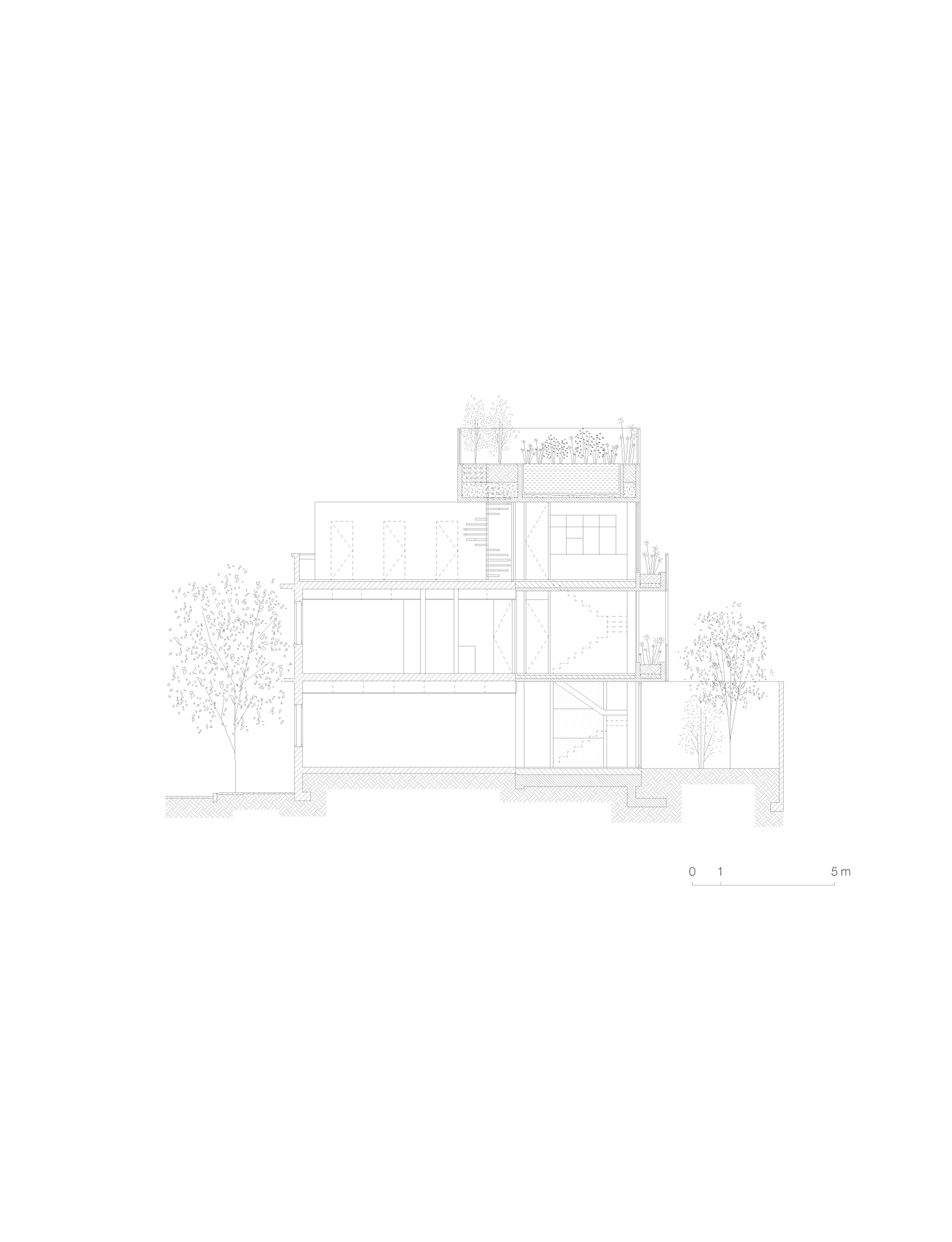 An old house from the early 20th century finds its second life by expanding into the neighboring lot. There a vertical pavilion leans against the old dividing wall, releasing half of the land to a new garden that is linked with the front retreats of the neighboring houses.