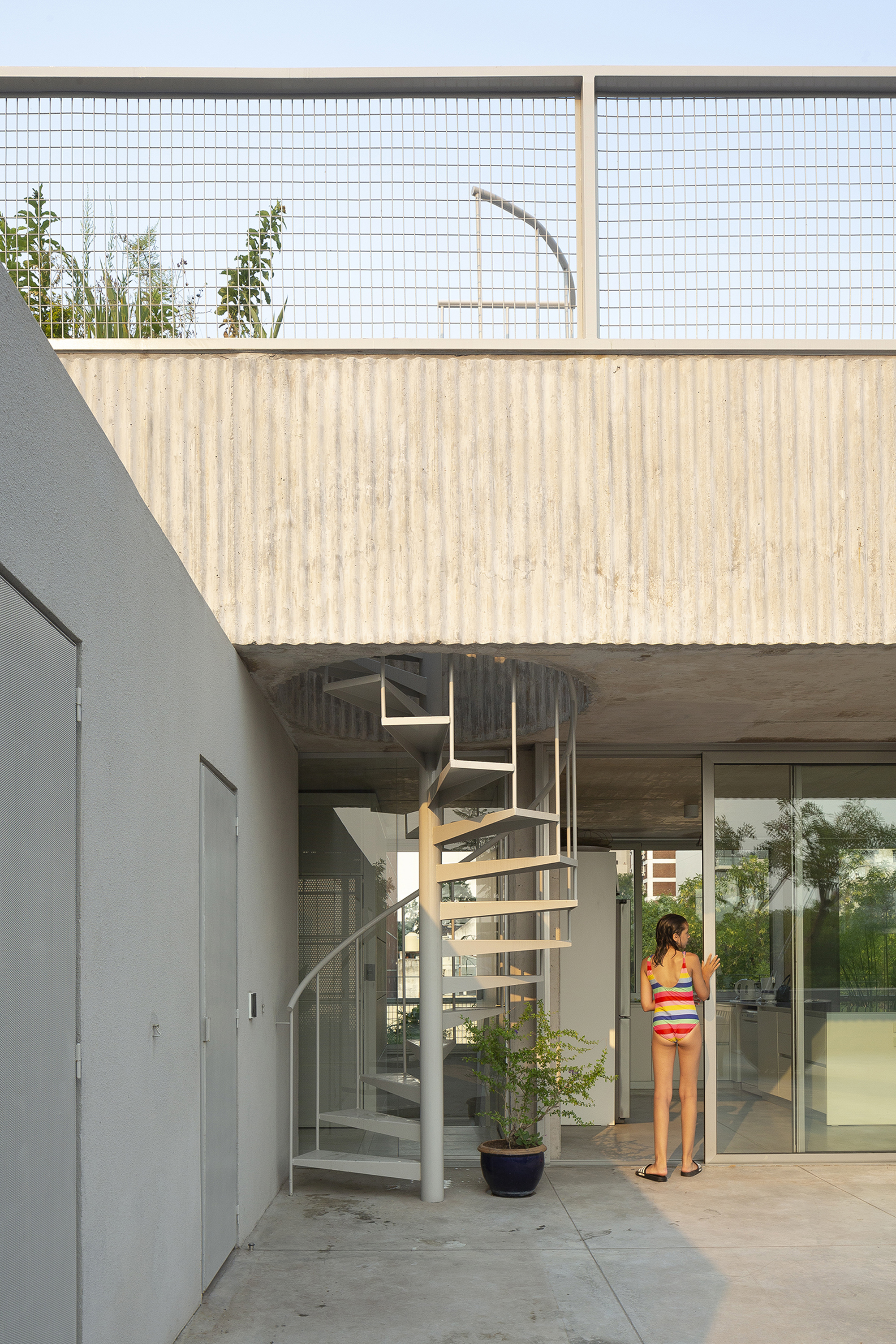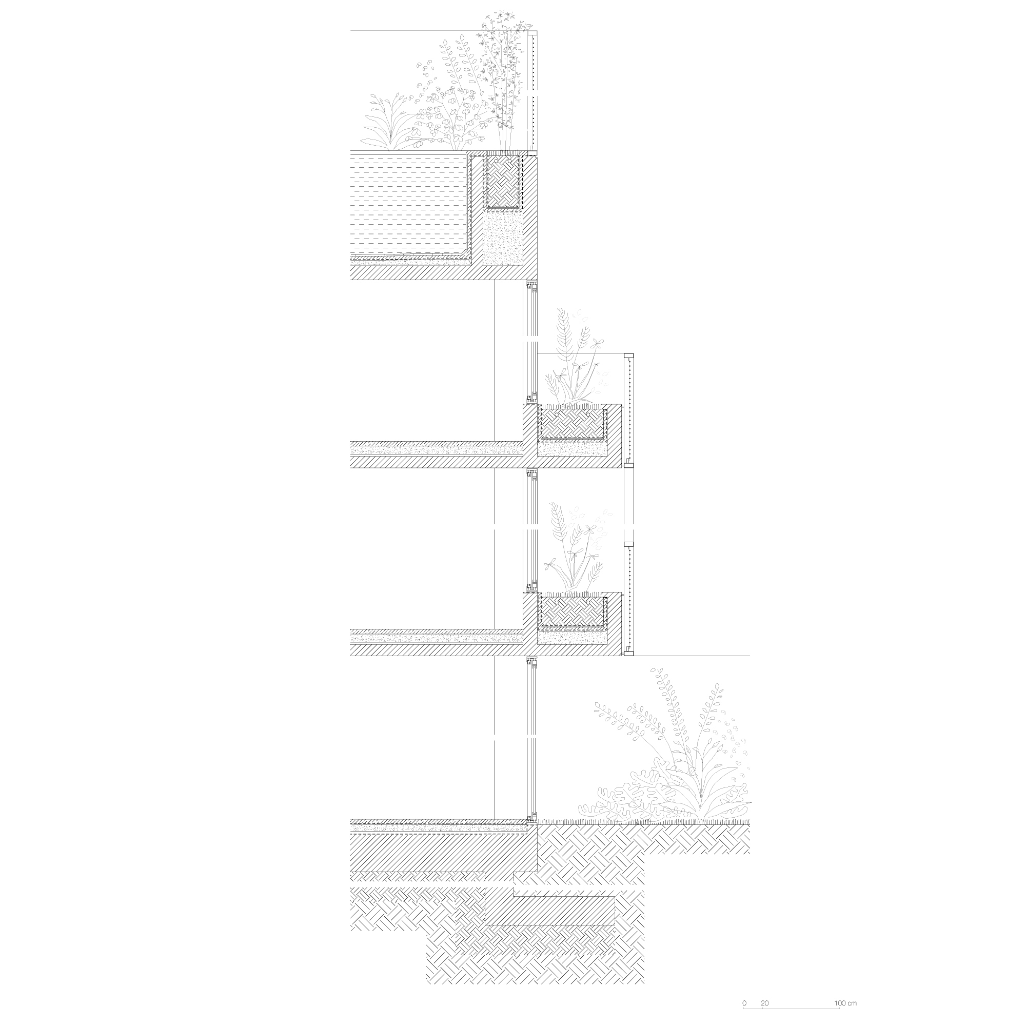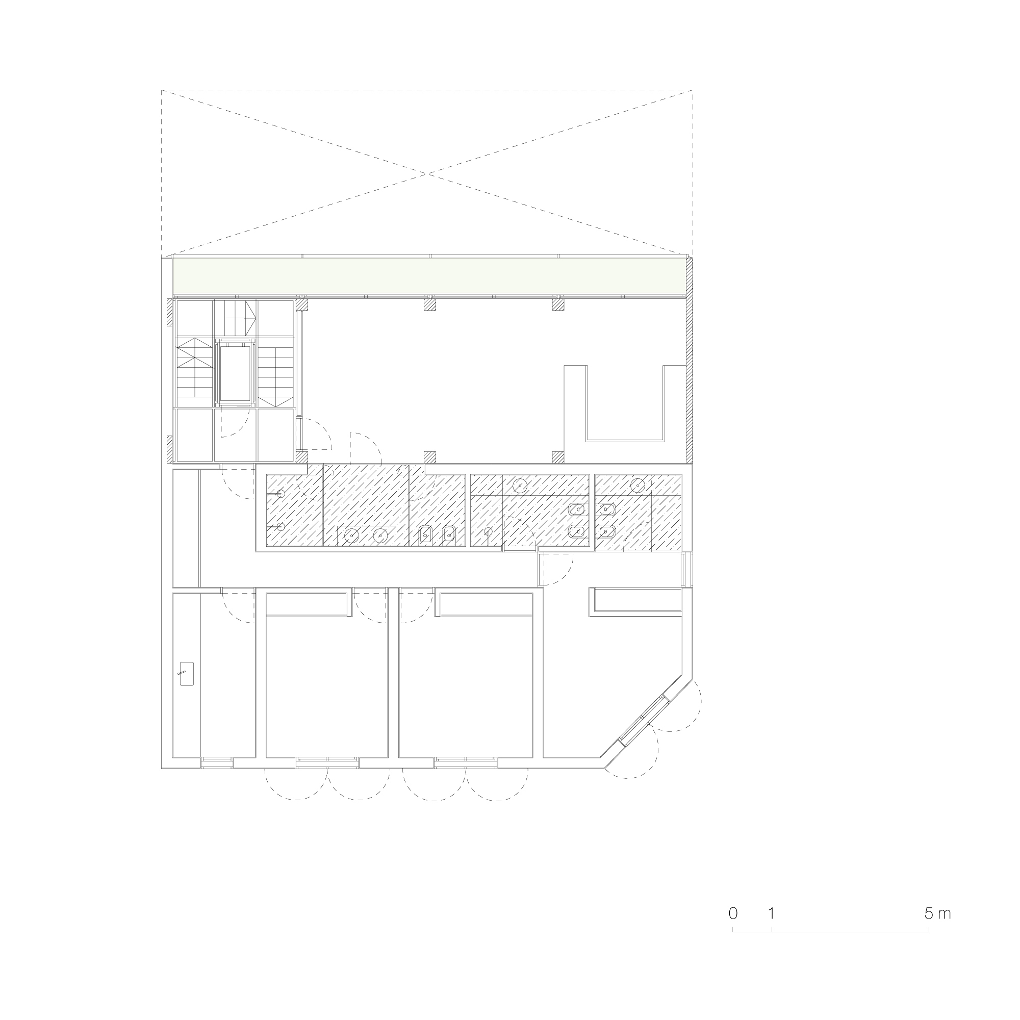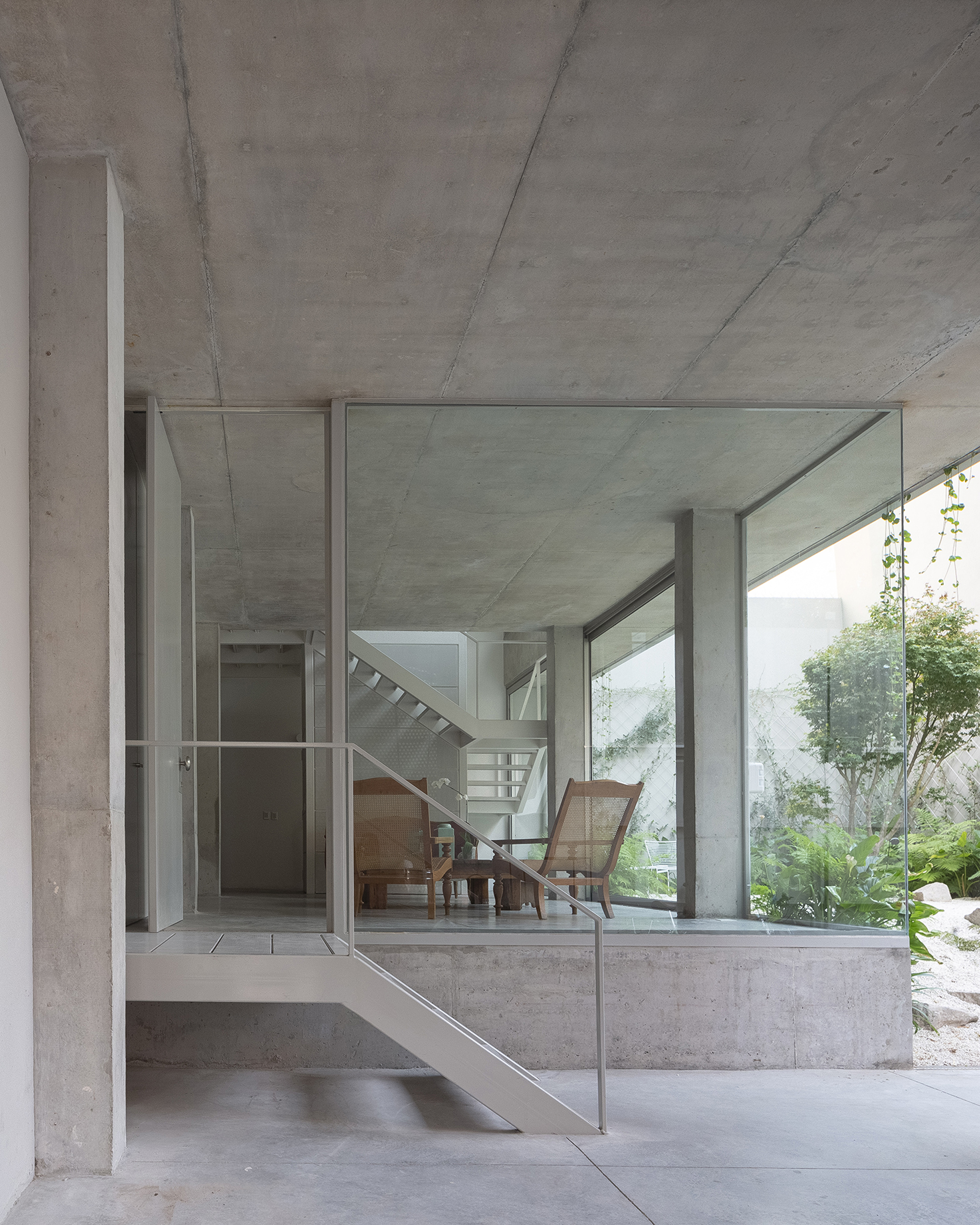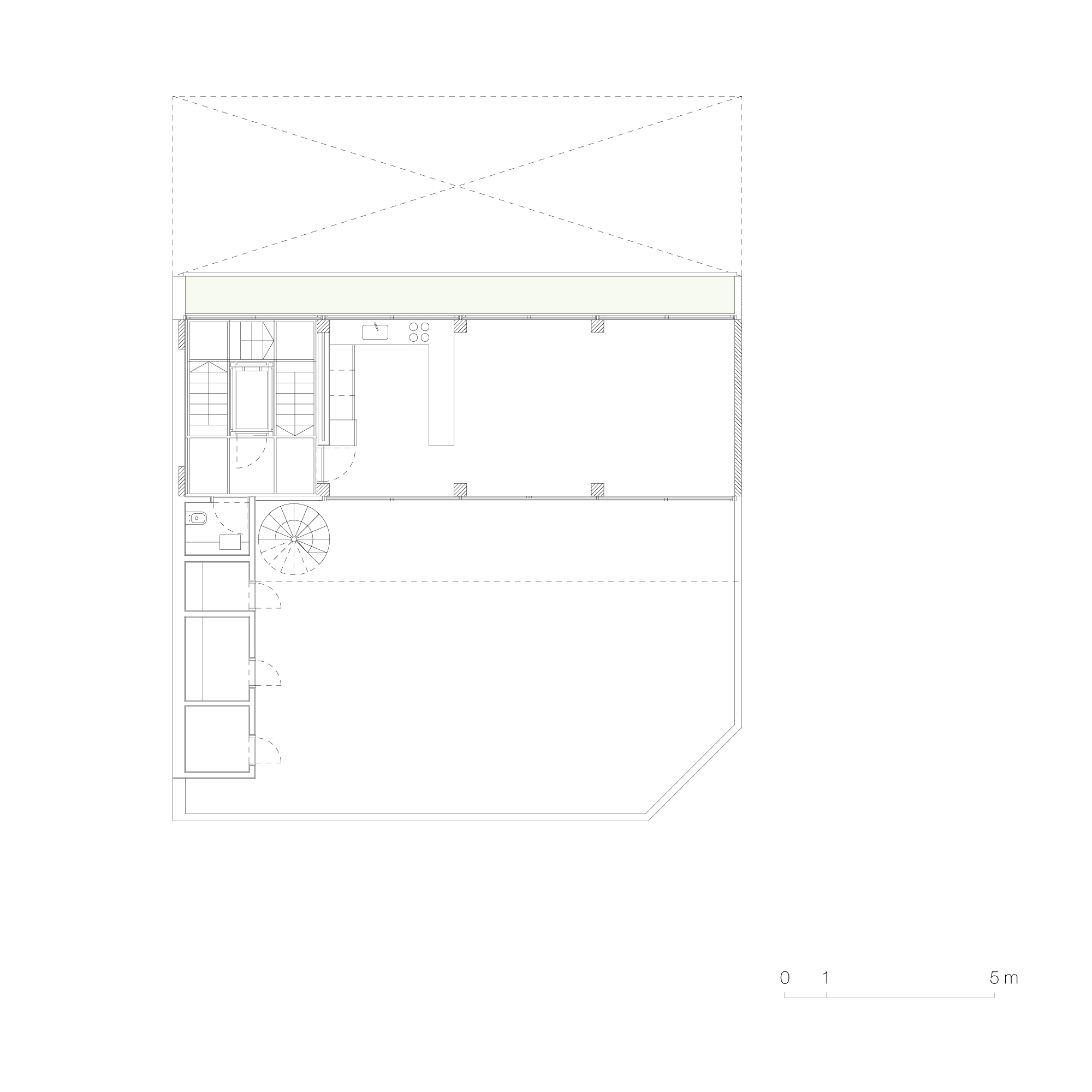 An old house from the early 20th century finds its second life by expanding into the neighboring lot. There a vertical pavilion leans against the old dividing wall, releasing half of the land to a new garden that is linked with the front retreats of the neighboring houses.