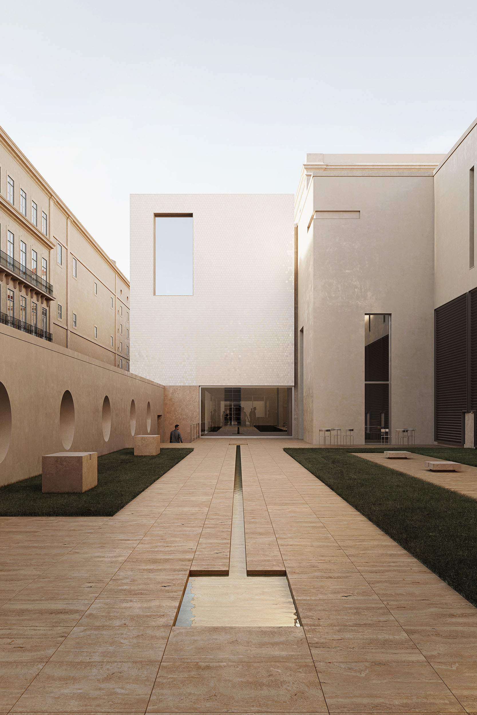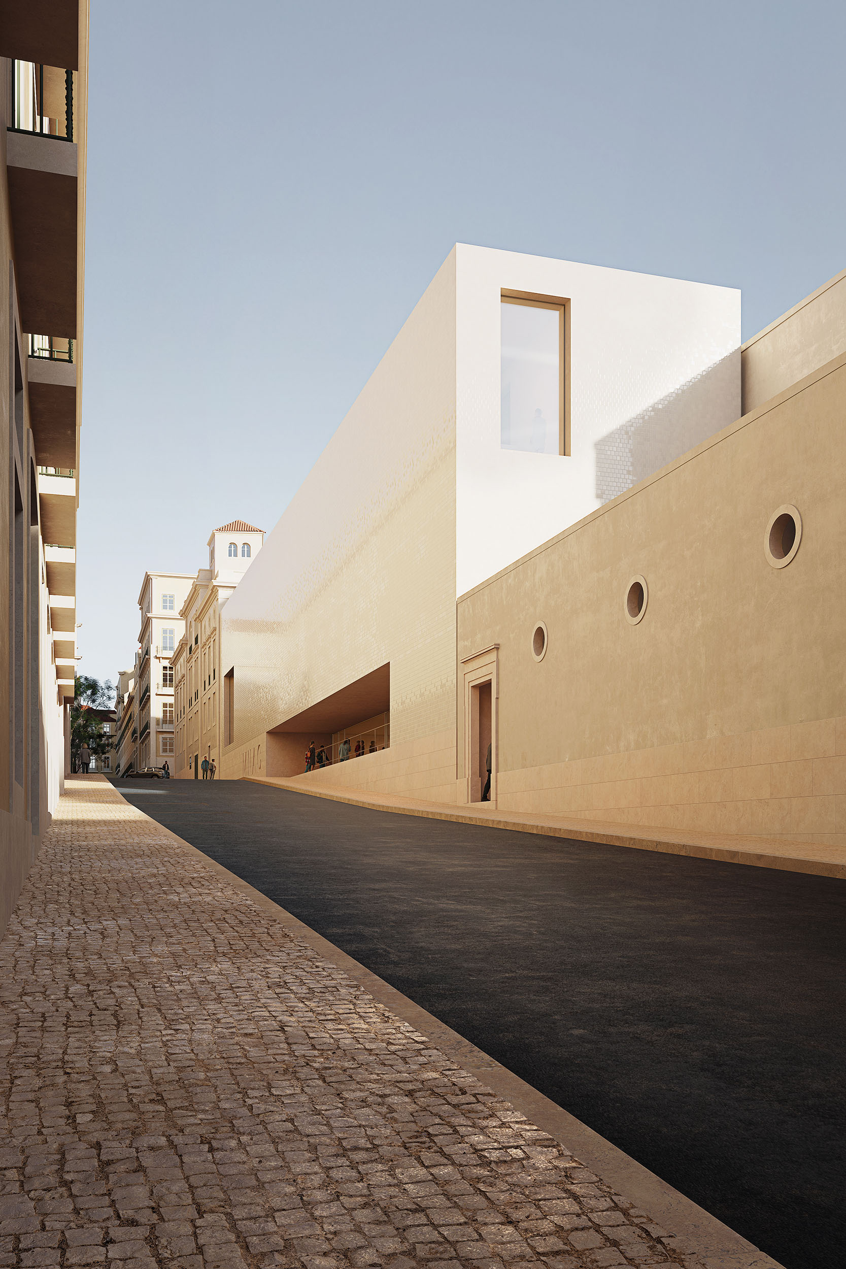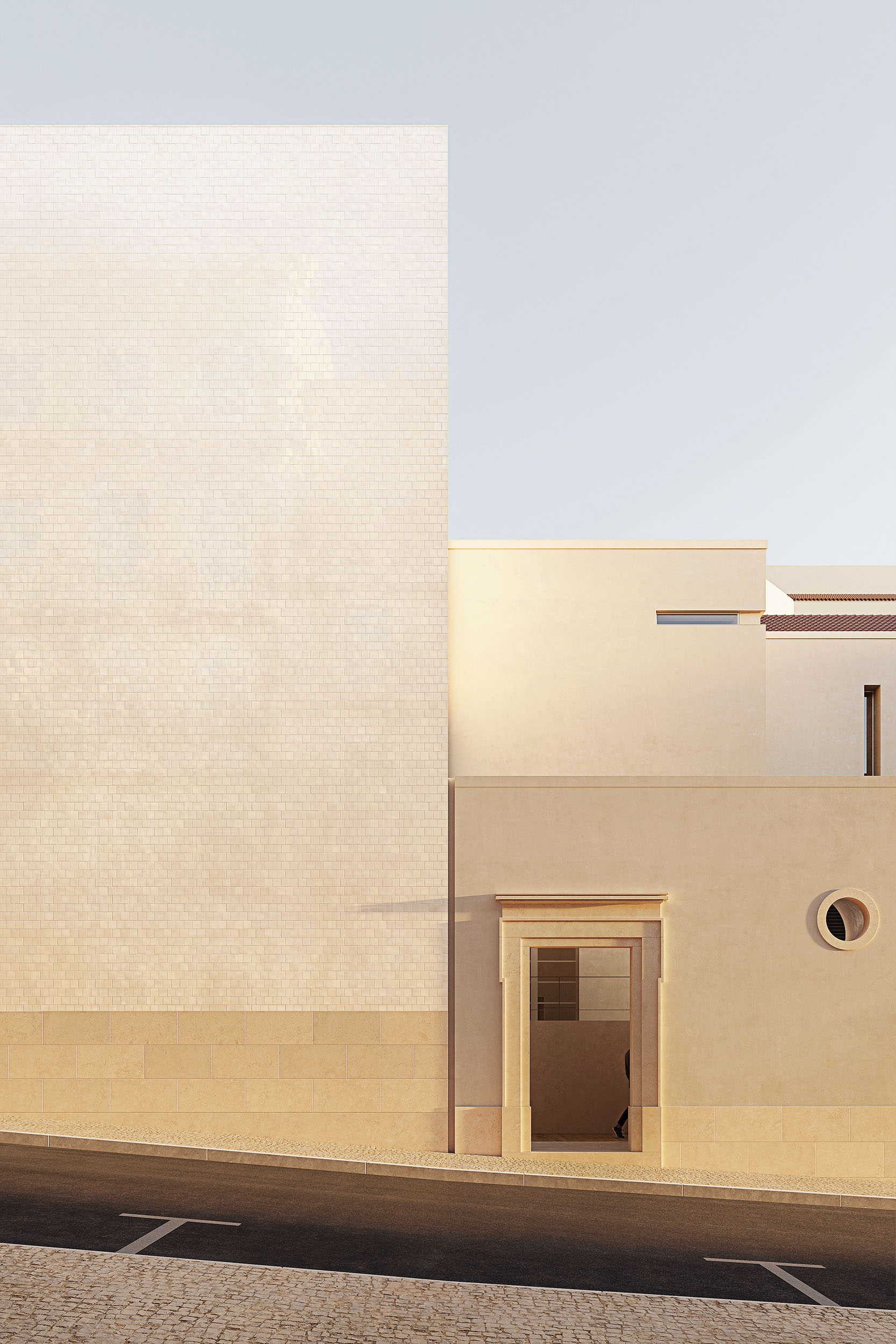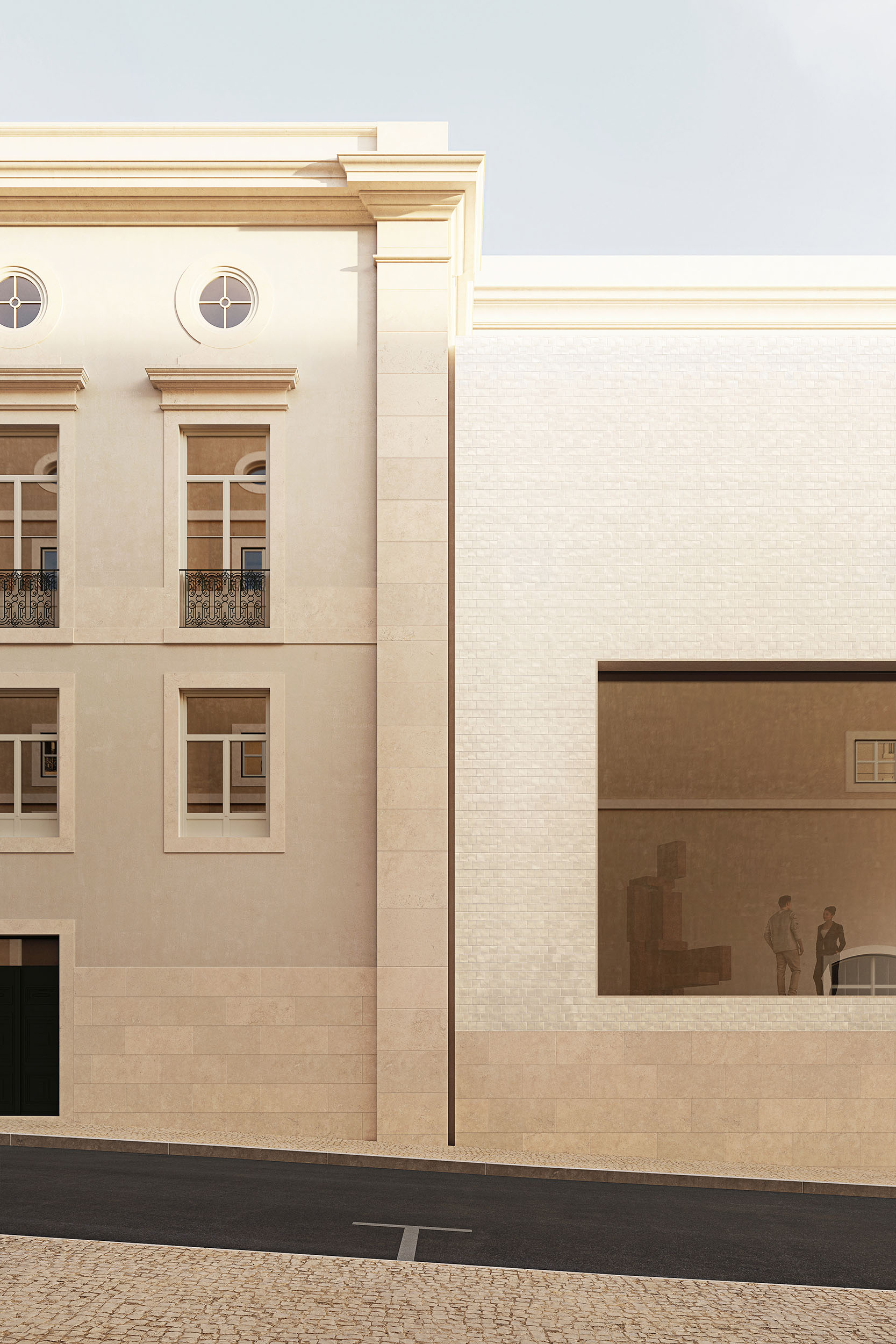 The structure of the new volume acts as a mediator between the historic buildings, connecting exhibition spaces and circulation areas and enhancing the visitor experience. The base of the building is clad in lioz stone, an iconic material in Lisbon, which lends it a respectful presence rooted in tradition. In the upper levels, rustic ceramic mosaic introduces a modern texture that enriches the building’s visual profile. This material approach reflects a harmony between past and present, allowing the building to be perceived as a natural extension of the Chiado district.