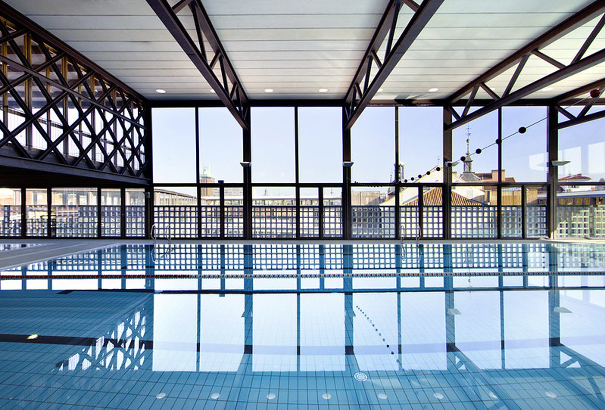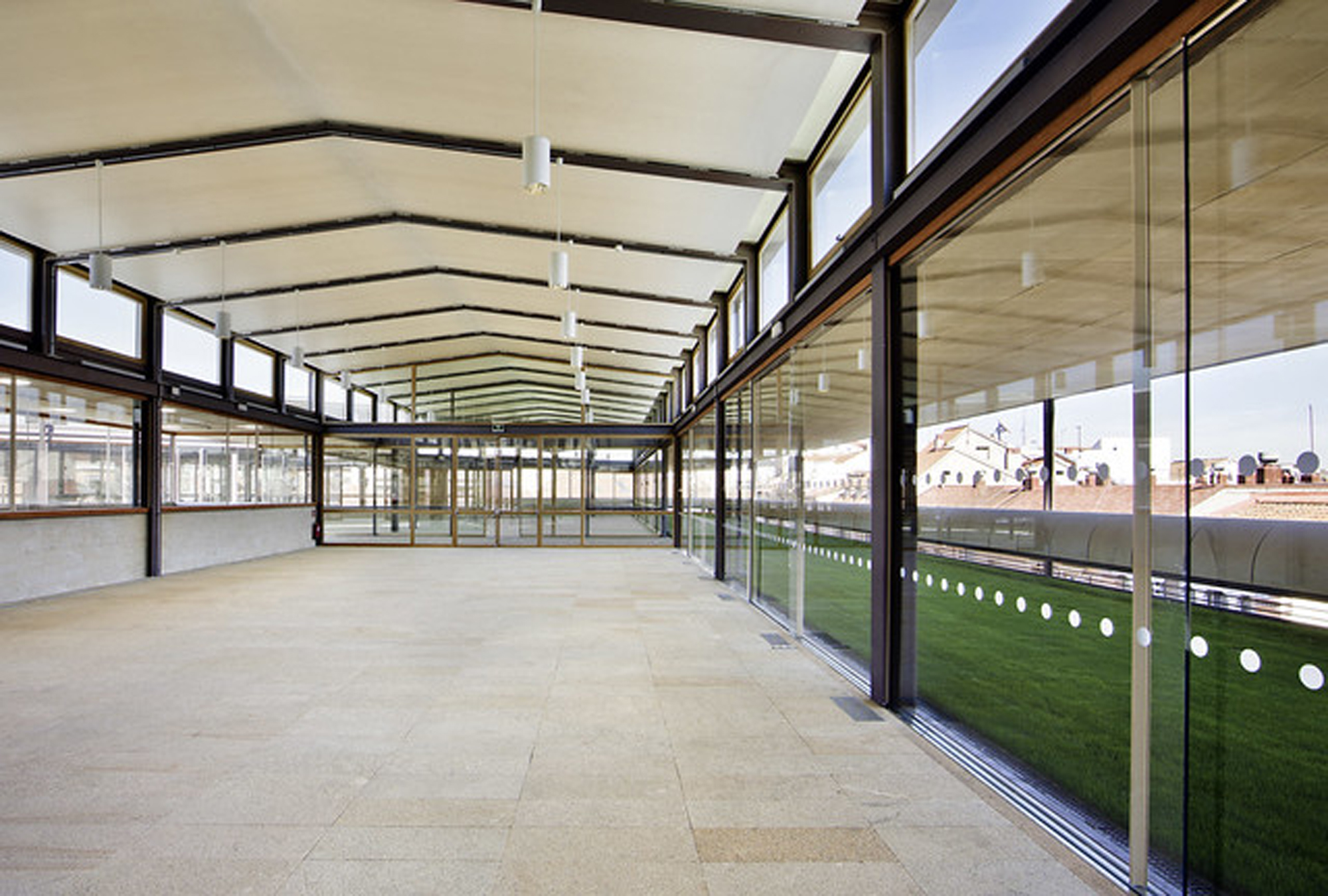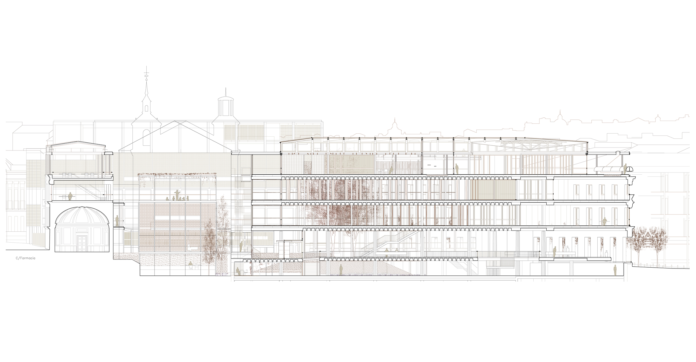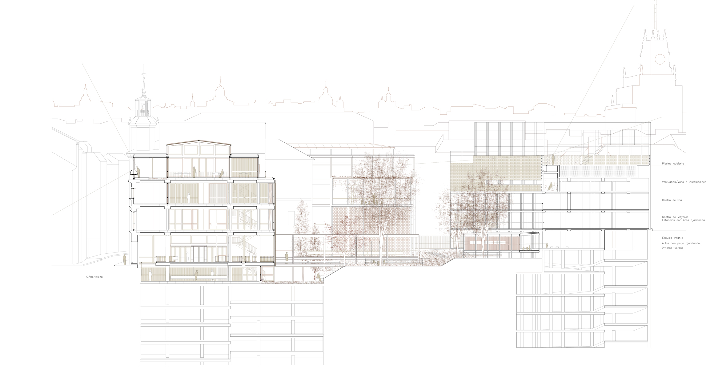 The demolition of buildings that were considered little valuable was necessary to create a tree-lined garden in the central space of the manzana, this being the key decision that articulates the entire ensemble. In this way, the garden constitutes a quiet place in the middle of the city center and has its calm that allows the complex’s work spaces to be accessed, through very permeable facades made up of a double layer of extra-clear glass. Open in the garden, the program of the new headquarters of COAM is organized in such a way that the cultural areas, whose character is more public, are available between the access floors, while the workshop zones are organized in the upper floors. On the other hand, the music school, which is located next to the church, occupies the most sheltered wing of the building, and is organized around the space at double height of the old sacristy. The rest of the municipal equipment is organized on a floor topped with swimming pools, located on the upper floor and designed as unique viewpoints over the city.