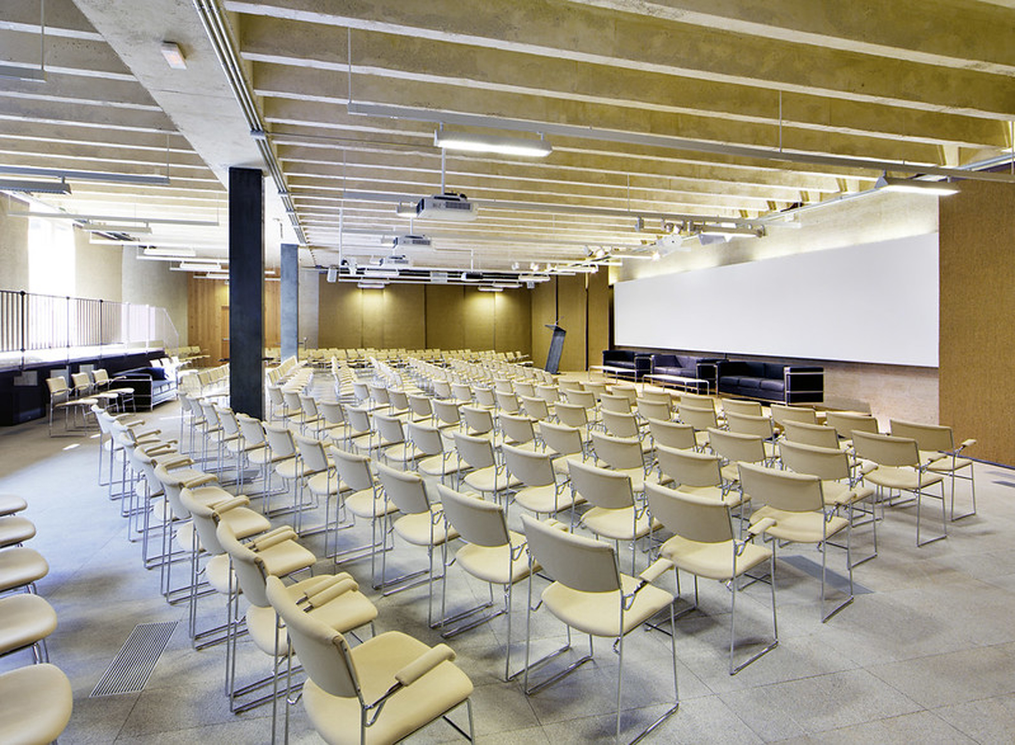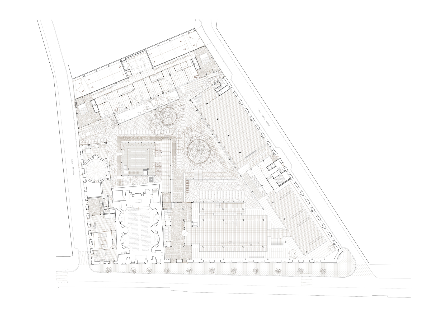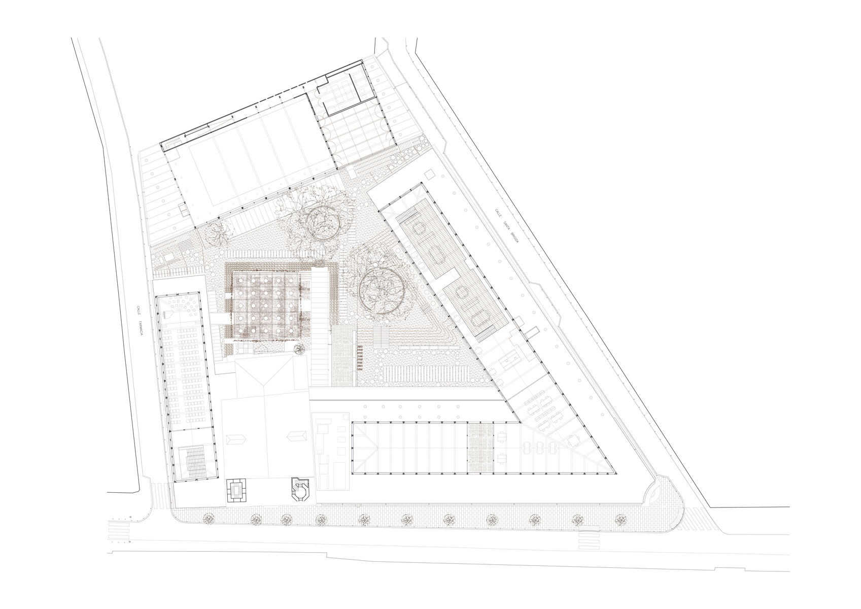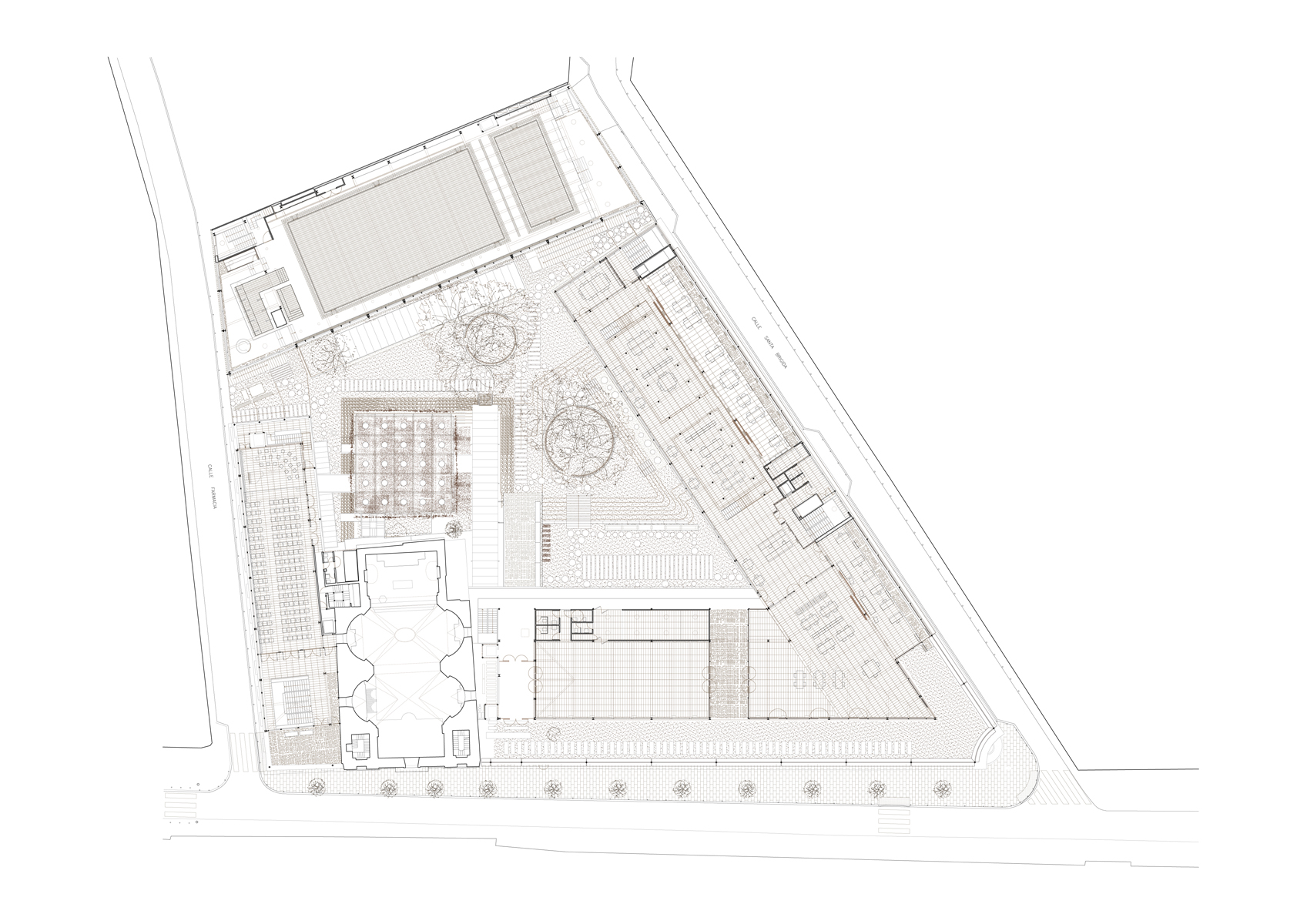 The demolition of buildings that were considered little valuable was necessary to create a tree-lined garden in the central space of the manzana, this being the key decision that articulates the entire ensemble. In this way, the garden constitutes a quiet place in the middle of the city center and has its calm that allows the complex’s work spaces to be accessed, through very permeable facades made up of a double layer of extra-clear glass. Open in the garden, the program of the new headquarters of COAM is organized in such a way that the cultural areas, whose character is more public, are available between the access floors, while the workshop zones are organized in the upper floors. On the other hand, the music school, which is located next to the church, occupies the most sheltered wing of the building, and is organized around the space at double height of the old sacristy. The rest of the municipal equipment is organized on a floor topped with swimming pools, located on the upper floor and designed as unique viewpoints over the city.