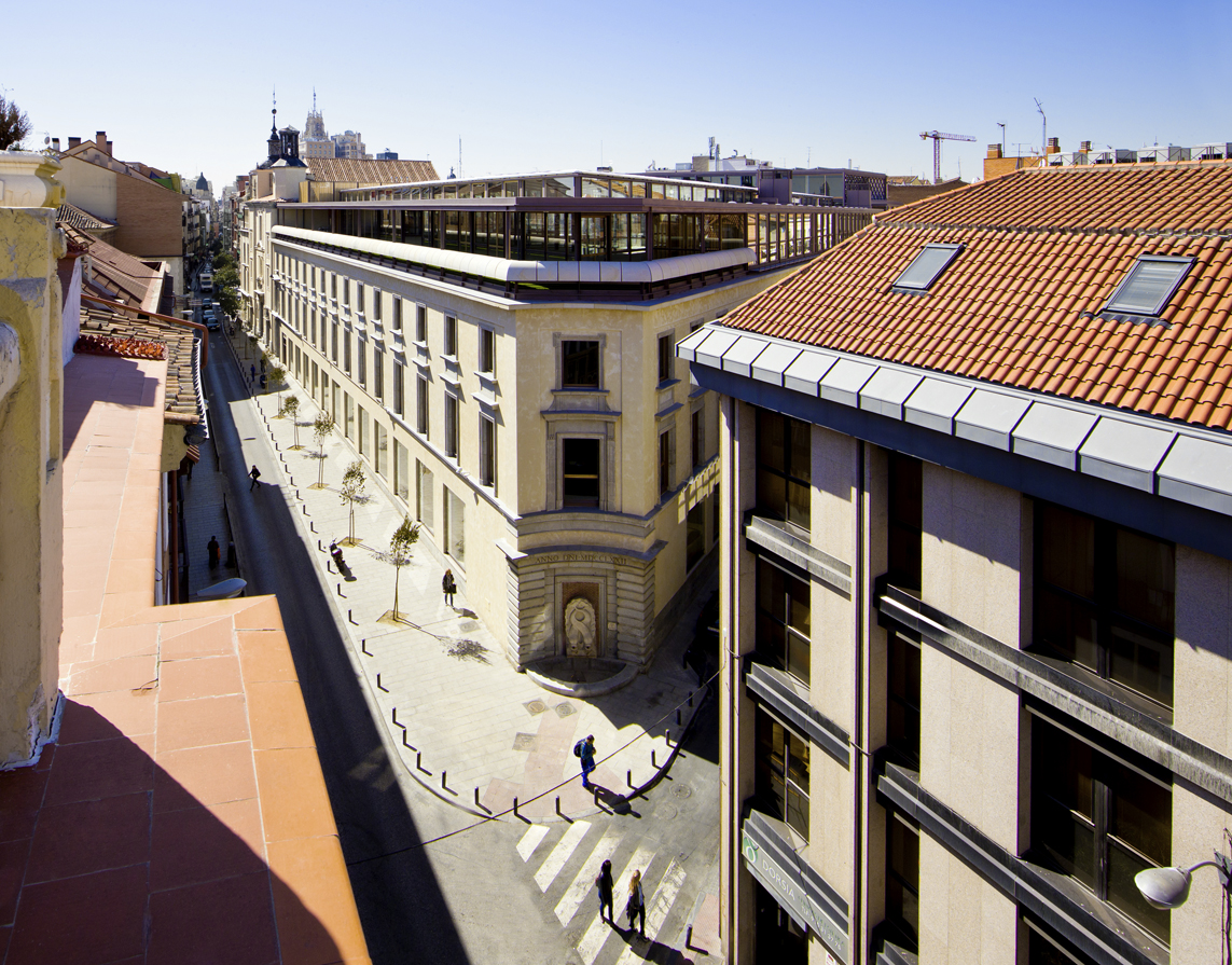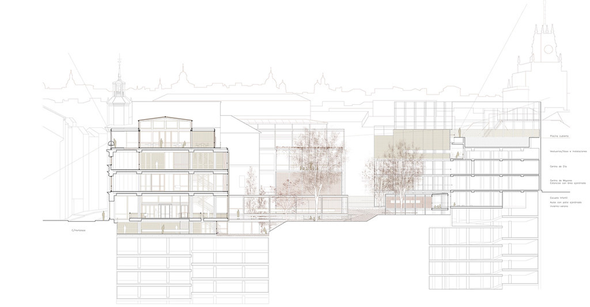 Driven by the Madrid City Council together with the Official College of Architects of Madrid, in 2005 an ideas competition was launched to move the headquarters of the second, with the result that this proposal was successful. The chosen place was a large mansion on Calle Hortaleza, which had been the Escuelas Pías de San Antón, a disused and abandoned building that contained a baroque church of Pedro de Ribera that also needed to be rehabilitated. The competition program was not limited to offering a new headquarters to Madrid collegiates, as the old town on Calle Barquillo seemed insufficient in the midst of the real estate bonanza, but it was also asked to build a series of municipal grants to serve a downtown area of the city that lacked these services. Thus, in addition to a music school, the construction of a children’s school, a mayor’s center and a public swimming pool were also planned.
