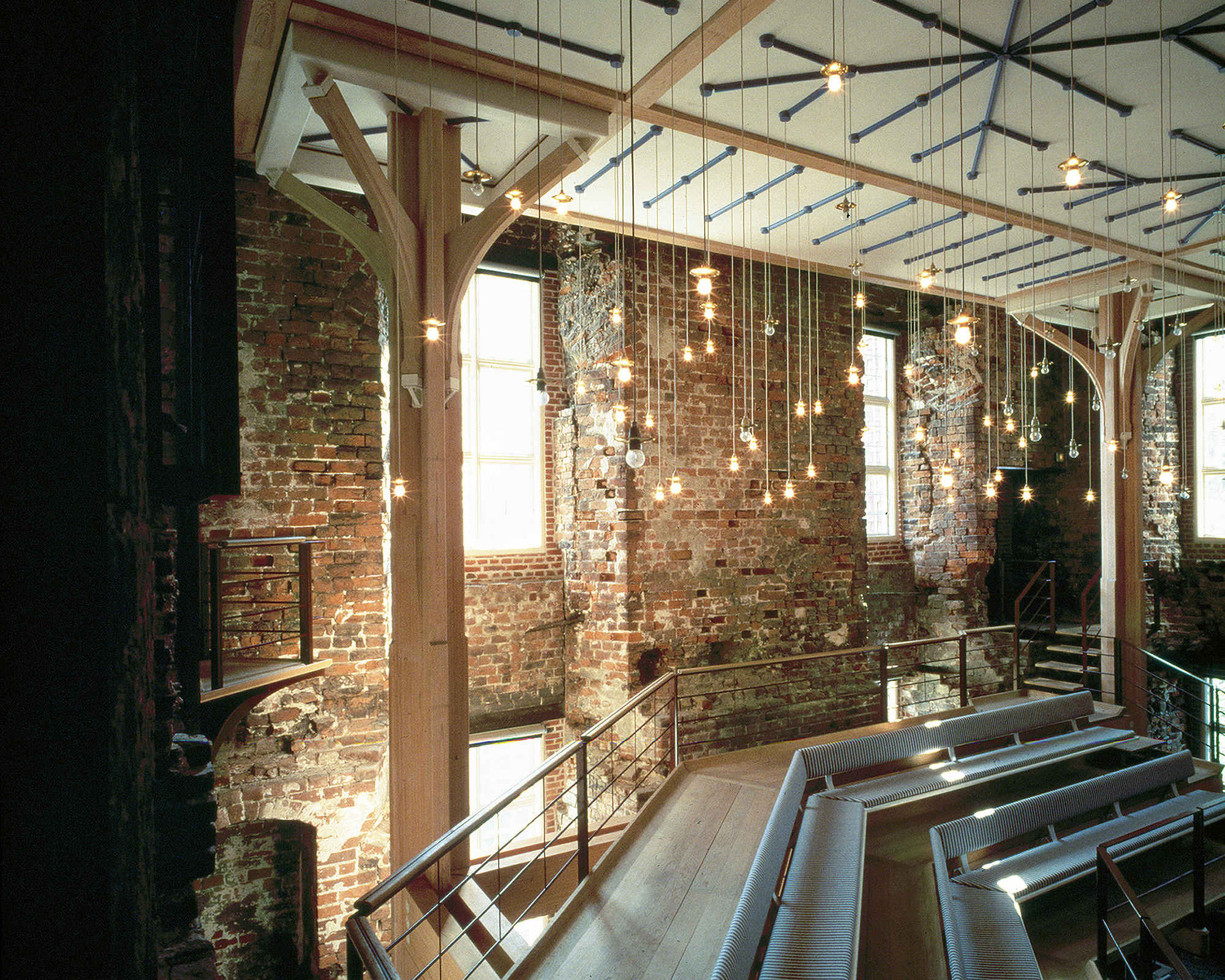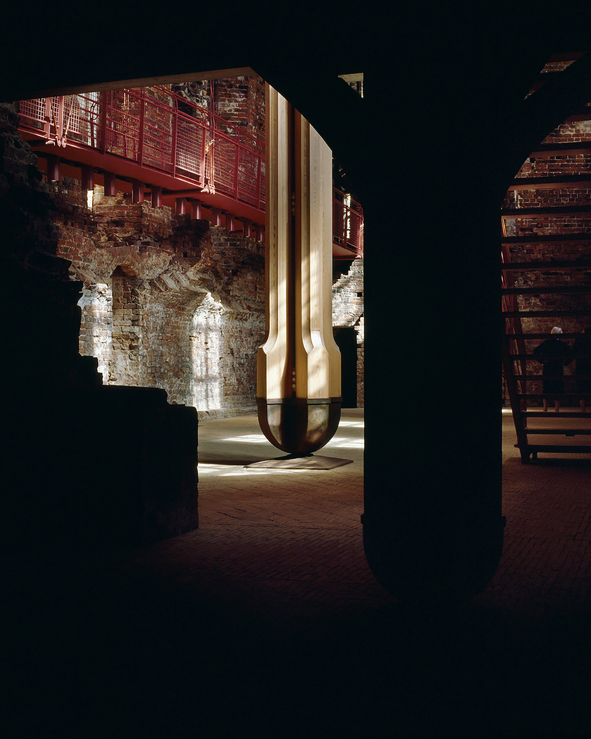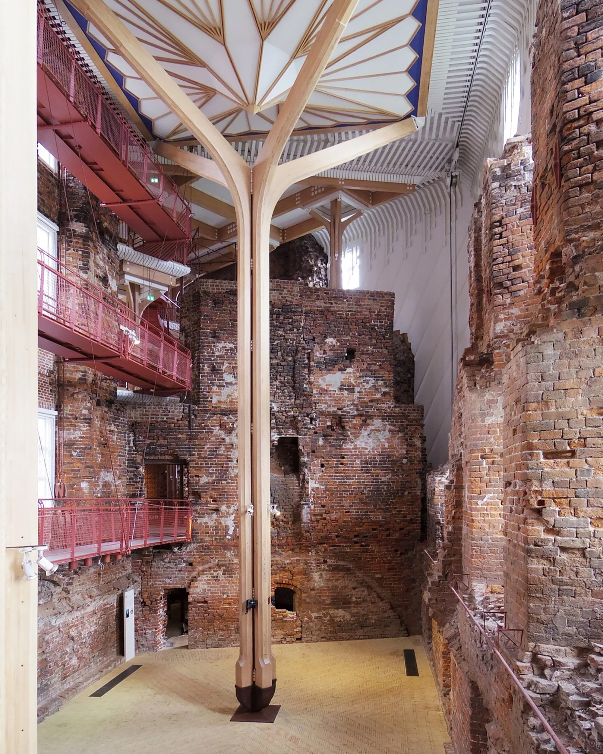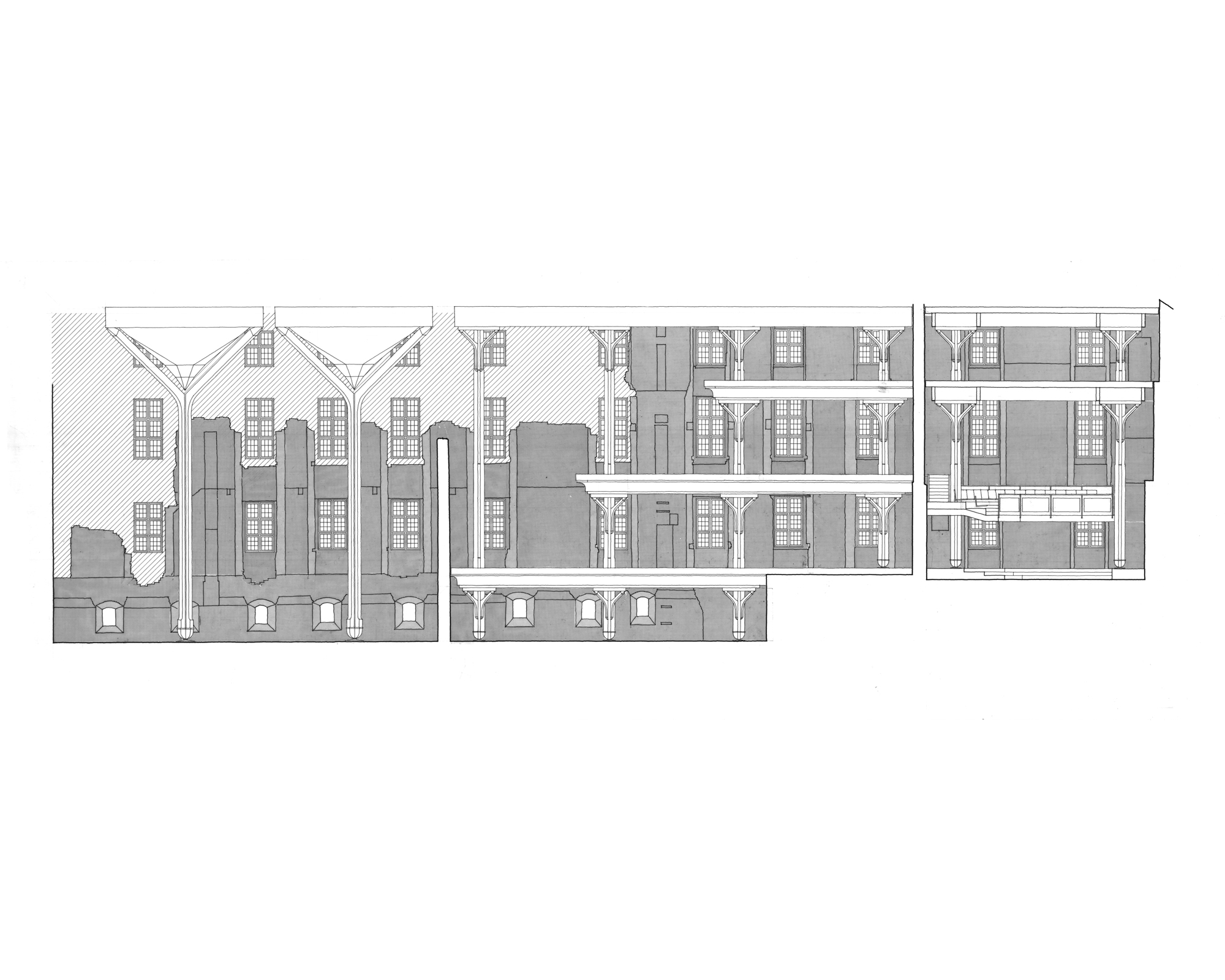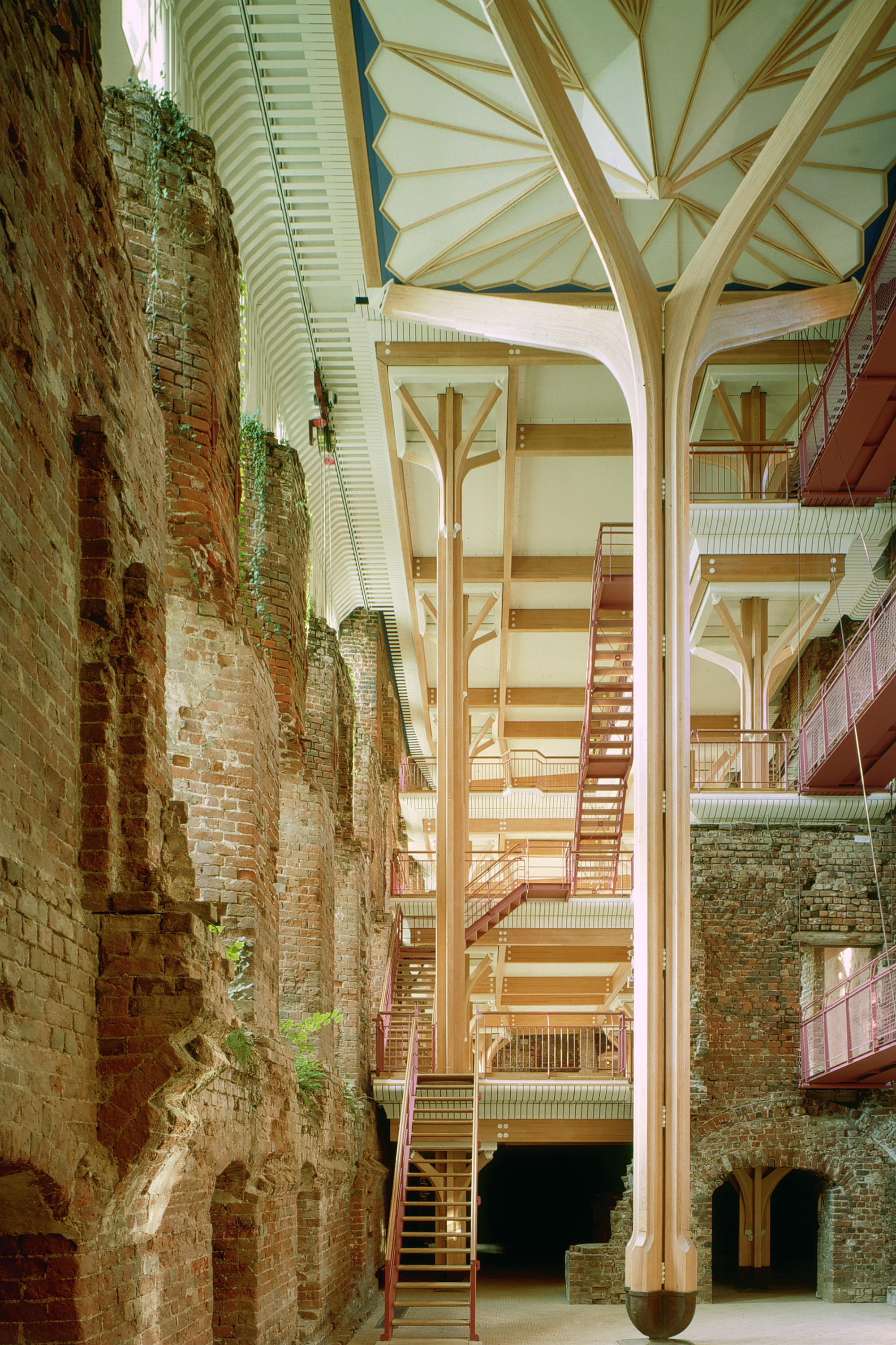 In order to keep the ruins untouched and to preserve their ‘narrative value’, a framed structure has been designed to fit within the walls of the ruin. Columns carry the floor decks and roof, and the design also includes a timber wall that fills in the gap in the brickwork of the south-east facade. This new structure is virtually free-standing within the ruin, and the elements do not touch the old brickwork. One might say that ‘air’ is used as the connecting material. This solution also offered the possibility of using pre-fabrication methods for many of the parts, which allows a more precise programming of the work, both in time and cost. The structure consists of columns reducing in section as they rise through the height, with ‘bases’ and ‘capitals’, and with branching elements which create a vaulted effect. The ‘capitals’ are made with sliding carden-frames, and the bases are cast-iron hemispheres. Above the columns is a horizontal lattice beam spanning from east to west. As a contrast to the heavy red brick walls, the inserted structure and walls are light. The capitals of the columns and the ceilings will be covered with white plates reflecting the daylight from the white painted new windows. The inspiration for the light ‘heaven’ in the ruined hall came first of all from the ruins themselves, but it was suggested also by the characteristics of Baroque architecture, with its manipulation of light and space.