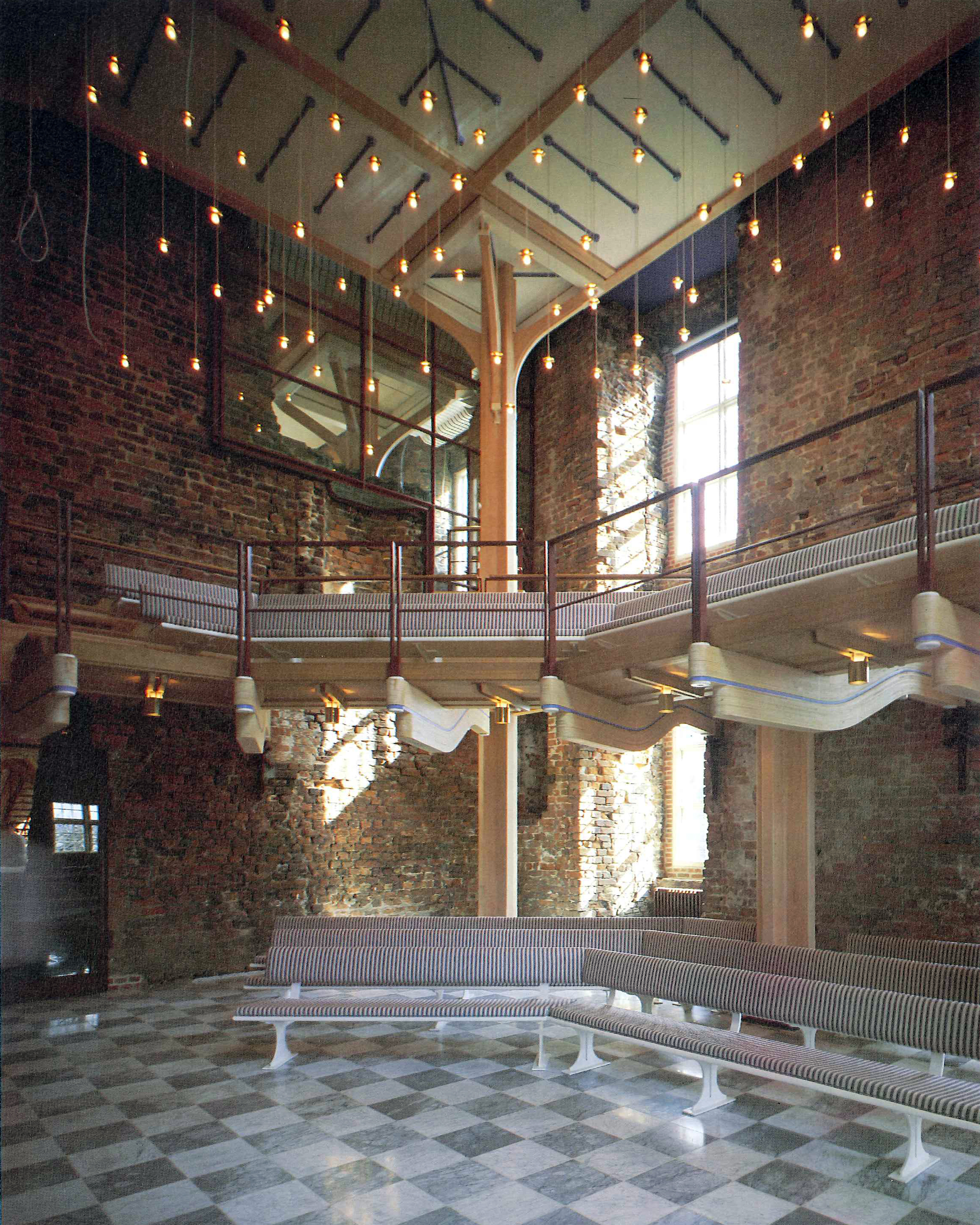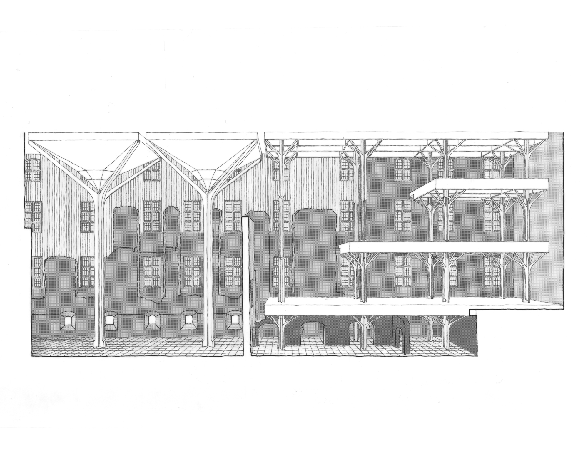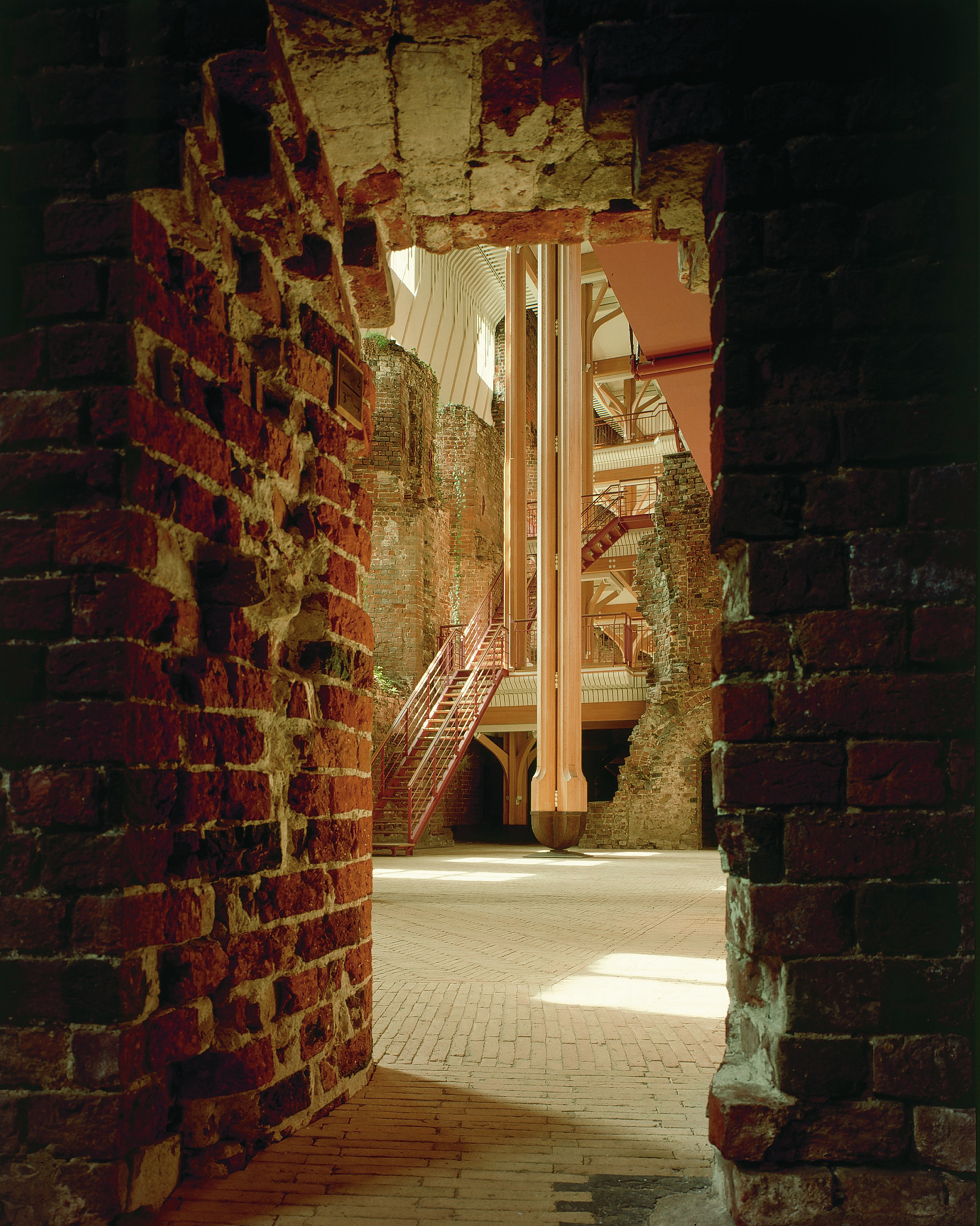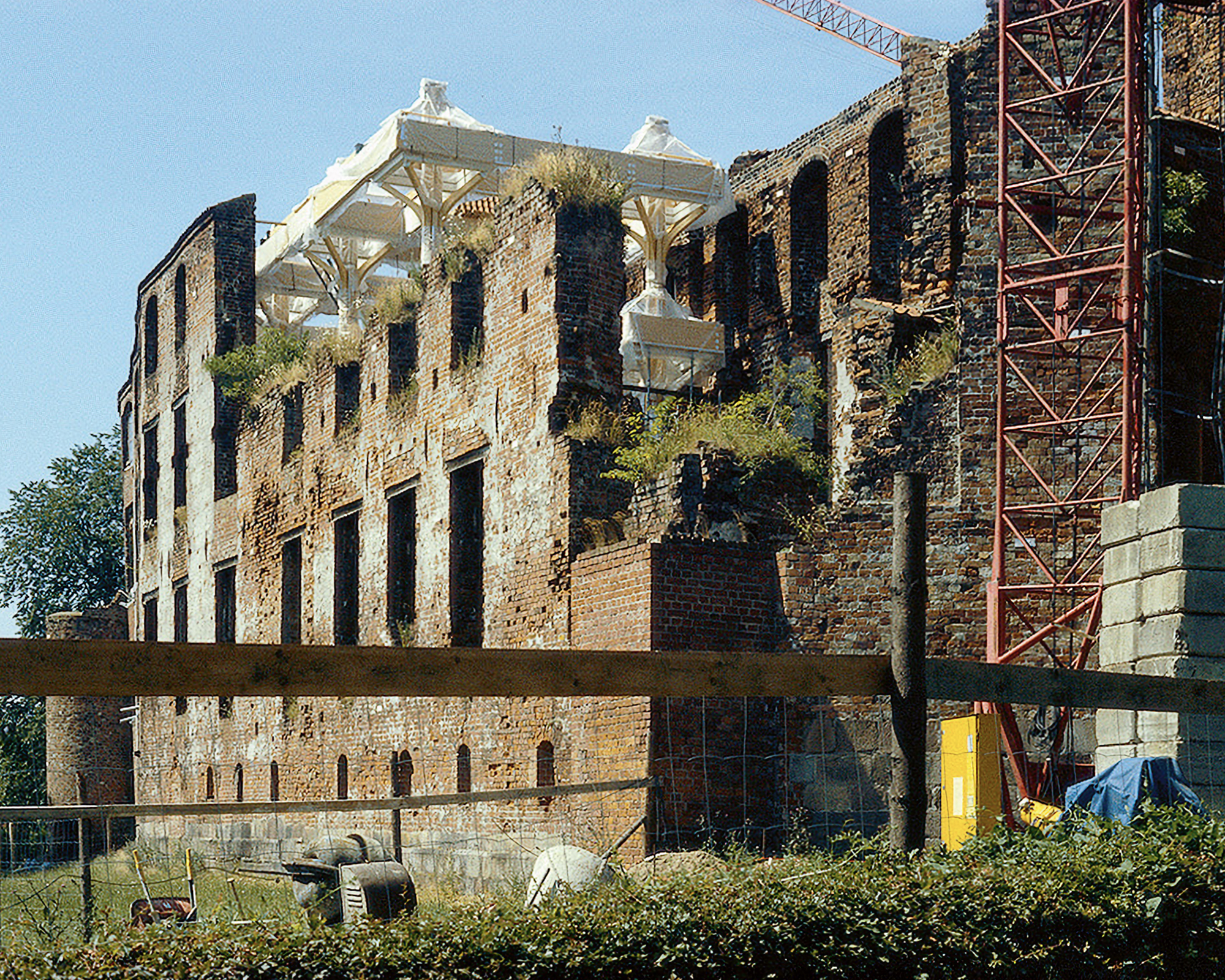 In order to keep the ruins untouched and to preserve their ‘narrative value’, a framed structure has been designed to fit within the walls of the ruin. Columns carry the floor decks and roof, and the design also includes a timber wall that fills in the gap in the brickwork of the south-east facade. This new structure is virtually free-standing within the ruin, and the elements do not touch the old brickwork. One might say that ‘air’ is used as the connecting material. This solution also offered the possibility of using pre-fabrication methods for many of the parts, which allows a more precise programming of the work, both in time and cost. The structure consists of columns reducing in section as they rise through the height, with ‘bases’ and ‘capitals’, and with branching elements which create a vaulted effect. The ‘capitals’ are made with sliding carden-frames, and the bases are cast-iron hemispheres. Above the columns is a horizontal lattice beam spanning from east to west. As a contrast to the heavy red brick walls, the inserted structure and walls are light. The capitals of the columns and the ceilings will be covered with white plates reflecting the daylight from the white painted new windows. The inspiration for the light ‘heaven’ in the ruined hall came first of all from the ruins themselves, but it was suggested also by the characteristics of Baroque architecture, with its manipulation of light and space.
