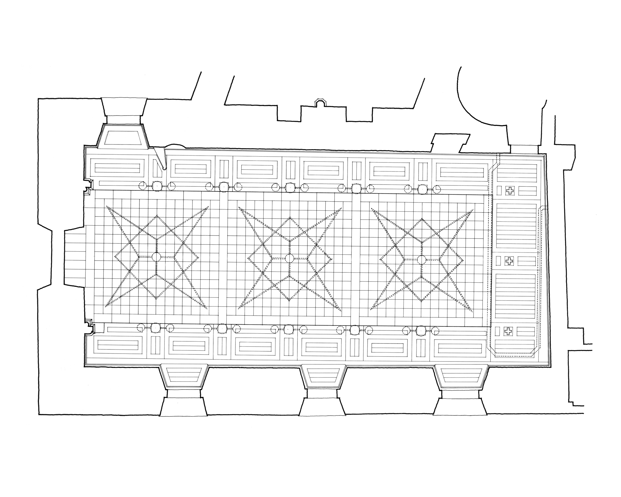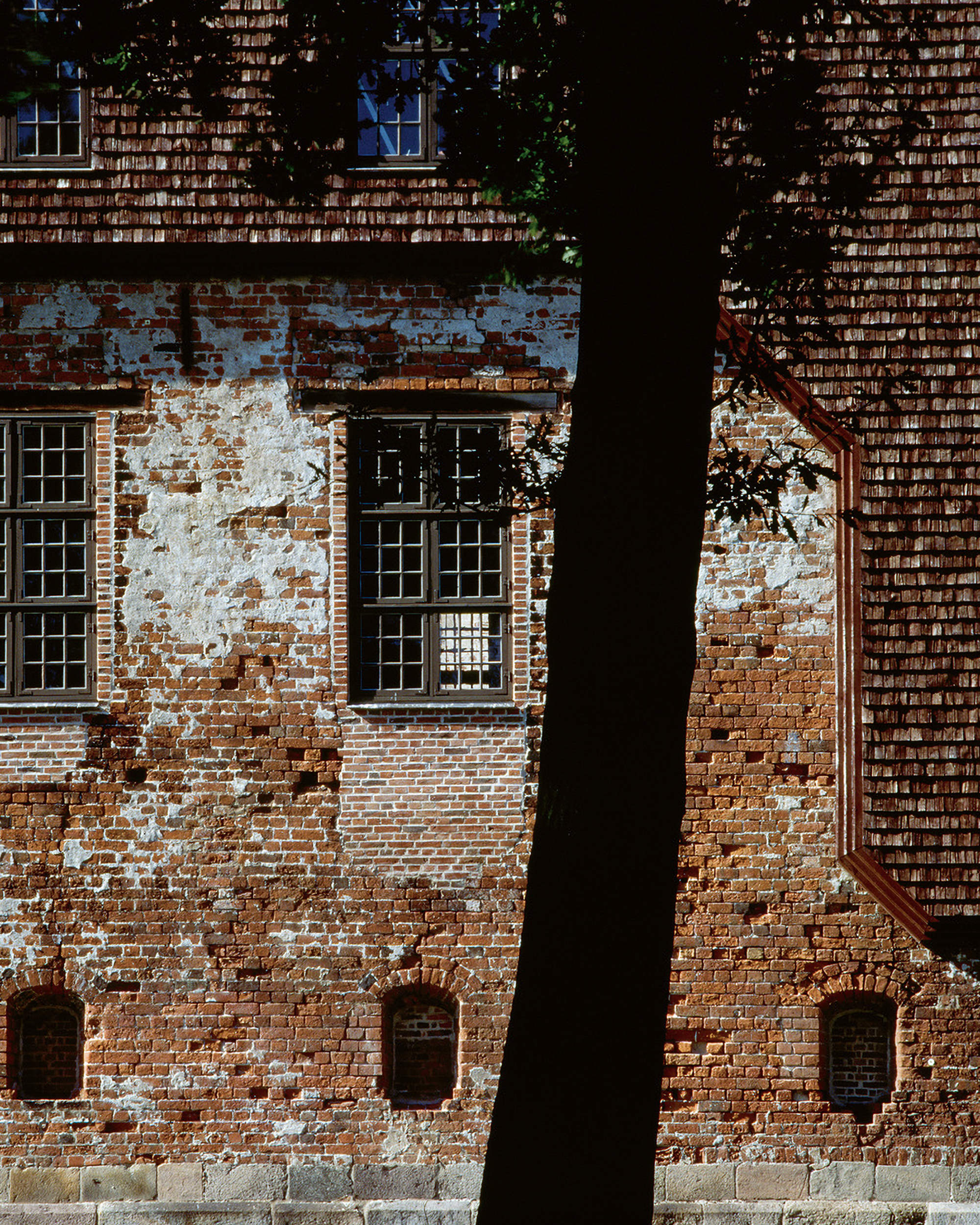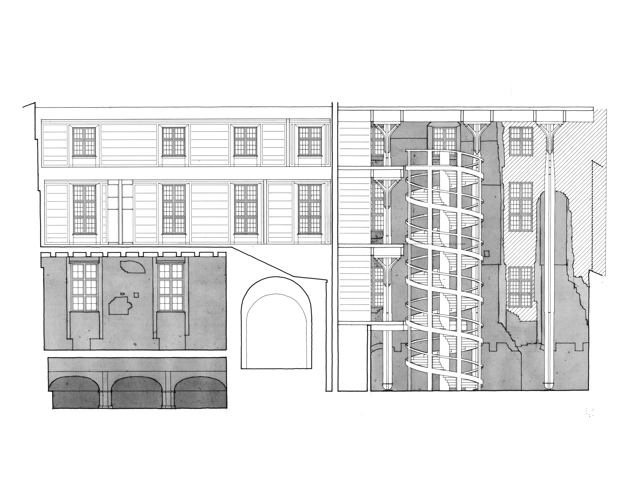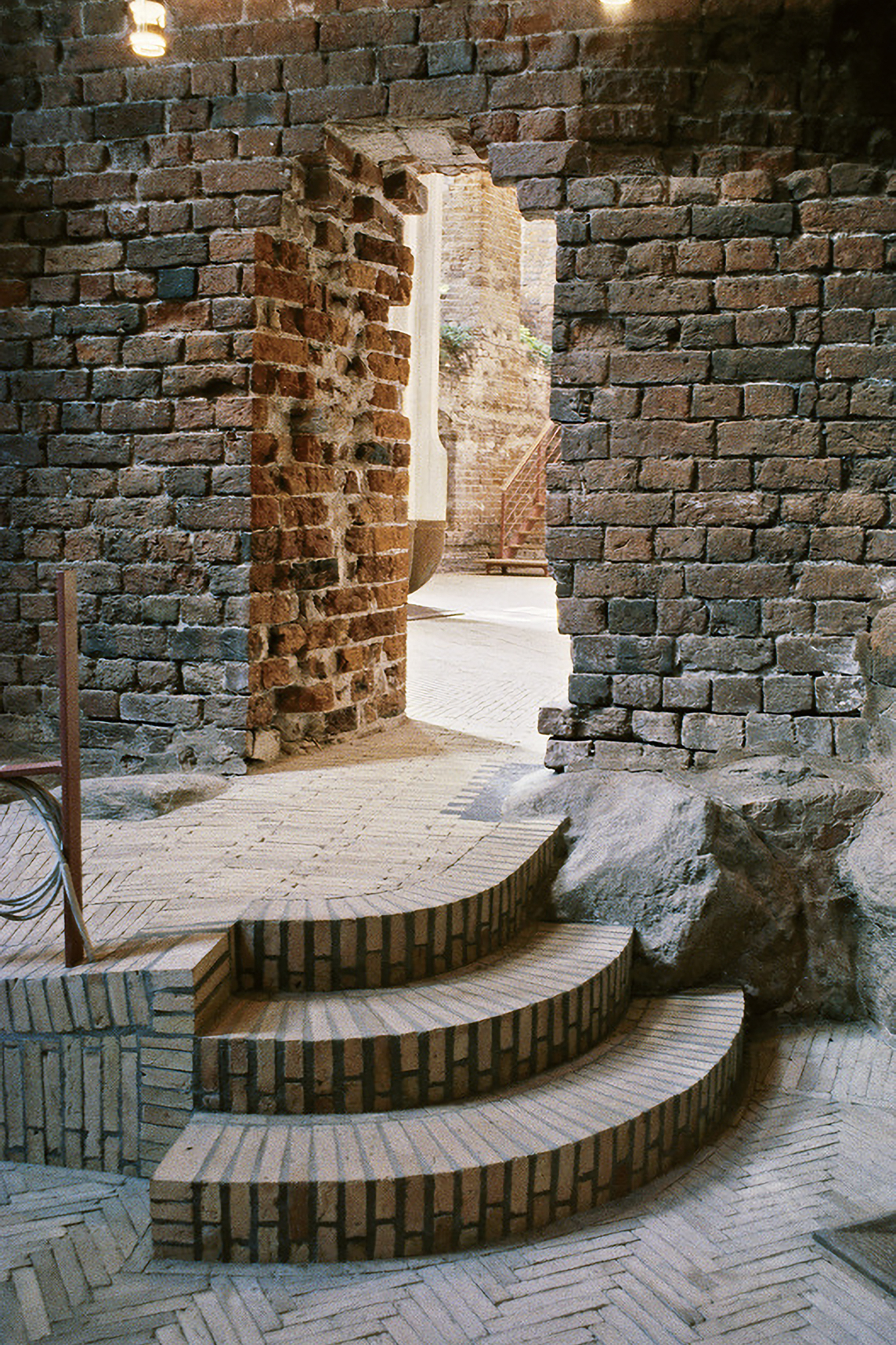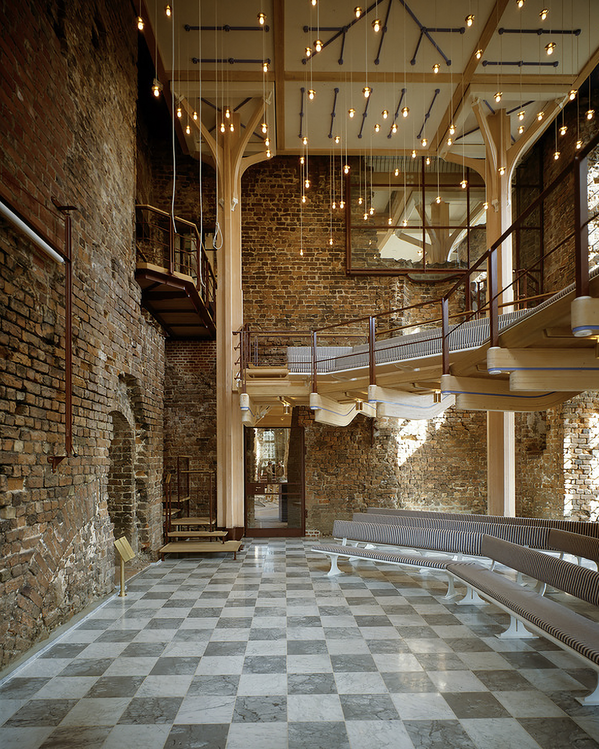 In order to keep the ruins untouched and to preserve their ‘narrative value’, a framed structure has been designed to fit within the walls of the ruin. Columns carry the floor decks and roof, and the design also includes a timber wall that fills in the gap in the brickwork of the south-east facade. This new structure is virtually free-standing within the ruin, and the elements do not touch the old brickwork. One might say that ‘air’ is used as the connecting material. This solution also offered the possibility of using pre-fabrication methods for many of the parts, which allows a more precise programming of the work, both in time and cost. The structure consists of columns reducing in section as they rise through the height, with ‘bases’ and ‘capitals’, and with branching elements which create a vaulted effect. The ‘capitals’ are made with sliding carden-frames, and the bases are cast-iron hemispheres. Above the columns is a horizontal lattice beam spanning from east to west. As a contrast to the heavy red brick walls, the inserted structure and walls are light. The capitals of the columns and the ceilings will be covered with white plates reflecting the daylight from the white painted new windows. The inspiration for the light ‘heaven’ in the ruined hall came first of all from the ruins themselves, but it was suggested also by the characteristics of Baroque architecture, with its manipulation of light and space.