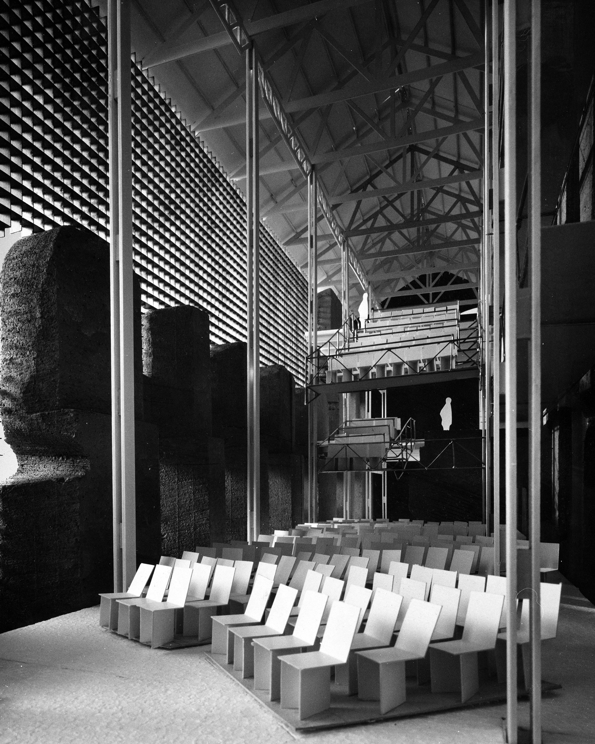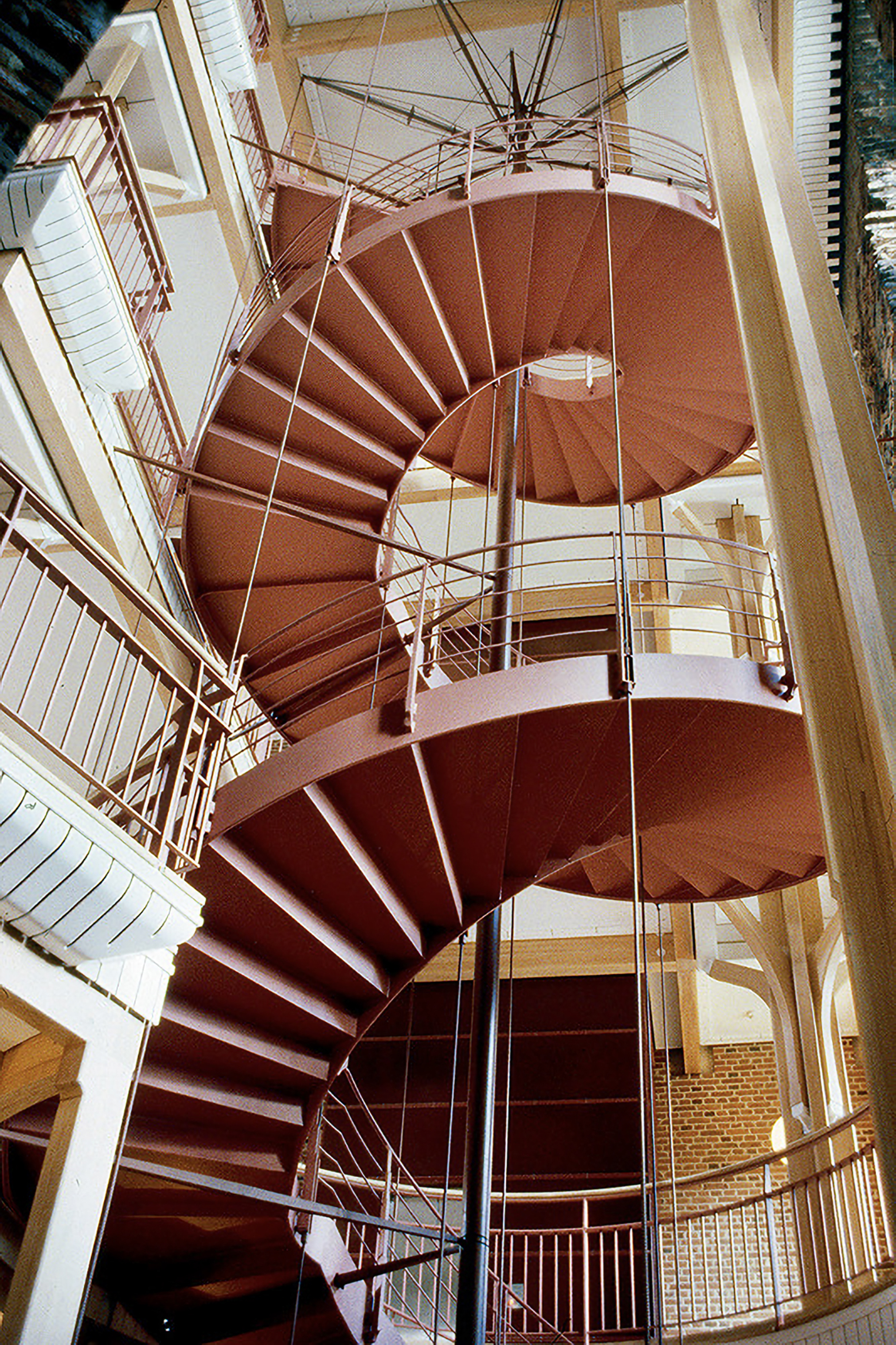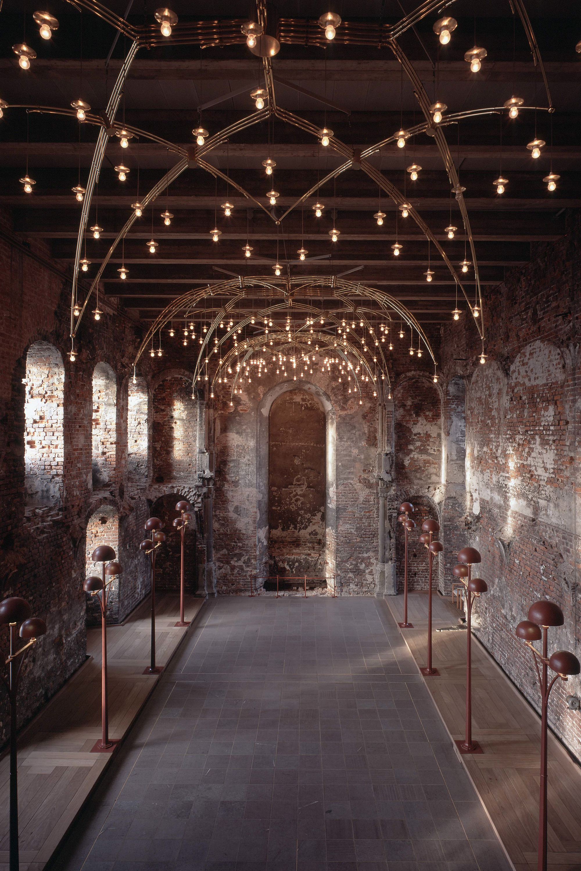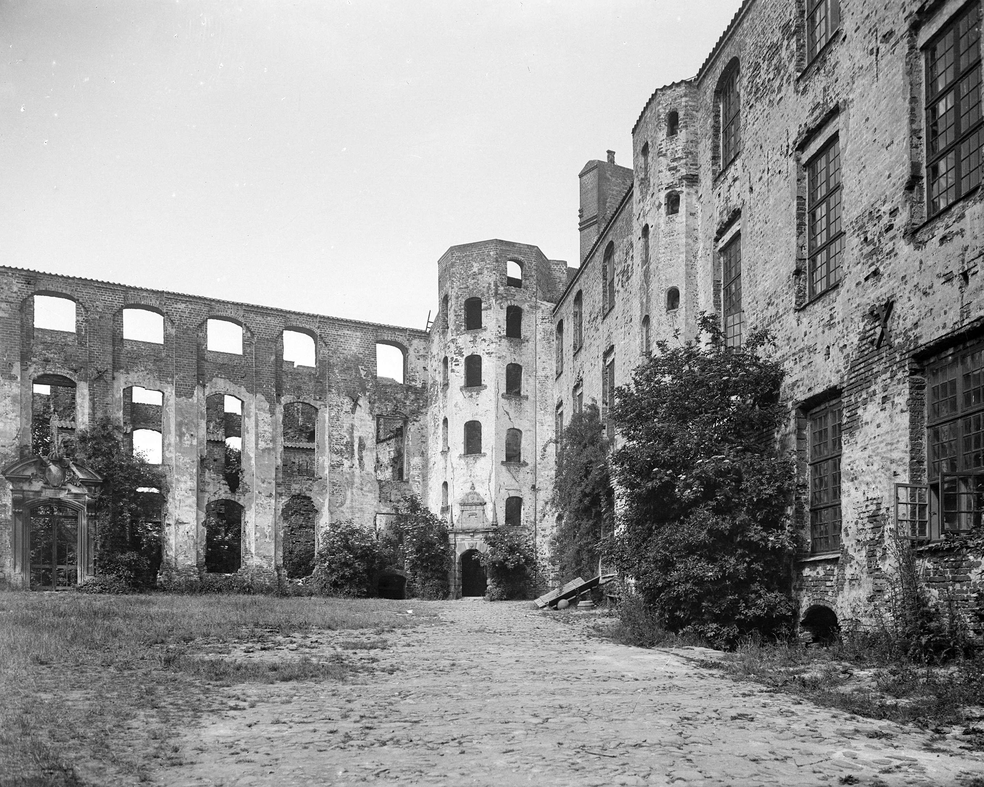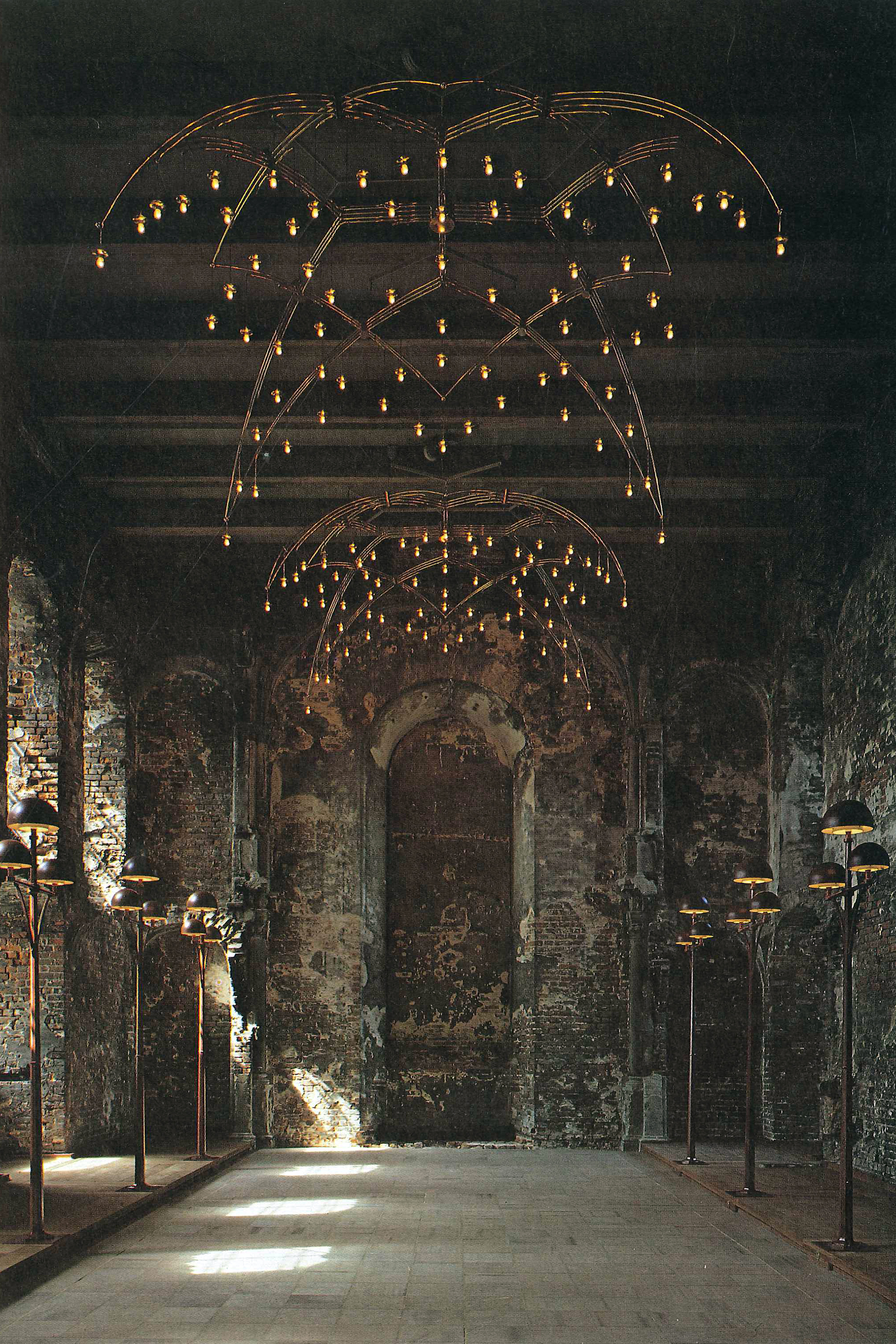 In order to keep the ruins untouched and to preserve their ‘narrative value’, a framed structure has been designed to fit within the walls of the ruin. Columns carry the floor decks and roof, and the design also includes a timber wall that fills in the gap in the brickwork of the south-east facade. This new structure is virtually free-standing within the ruin, and the elements do not touch the old brickwork. One might say that ‘air’ is used as the connecting material. This solution also offered the possibility of using pre-fabrication methods for many of the parts, which allows a more precise programming of the work, both in time and cost. The structure consists of columns reducing in section as they rise through the height, with ‘bases’ and ‘capitals’, and with branching elements which create a vaulted effect. The ‘capitals’ are made with sliding carden-frames, and the bases are cast-iron hemispheres. Above the columns is a horizontal lattice beam spanning from east to west. As a contrast to the heavy red brick walls, the inserted structure and walls are light. The capitals of the columns and the ceilings will be covered with white plates reflecting the daylight from the white painted new windows. The inspiration for the light ‘heaven’ in the ruined hall came first of all from the ruins themselves, but it was suggested also by the characteristics of Baroque architecture, with its manipulation of light and space.