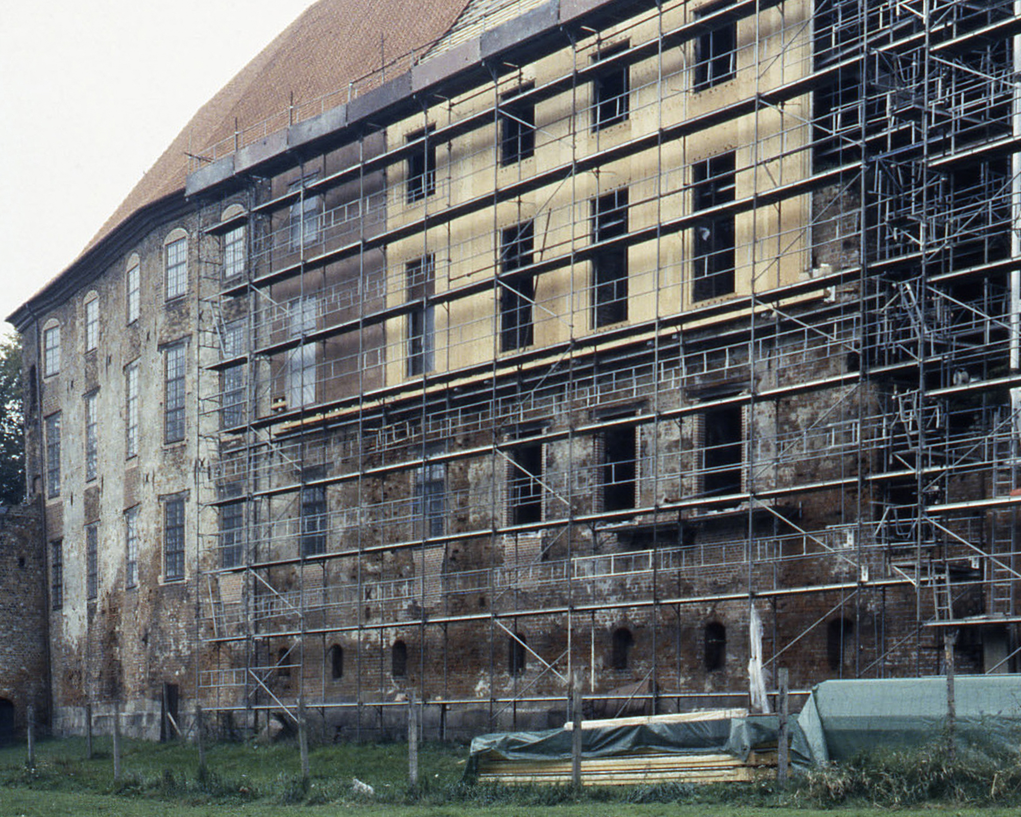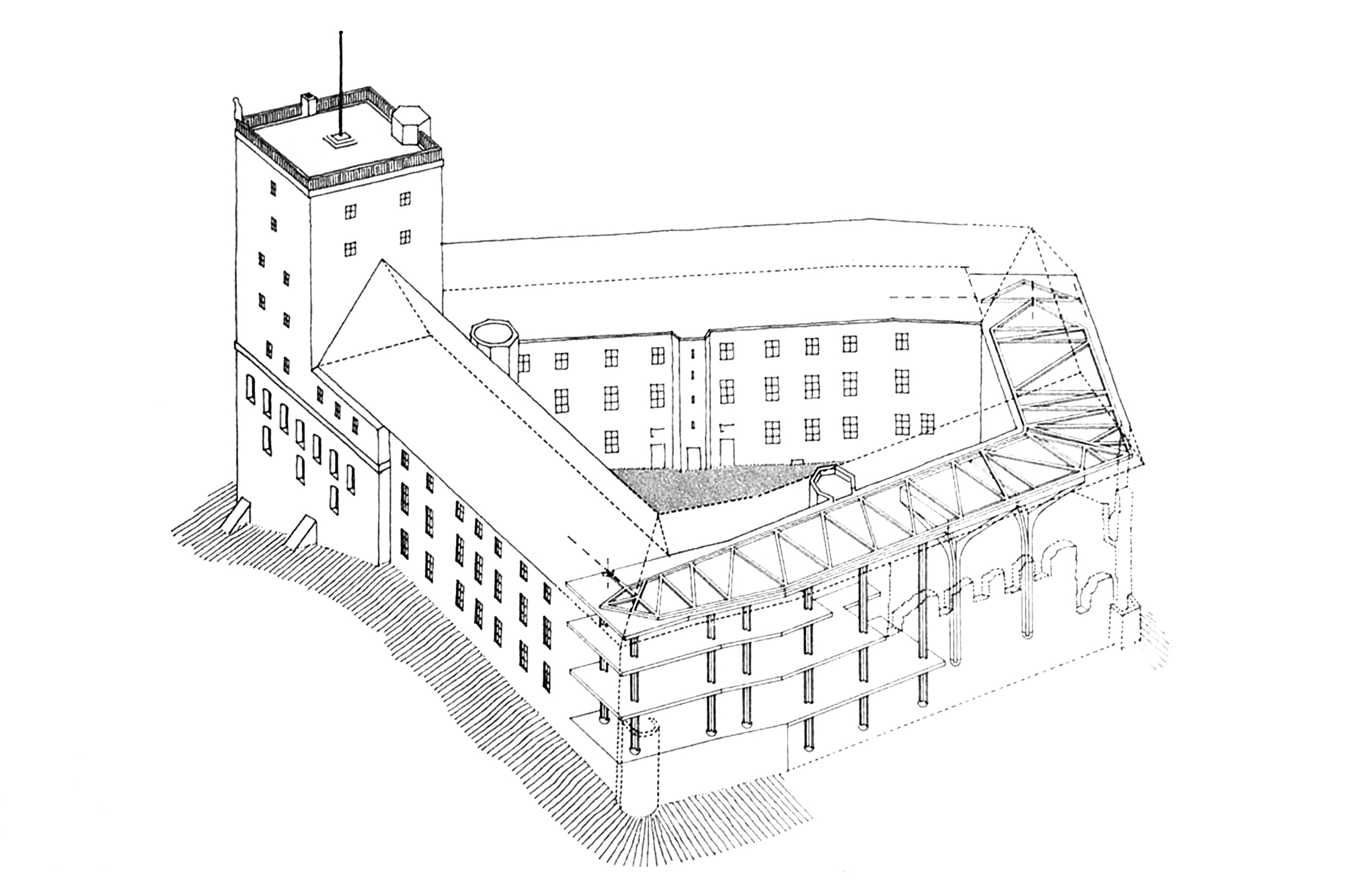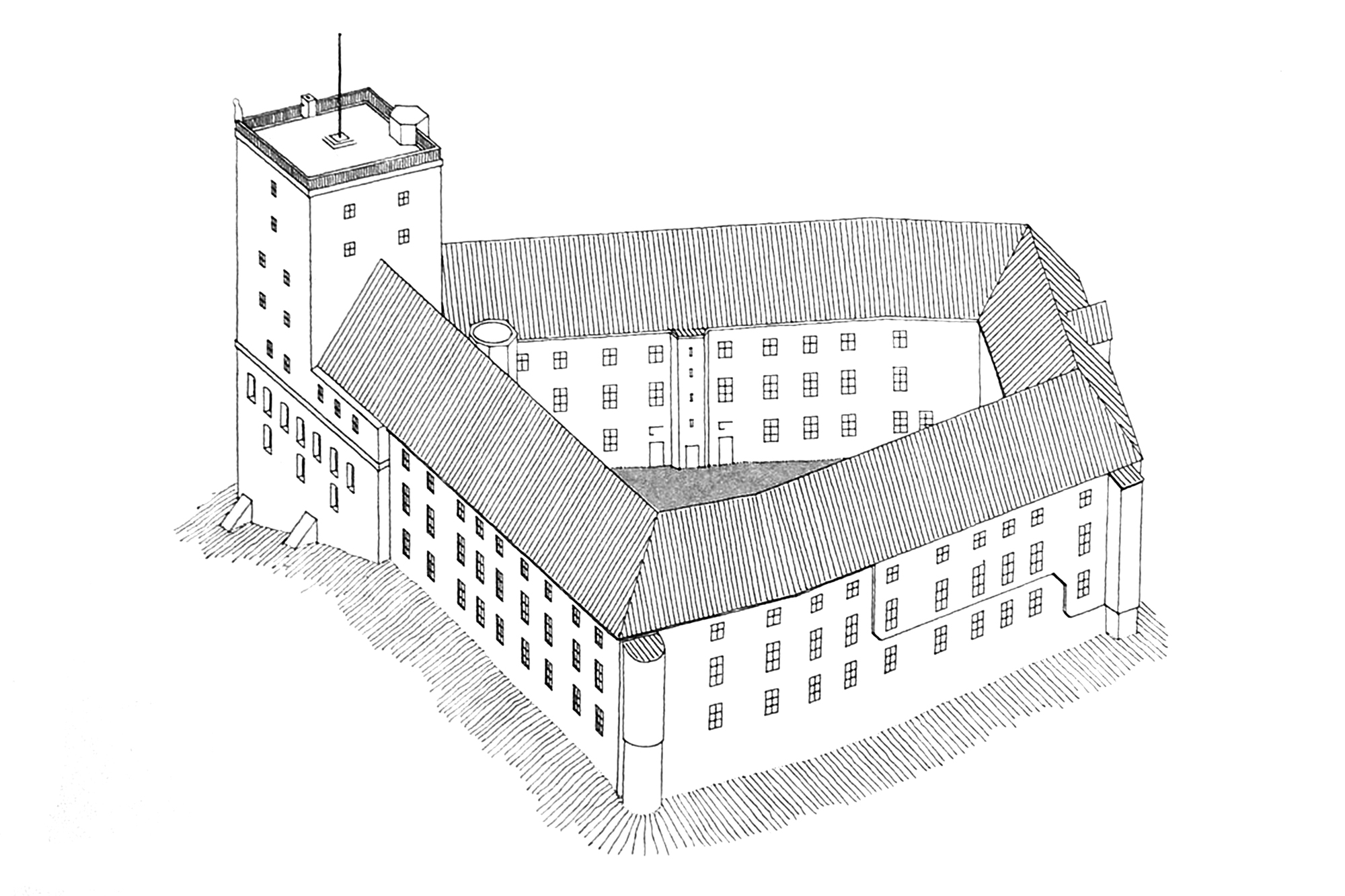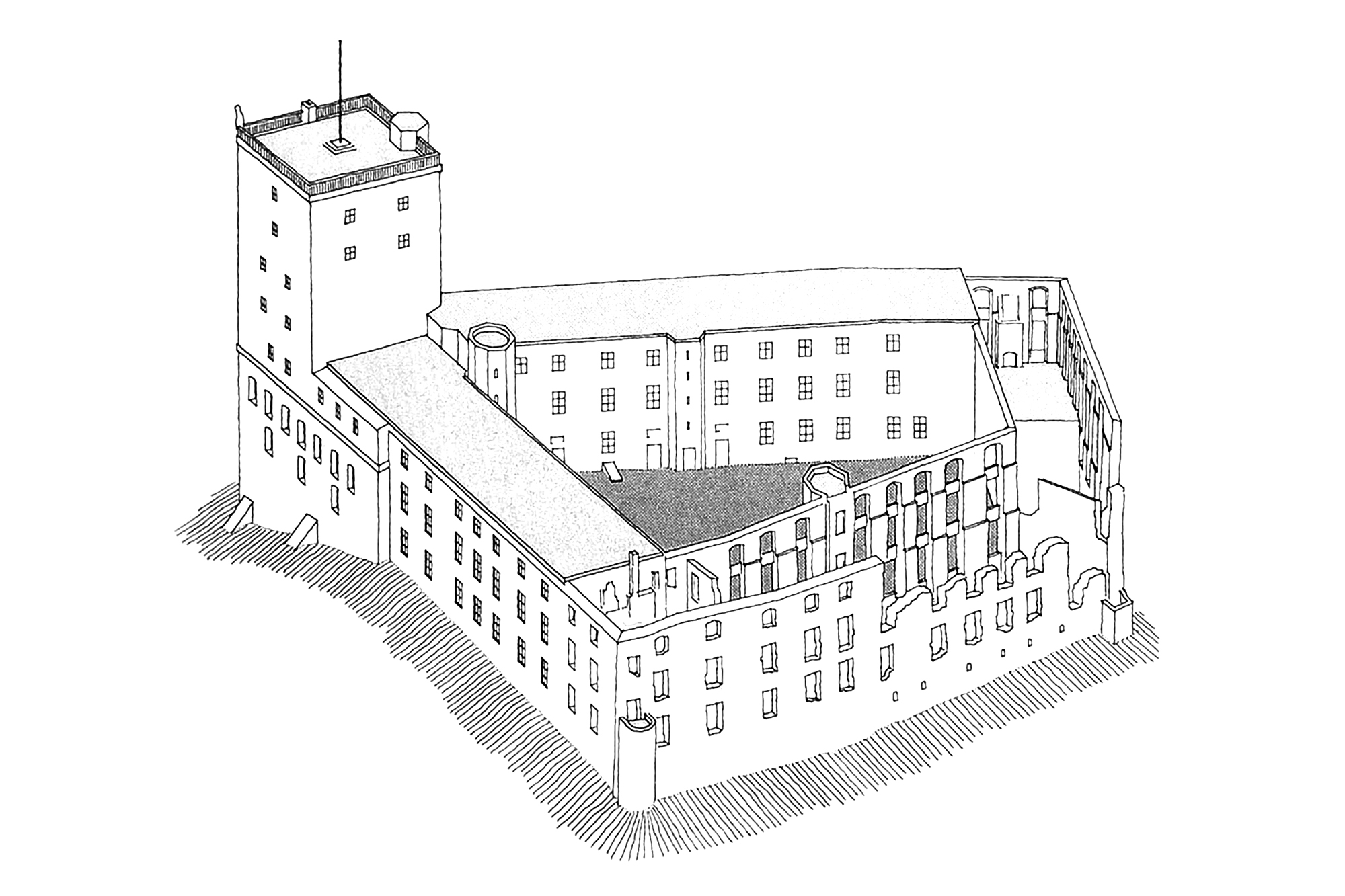 A proposal to protect the ruins by means of a simple structure supporting a roof and walls, otherwise maintaining the ruins untouched, was worked out and approved by the building committee. We believed the proposal would be well received by all the parties concerned, but local opposition arose and Det Saerlige Bygningssy (building surveying committee) would not approve. The result was a compromise which is now being carried out, in which the castle’s exterior is being given a general form corresponding to the time before the fire, while the ruins appear mostly in the interior. We evolved a basic principle that the main periods of the castle’s history were to be respected in such a way that its long and eventful life was clearly illustrated. As it was to be a museum, it was obvious that the most important exhibit was Koldinghus itself, and the different historical periods and events would have to be emphasized architecturally in the various parts of the building.