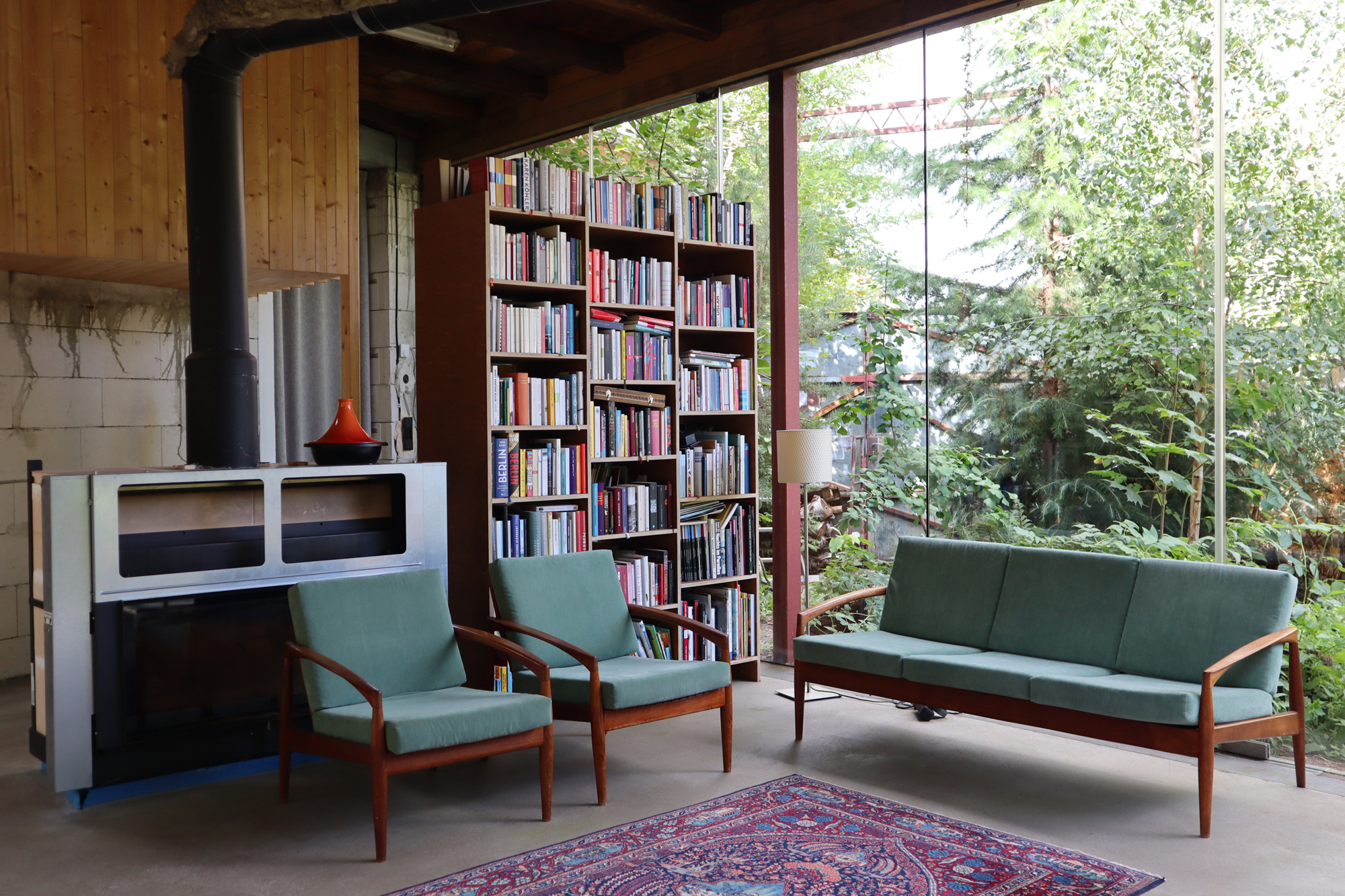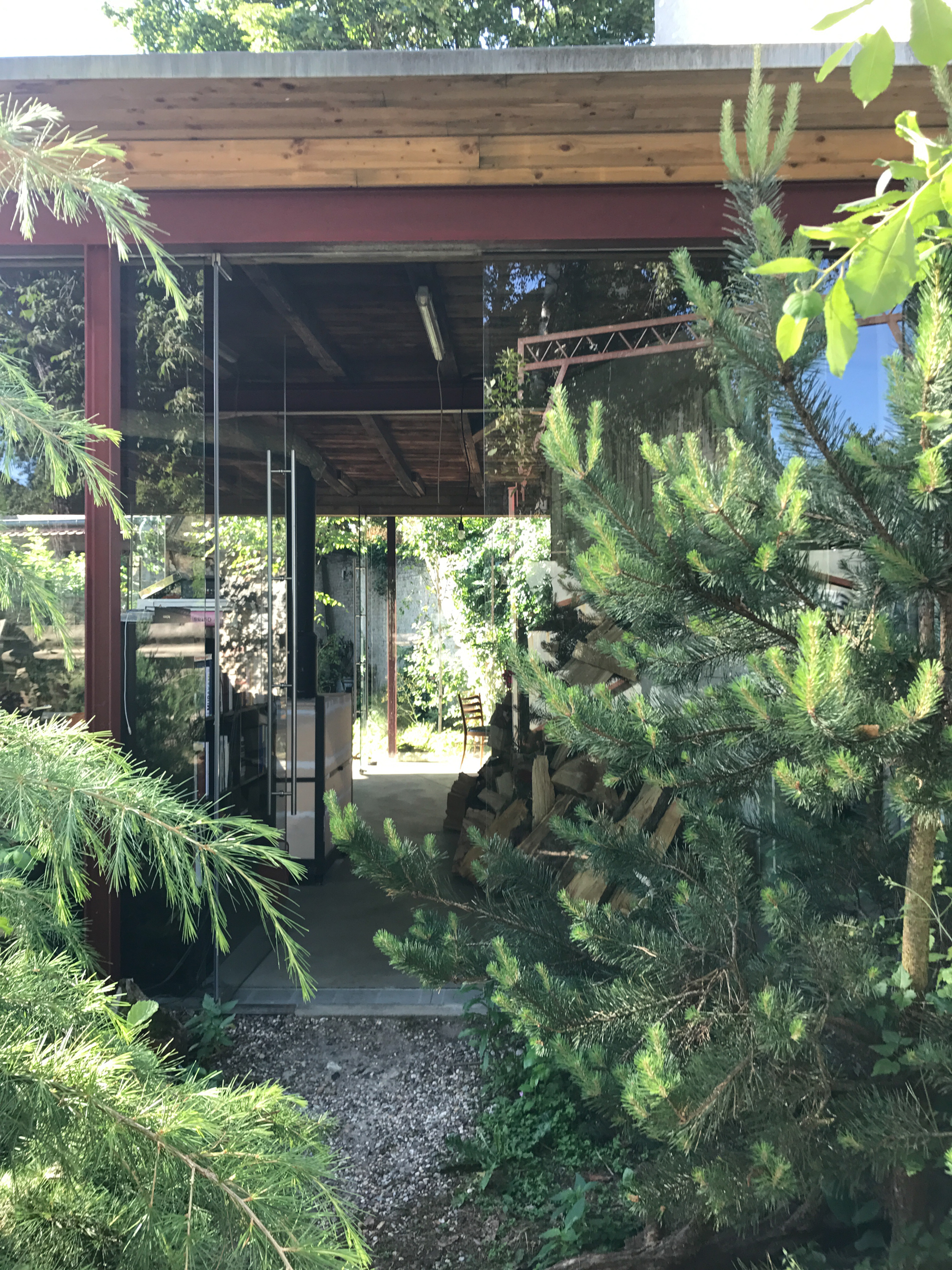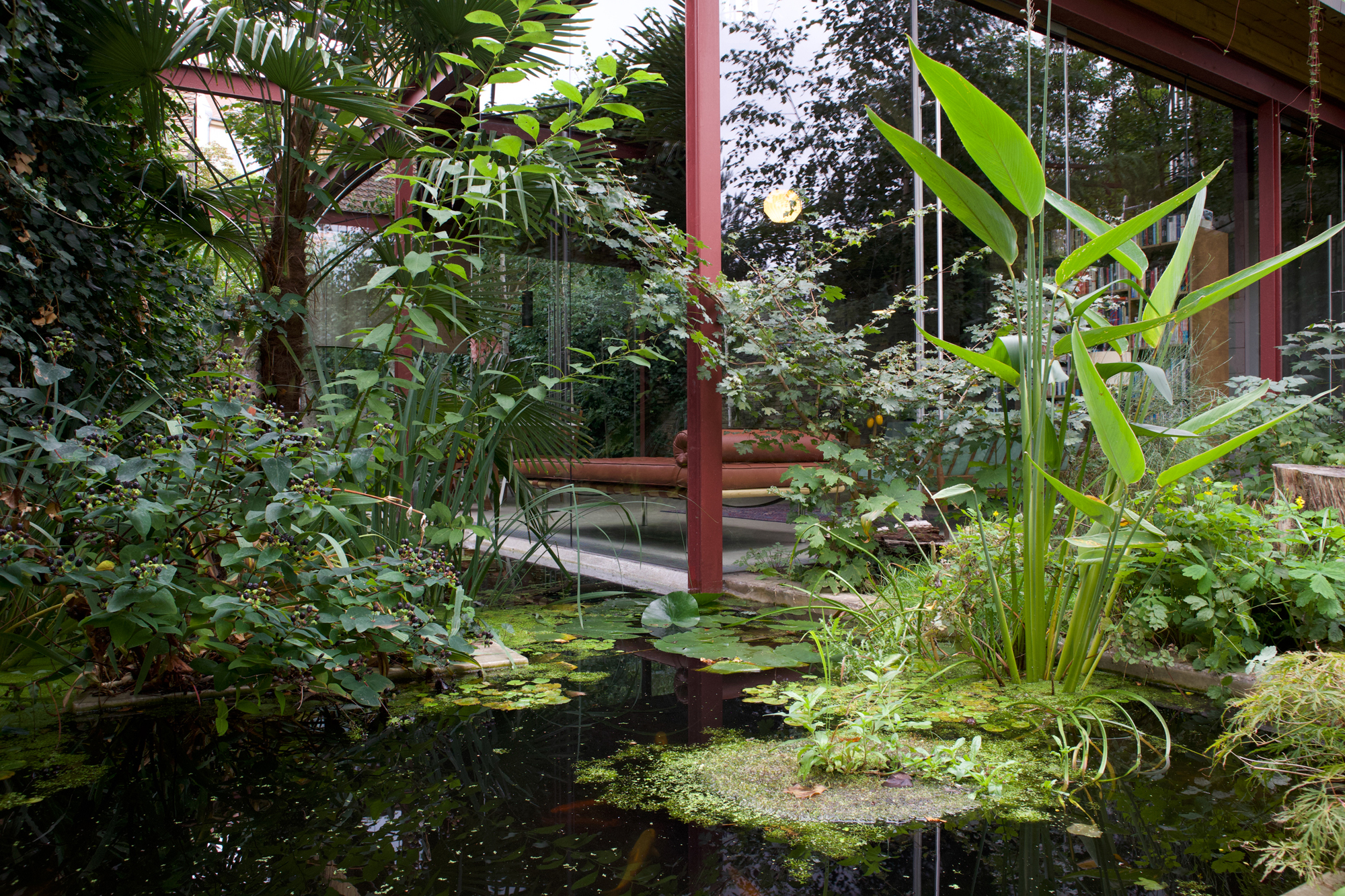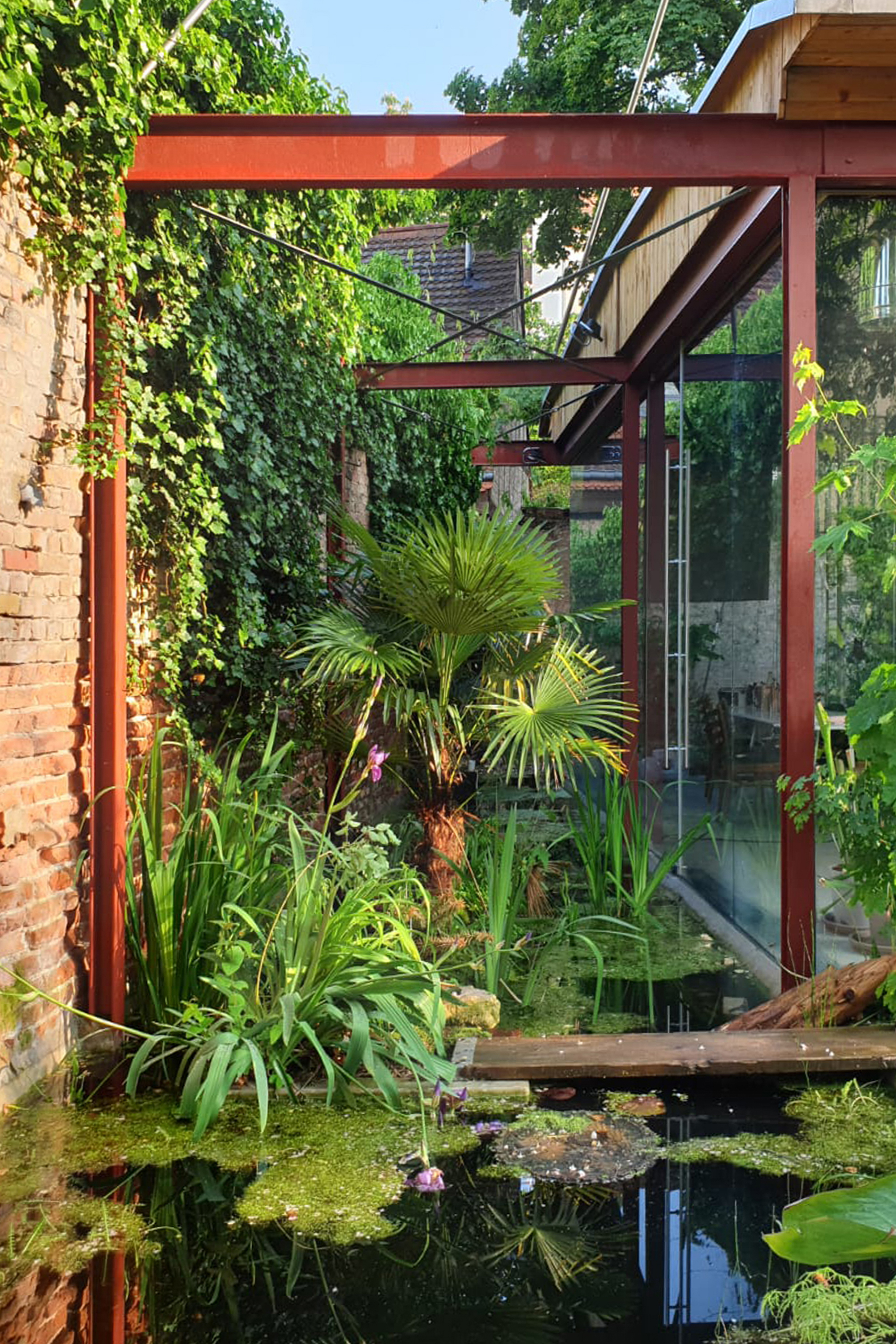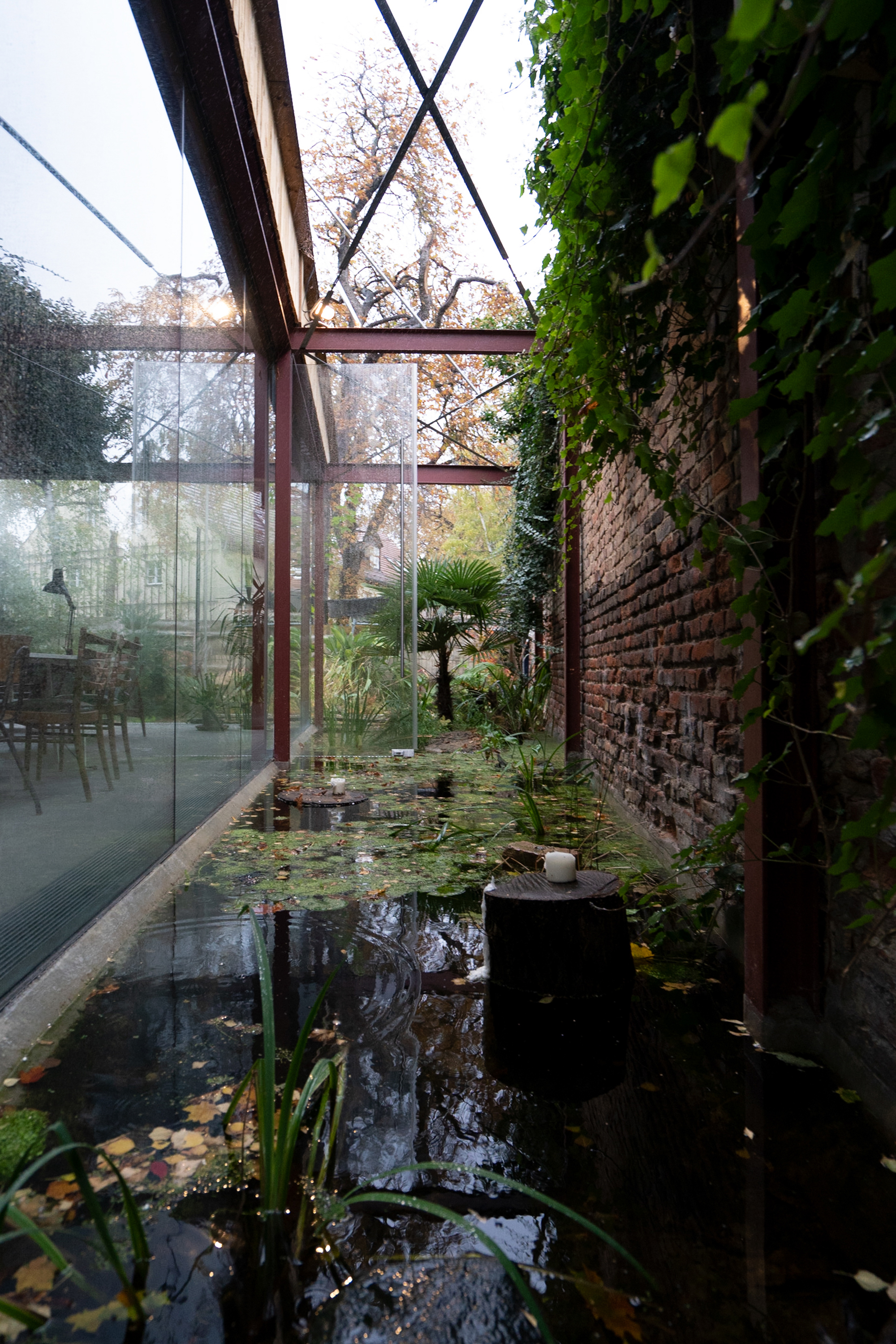 Today, the unsealed plot and green roof of the pavillon host an incredible diversity of plant, animal and funghi species. A unfiltered, 12 metre long pond, that is over 2 meters deep, connects the wild northern and southern parts of the garden. The roof is covered by another garden, which is slightly less wild, and more focused on food production. In winter, the house itself orients around a large fireplace, which‘s chimneys comically long shape responds to the legal exhaust distances in the dense urban environment. In summer, it opens to the pond and gardens.